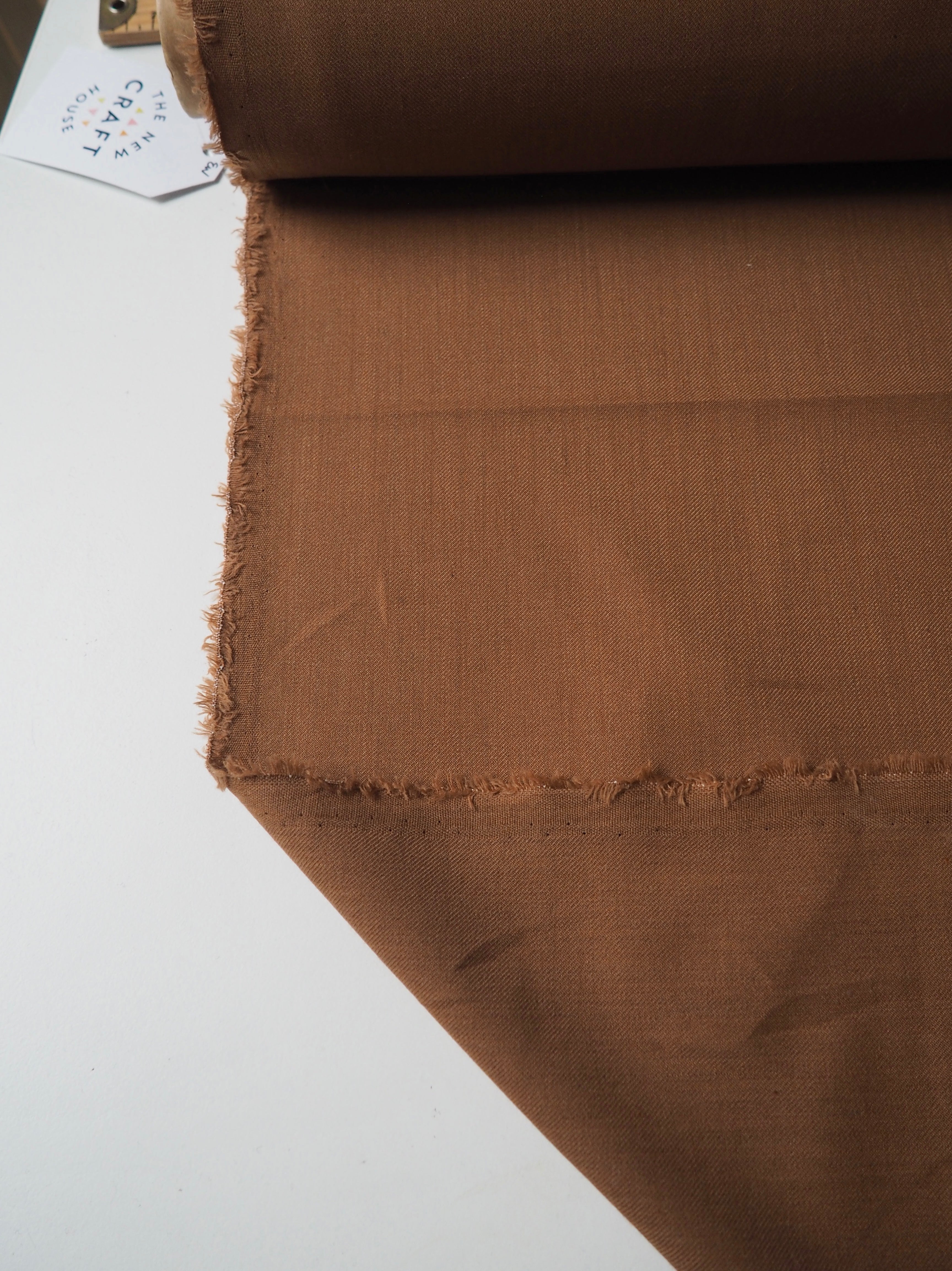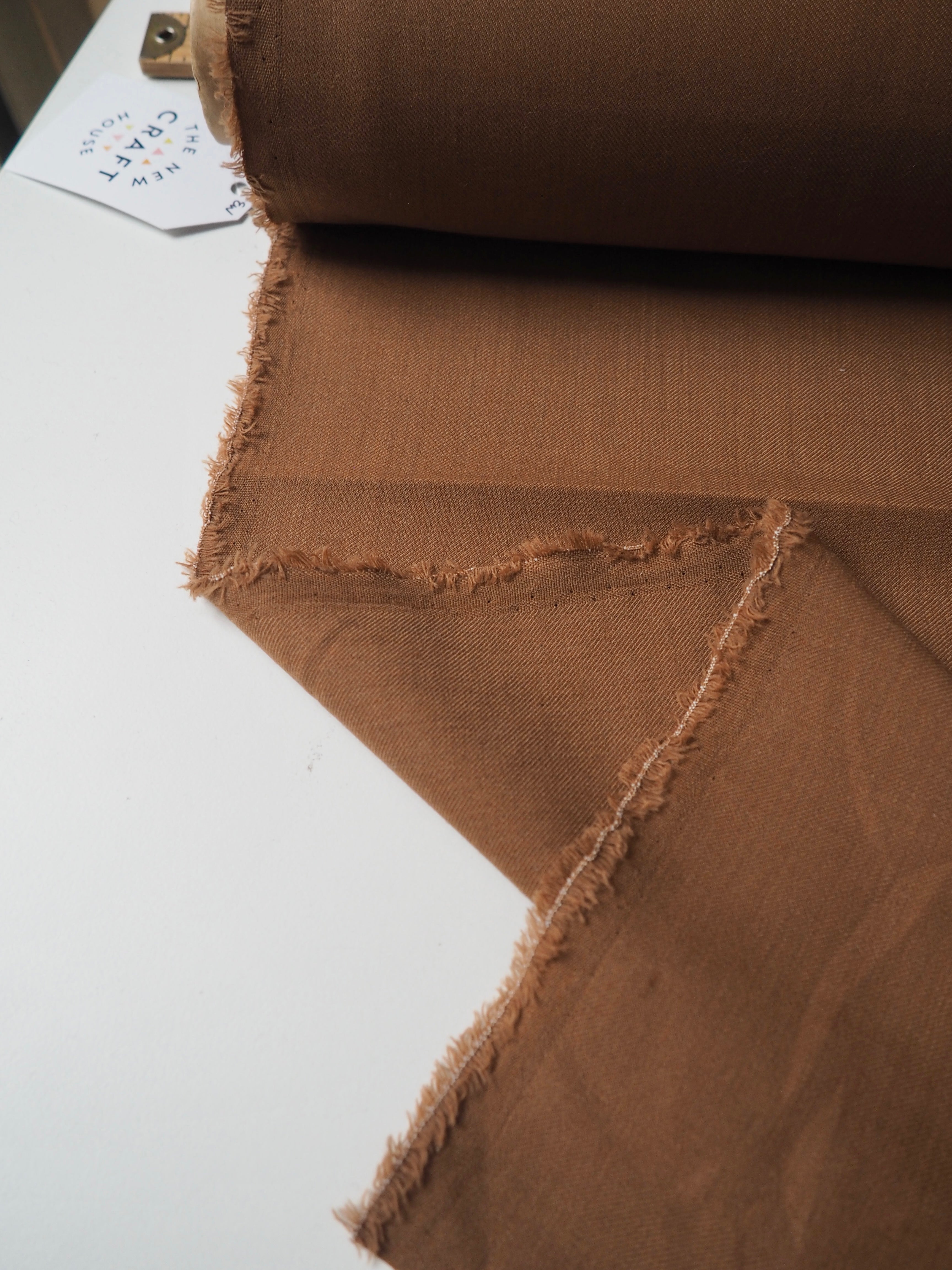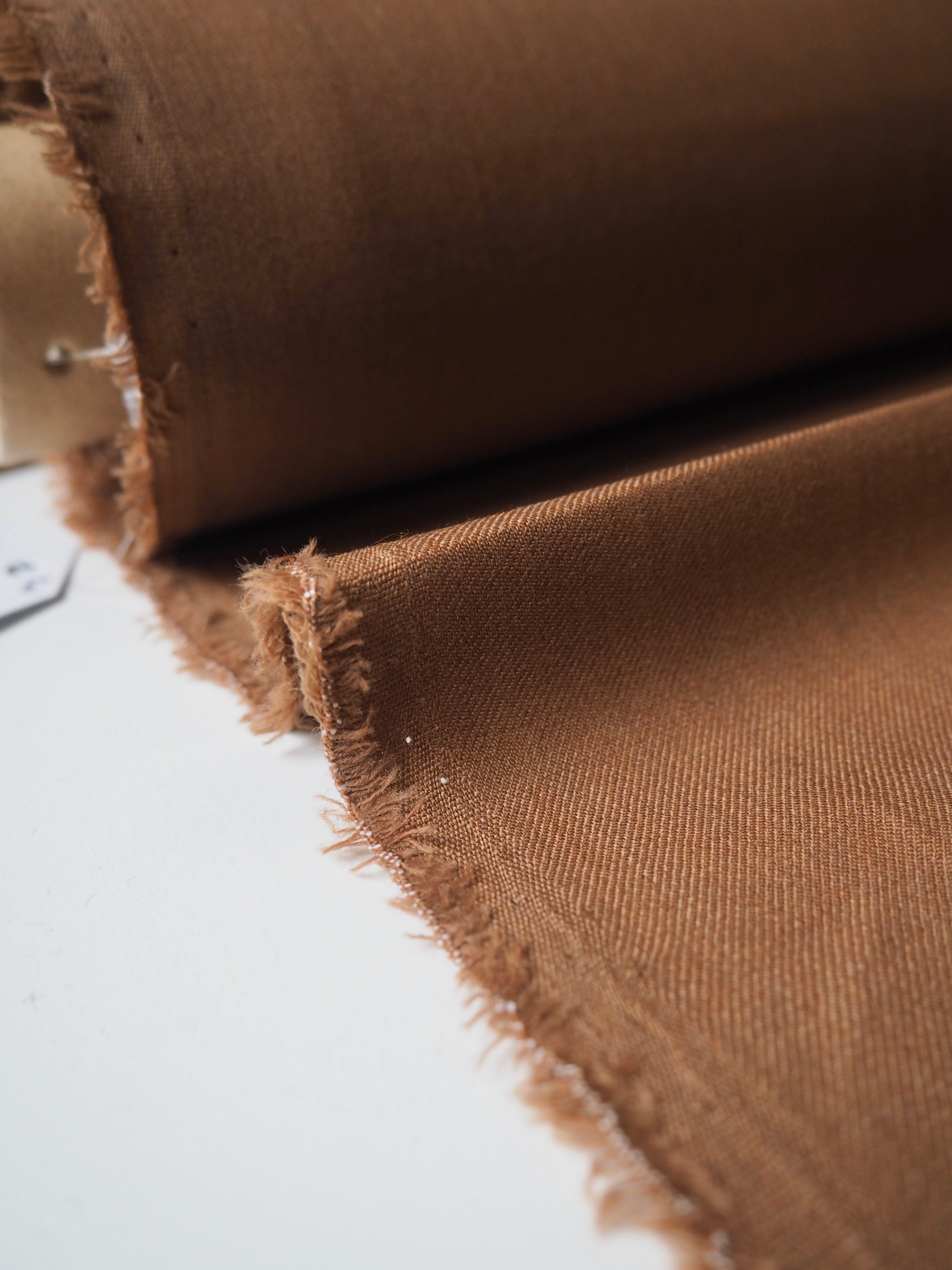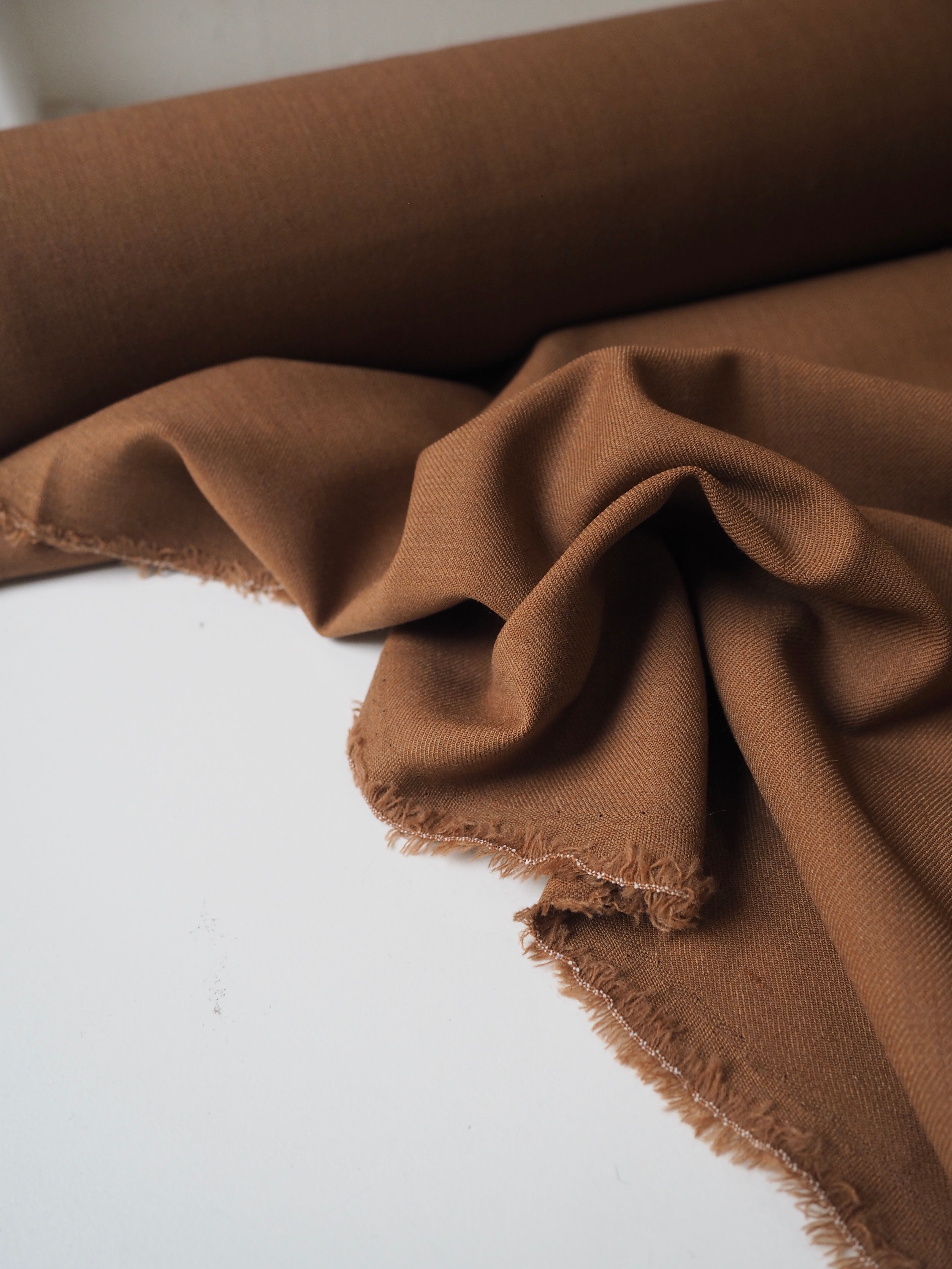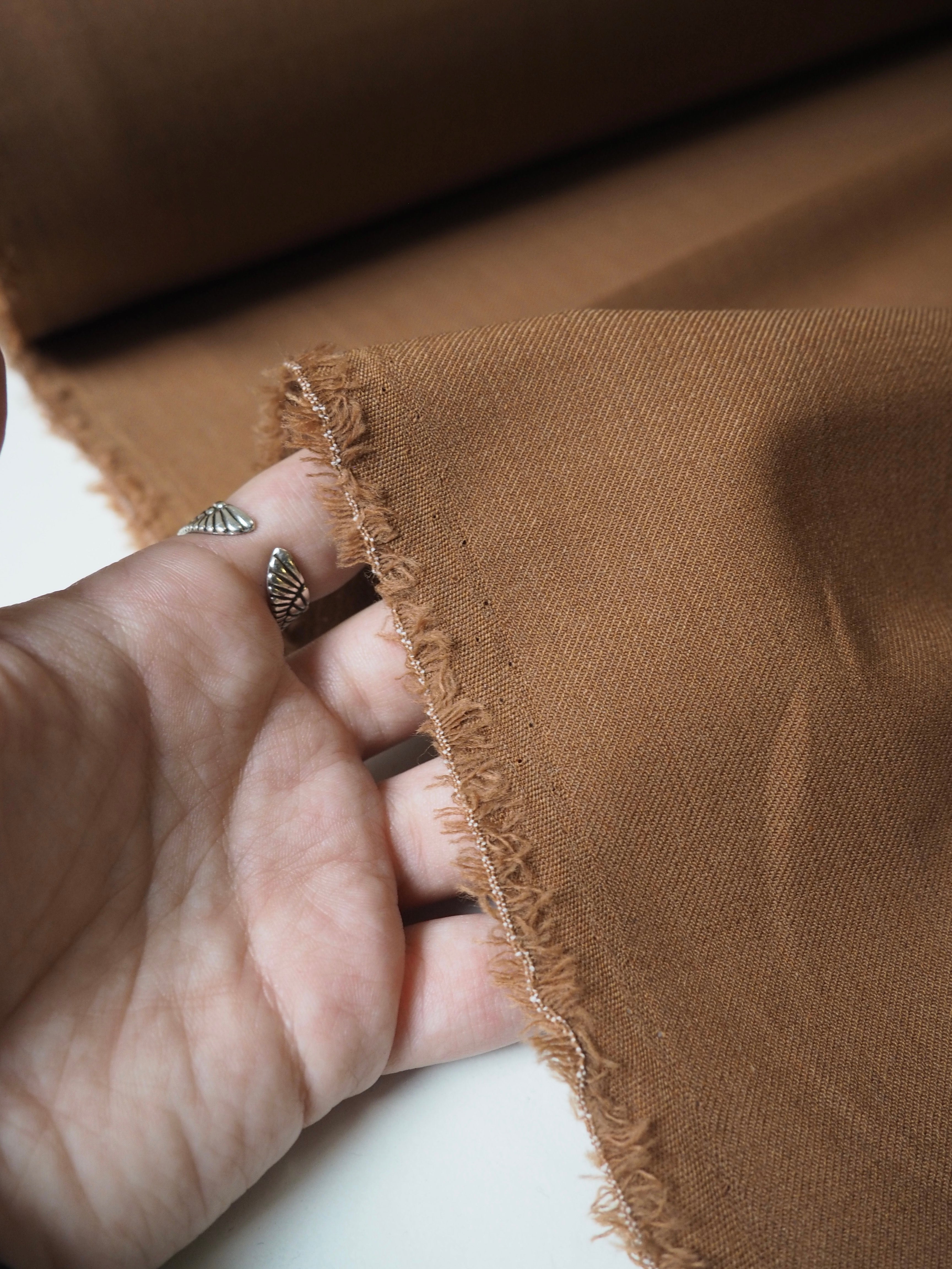 This ex-designer fabric is a wool twill. In a mocha brown with a lovely twill structure. Has about a 10-15% stretch. Lightweight with a soft woolly handle, beautiful drape, and a gentle sateen finish. Would be lovely in a suit jacket or trousers!
