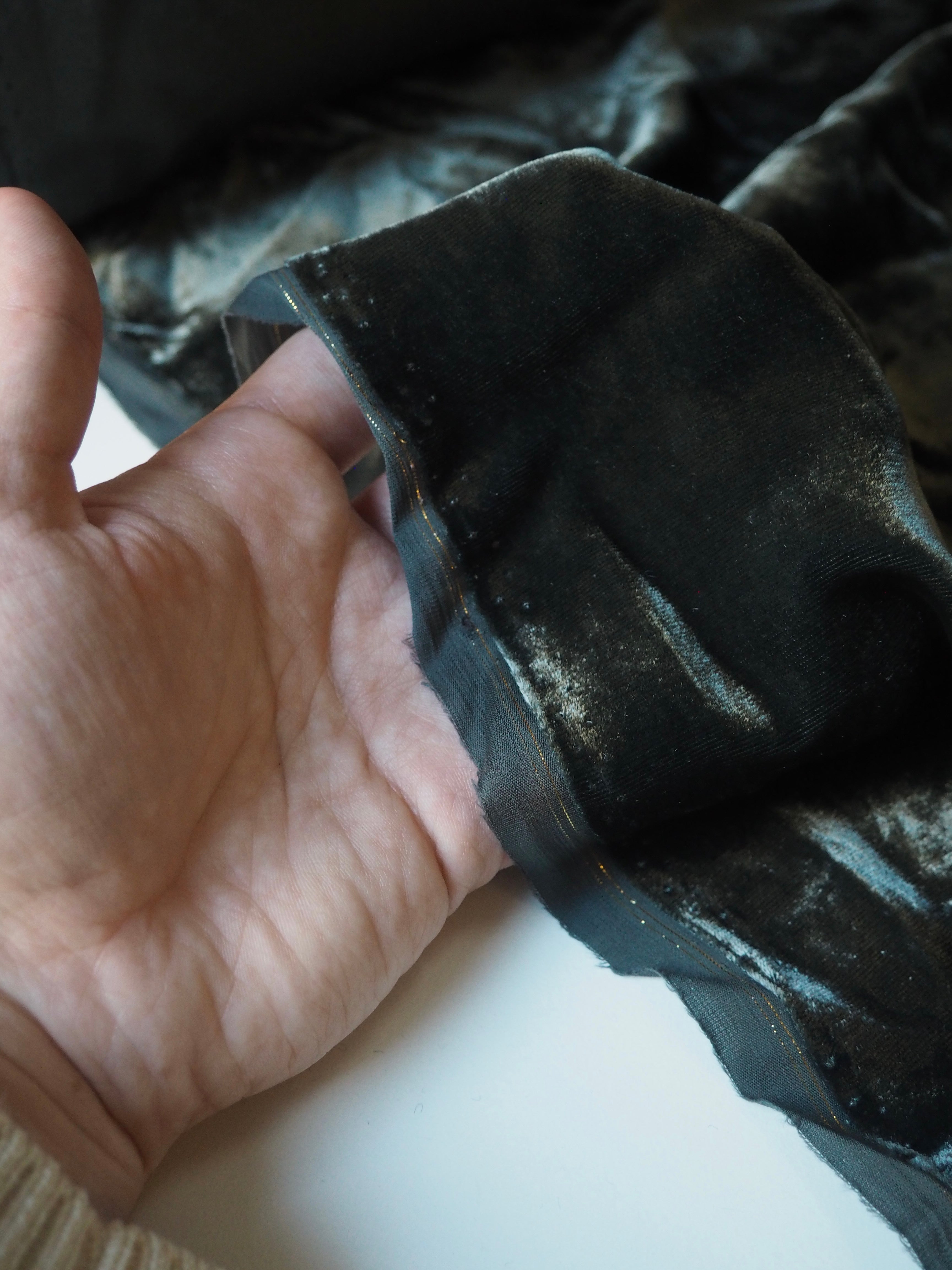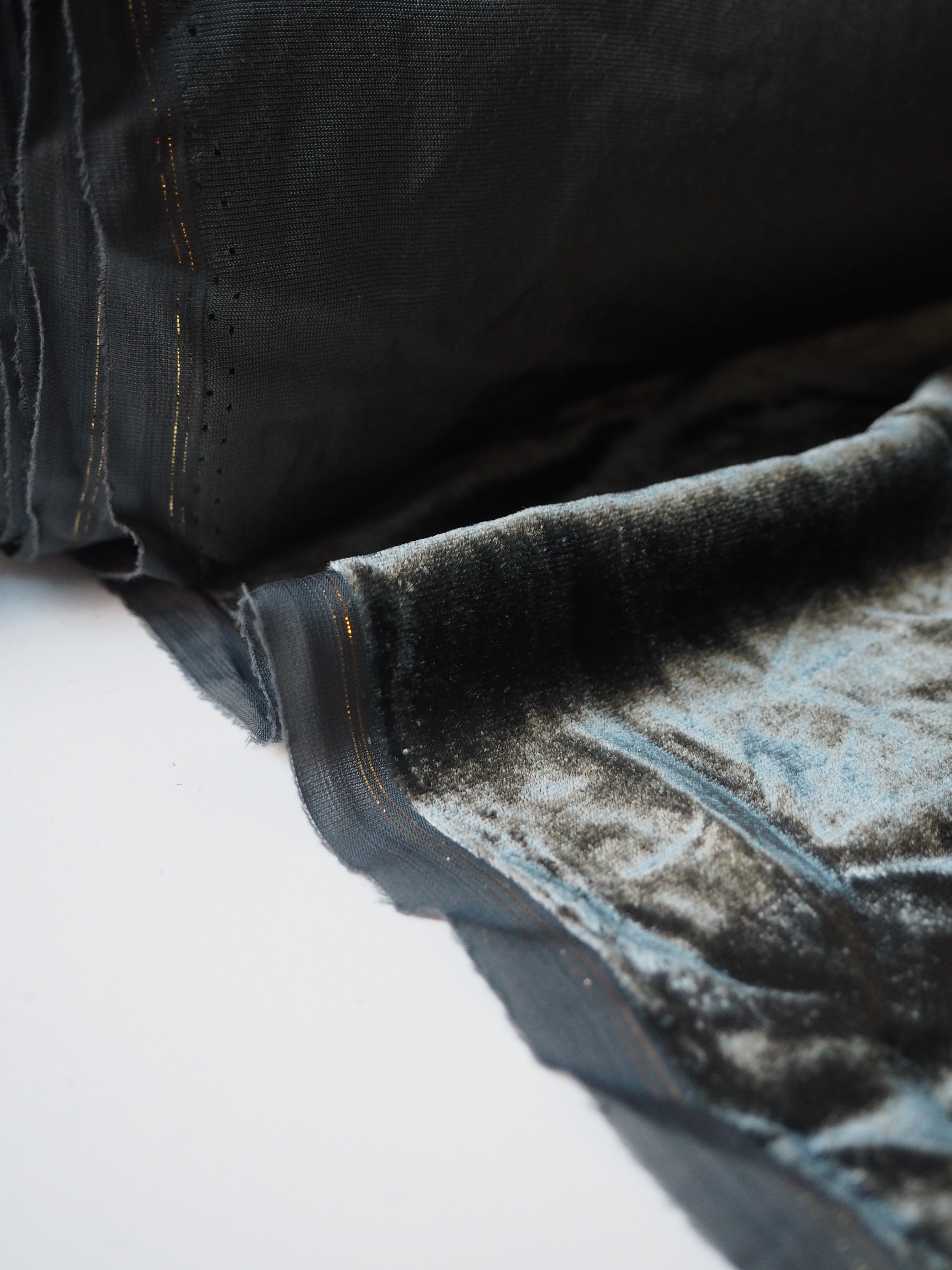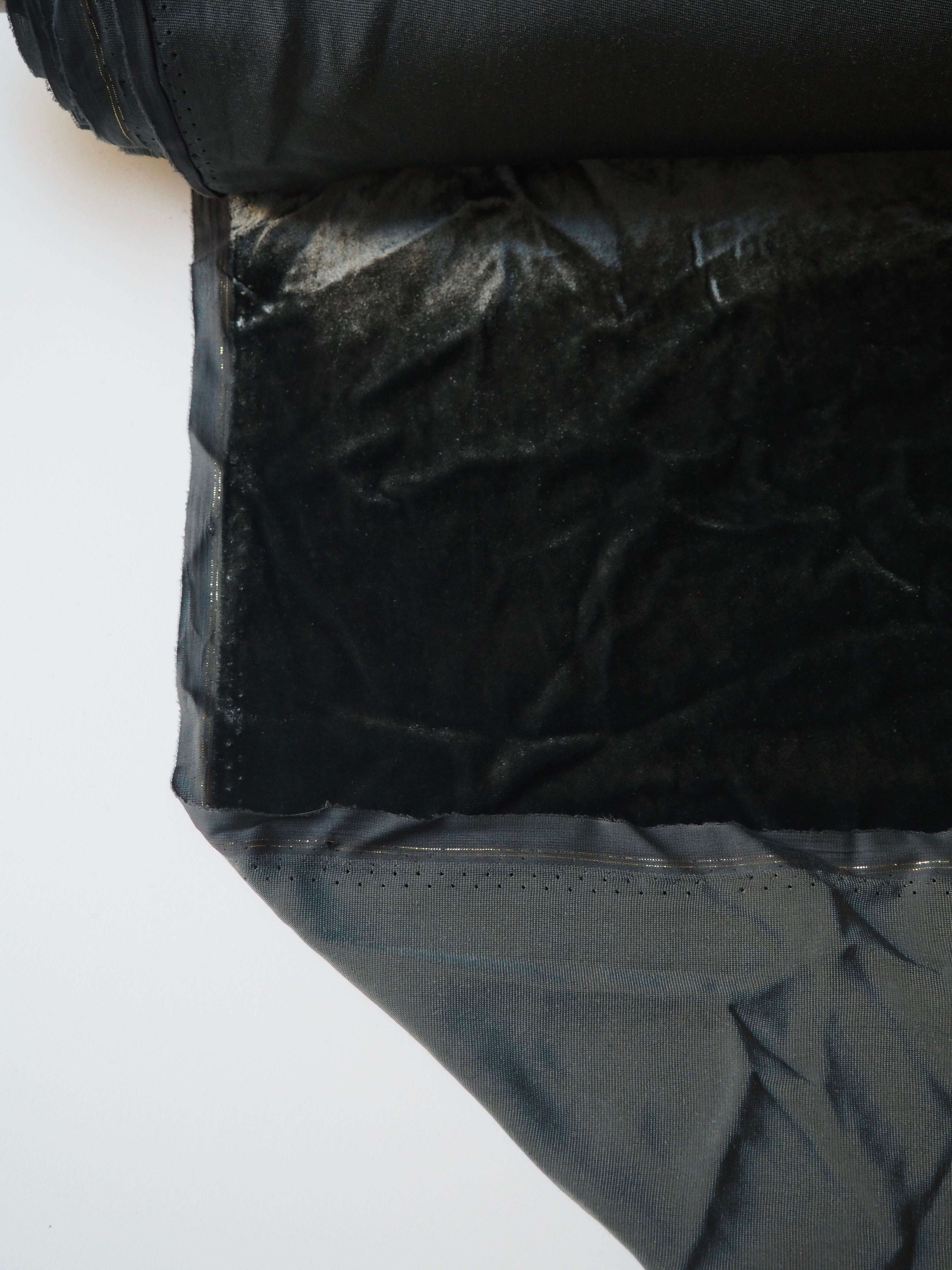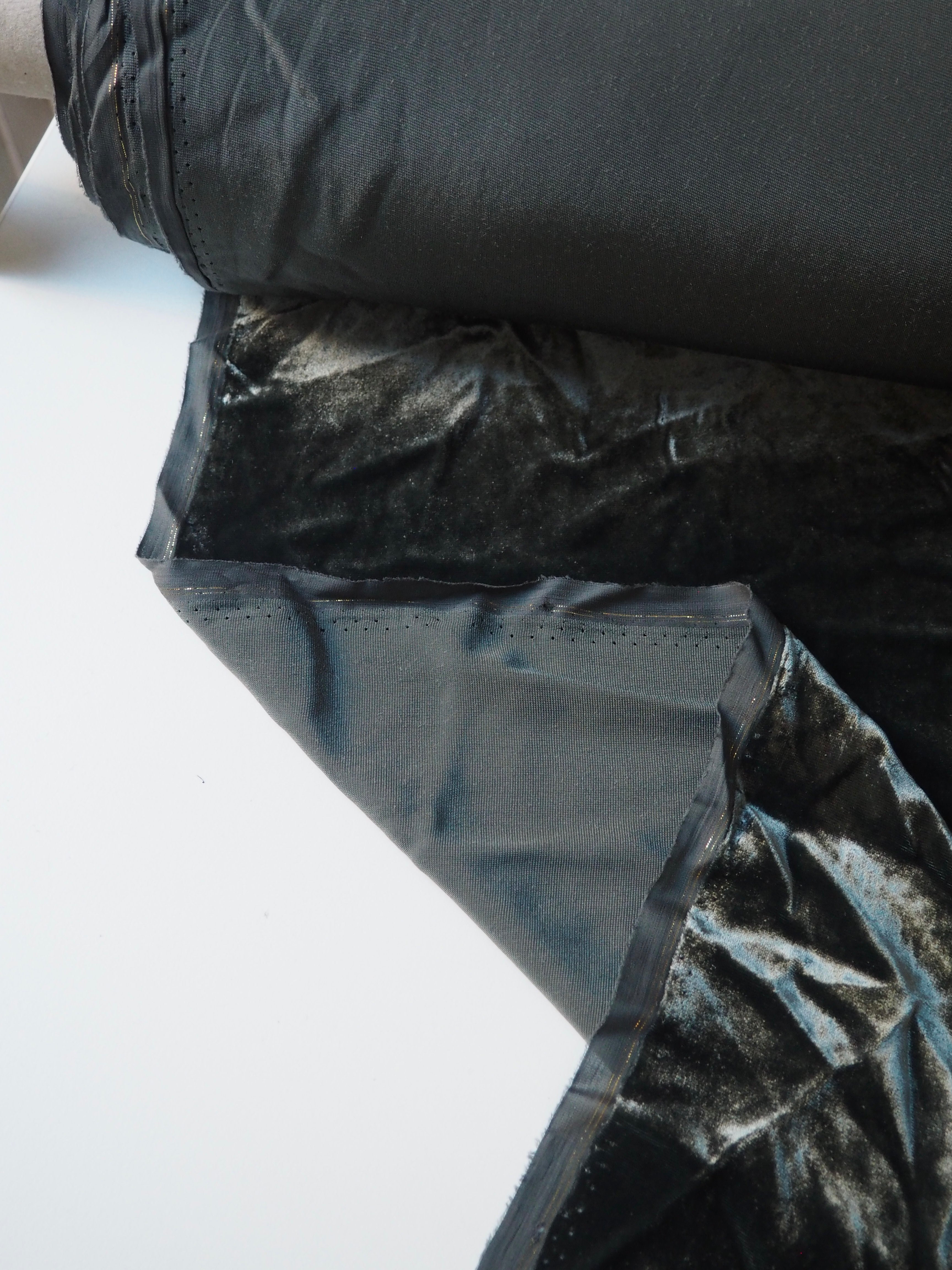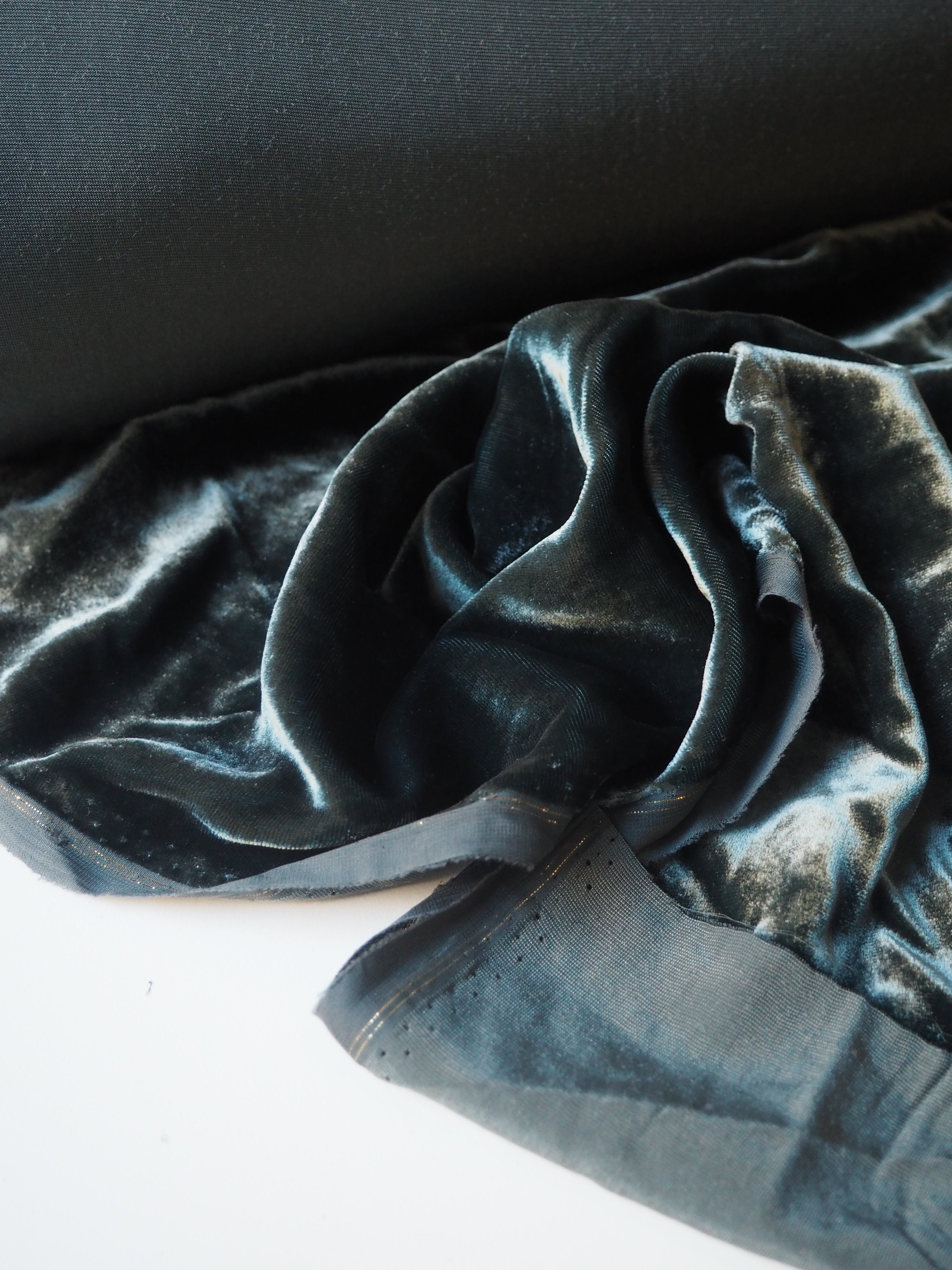 This ex-designer fabric is a sumptuous velvet. It's a fibre blend of viscose and silk, which makes it incredibly soft and luxurious. Has a slightly crushed looking finish from delivery, but steam and brushing can revive the pile if desired. It's opaque, with such a beautiful sheen as well. Has a light to medium pile that is wonderful to handle. Lightweight and with a beautiful drape and lovely movement. Perfect for a dress or even a blouse!