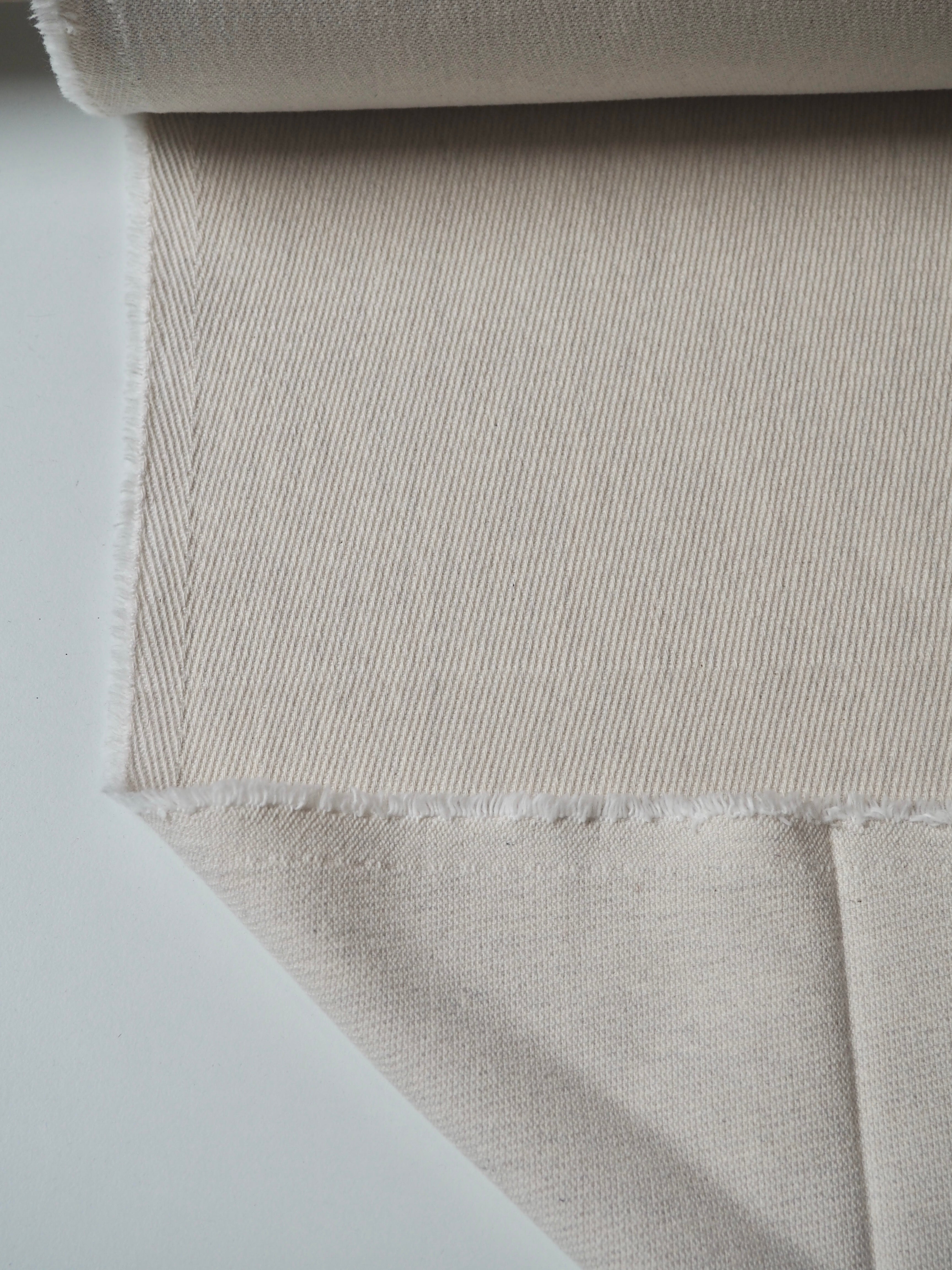 This ex-designer fabric is a cotton twill. It's in a natural cream colour. Light to medium weight with a soft structure and pronounced twill weave. A very soft handle typical of a nice cotton. Perfect as a blank canvas for dyeing! Great for jackets, totes, and home projects!
