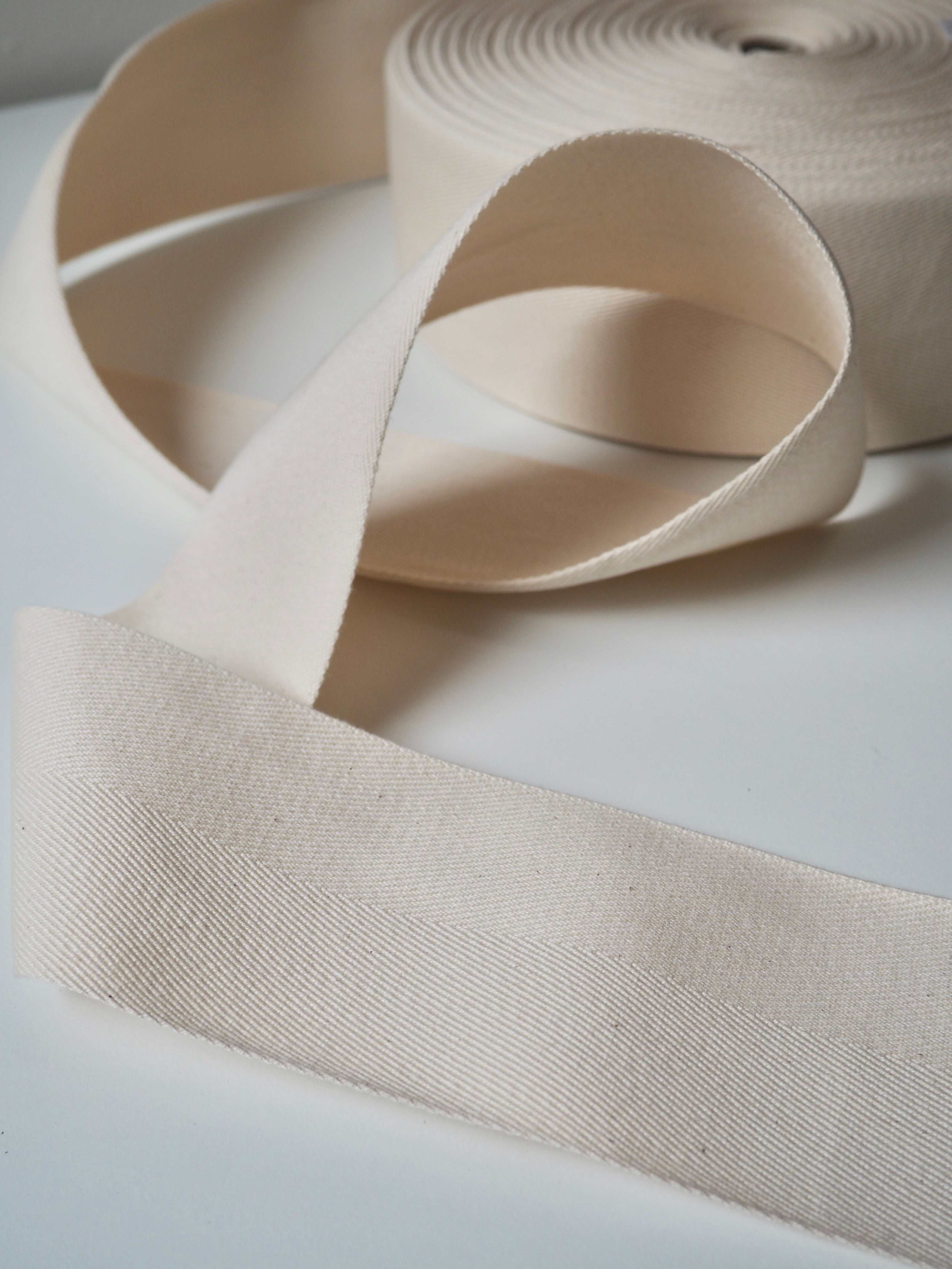 This ex-designer trim is a cotton webbing. This webbing is woven with a herringbone weave. It is heavy weight and thick so has a nice strong structure. It's sturdy and easy to use for so many projects- would be perfect for straps on a backpack, or for a belt or strap on a garment or even furnishing projects!