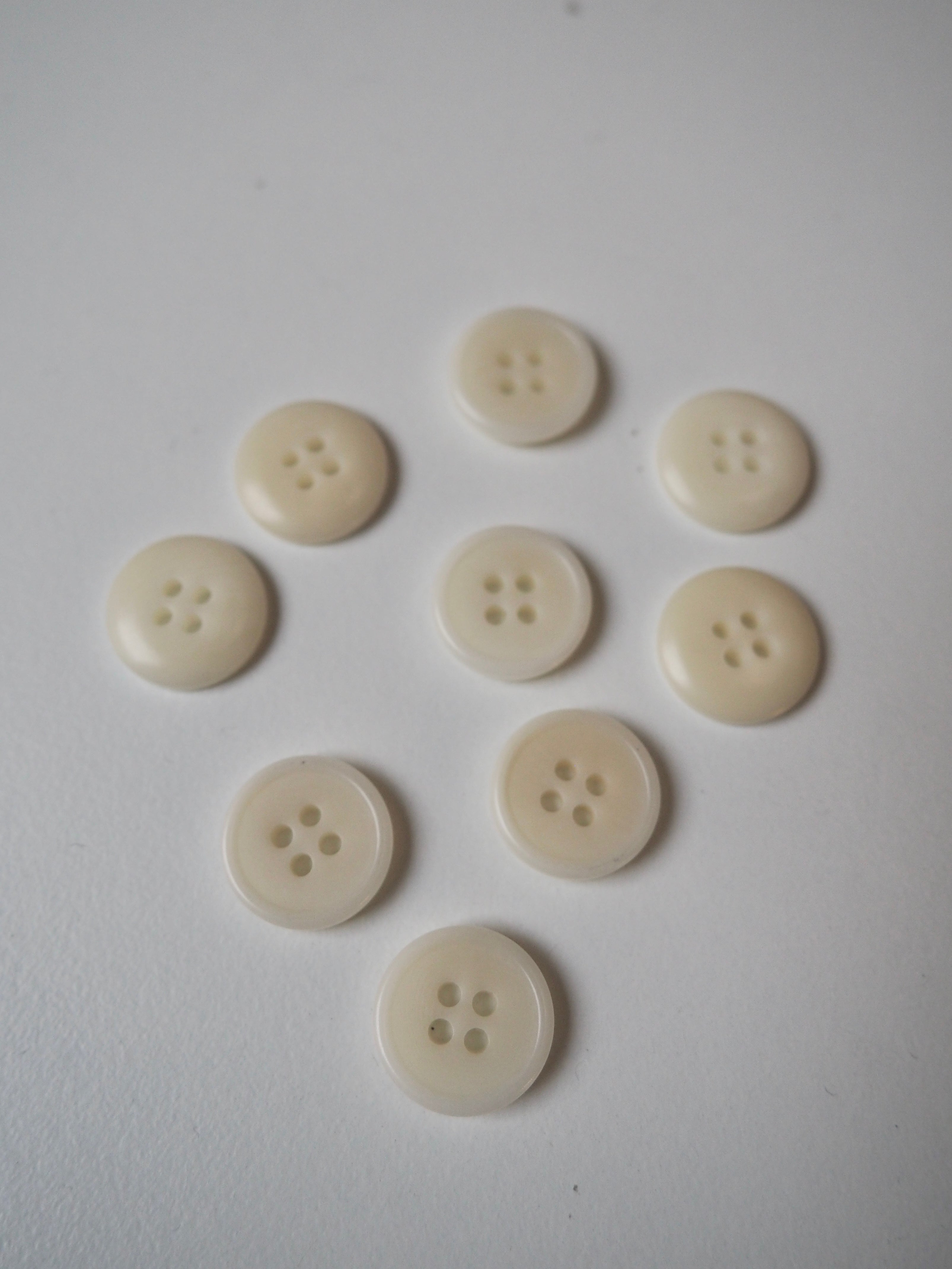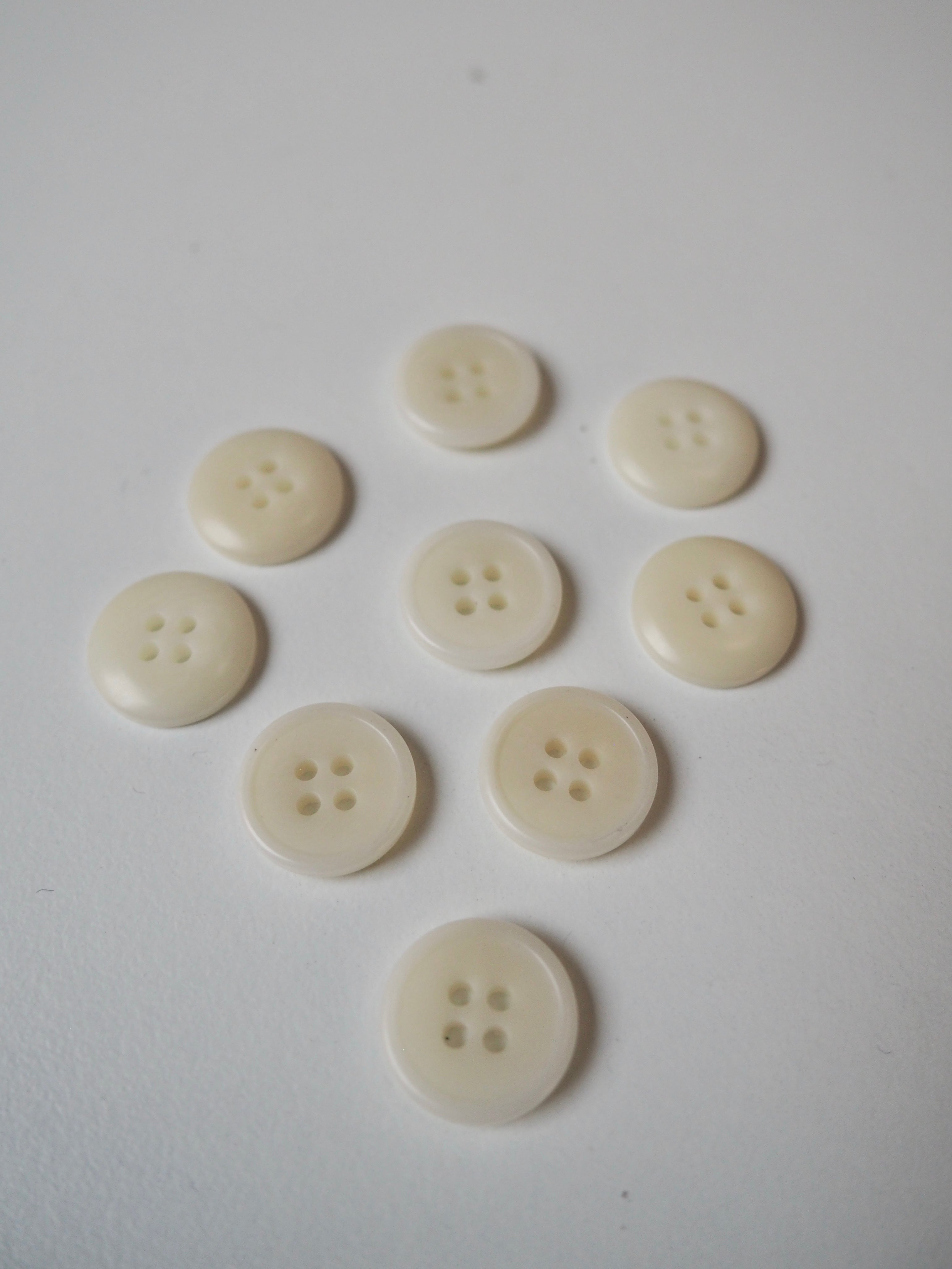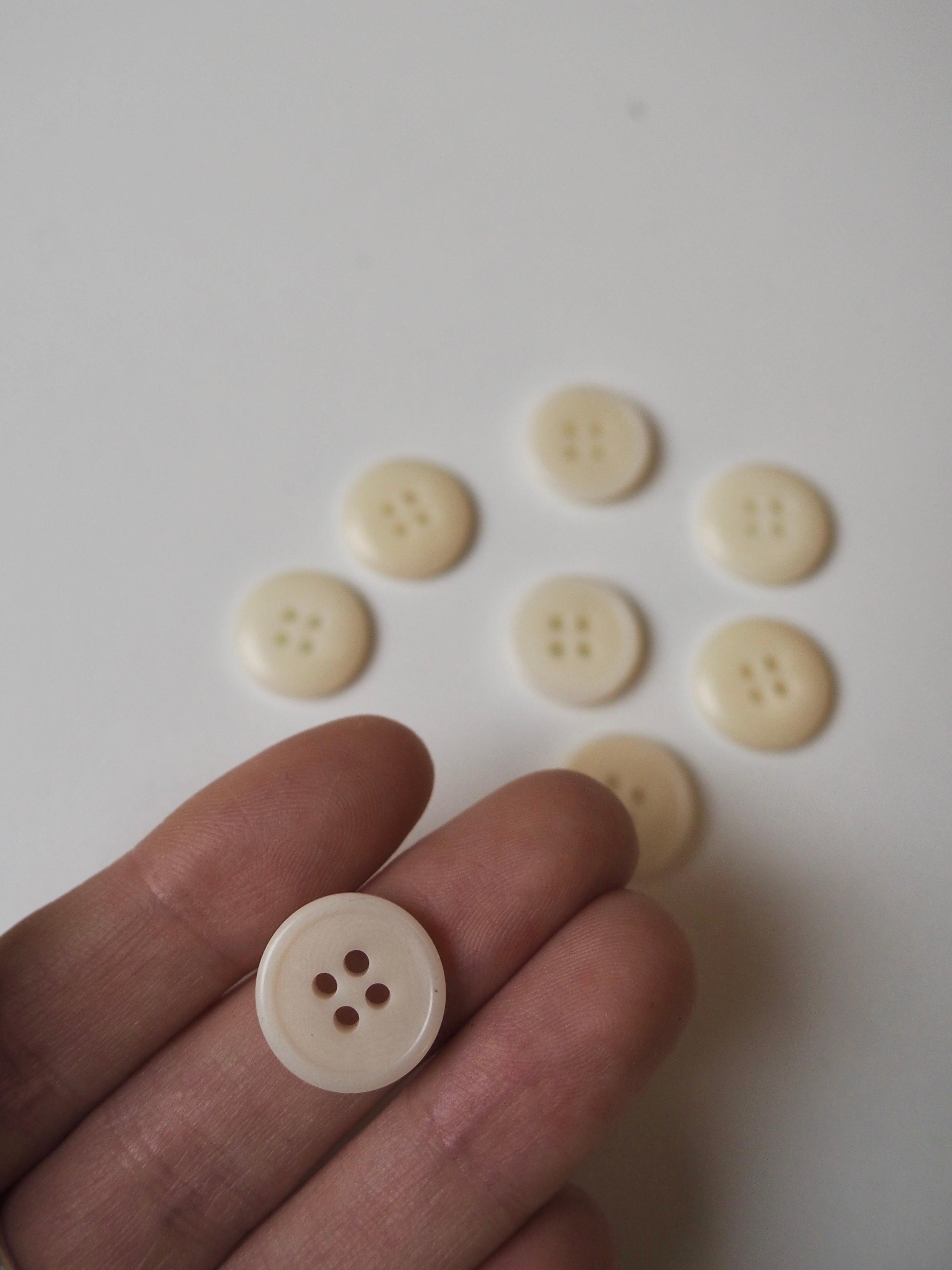 This ex-designer trim are natural corozo buttons, 4-hole with a slim rimmed edge. Corozo is a sustainable alternative to traditional horn or plastic buttons. Made from the nuts of the Tagua Palm, corozo buttons are completely natural and biodegradable. They can be dyed many different colours and have a lovely wood-like grain. Perfect size for shirts, cardigans and dresses.