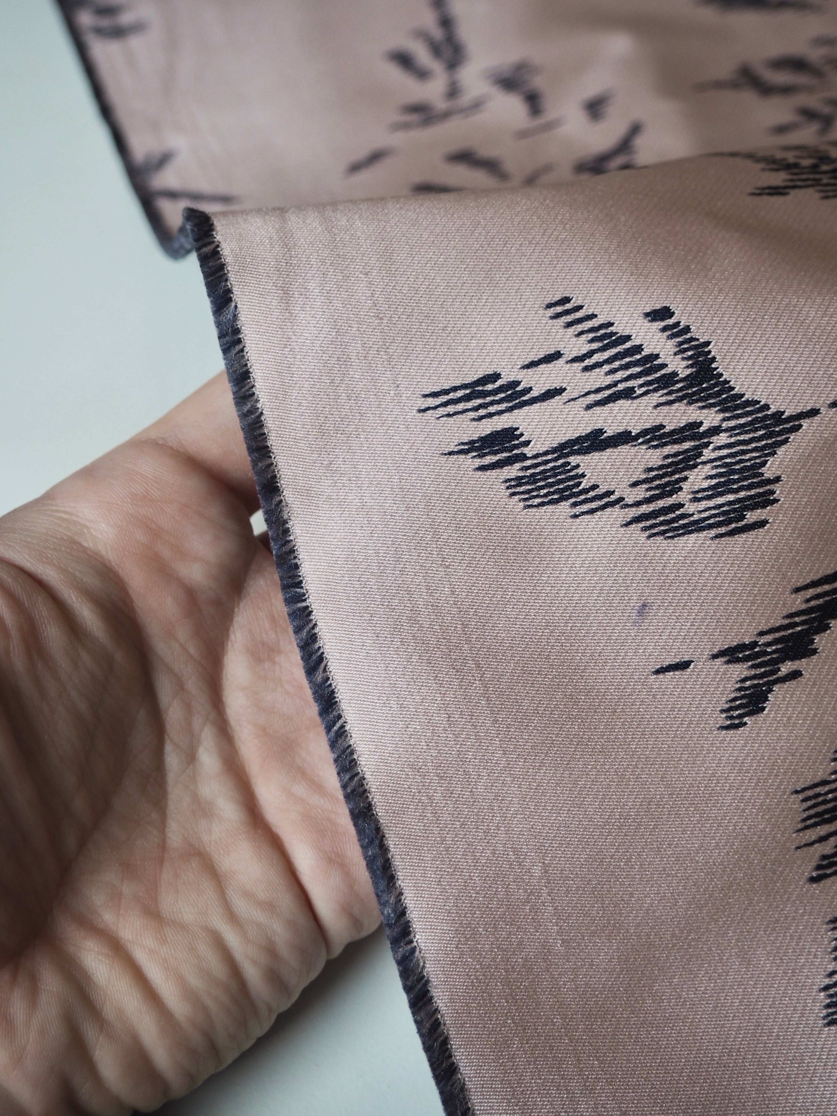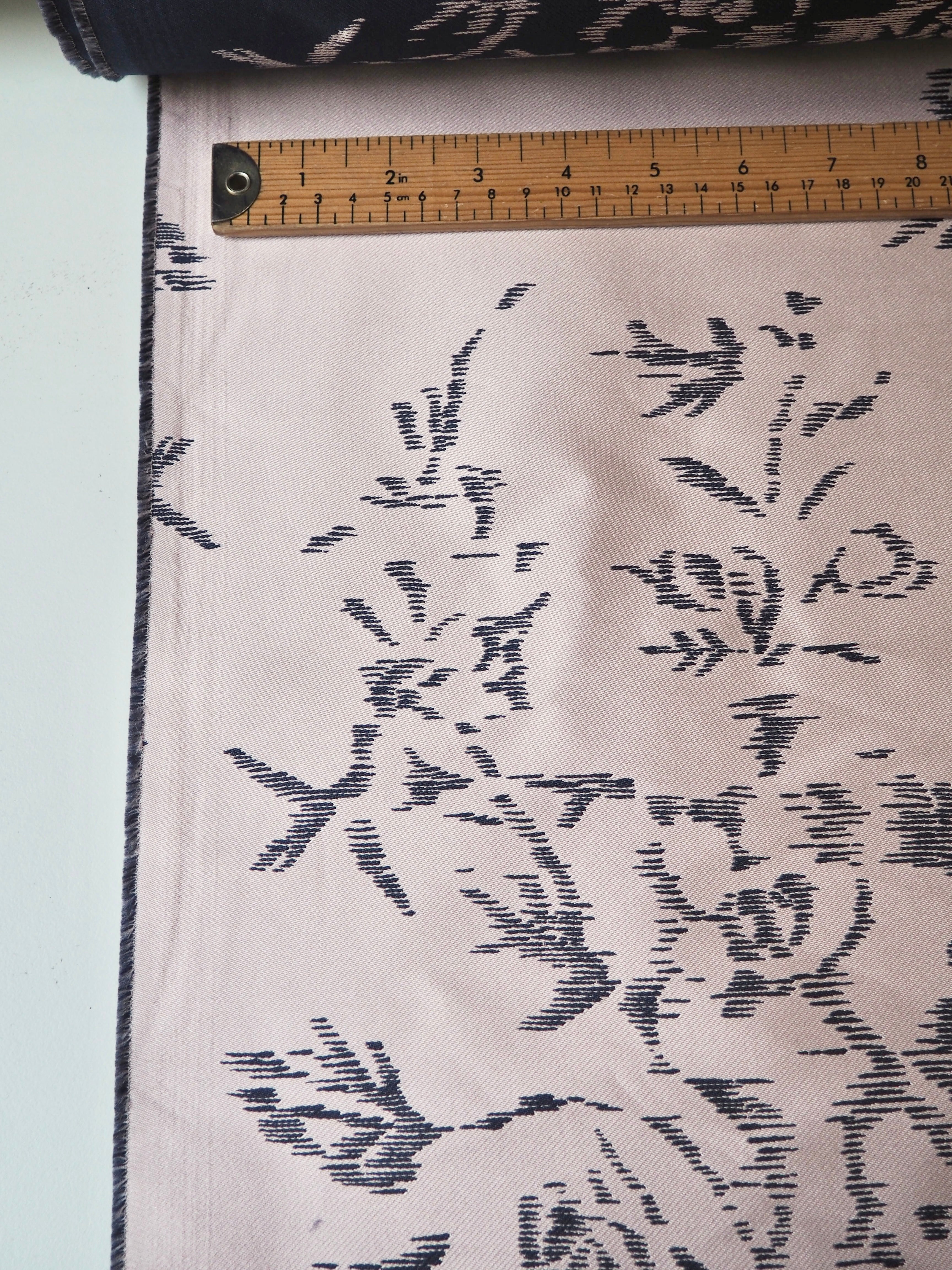 This ex-designer fabric is a jacquard. Either side of this fabric could be used, with navy and blush pink abstract floral design in opposite colours. It's opaque, light weight with a soft structure. It's quite smooth and soft in handle. Would make a beautiful light jacket or fitted dress!