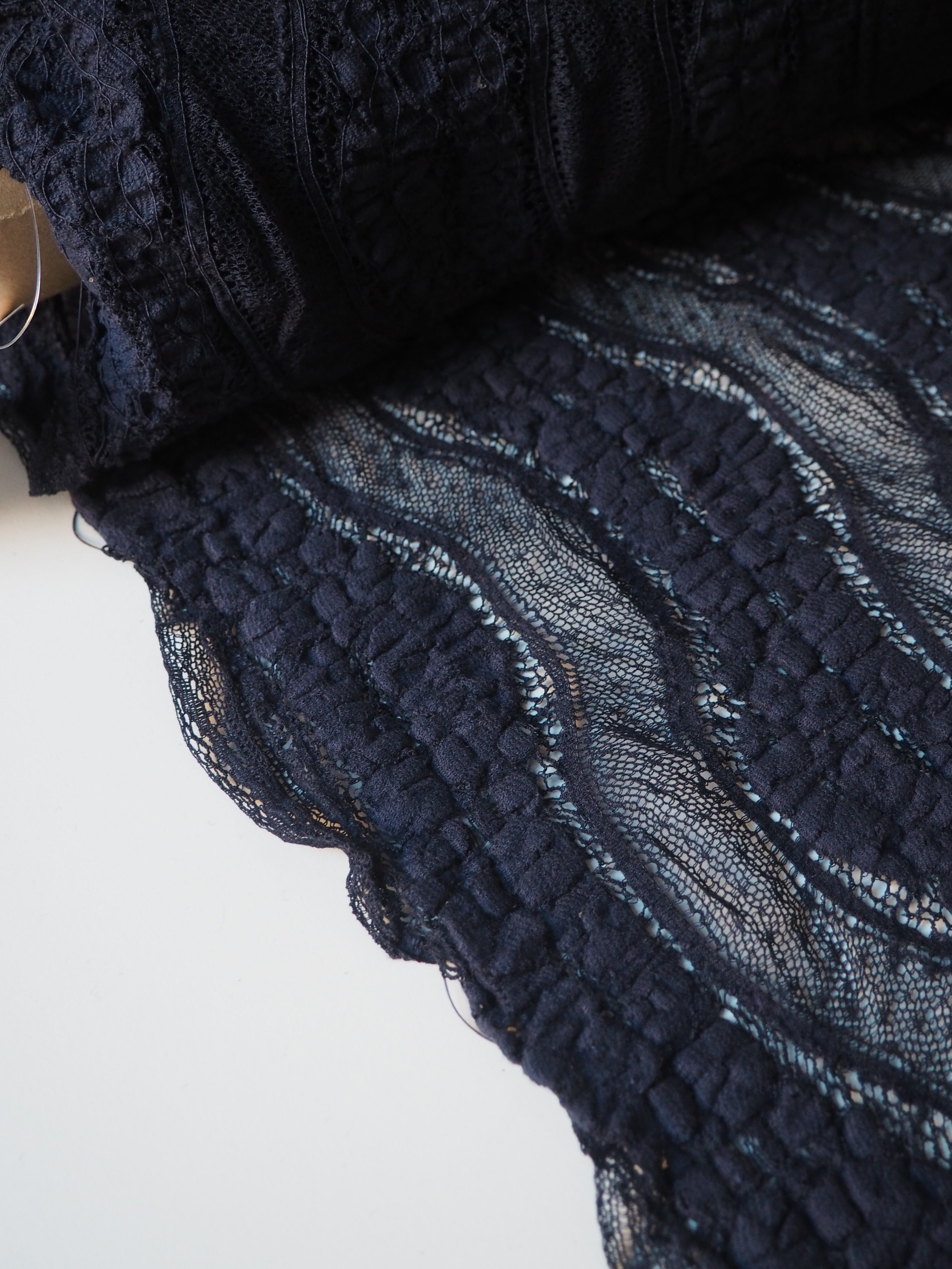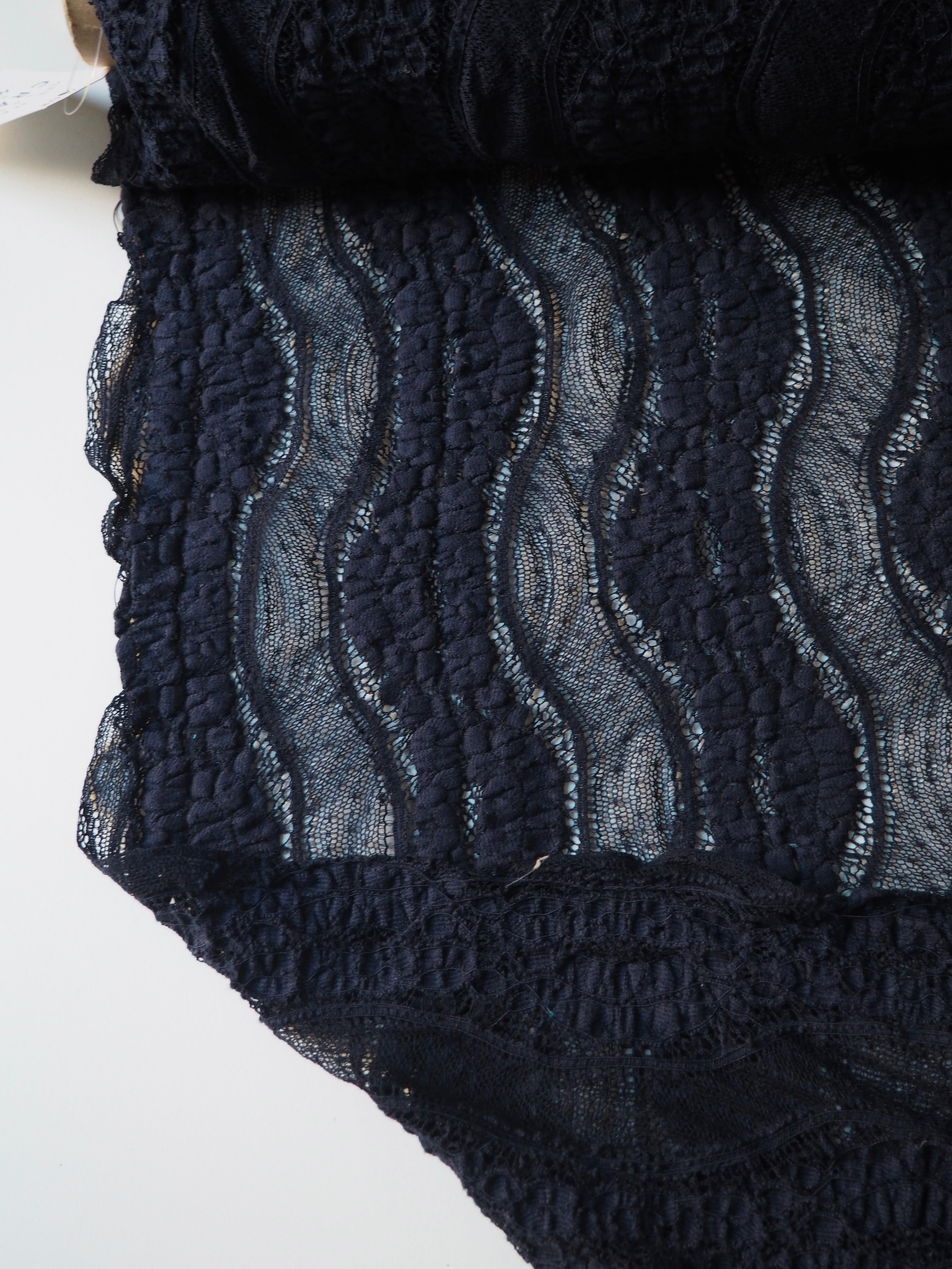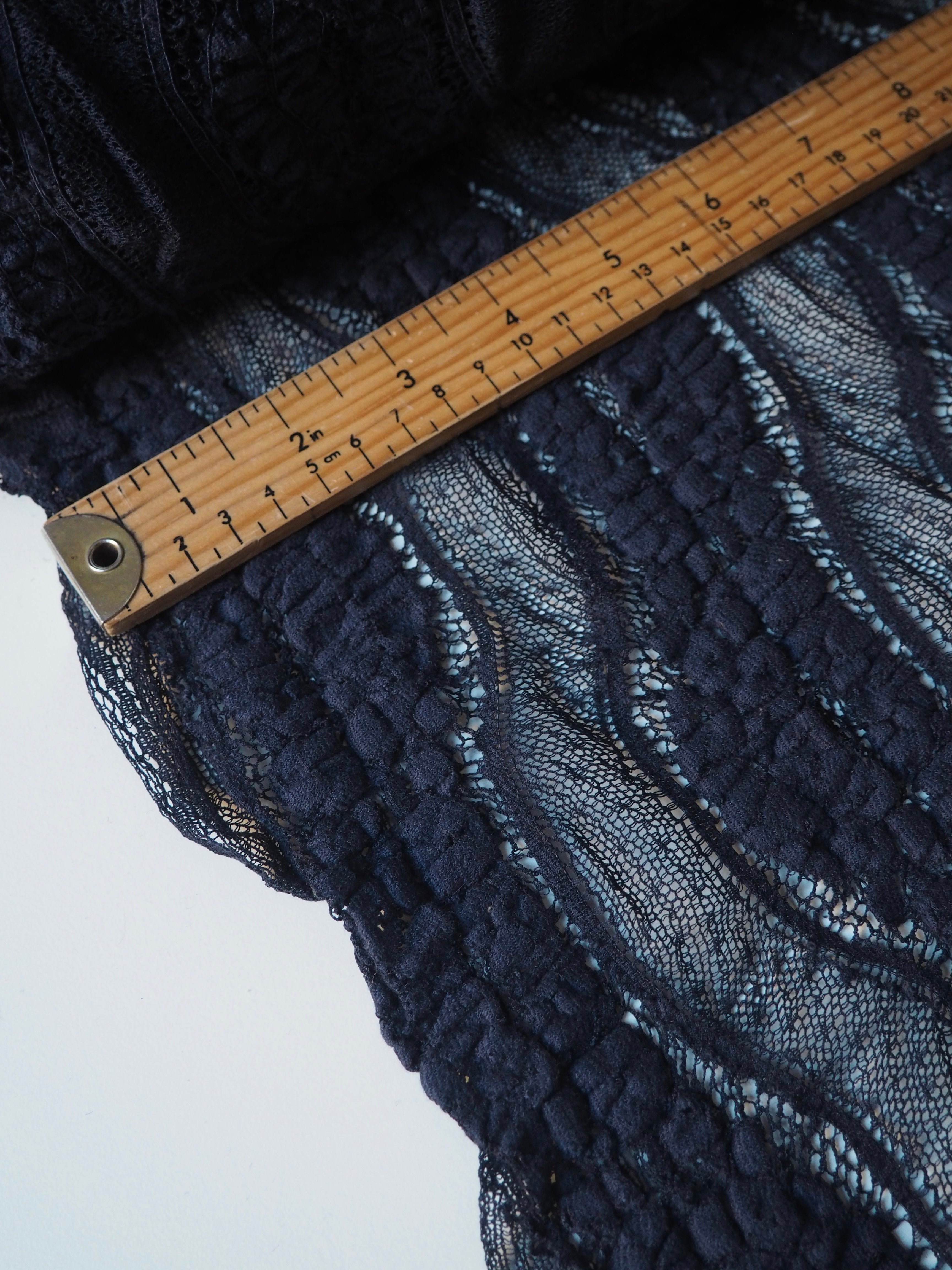 This ex-designer fabric is a stretchy lace. It's a wavy striped design with soft, seersucker-like sections mixed with semi-sheer netted sections. Lovely medium thickness and comfortable, soft handle. A medium coverage lace design. Has about 30% length-ways stretch. Perfect for dresses or tops!