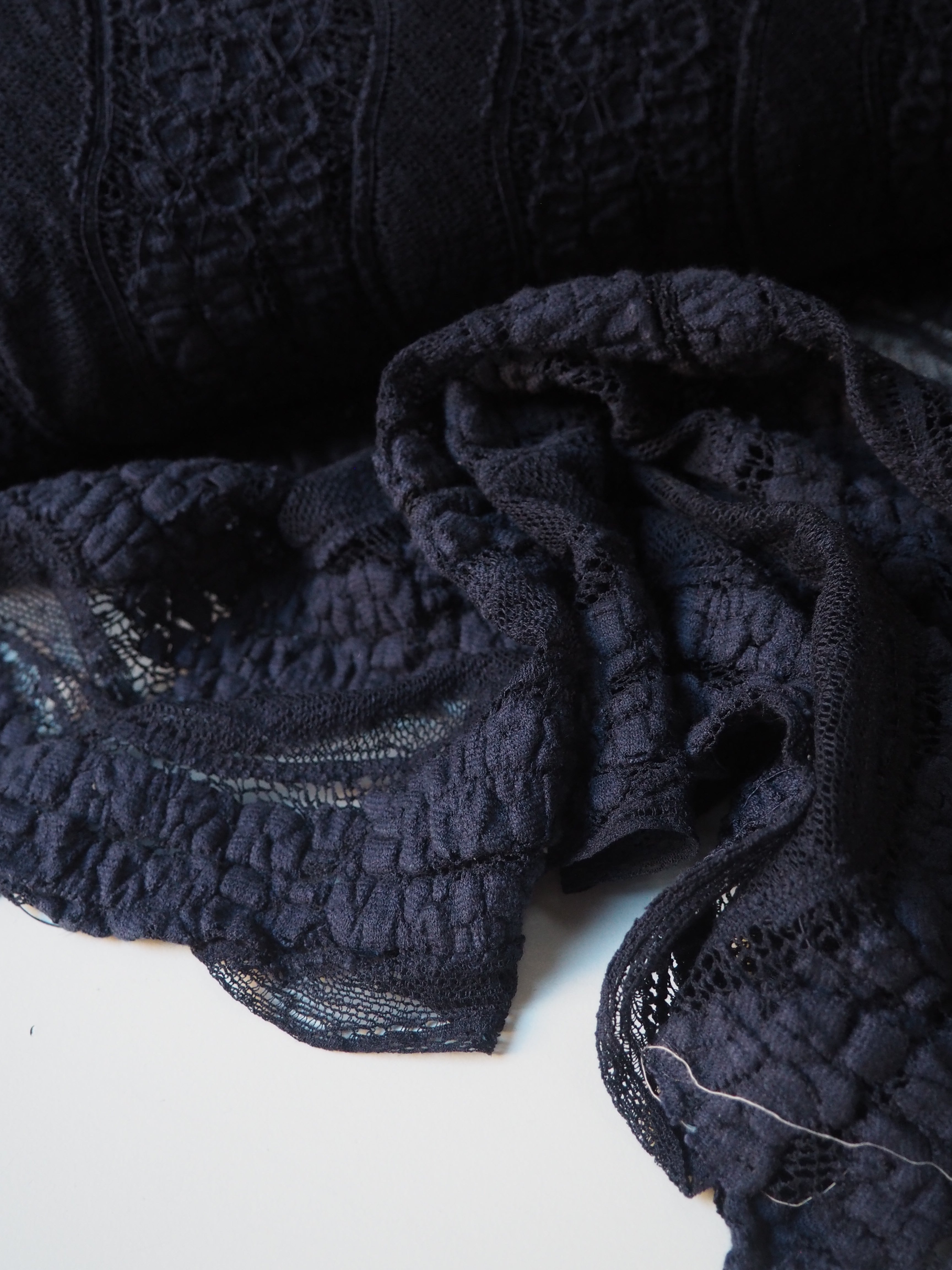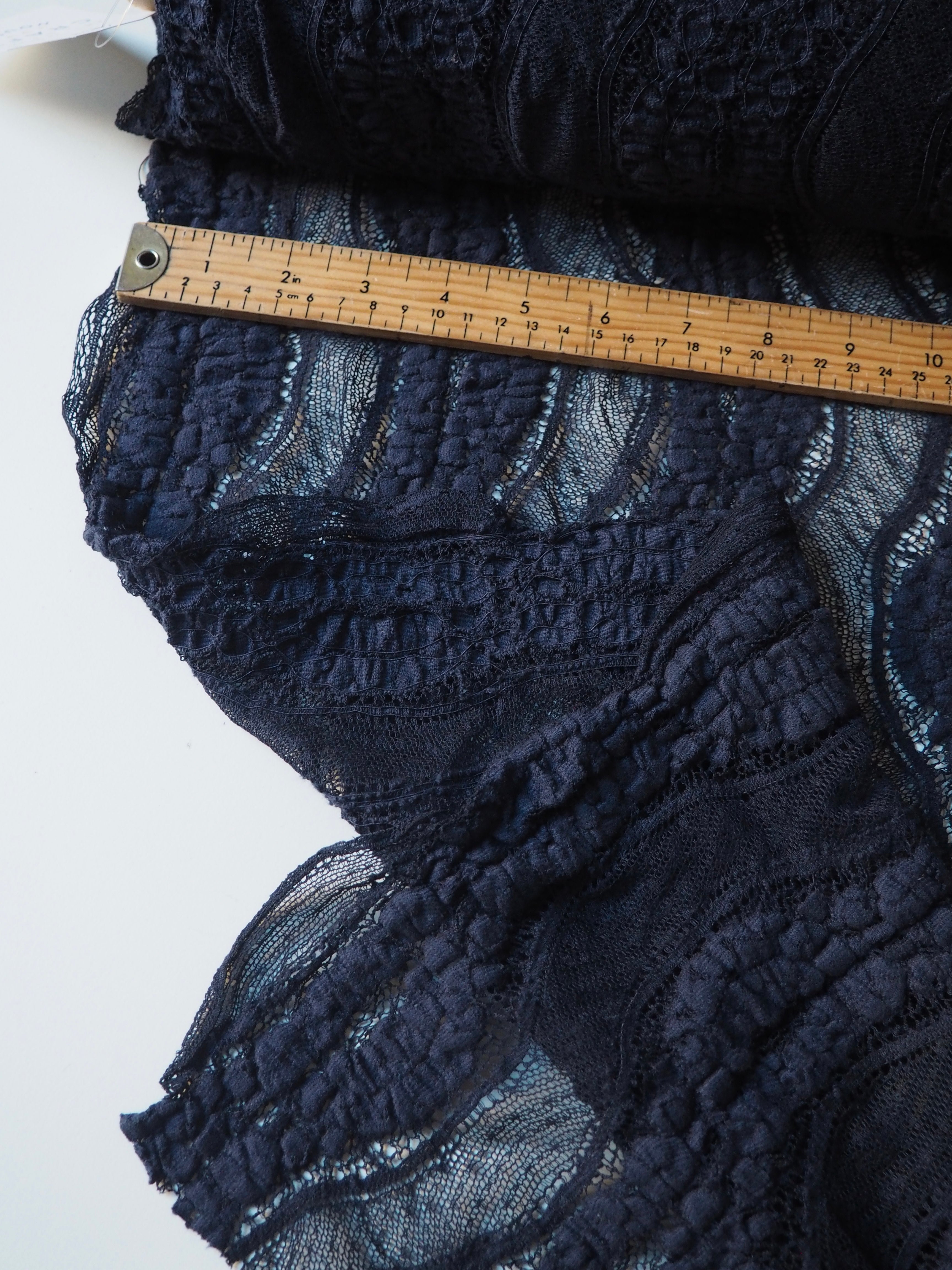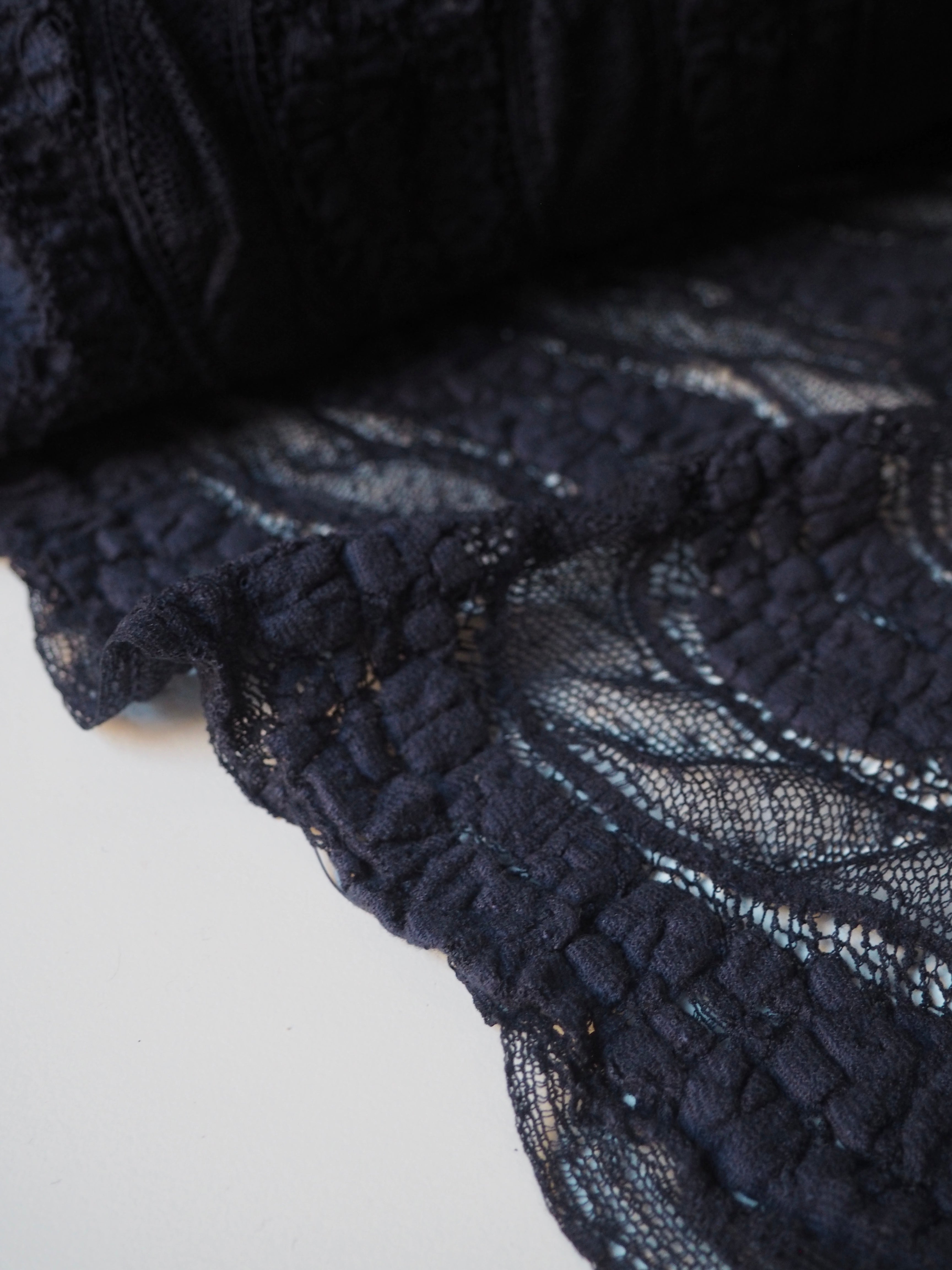 This ex-designer fabric is a stretchy lace. It's a wavy striped design with soft, seersucker-like sections mixed with semi-sheer netted sections. Lovely medium thickness and comfortable, soft handle. A medium coverage lace design. Has about 30% length-ways stretch. Perfect for dresses or tops!