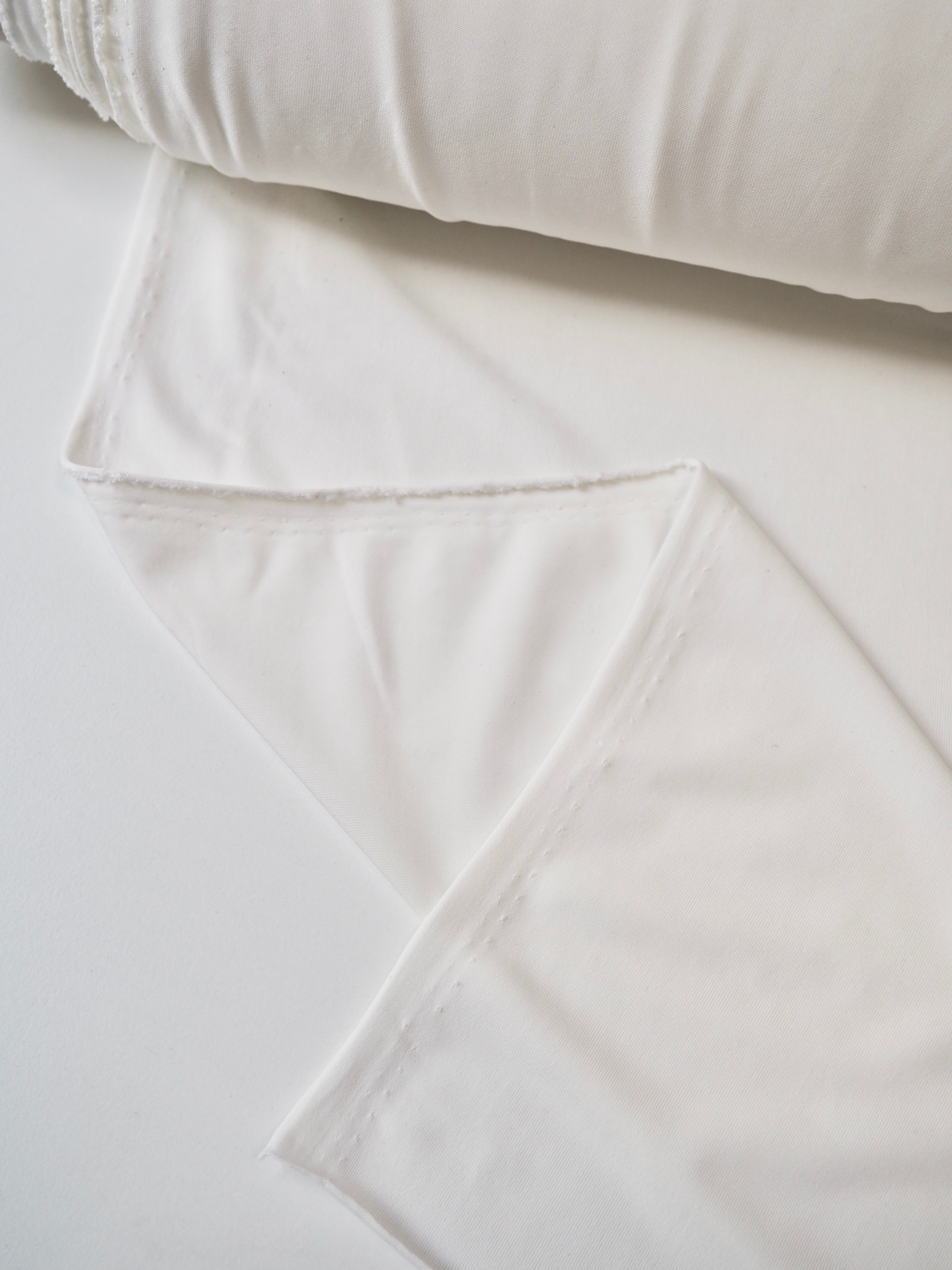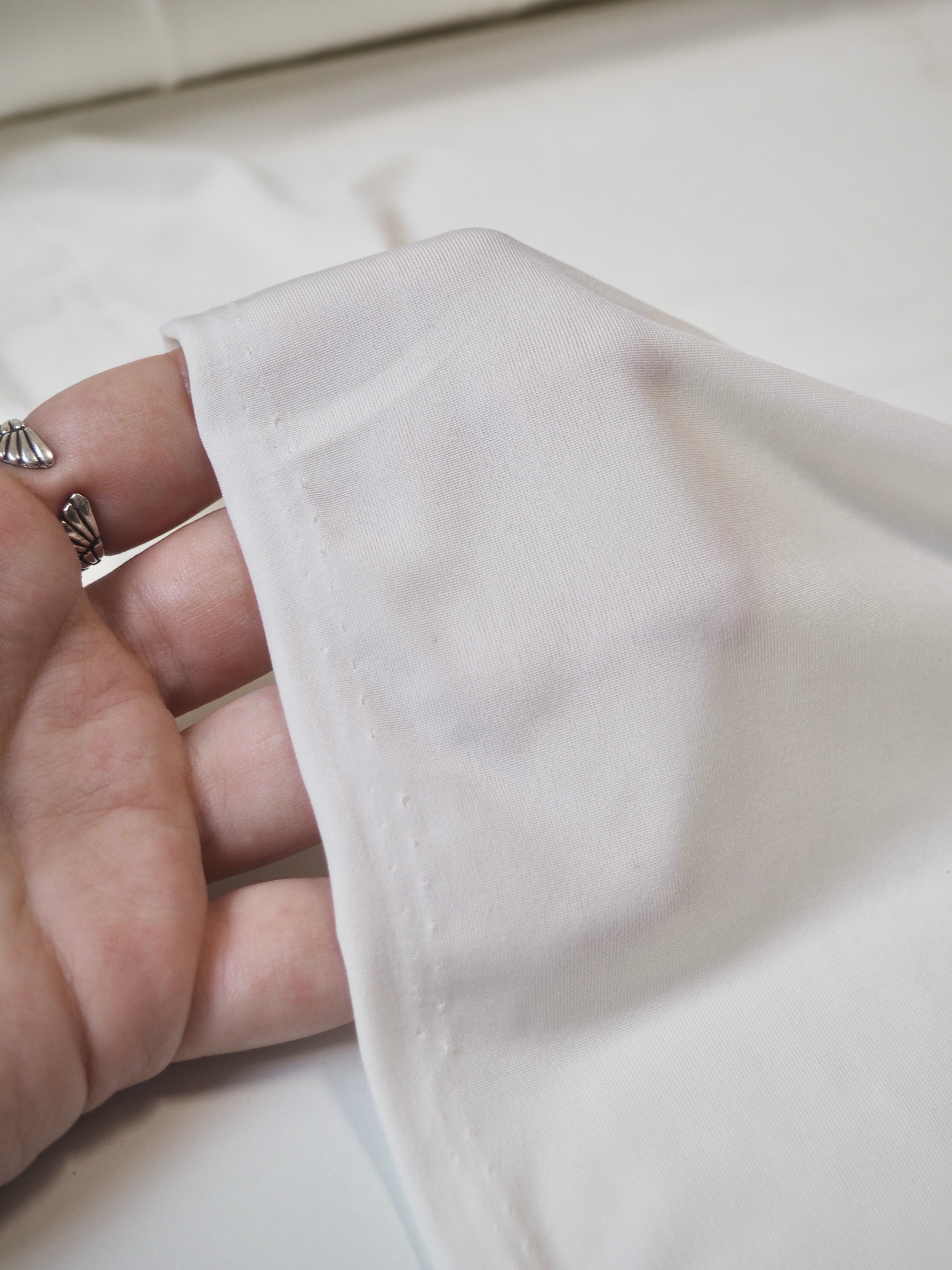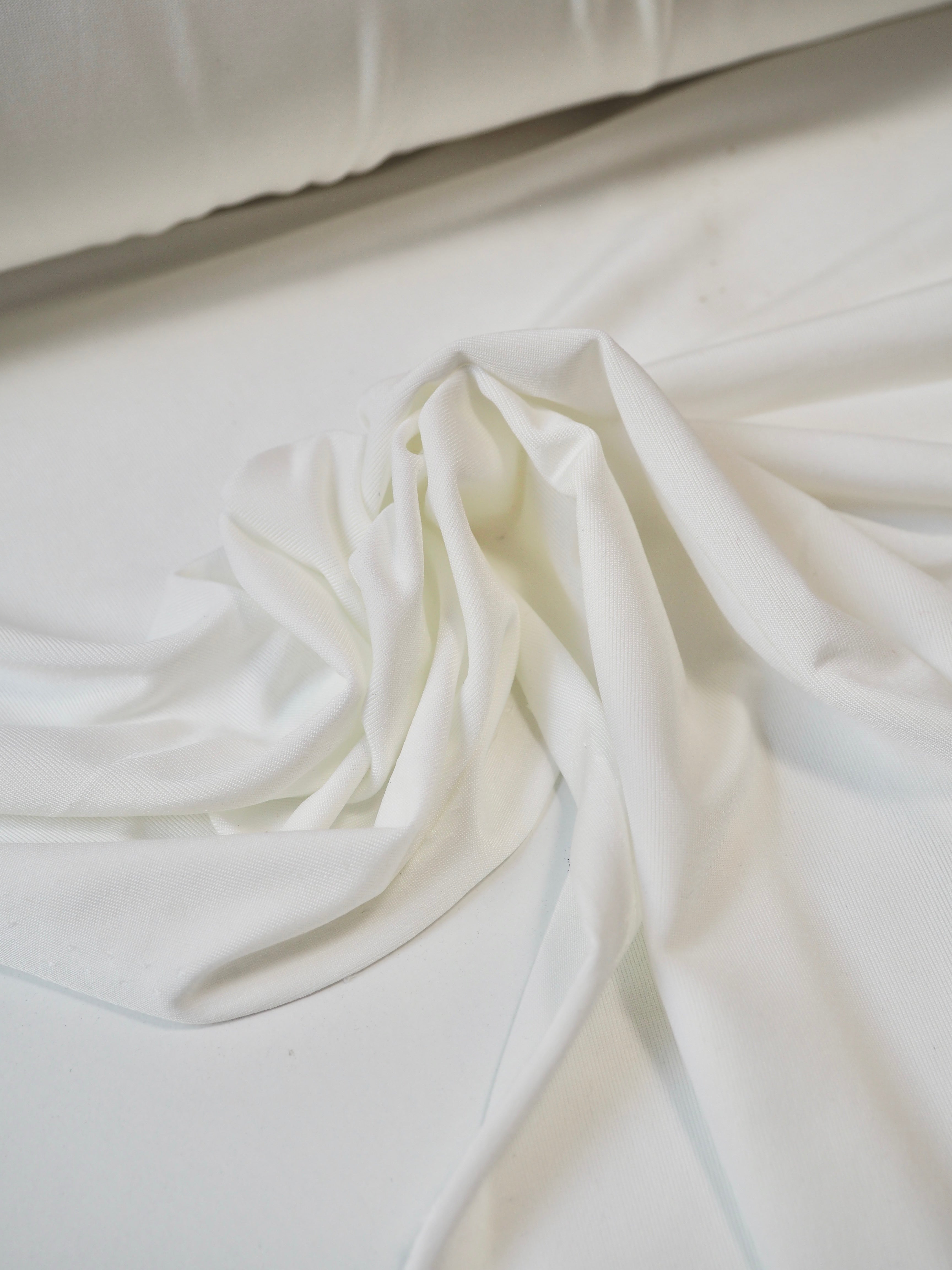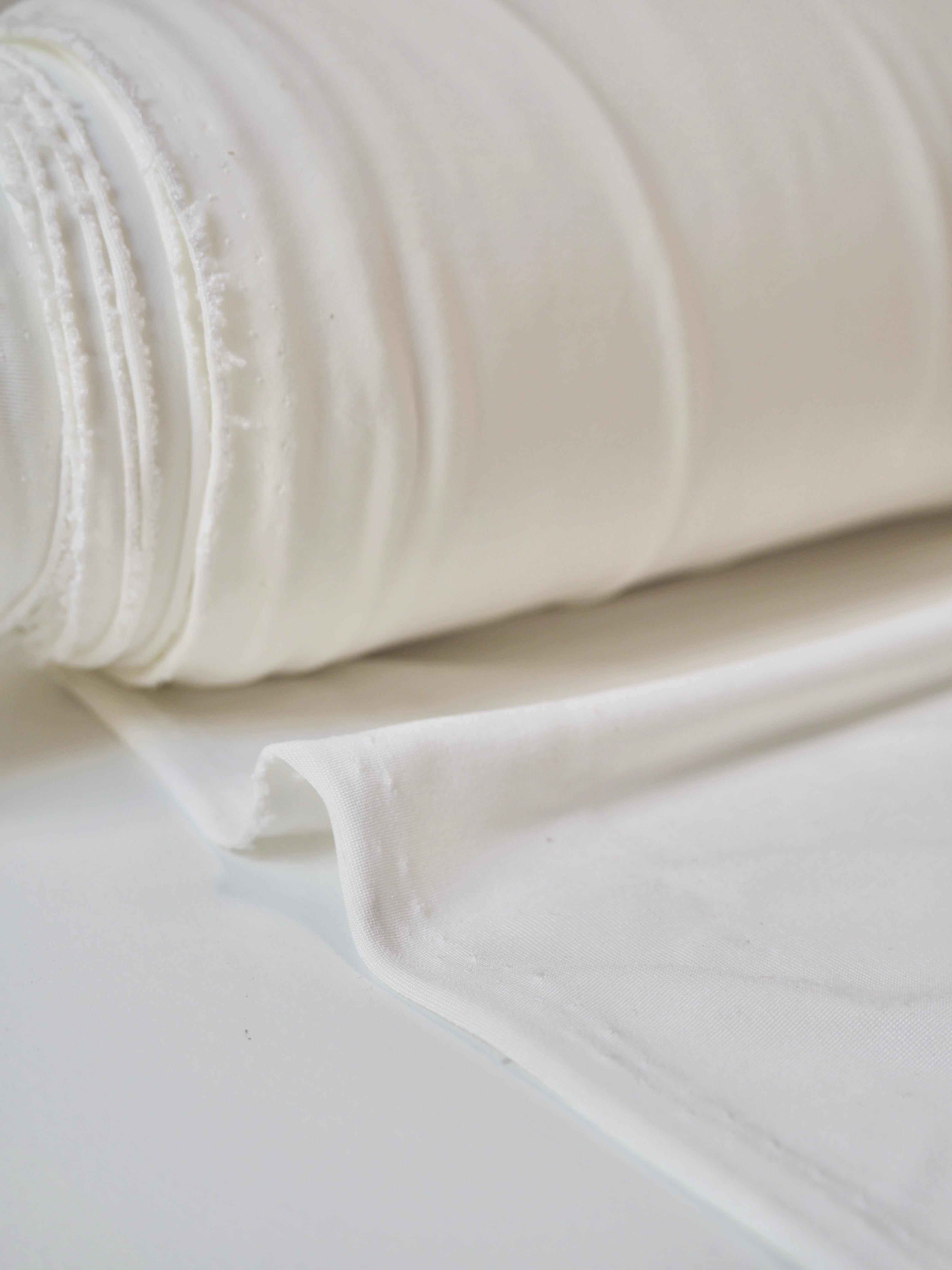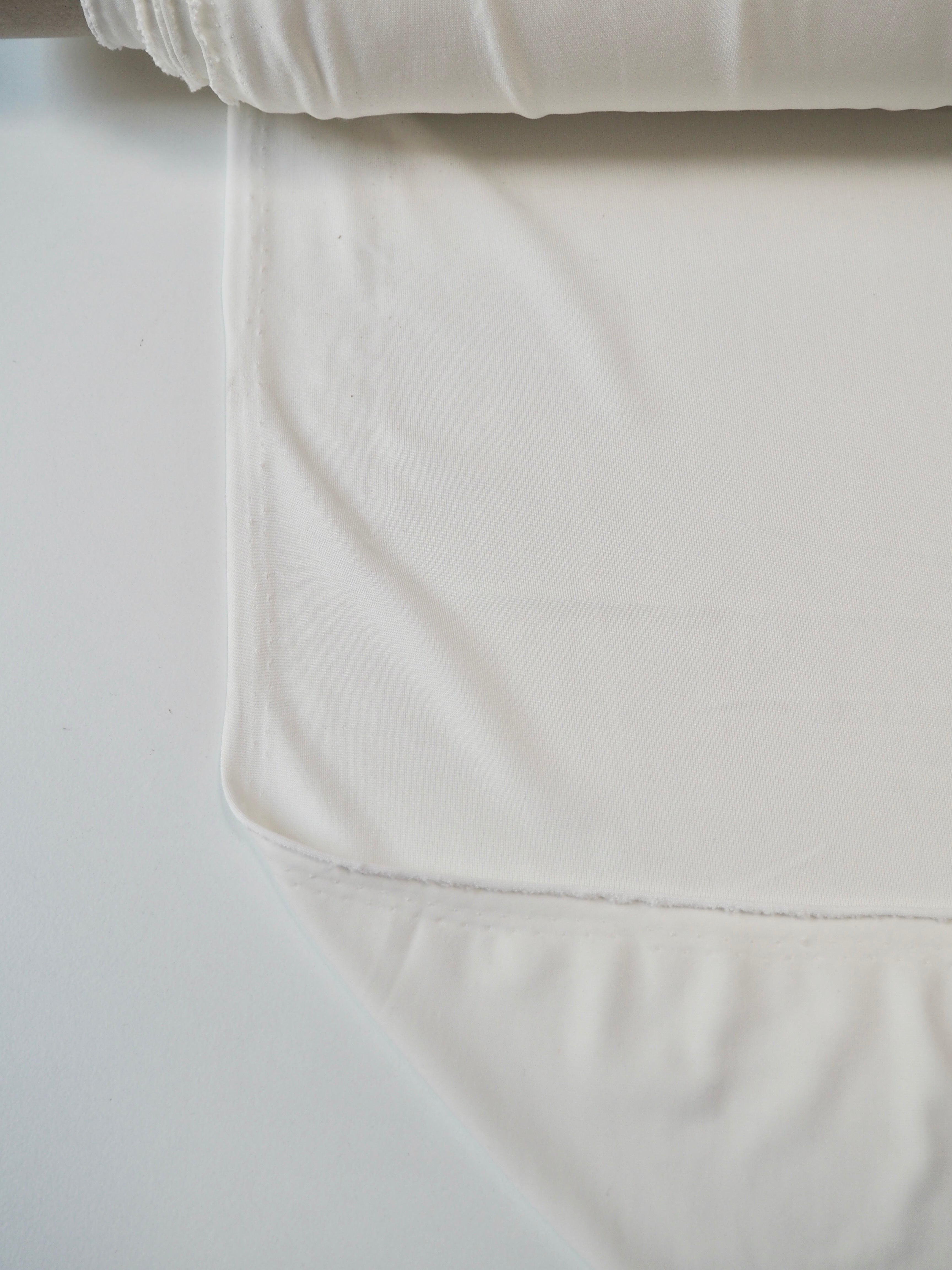 This ex-designer fabric is a single jersey. It's mostly opaque and lightweight. It has a slight sheen finish and very soft, peached handle. About 50% stretch each way and great recovery. Super drapey and lovely movement. Great for everyday basics, fitted dresses, and perfect for dress linings!