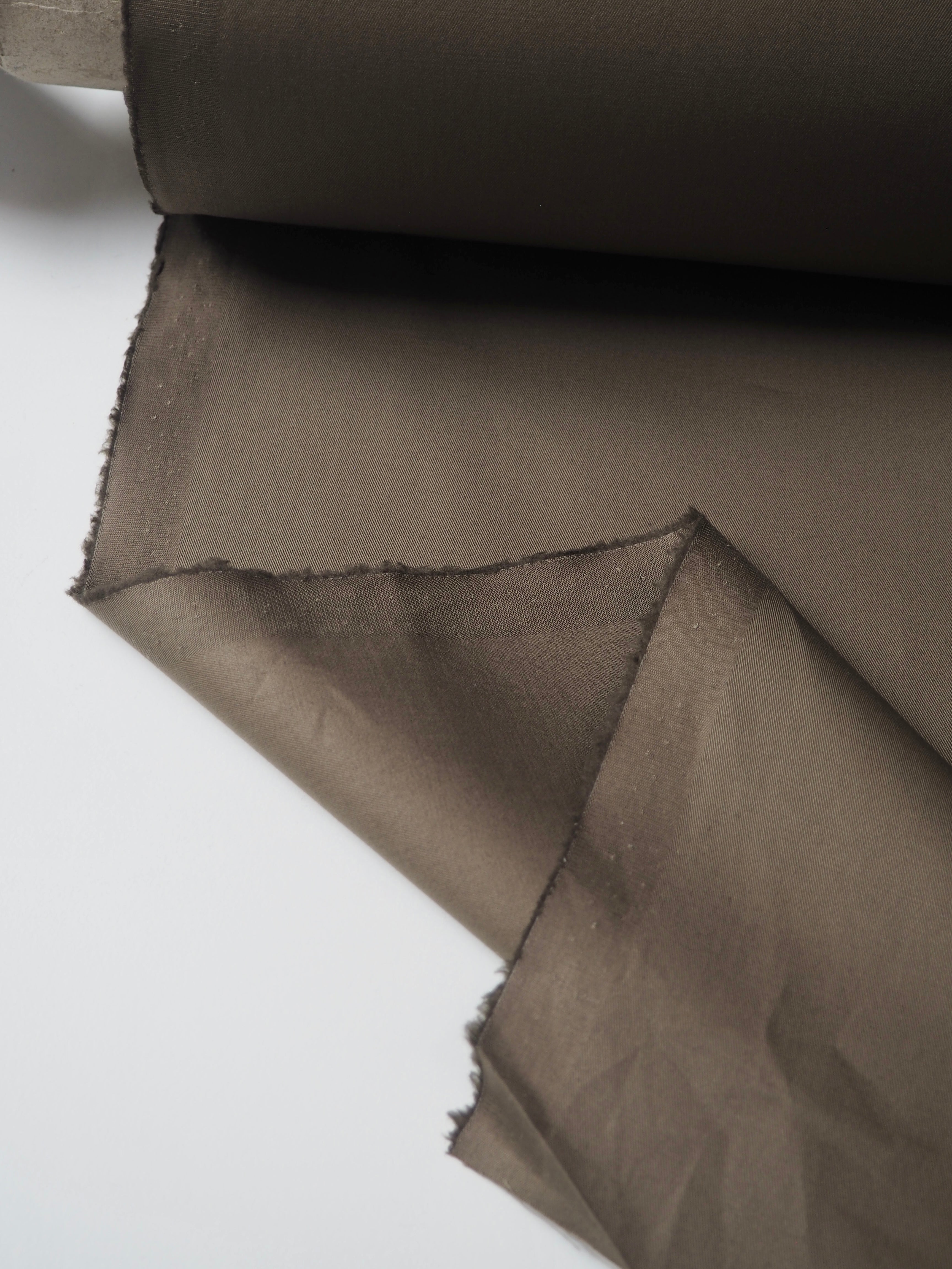 This ex-designer fabric is a light cotton twill. It's in a gentle olive green colour. It's lightweight with a nice crisp feel and very slight sheen finish. It's soft and very versatile. Has a lovely gentle structure that makes it perfect for trench jackets, trousers, shorts, or our Lunar Jacket! This colour is hard to capture in photos, we have done our best. Watch the video to see it better!