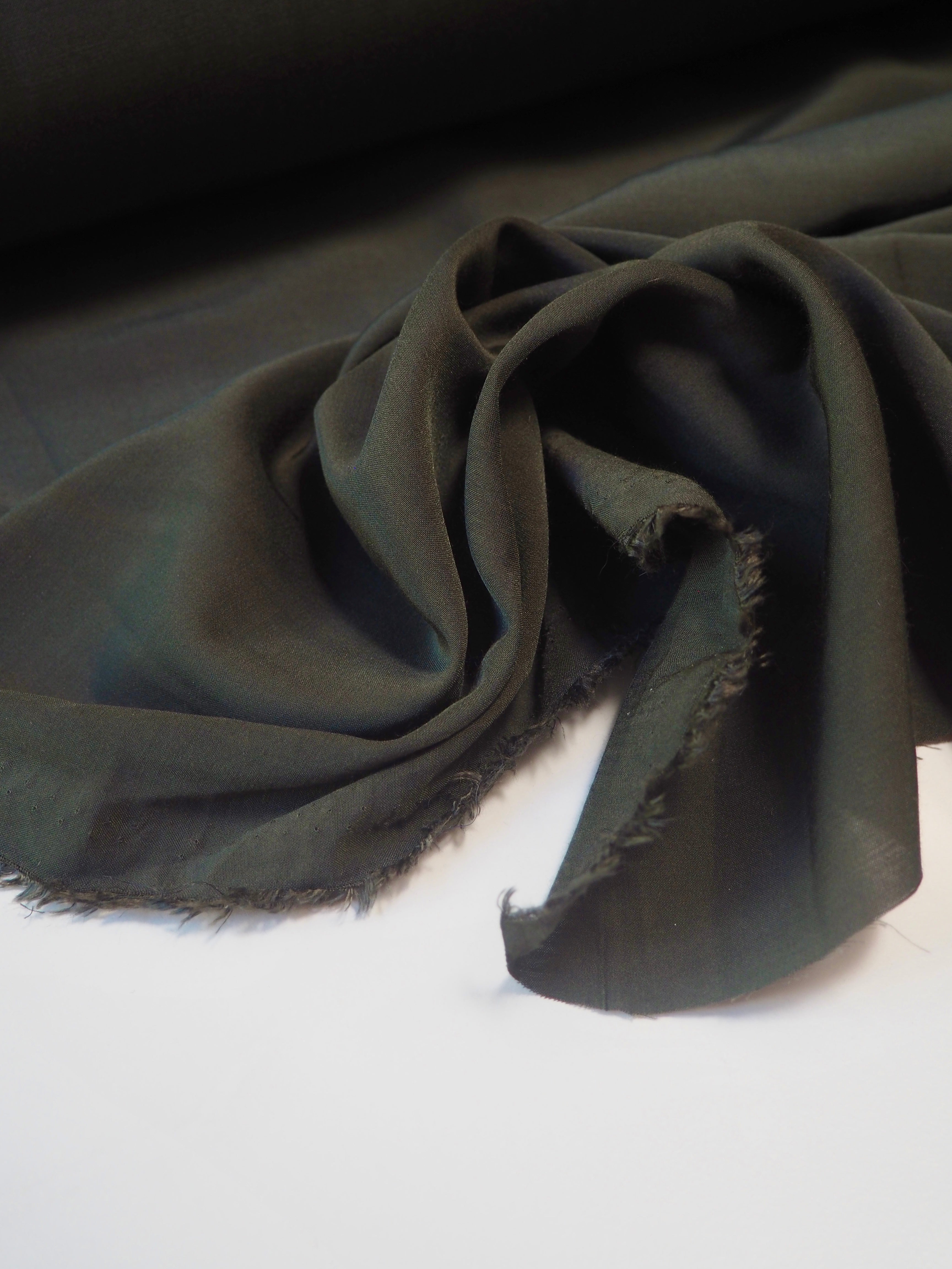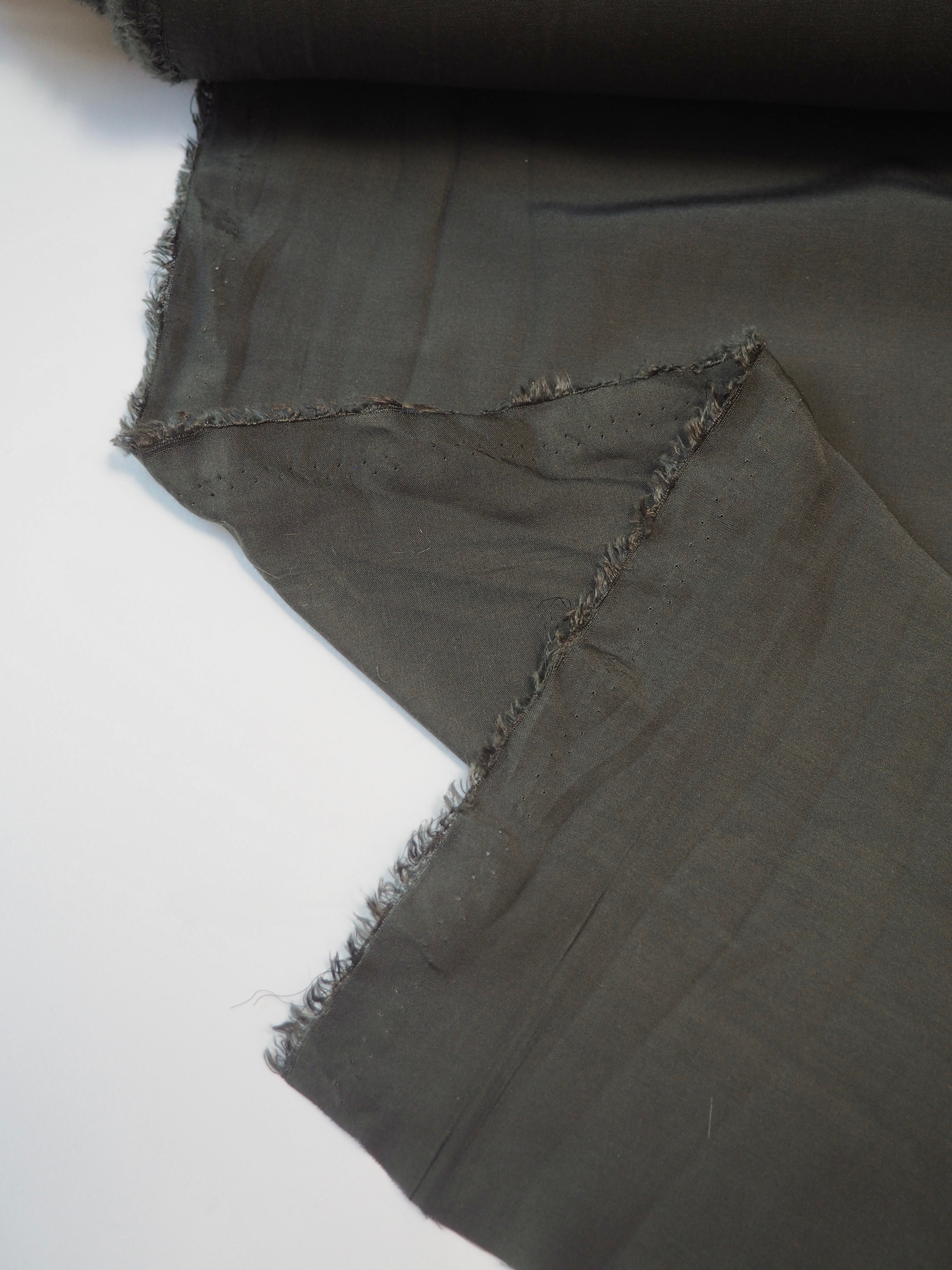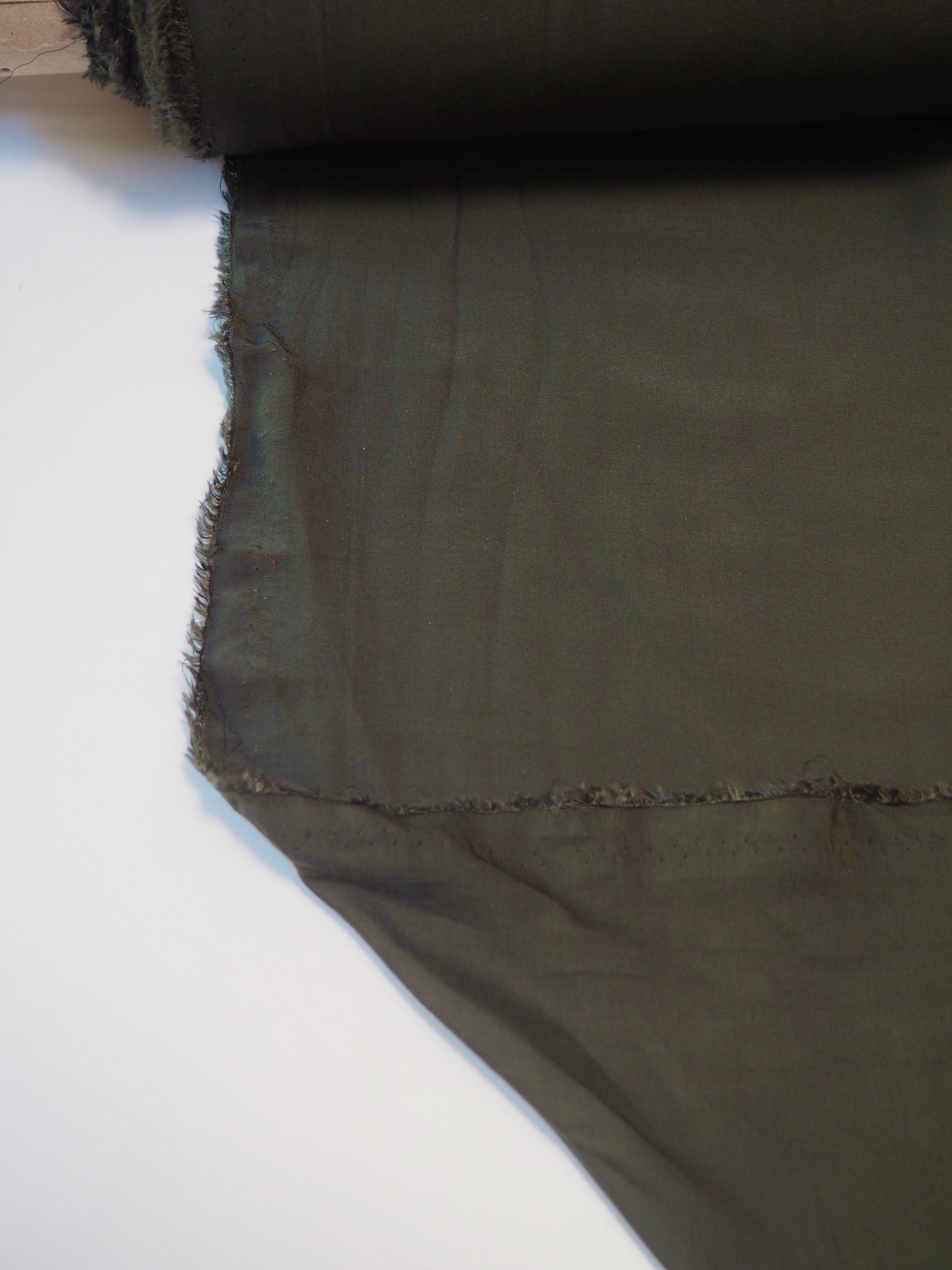 This ex-designer fabric is a viscose lining. It's a beautiful olive green colour that is opaque. Lightweight, soft and super drapey. Beautiful handle typical of softer viscose, with a cotton-like finish. Could work for a summer top, and great as a dress or skirt lining!