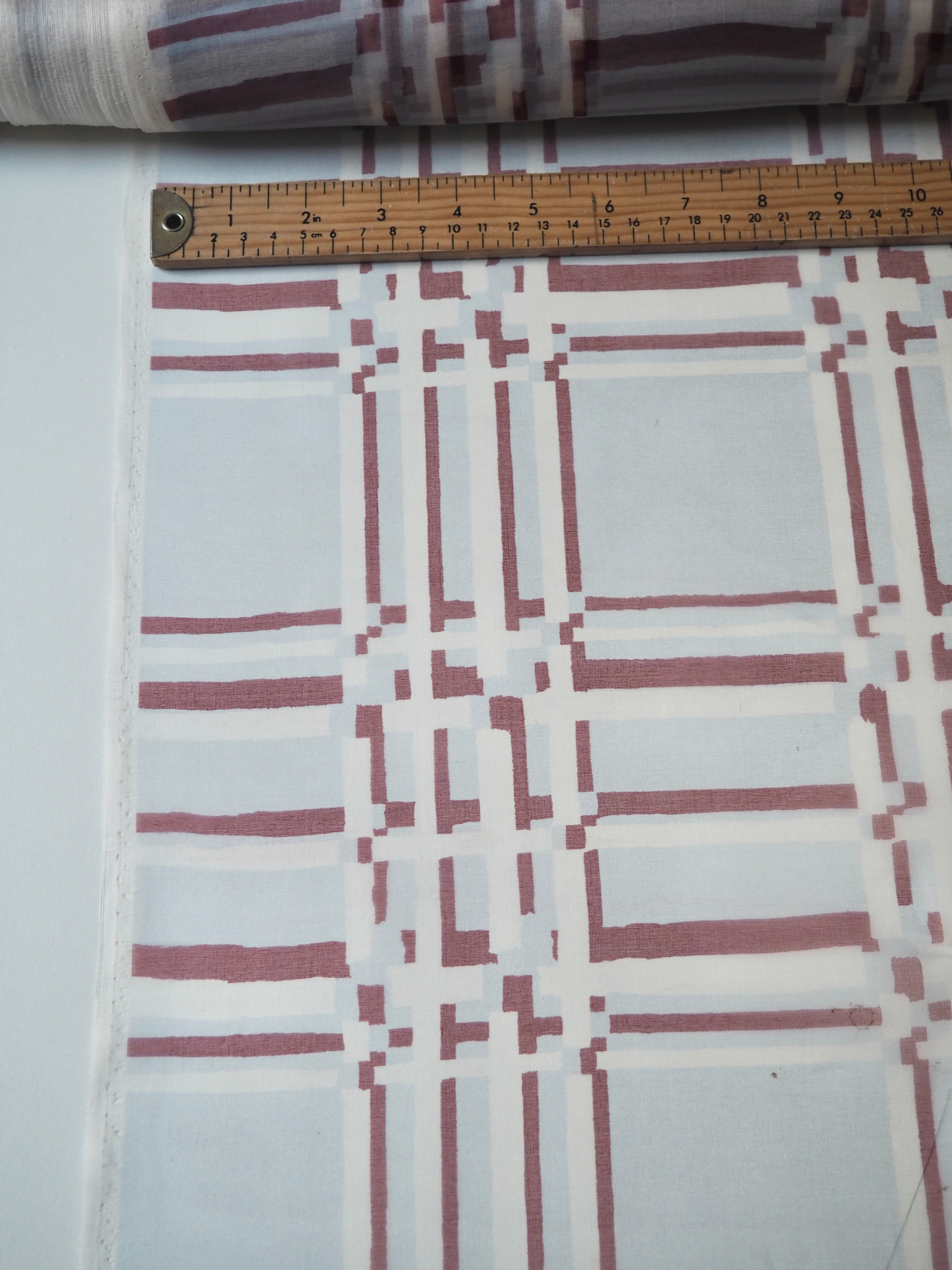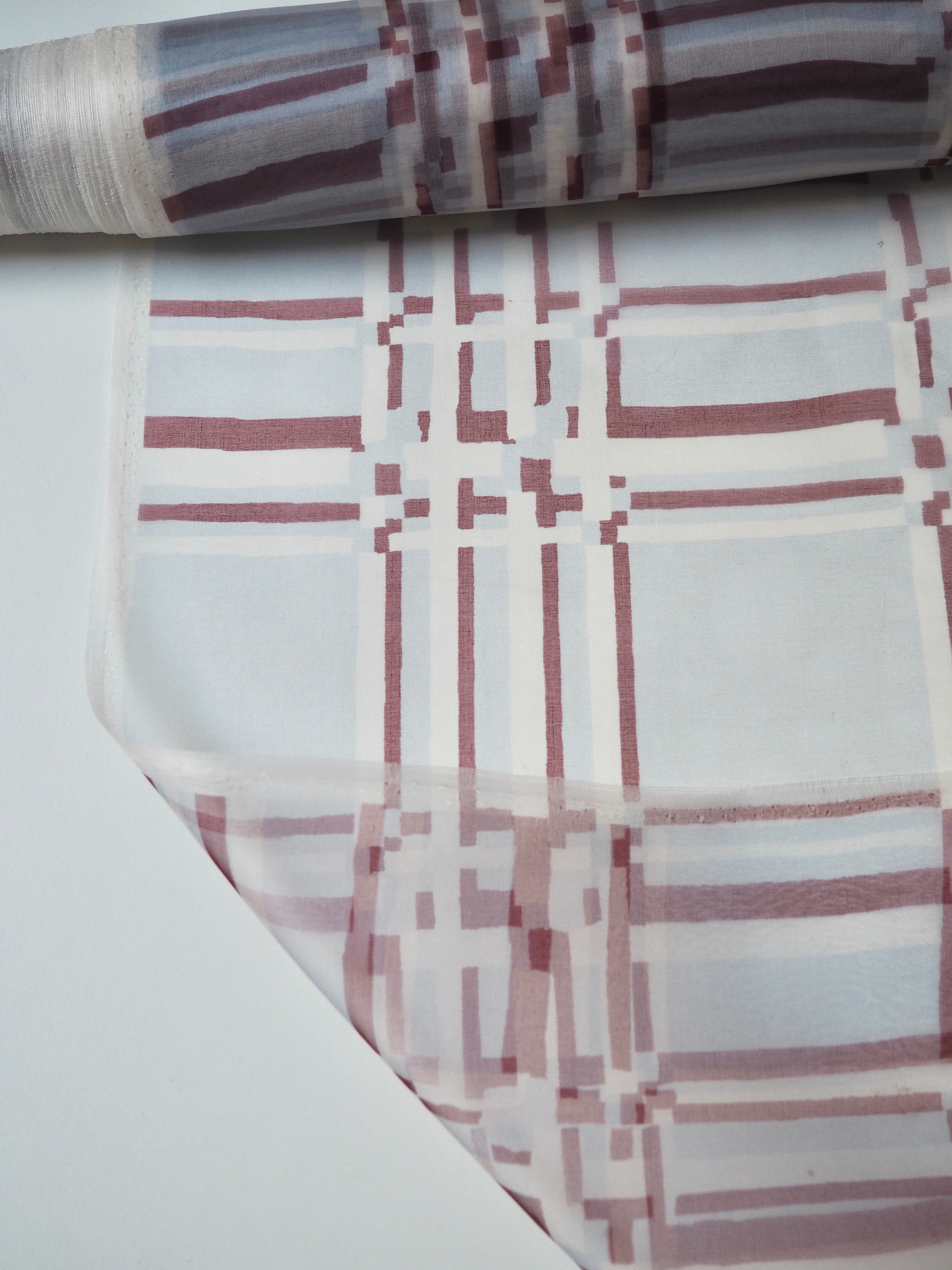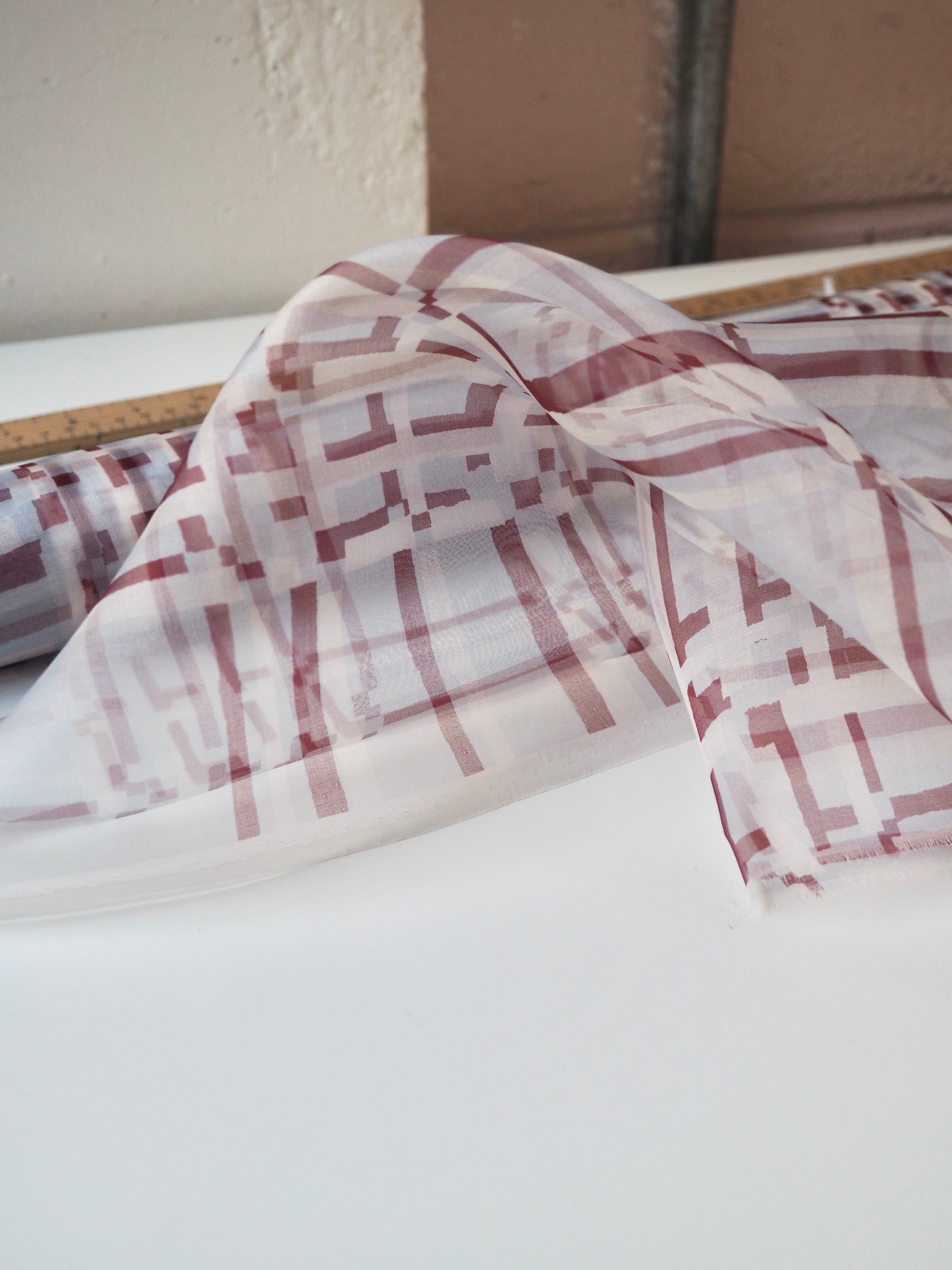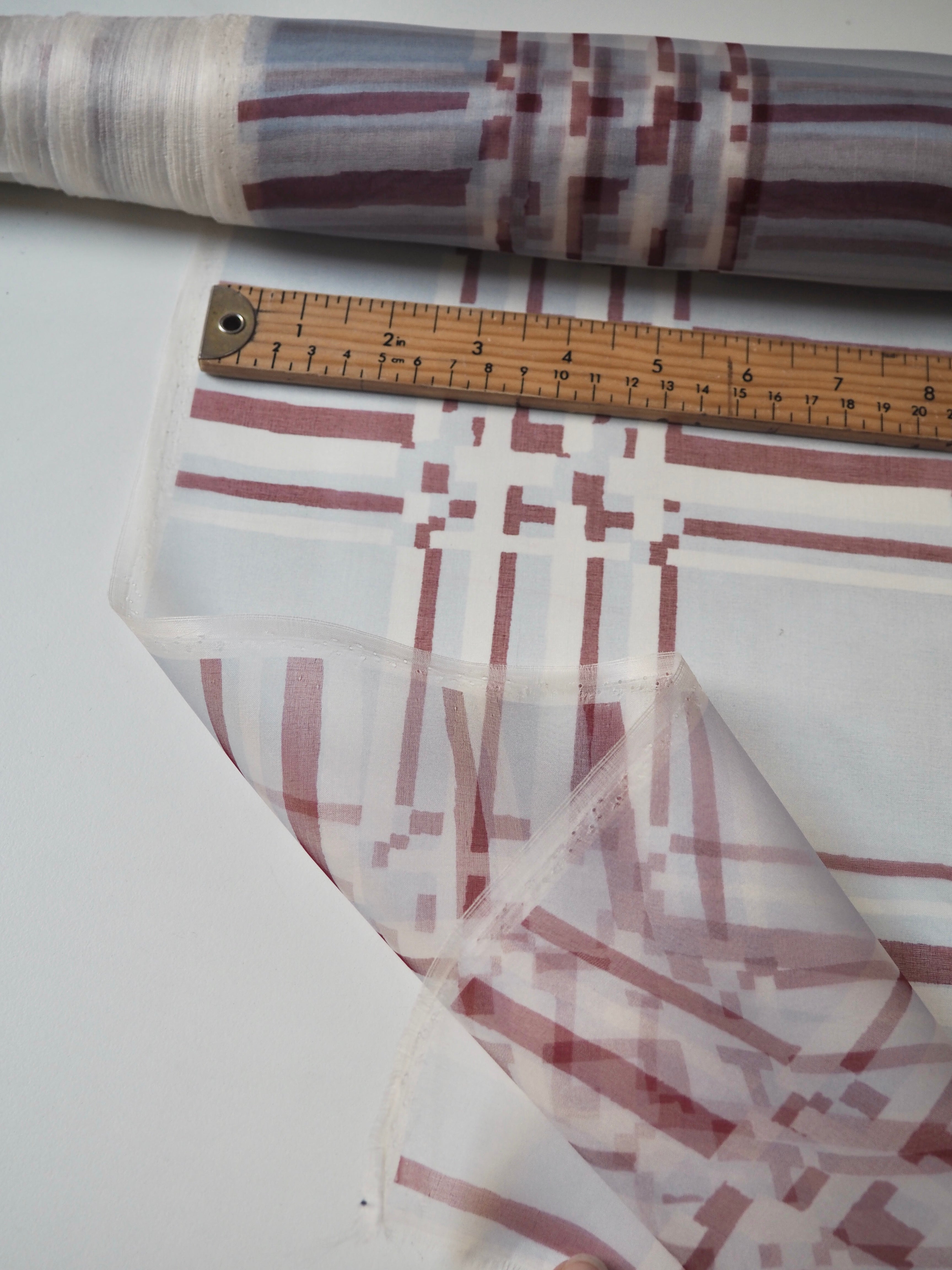 This ex-designer fabric is a silk organza. Red, blue, and off-white form a painted-on looking gridded pattern on this organza. It was a bespoke print for the London-based designer. It has a beautiful sheen finish that catches the light as it moves. Sheer, with a luxurious handle and lovely structure. Perfect for use in occasion wear, and it stands away from the body really well. Also great for simple tops, sheer scrunchies, and overlays!