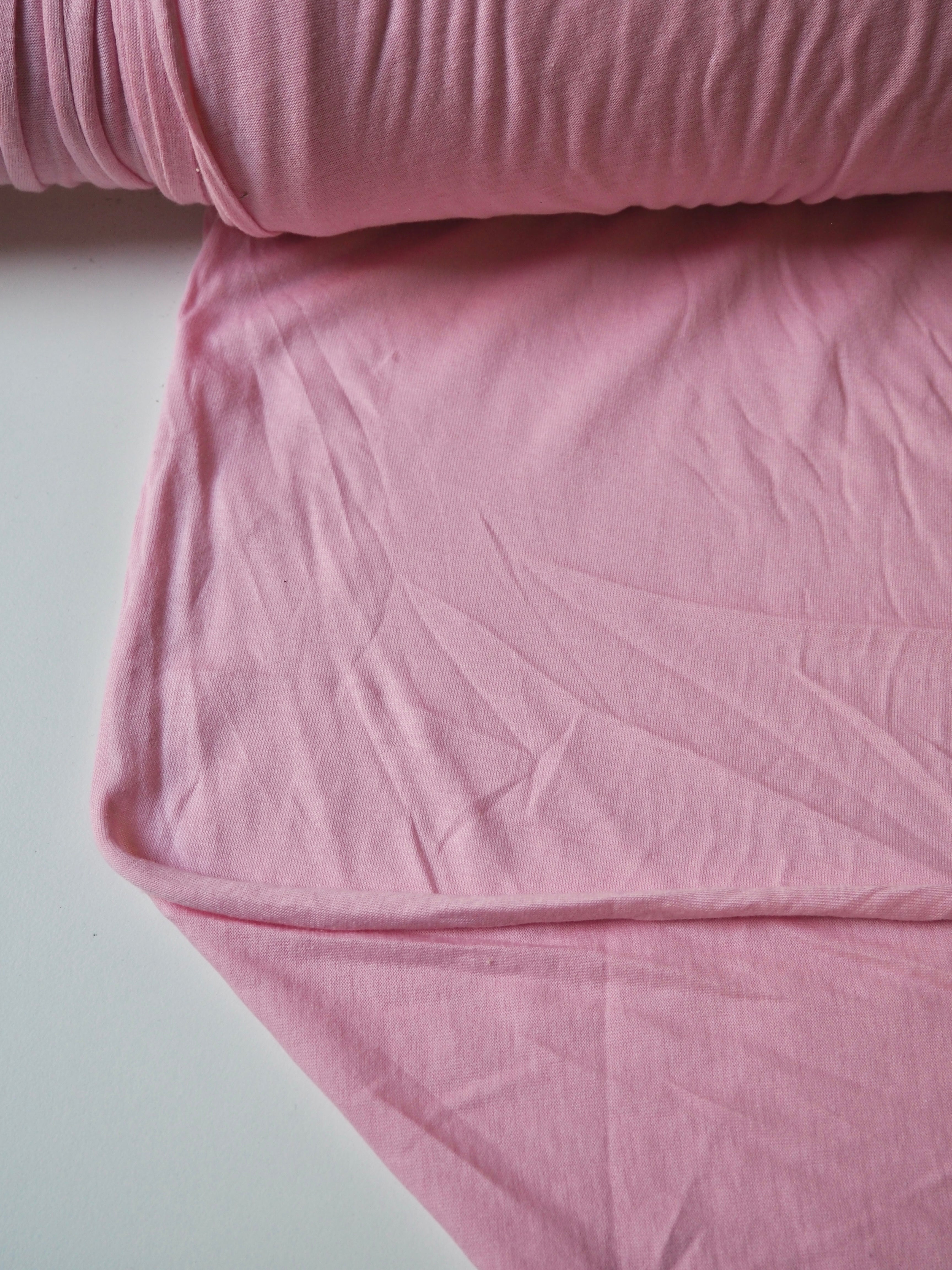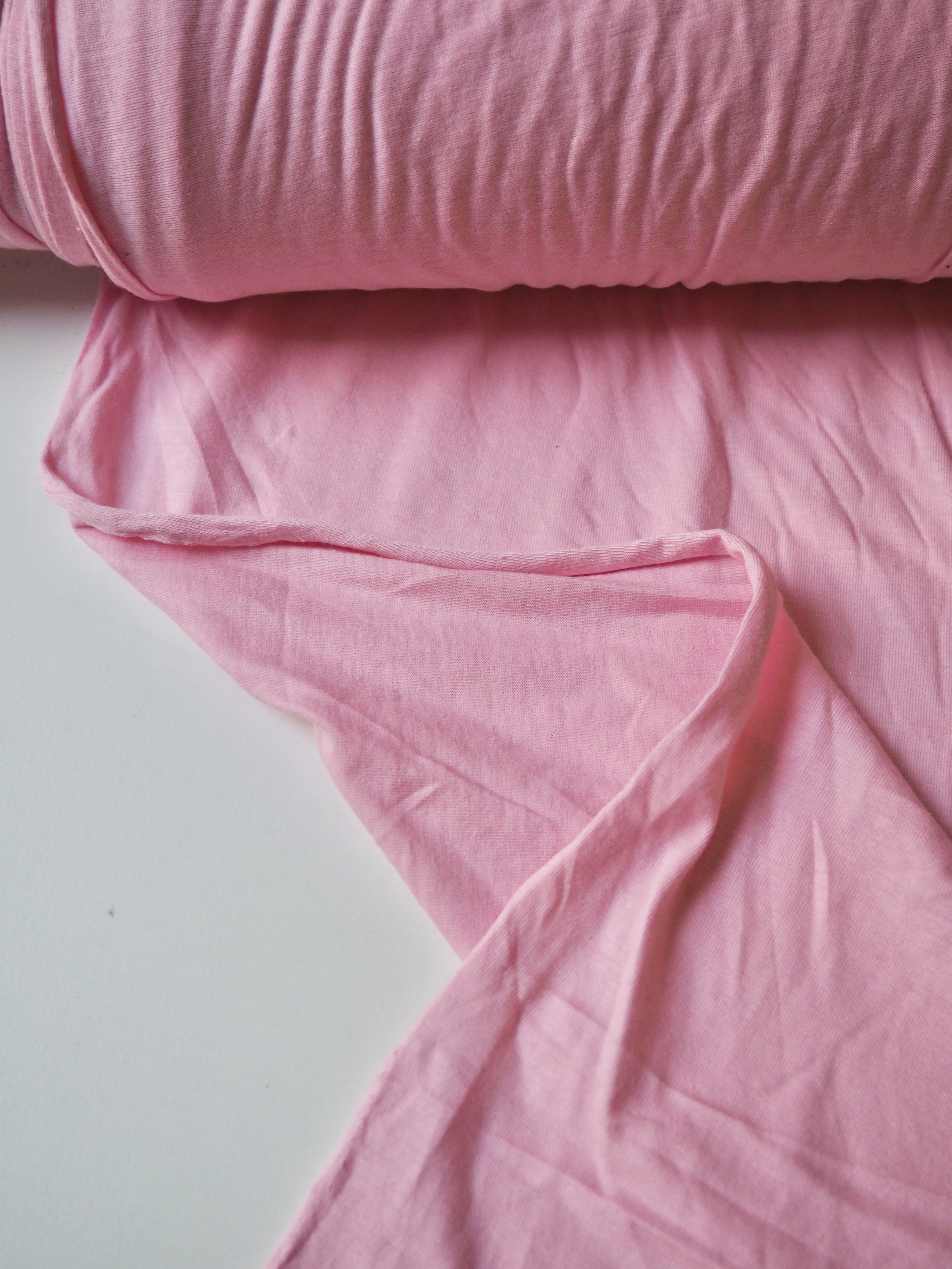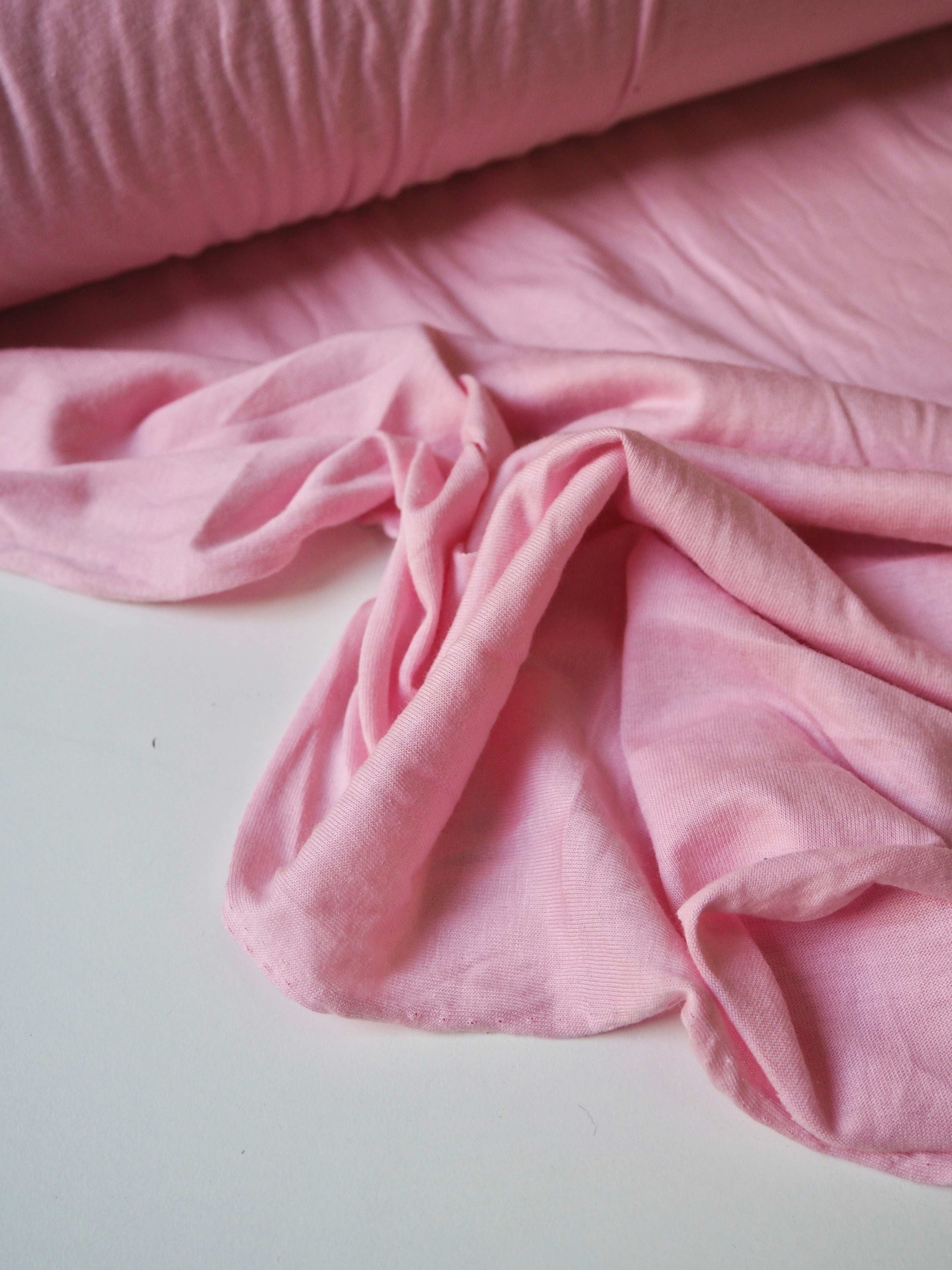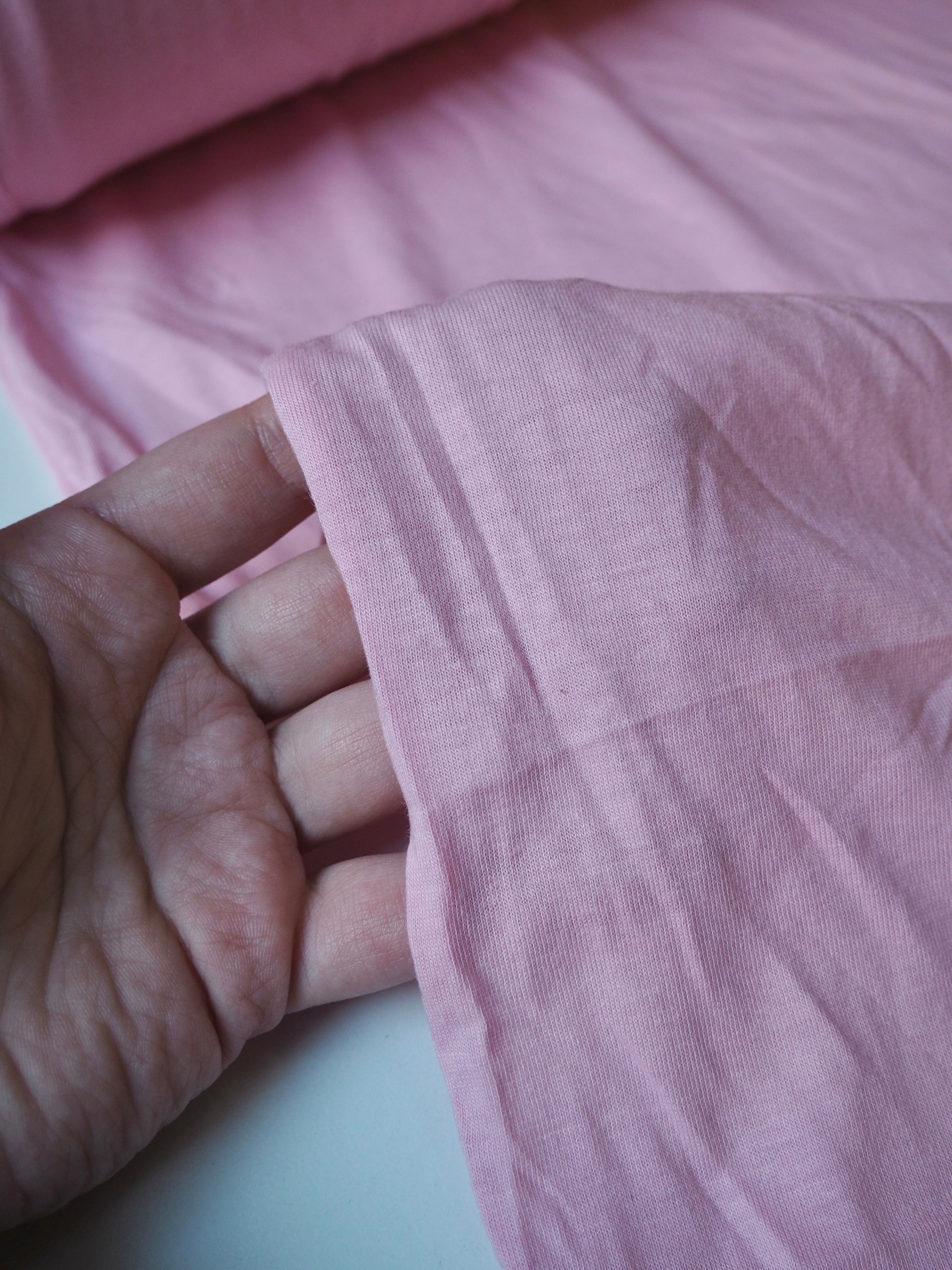 This ex-designer fabric is a cotton jersey. It is lightweight with a soft, gentle drape. It has a single jersey t-shirt weave with a 30-40% stretch width-ways, and about 10% length ways. A little sheer due to colour, and ideal for everyday basics, would make a great classic t-shirt!
