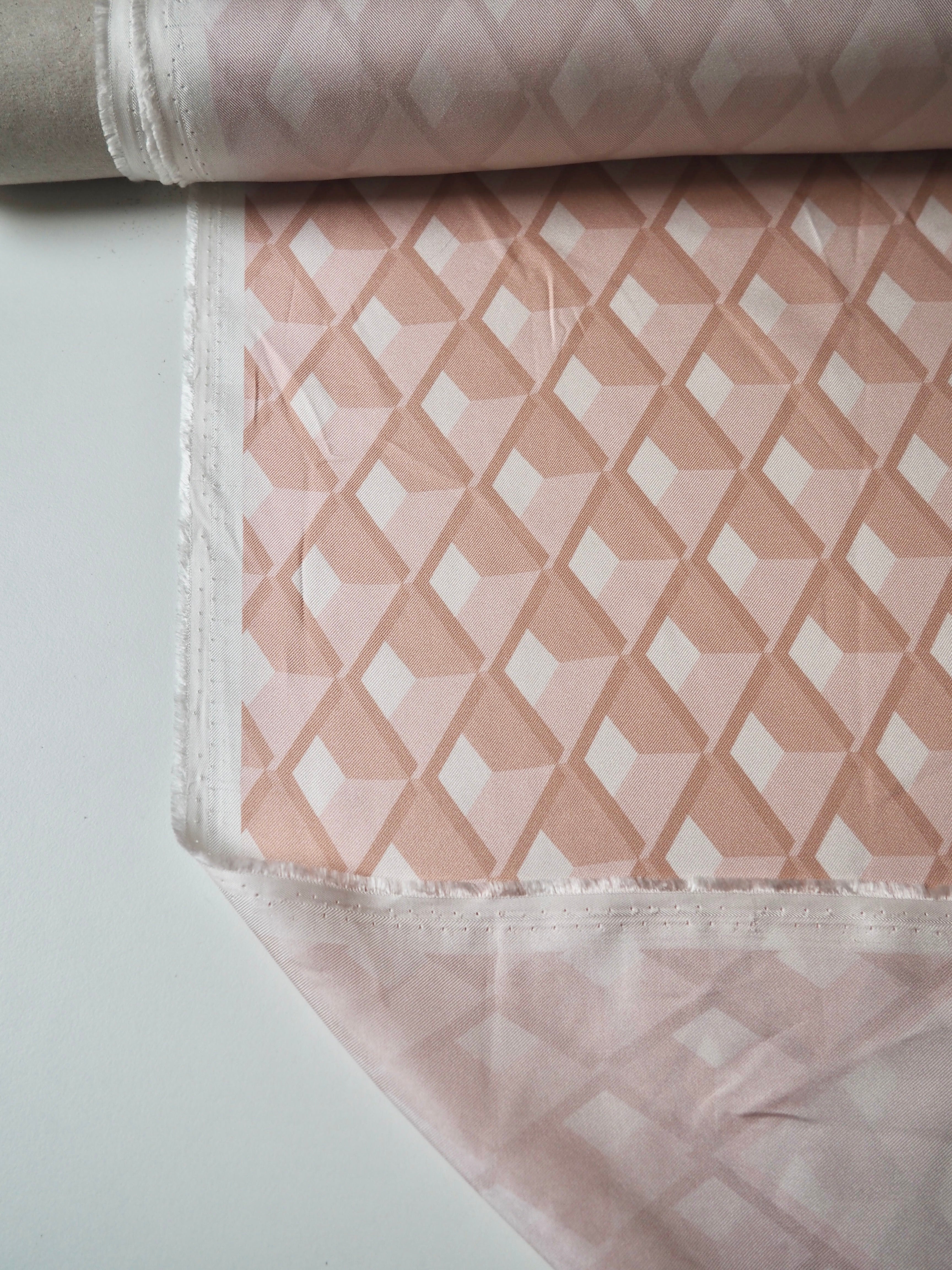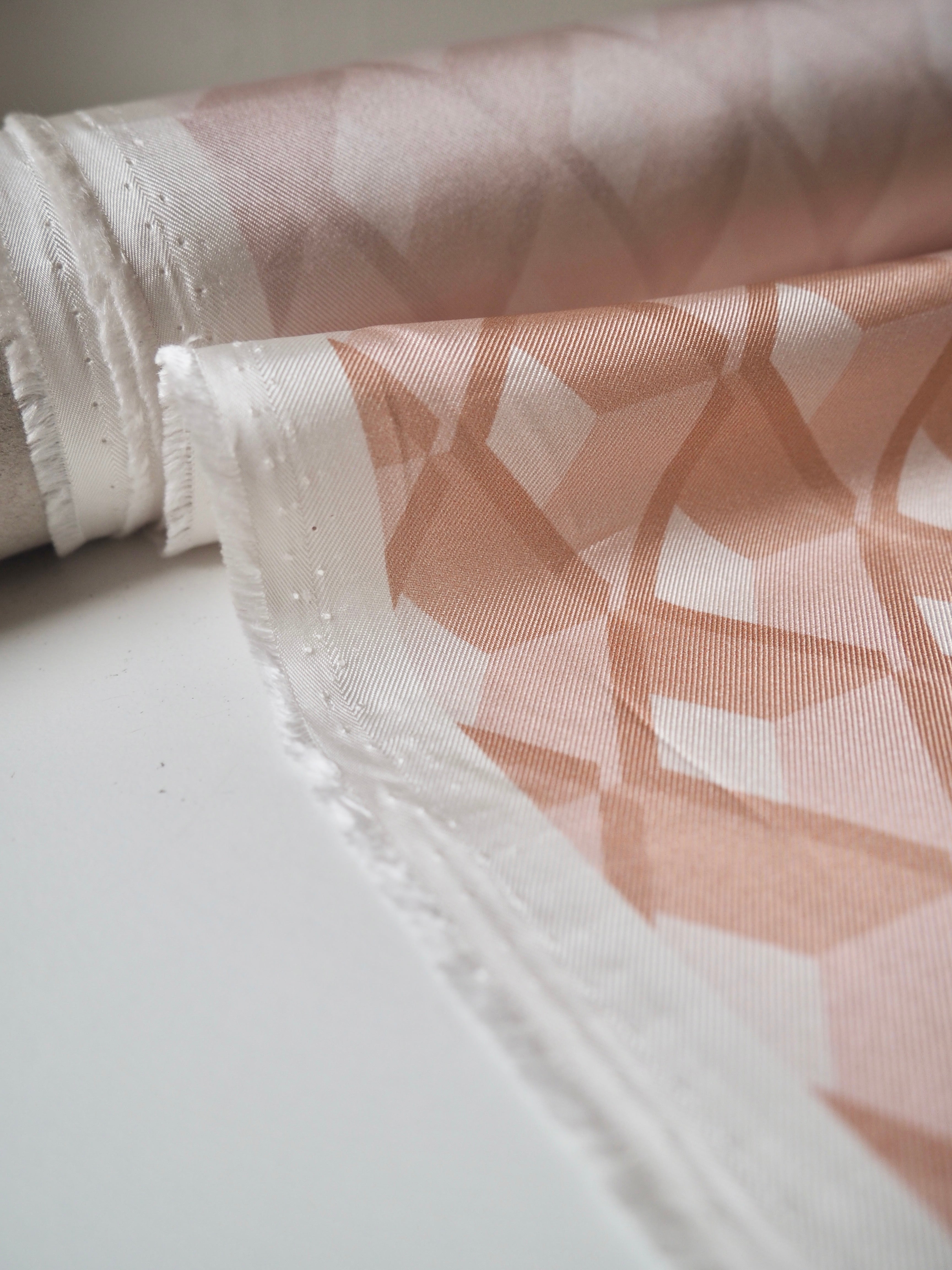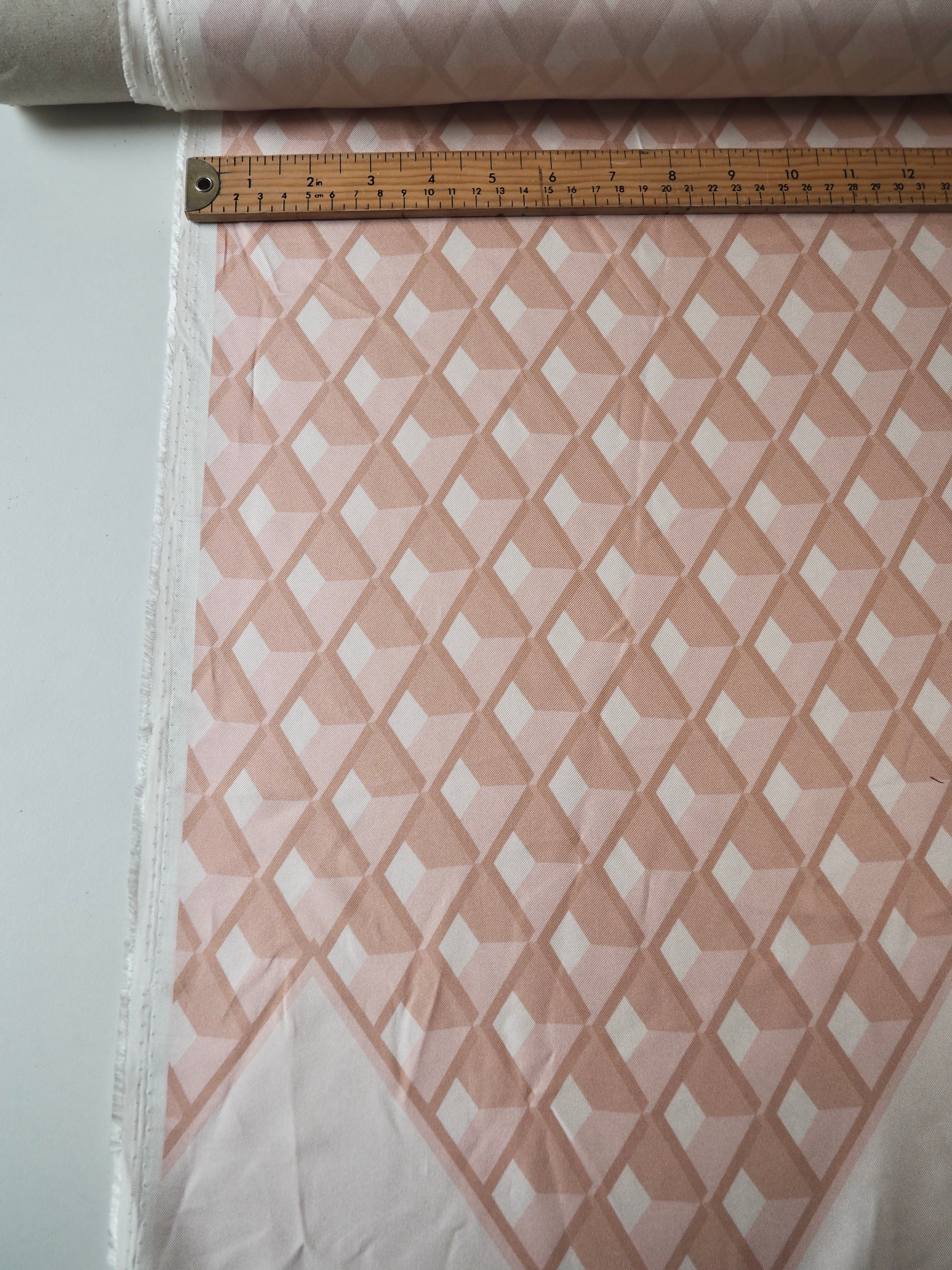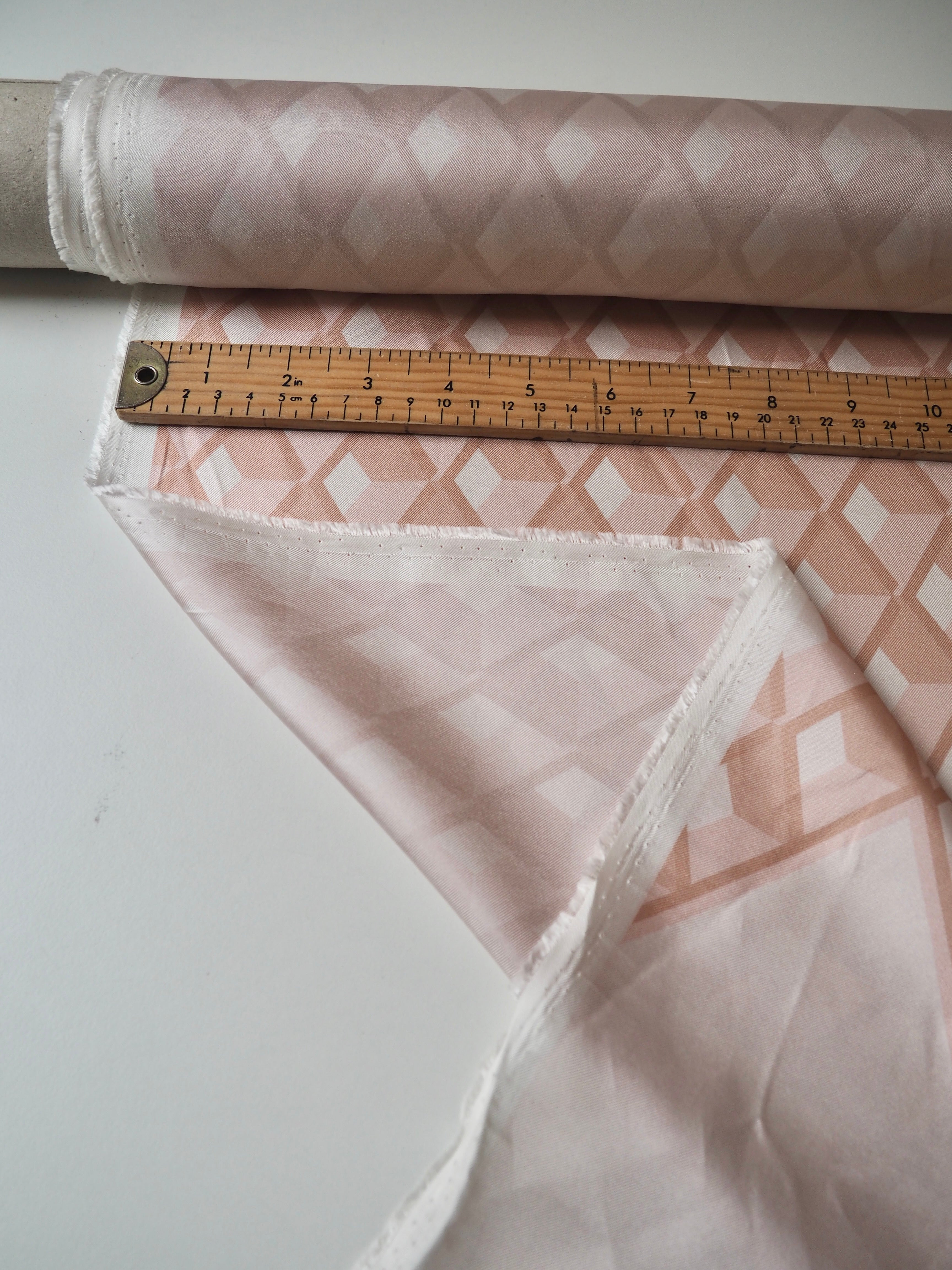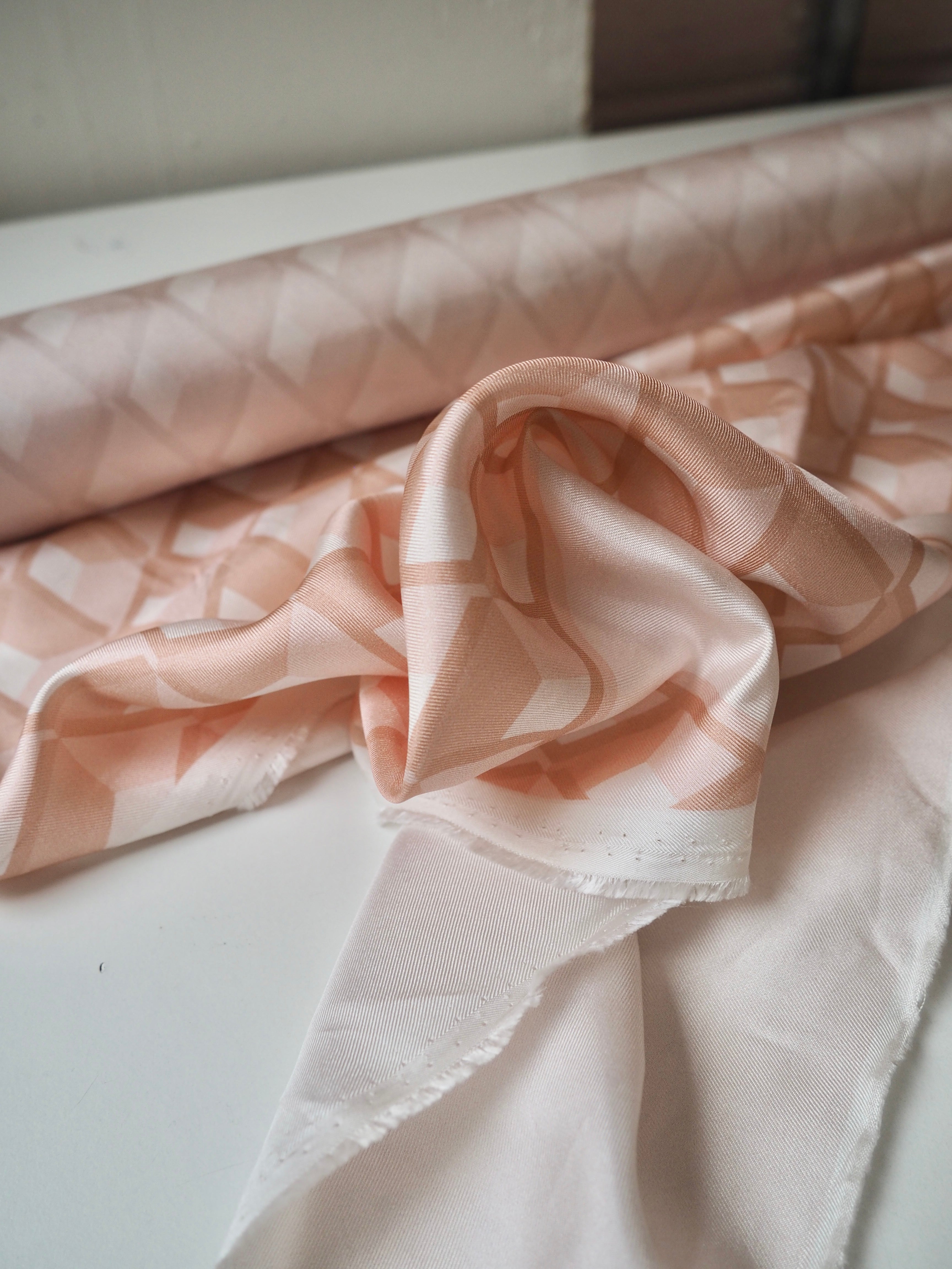 This ex-designer fabric is a silk twill panel. It's in a lovely pink and white diamond print down the warp. It was likely made into long silk scarves, and the piece is 2.5m long, with two lines dividing the cloth into thirds. It's bespoke from a London designer. It's slinky, mostly opaque, and very soft. It has an incredible satin sheen and beautiful movement. The twill weave gives it a crisp, strong handle. The perfect drapey silk for blouses, or could use the lines to give direction down a dress! This piece has tape marks at one end, we have adjusted the price to reflect this.