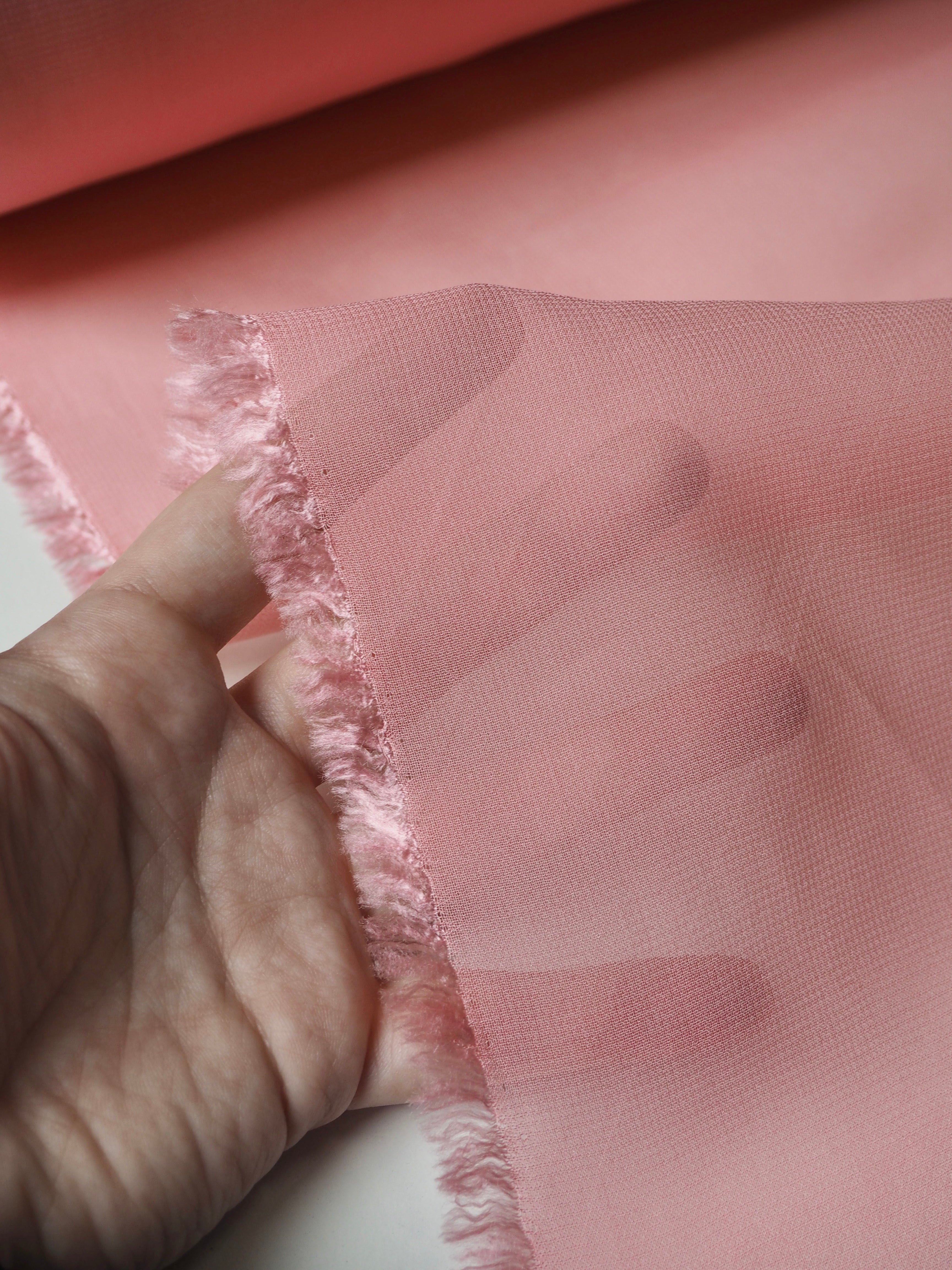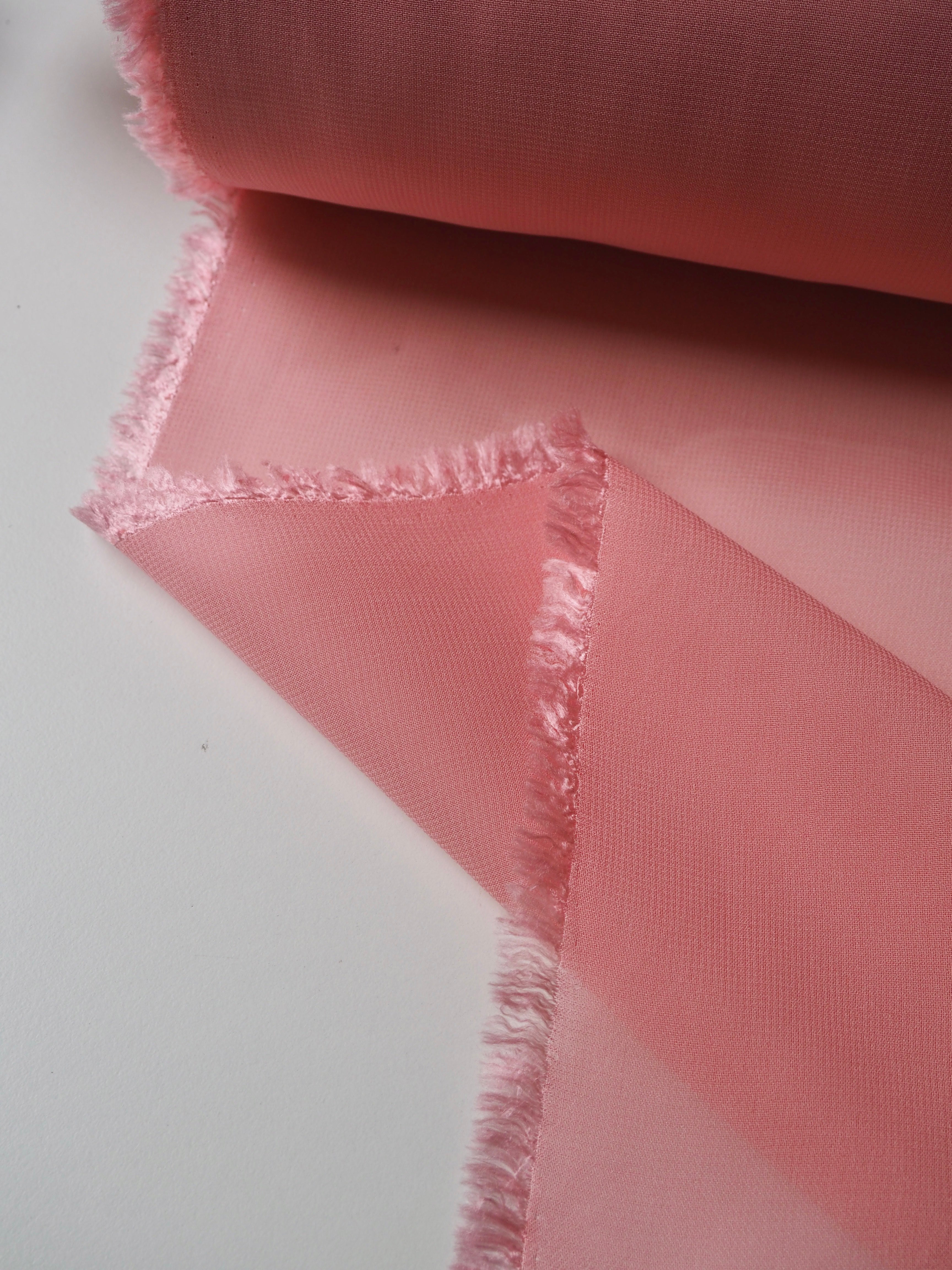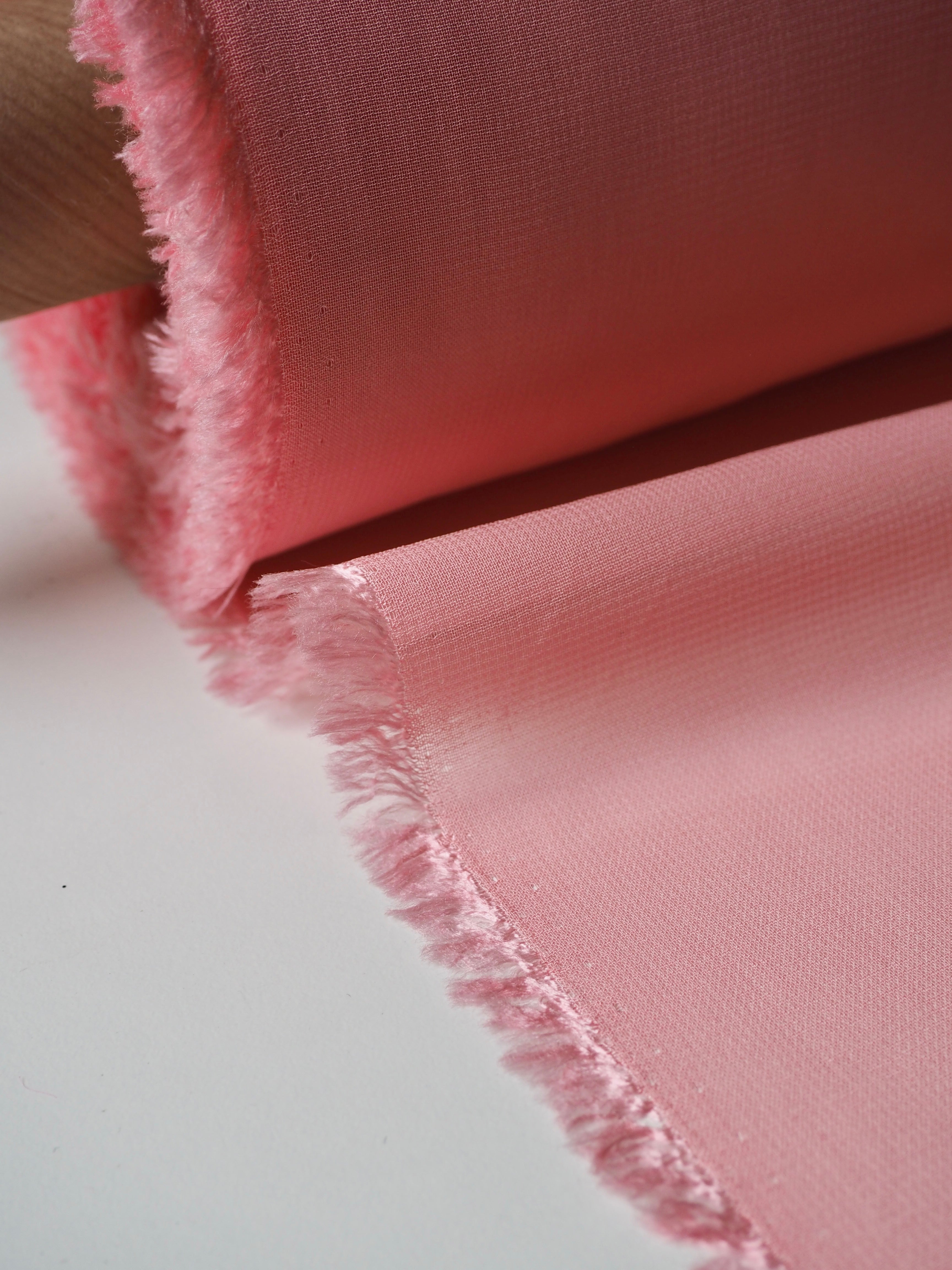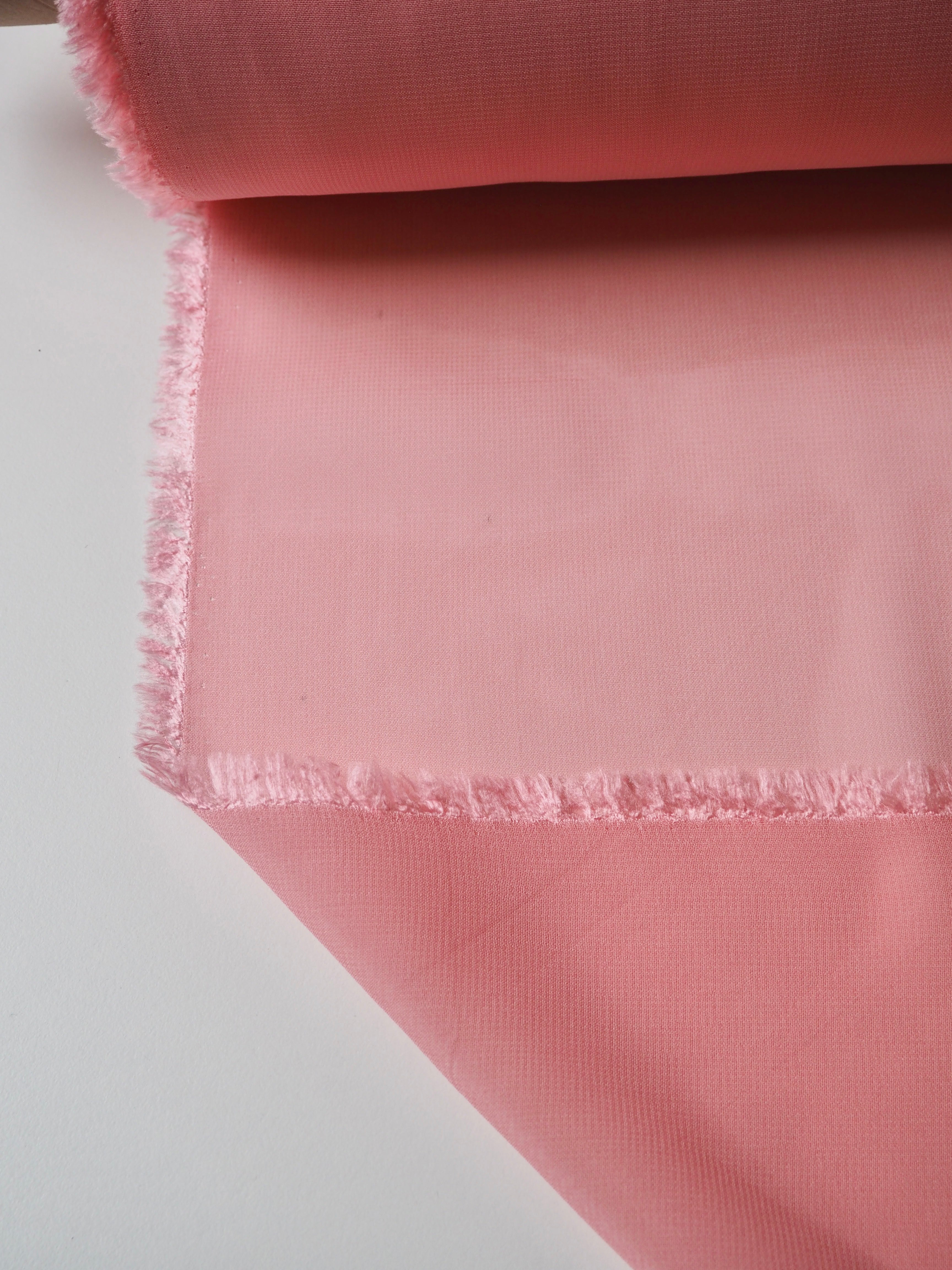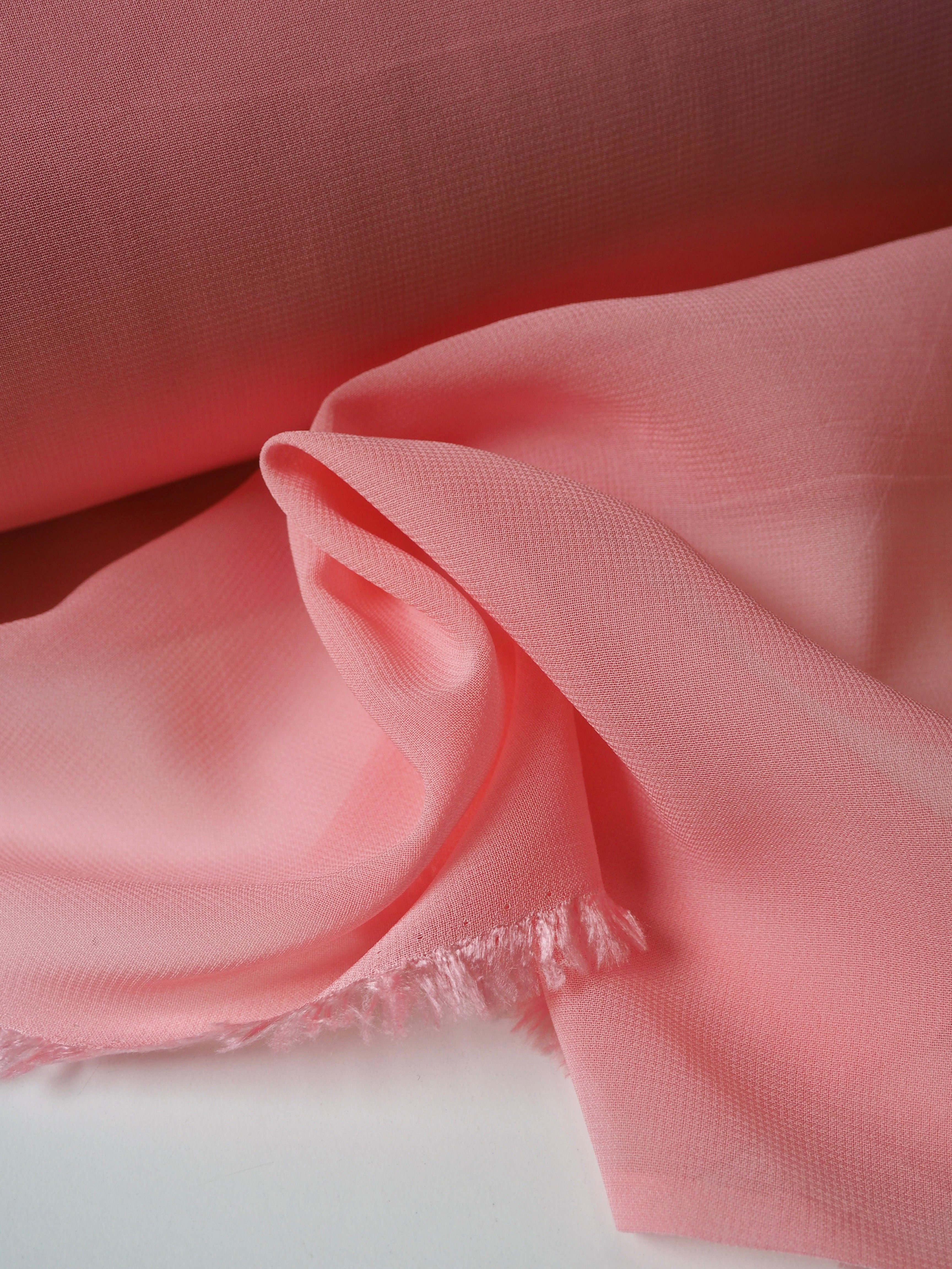 This ex-designer fabric is a chiffon. In a rich bright pink colour, and is semi-sheer. Has a great handle with a slightly crepe-like texture. Super light with a unique, more structured handle than a typical chiffon. Would be great for more a skirt or structured top!