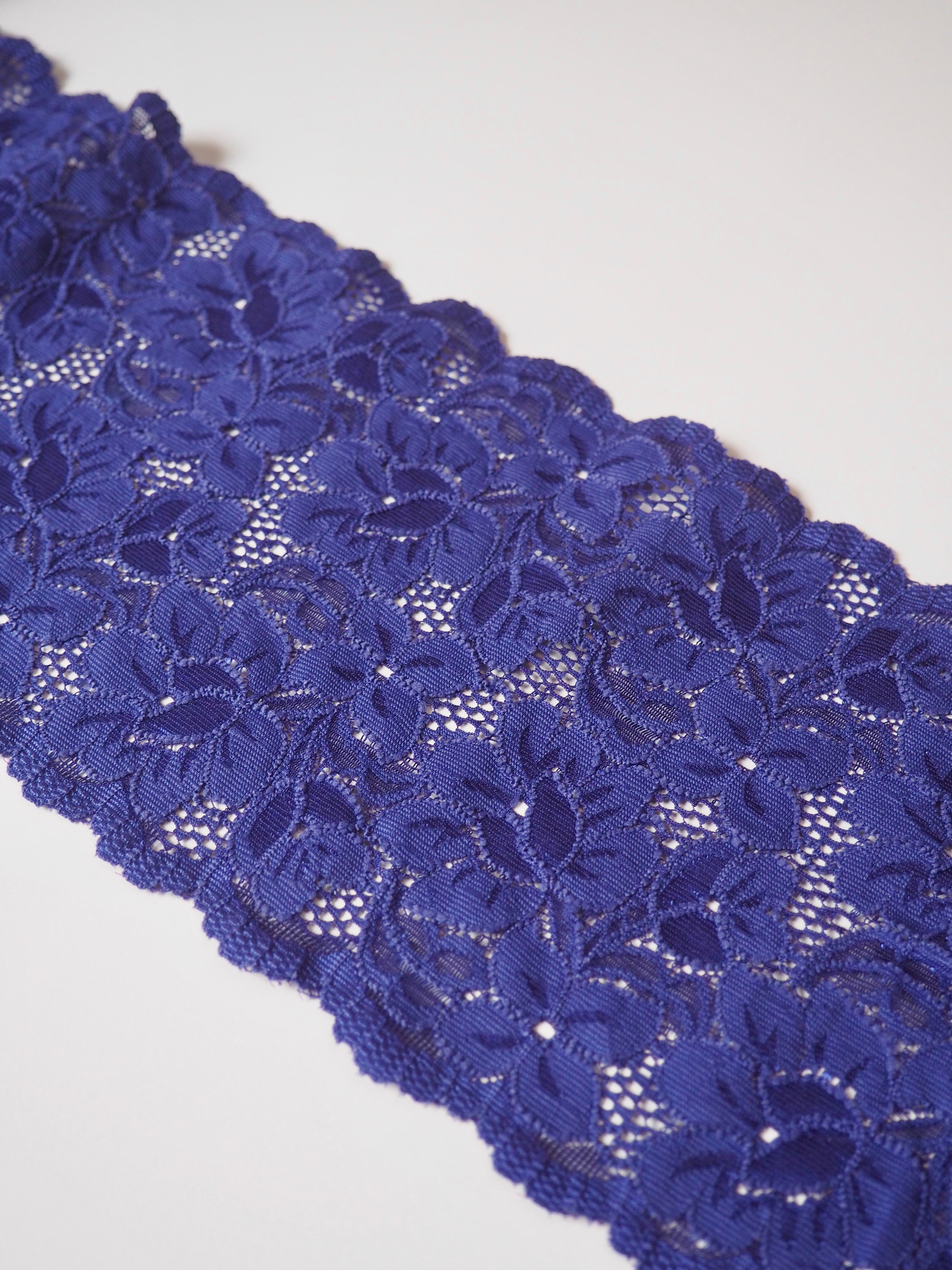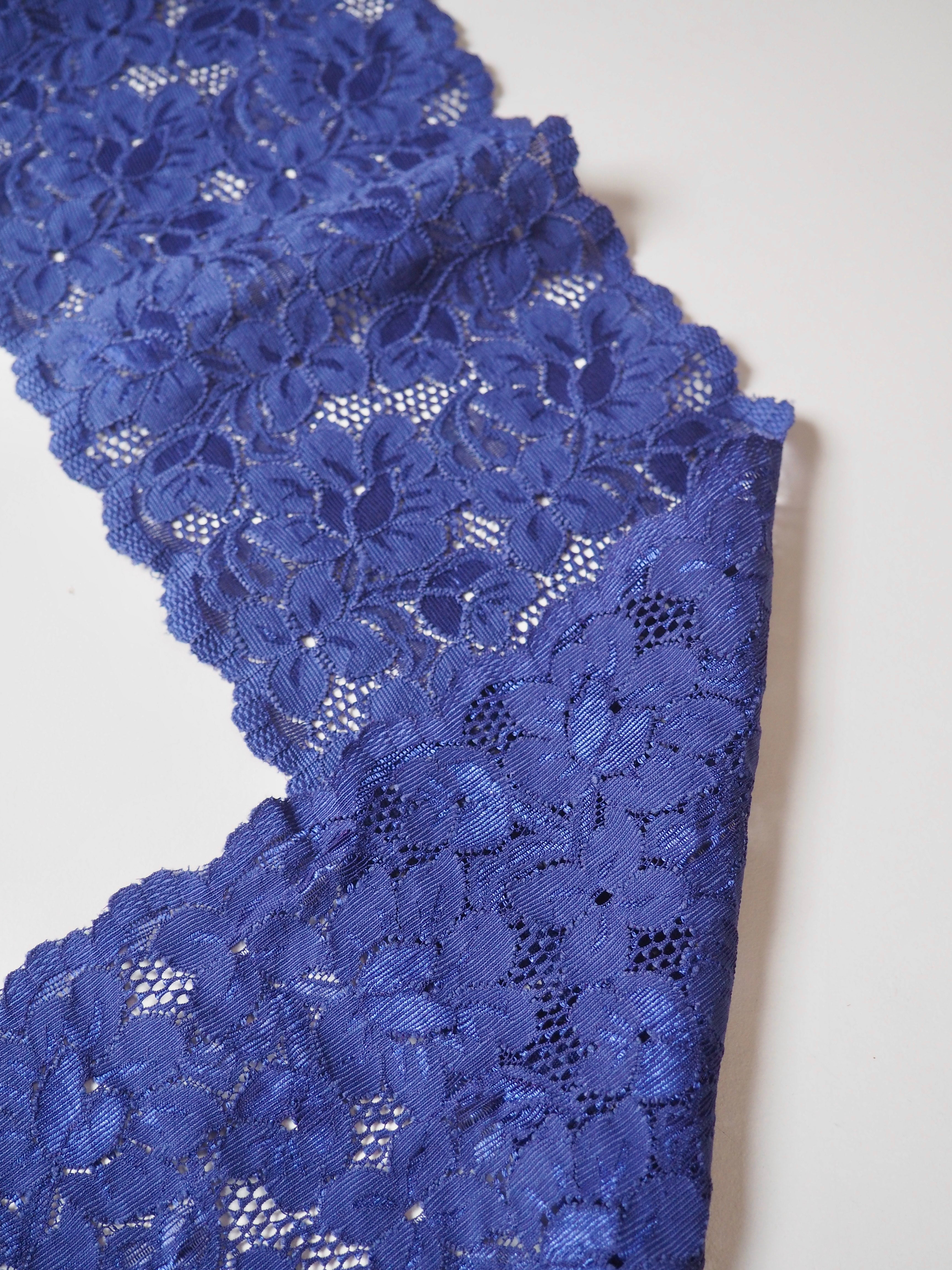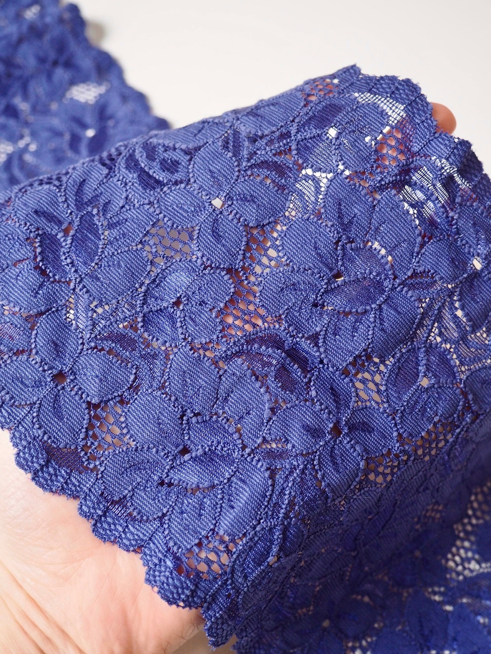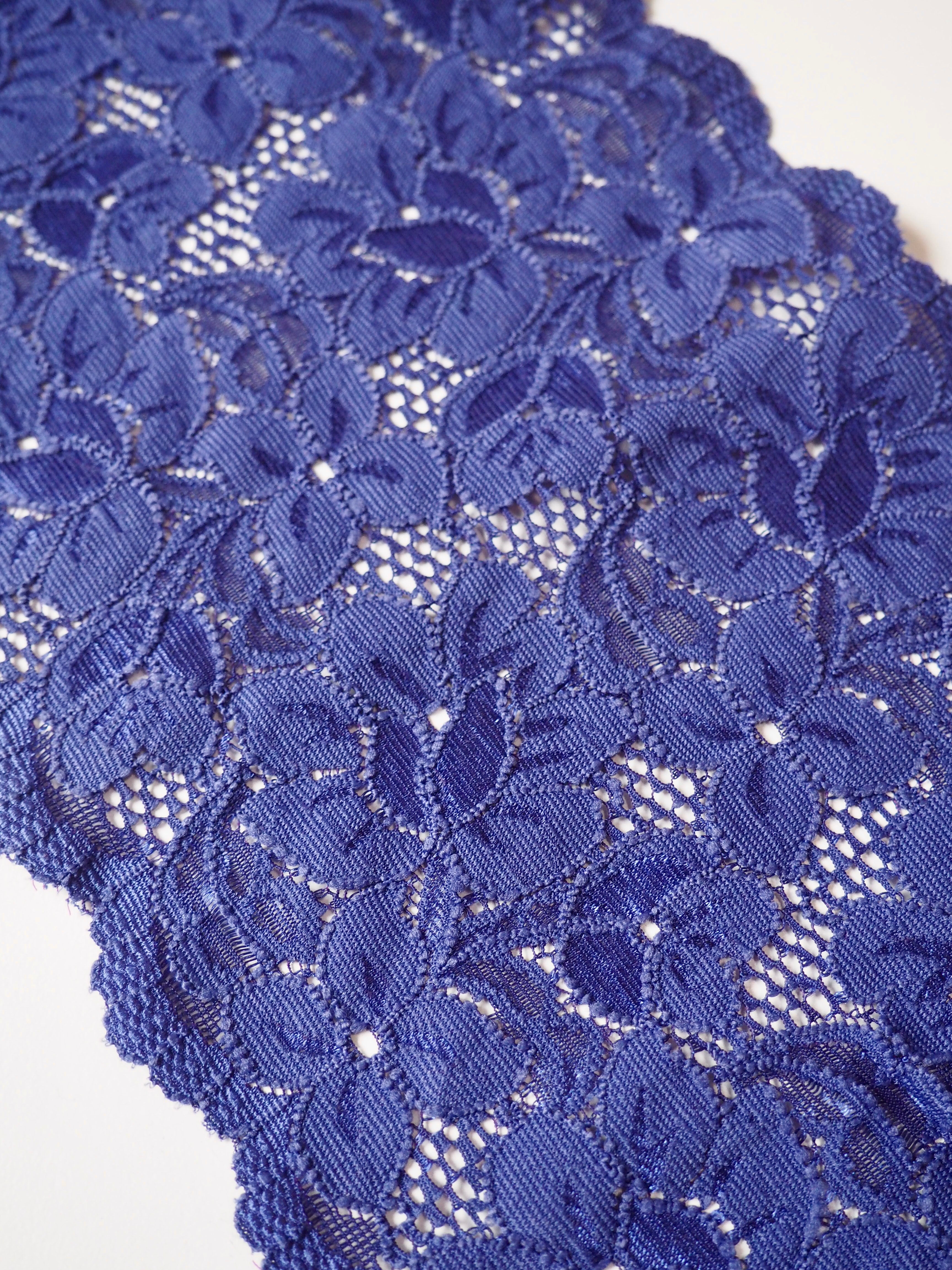 This ex-designer lace trim is a purple stretch lace with shiny lurex details. Perfect for lingerie and bra making, but could also be used as trim on other garments. It has about 30% stretch and a double scallop edge.