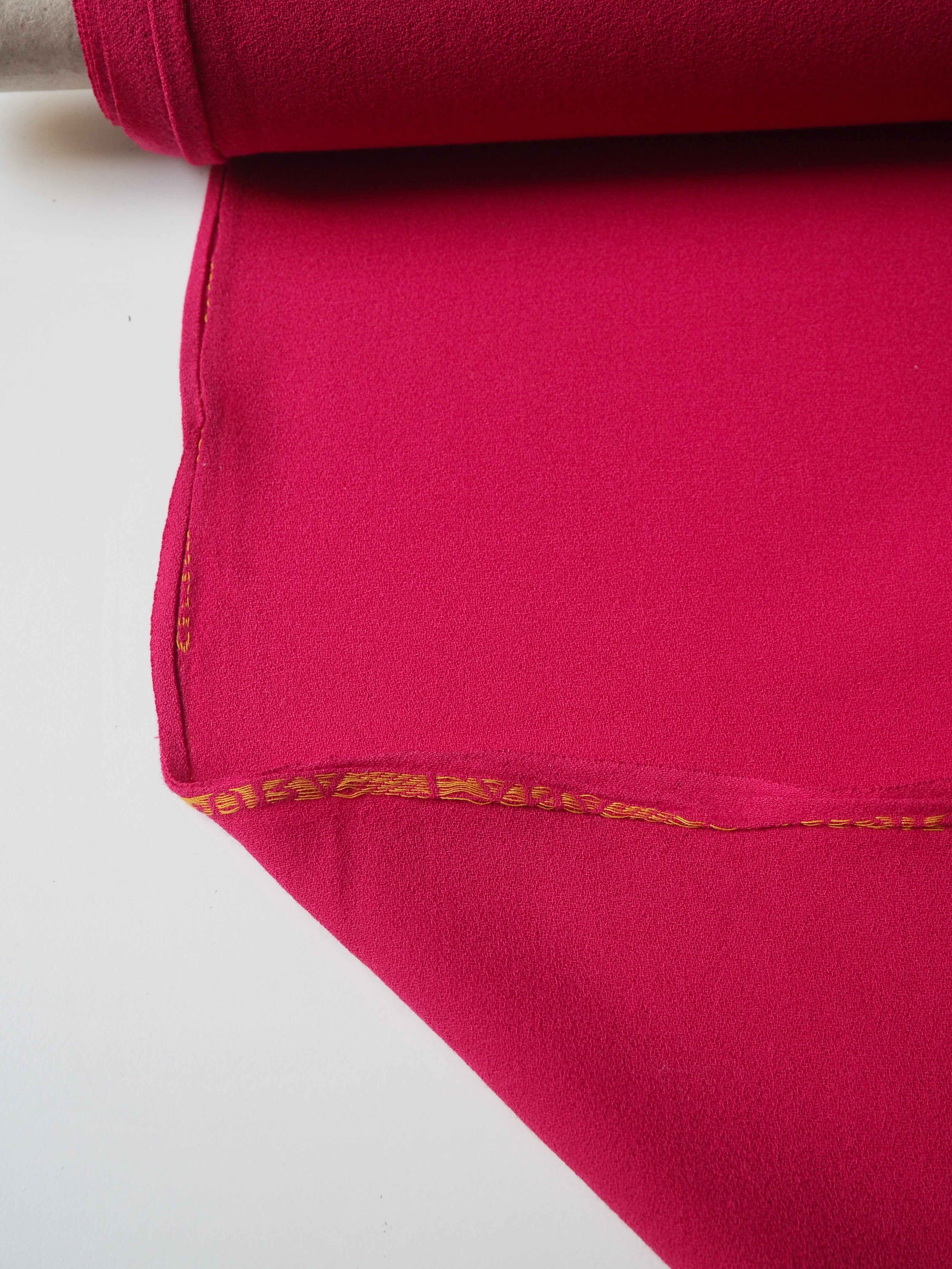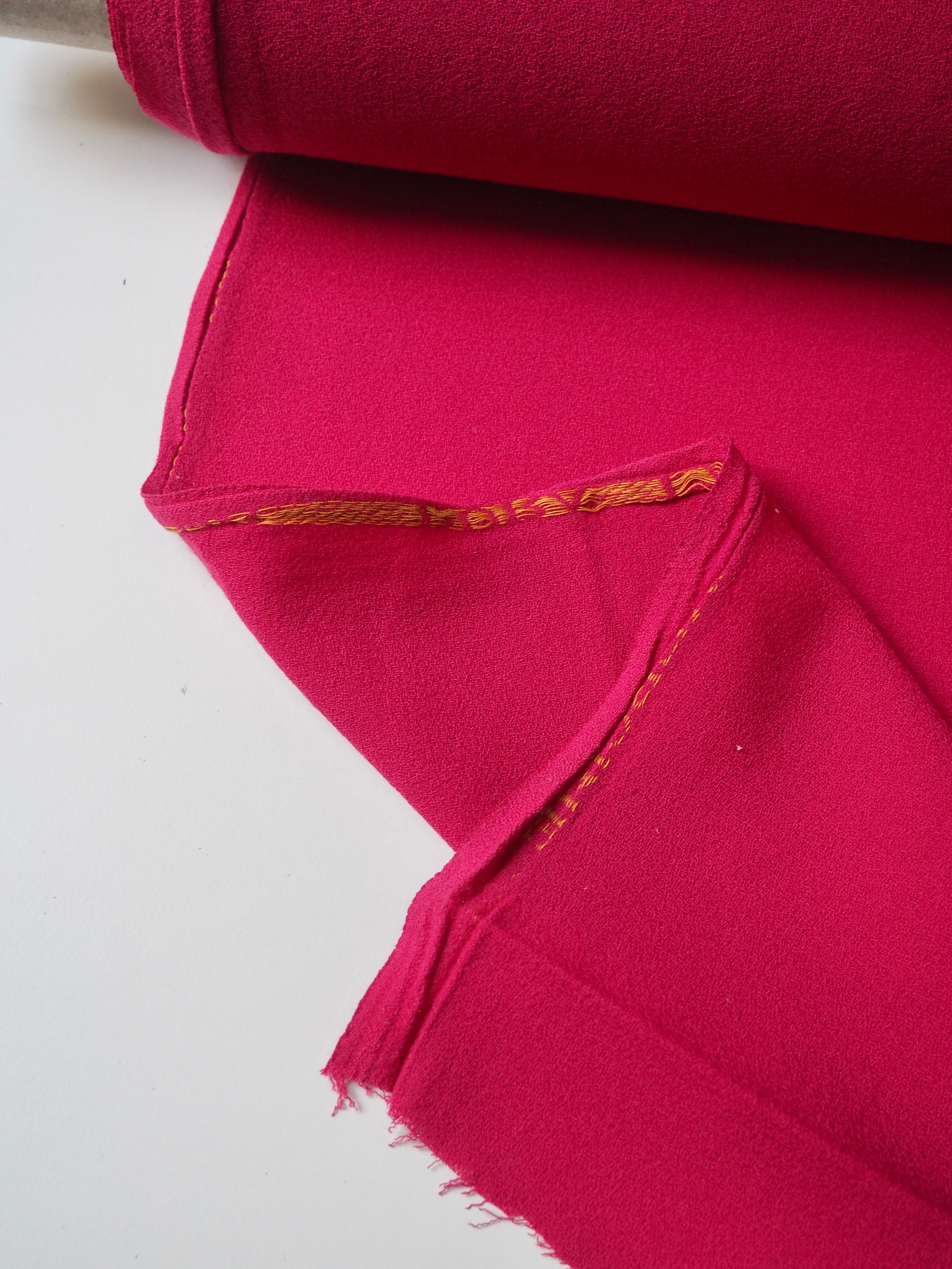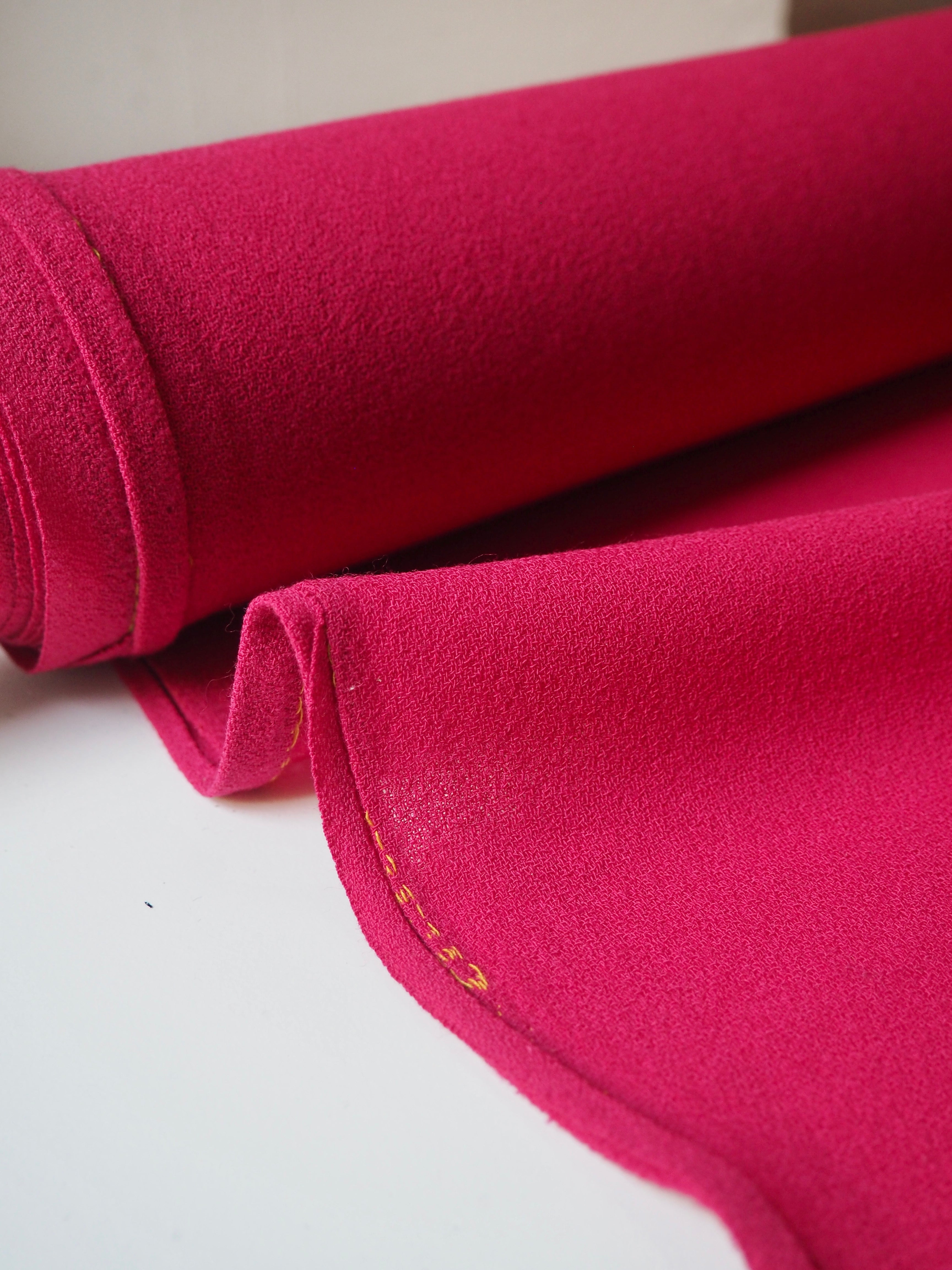 This ex-designer fabric is a wool crepe. It's a beautiful cloth with a sturdy but comfortable weave. It's made of pure wool and feels and looks so luxurious! It has a soft structure and really lovely soft crepe handle. Lightweight, and perfect for tailoring projects. Flexible and has a wonderful drape that makes it so easy to work with! The perfect cloth for a lifetime pair of wide leg trousers!