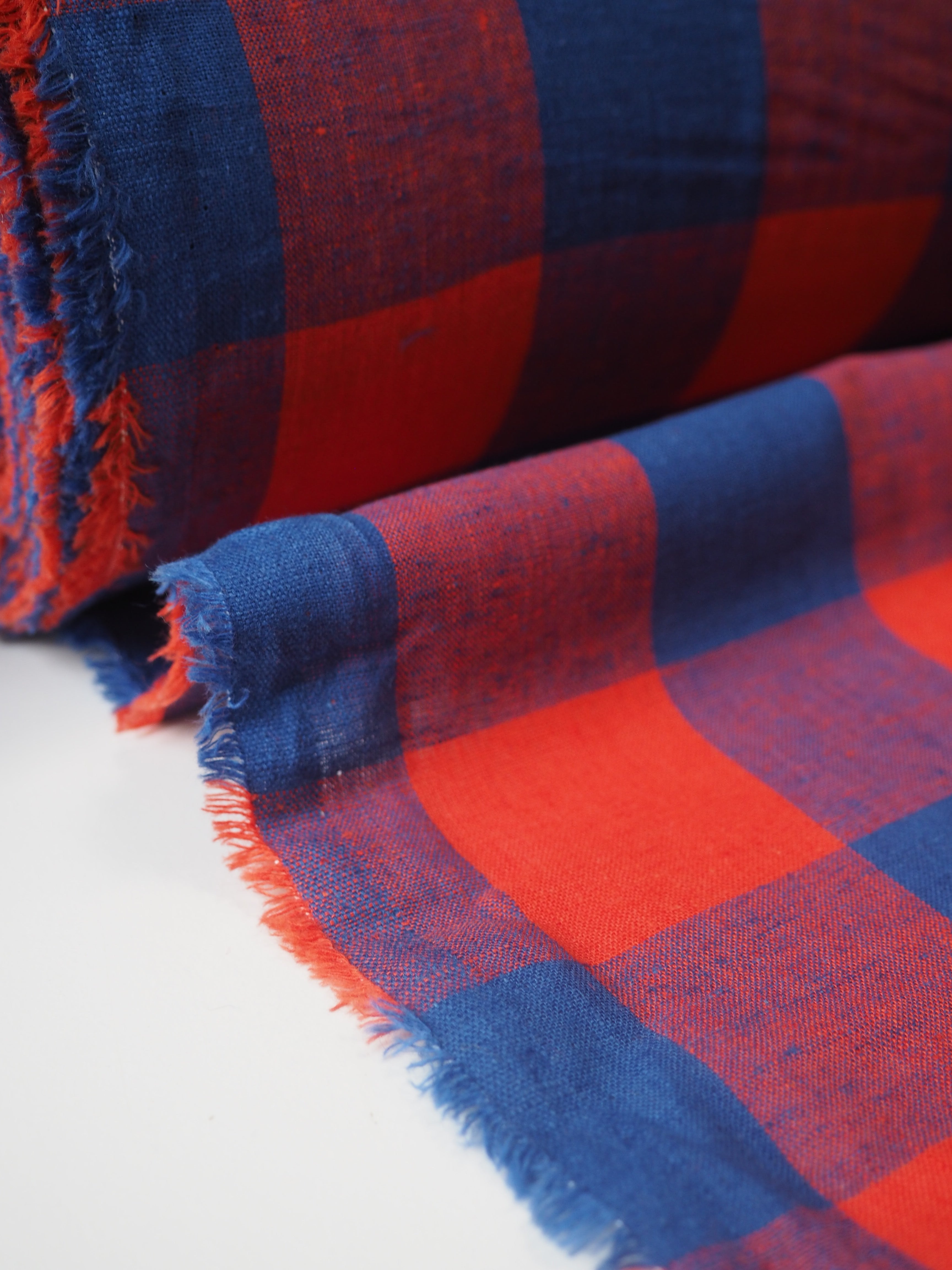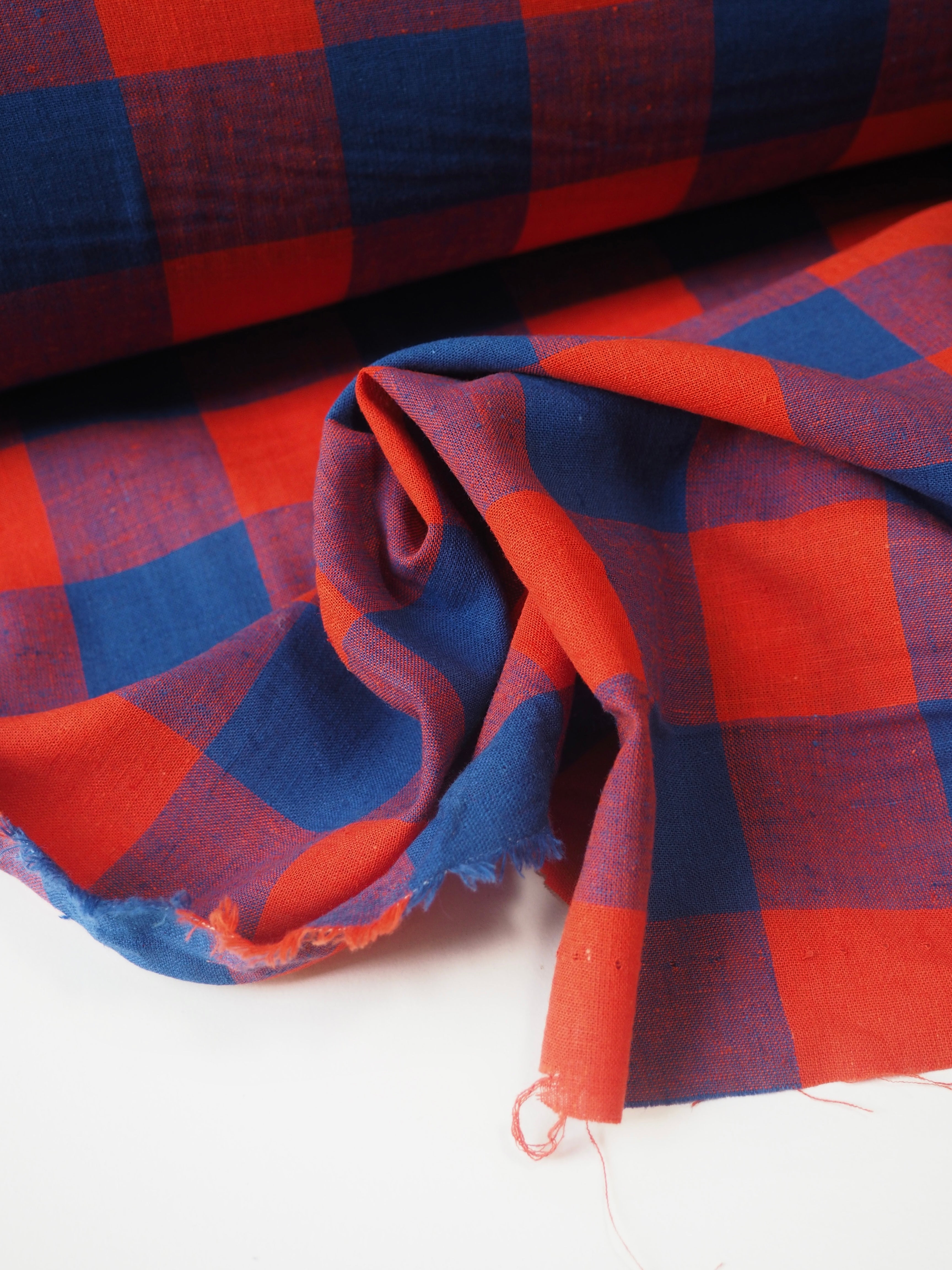This ex-designer fabric is a bold cotton/linen. It's a scarlet red and sapphire blue medium scale gingham check. It's from a London-based brand called Beyond Nine. Checks are 4cm. It has a super soft and gentle blended weave, with an ideal cotton-y handle that's so wearable. That little bit of linen adds just the right finish! Very lightweight with a gentle structured drape, and fully opaque. Lovely for our Everyday Dress/Top, summer tops or Everyday Trousers, (or even a co-ord!), or a tablecloth and napkin set! We can't wait to see what you make!