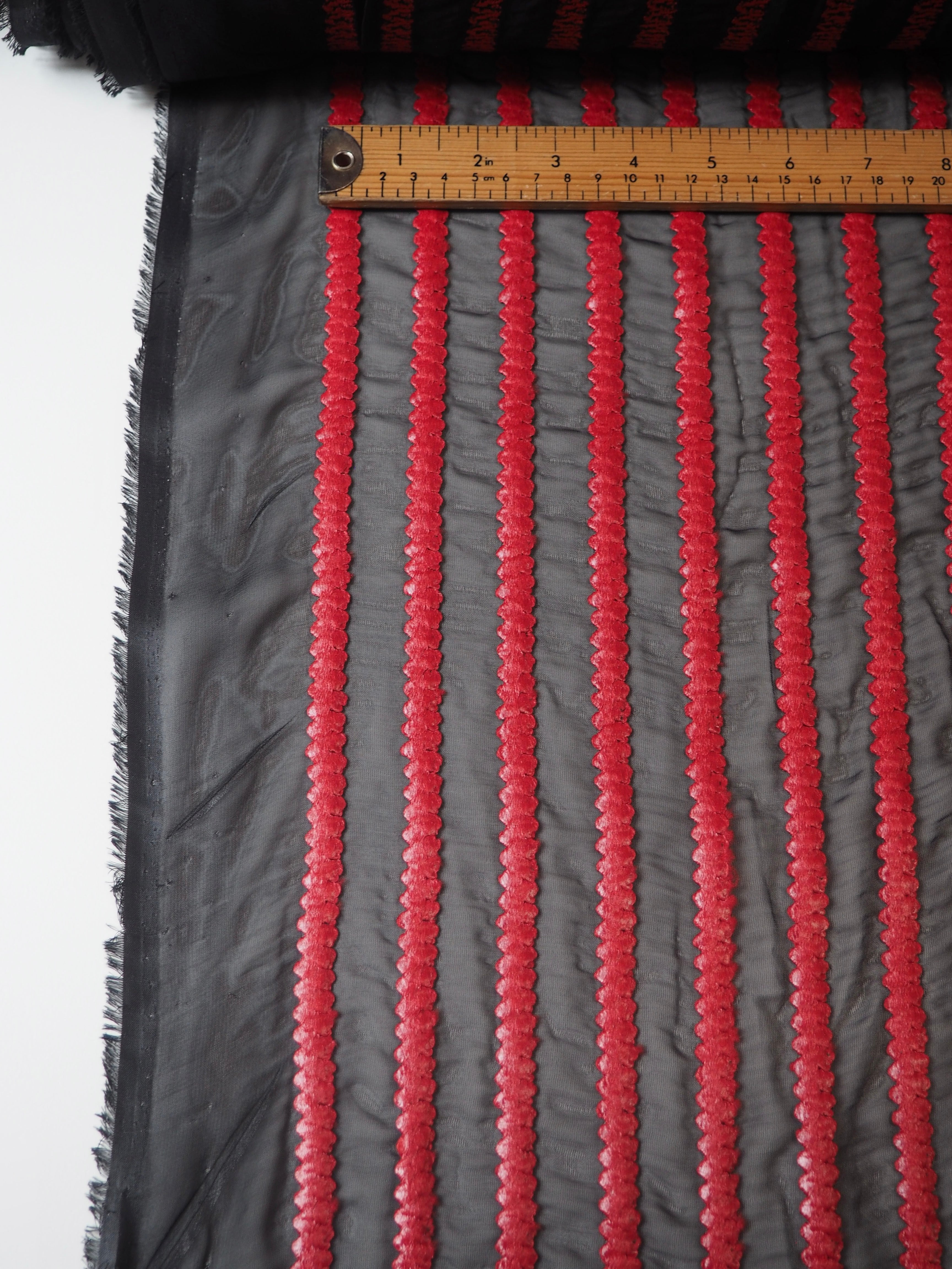 This ex-designer fabric is a unique chiffon. It's a black chiffon with a red heavy embroidered stripe, which looks like a braid, down the warp. It's semi-sheer, medium weight, and has an interesting drape with a bit of structure from the stripes. Has an interesting handle that reflects the visual texture. Would make such a cool dress or top overlay, or even curtains!