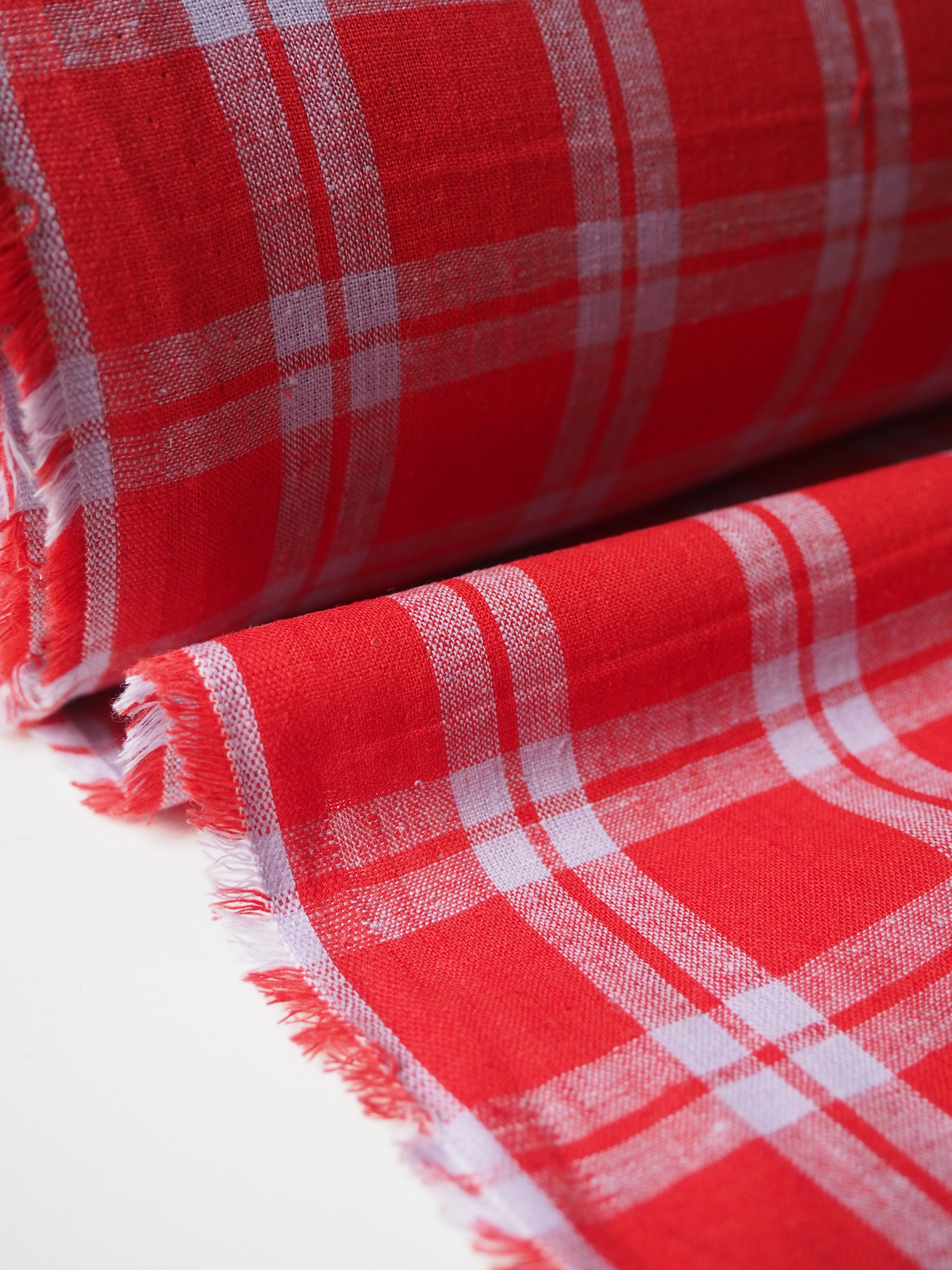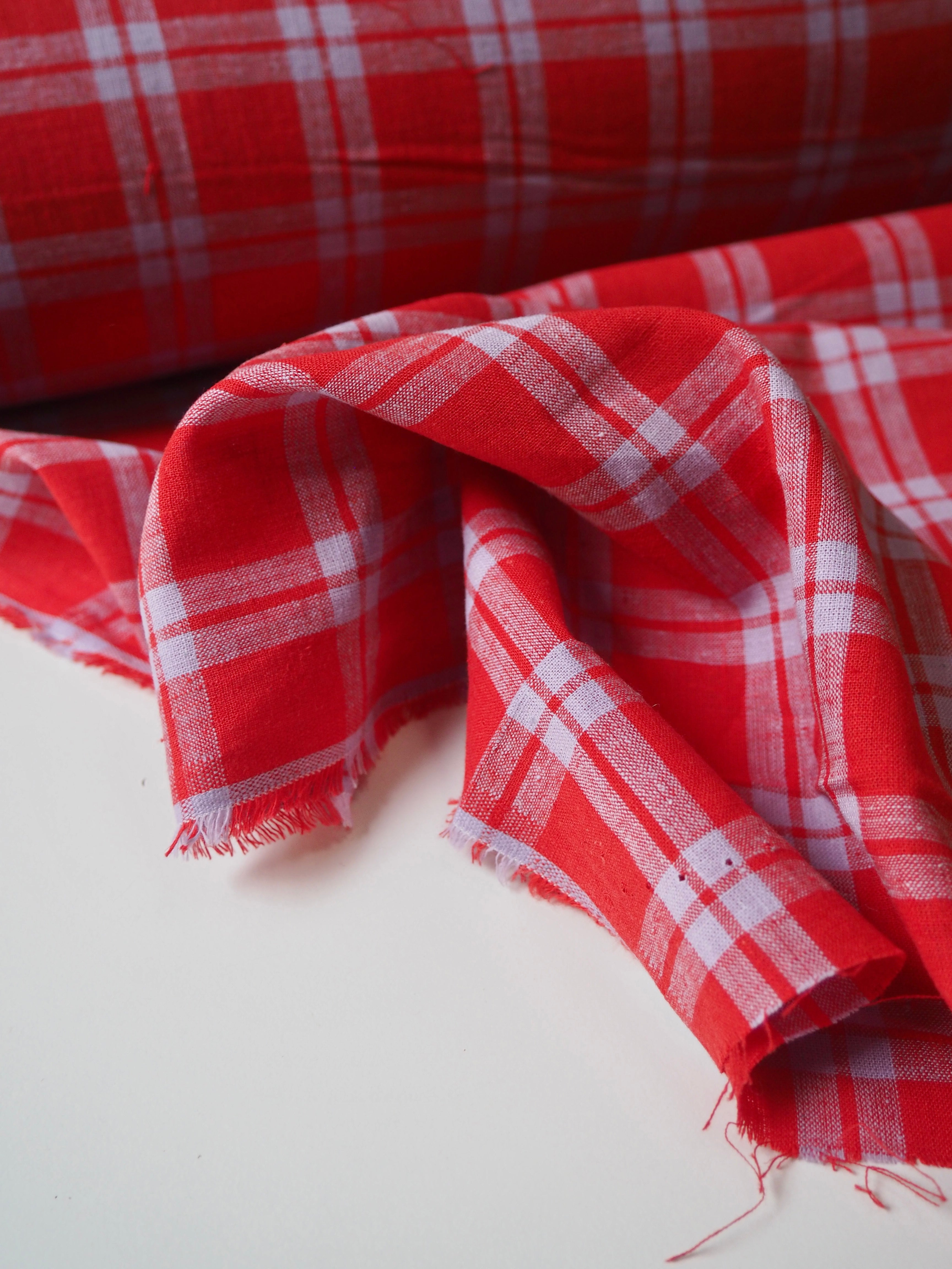 This ex-designer fabric is a cotton/linen. It's a red and pale lilac check. It's from a London-based brand called Beyond Nine. It has a super soft and gentle blended weave, with an ideal cotton-y handle that's so wearable. That little bit of linen really elevates the cloth! Very lightweight with a gentle structured drape, breathable, and fully opaque. Lovely for our Everyday Dress/Top, summer tops or Everyday Trousers, (or even a co-ord!), or a tablecloth and napkin set! We can't wait to see what you make!