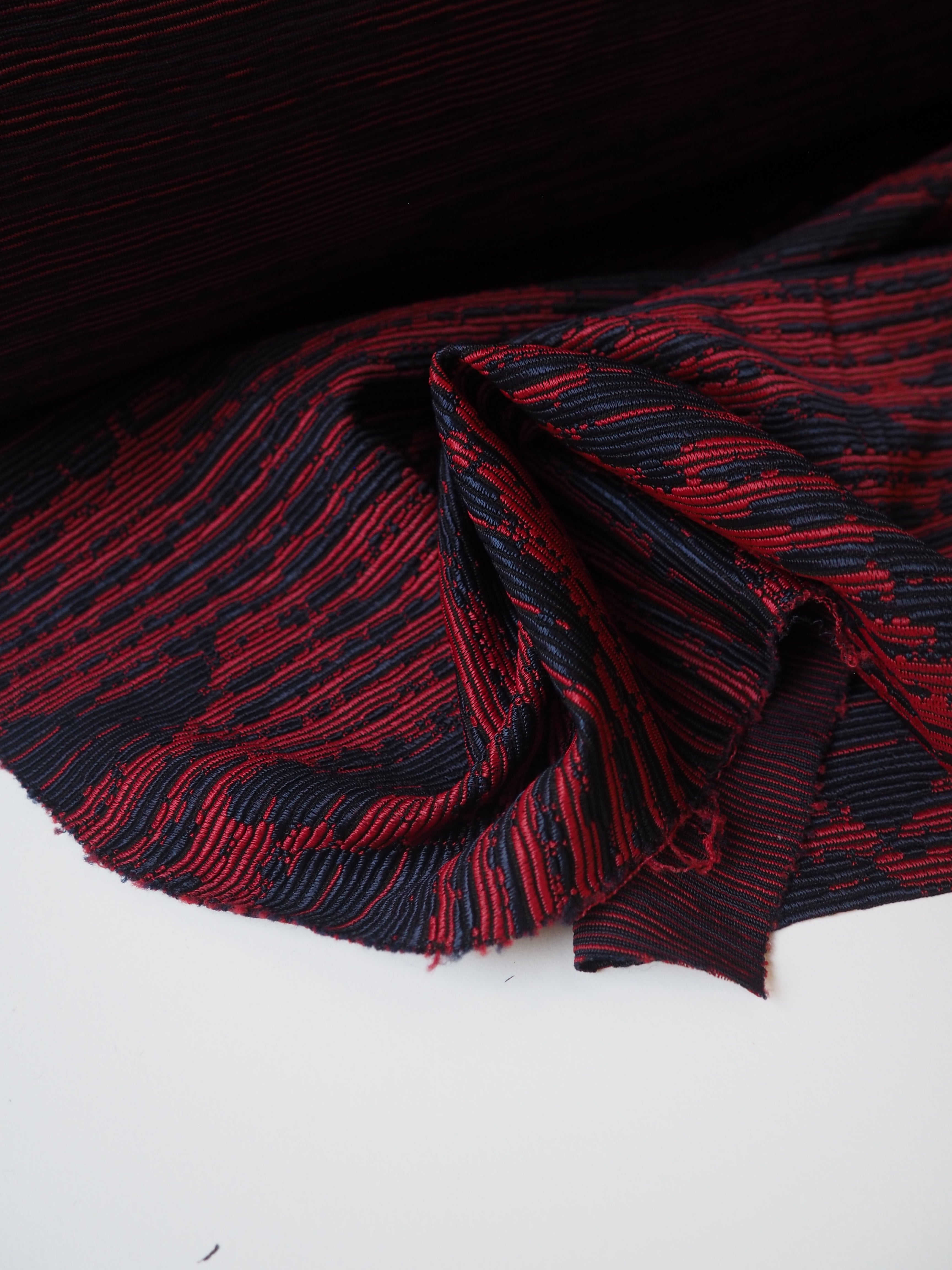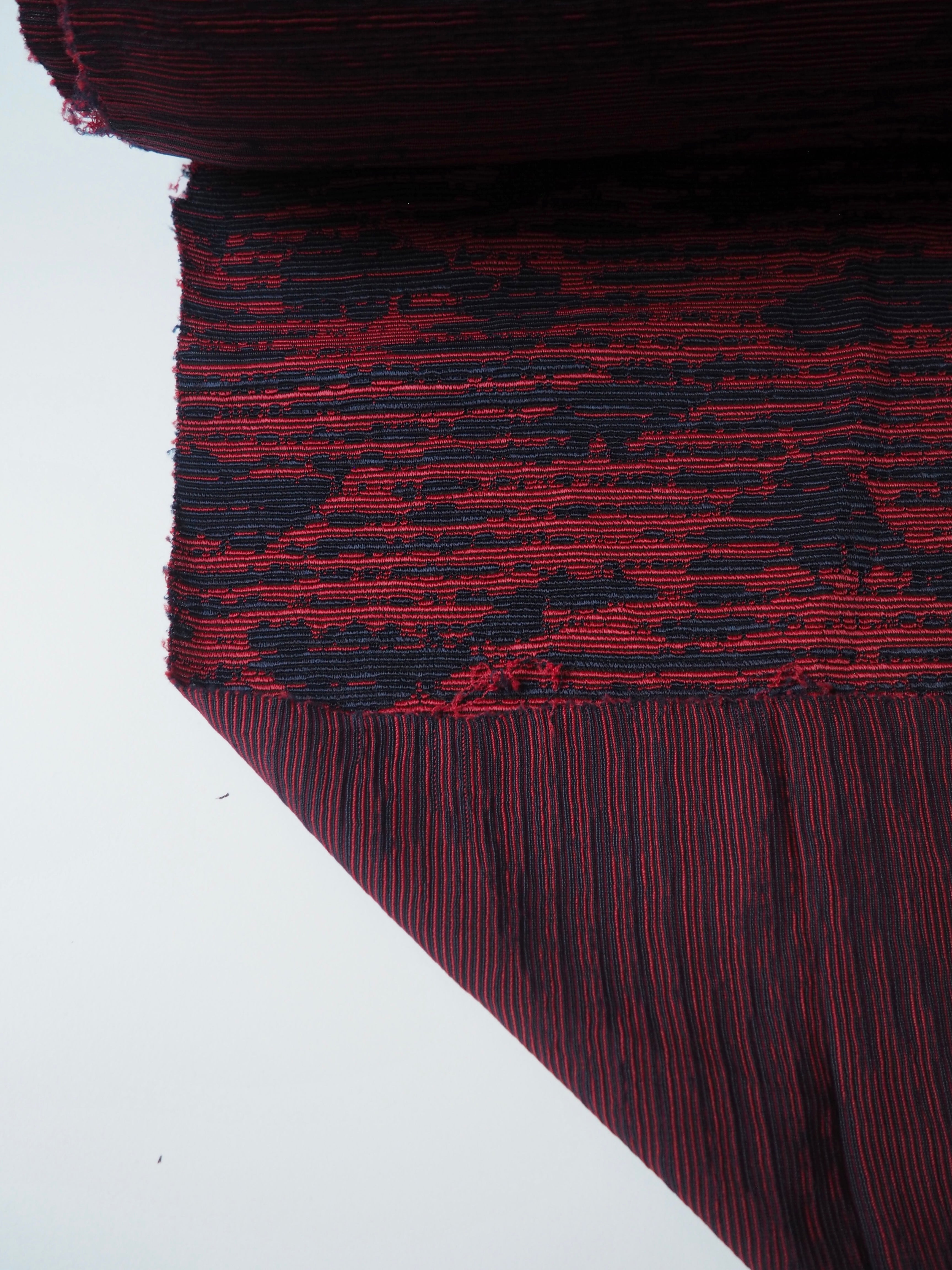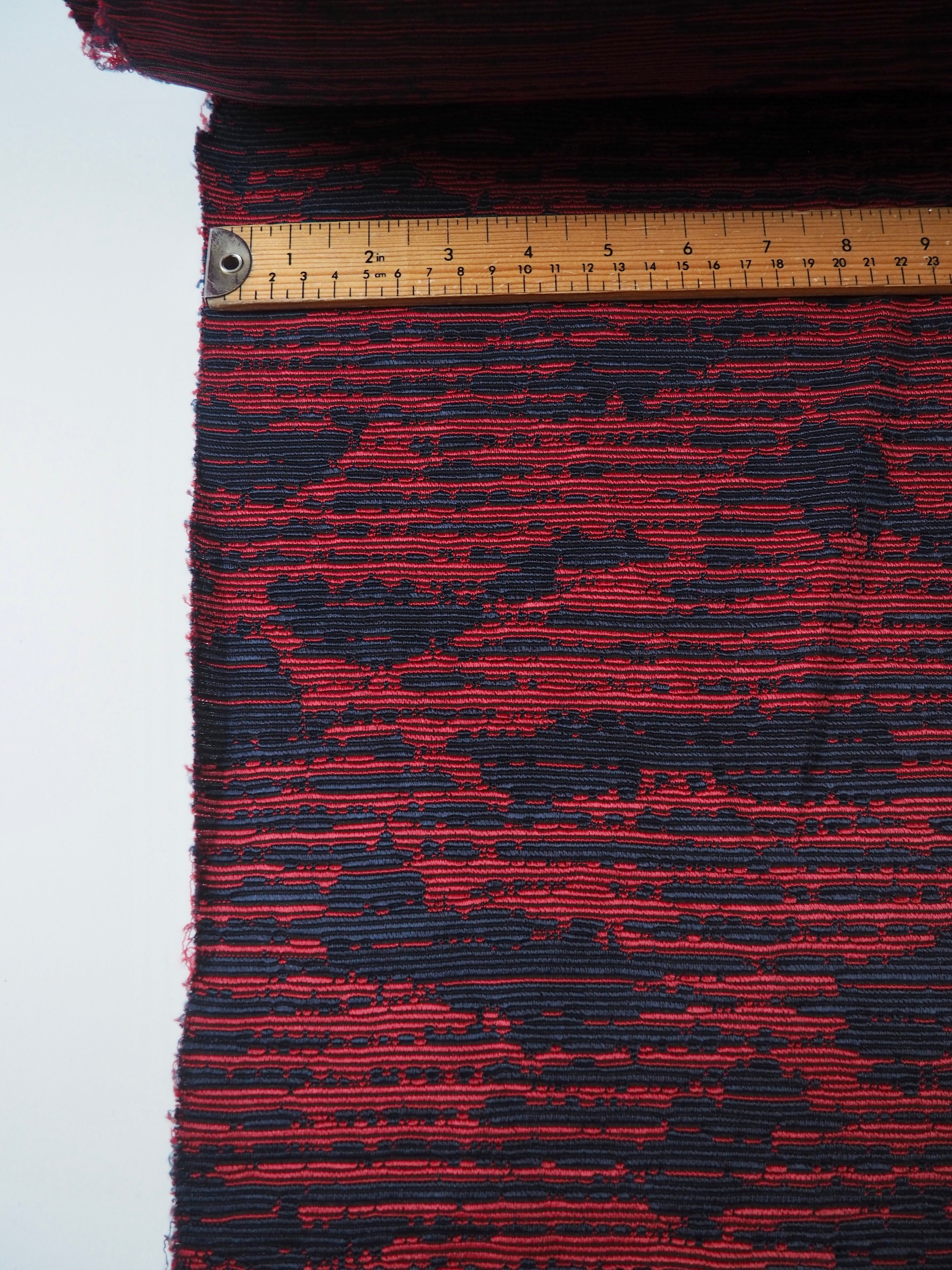 This ex-designer fabric is a jersey jacquard. It's a navy and red colourway with a ribbed-like abstract pattern. It's soft and super stretchy, at least 50% both ways. Has a great interesting texture and comfortable, sturdy handle. Opaque, medium weight, and has a great structure. Perfect for an oversized jacket or fitted dress!