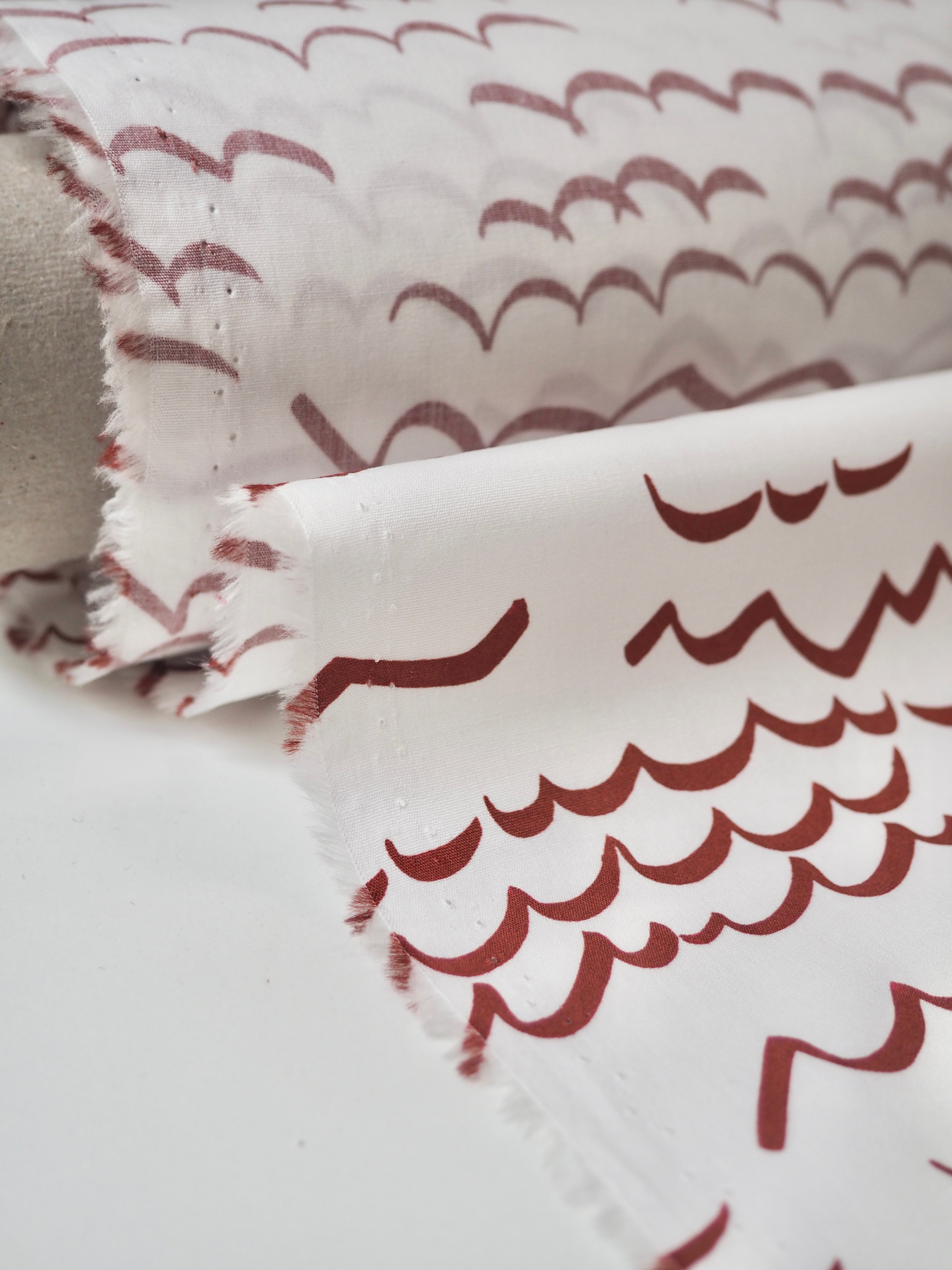 This ex-designer fabric is a cotton poplin. It's in a red and white colourway, with abstract wave drawings across the weft. You can even see the designers initials! It is lightweight with a gently structured, slightly crispy drape. Mostly opaque, with a really lovely handle and quality. Perfect for dresses and button downs!