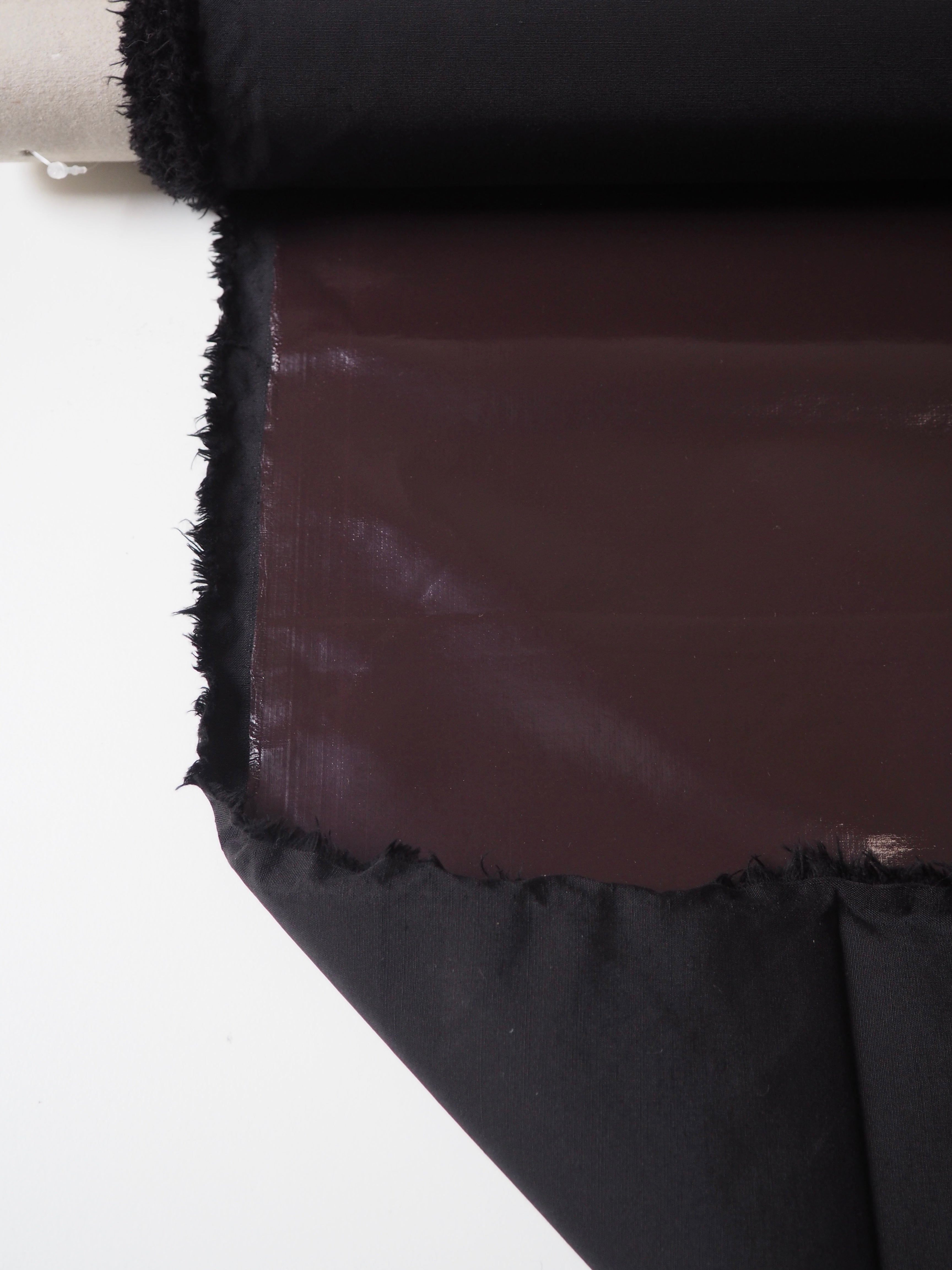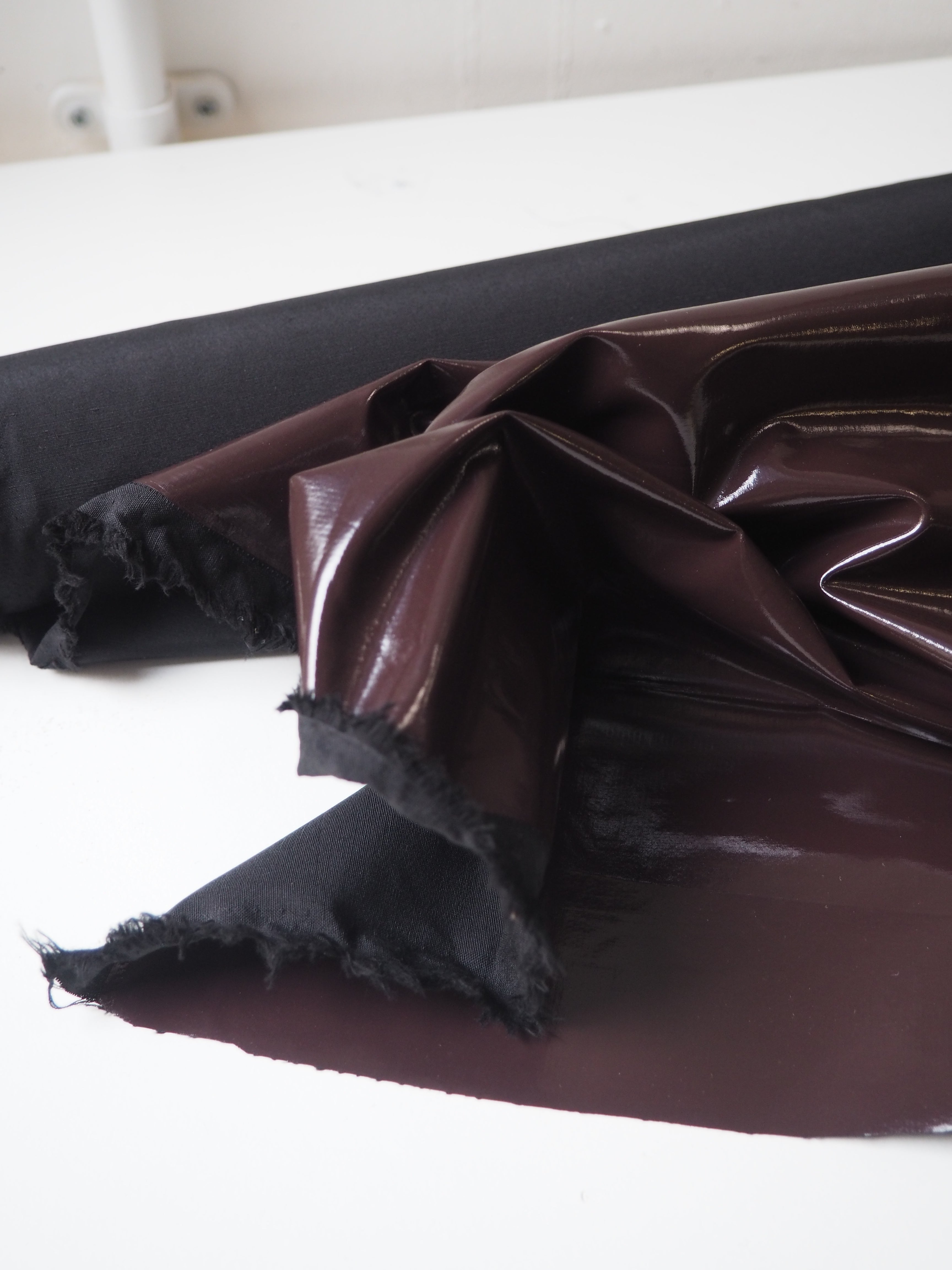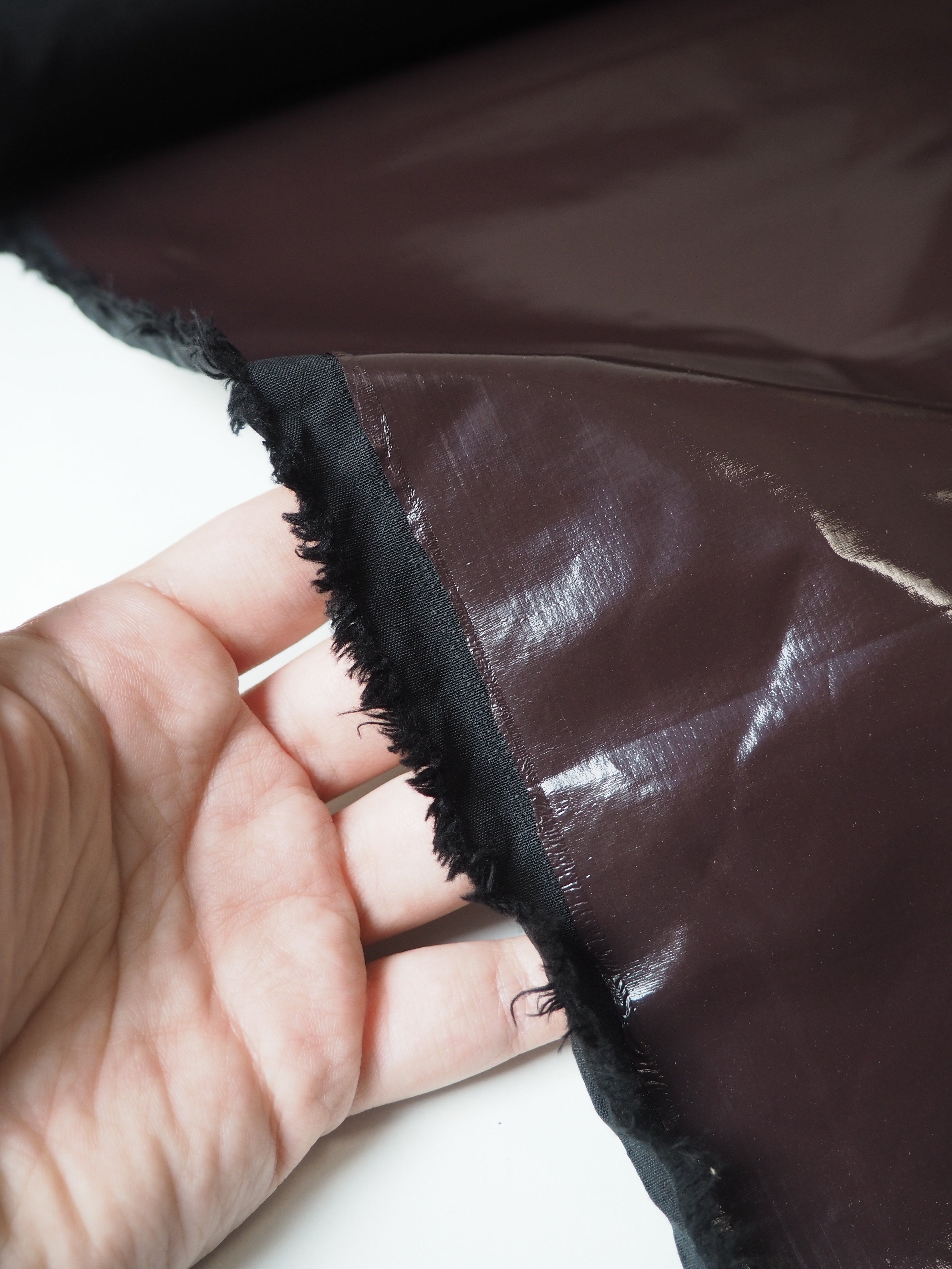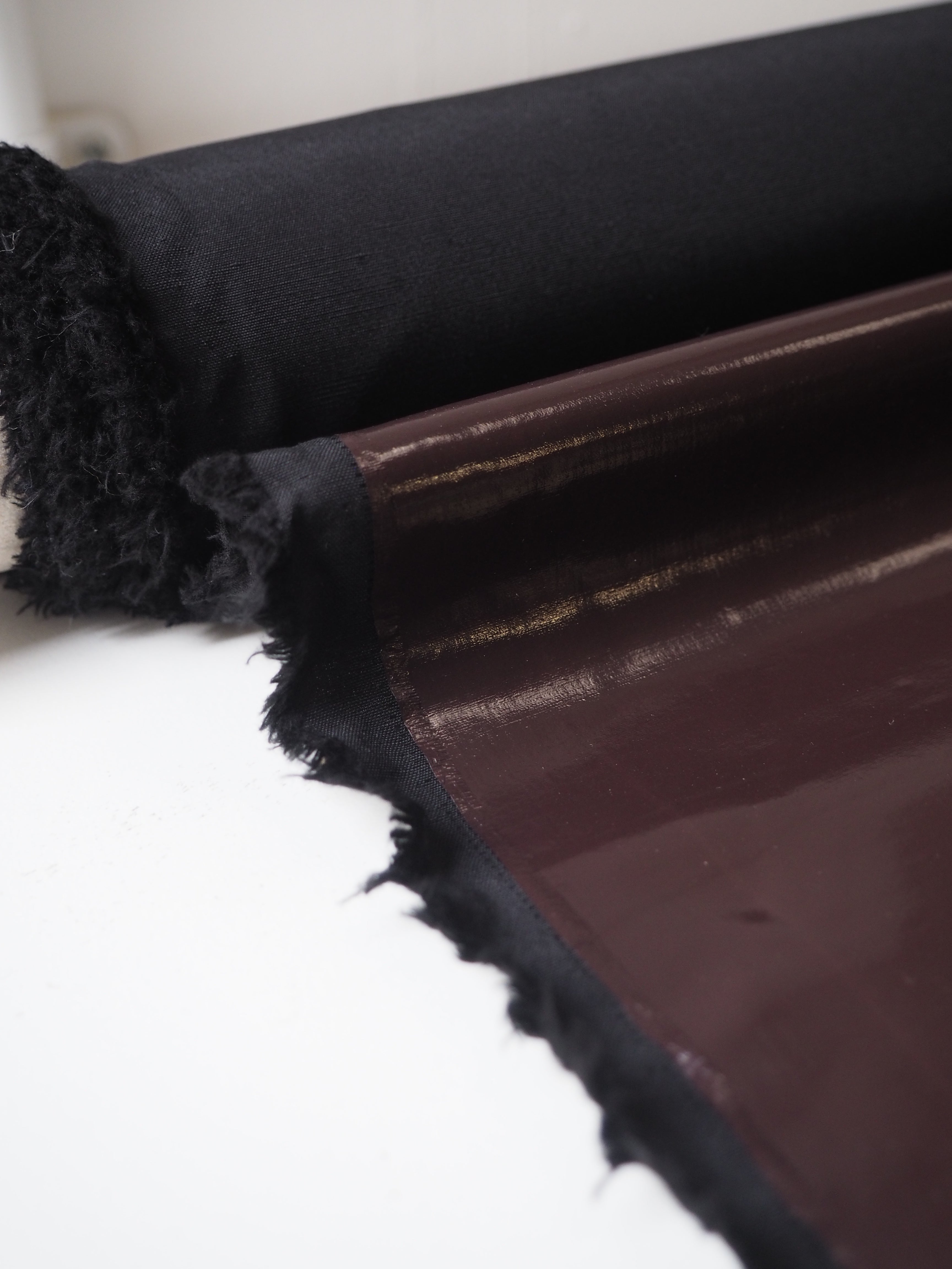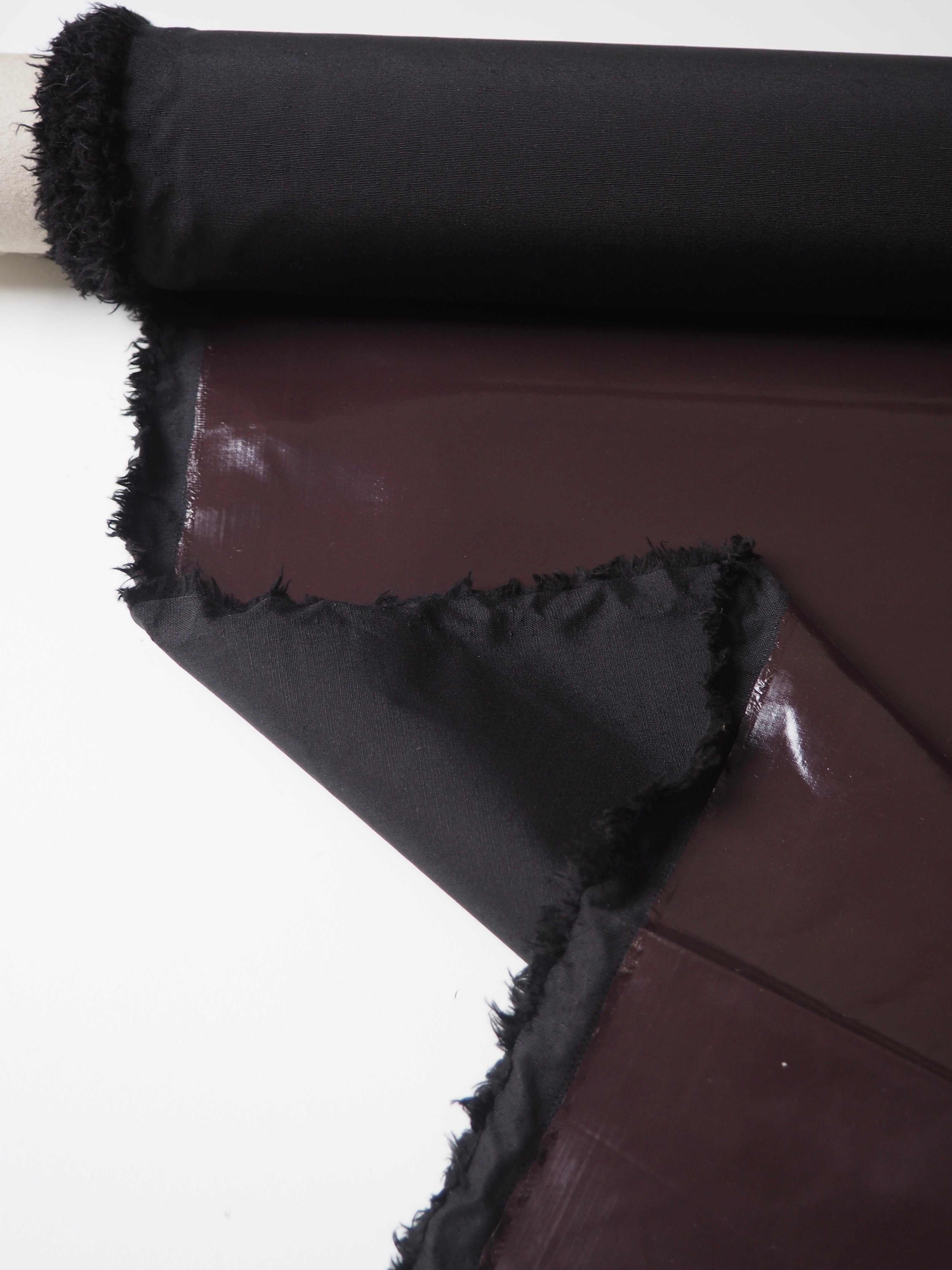 This ex-designer fabric is a coated polyester. It's a thin black polyester, with a rich brown patent coating on top. It's very lightweight and quite crispy. It catches the light so well and has a nice drape and flexible structure. Great for a technical projects!