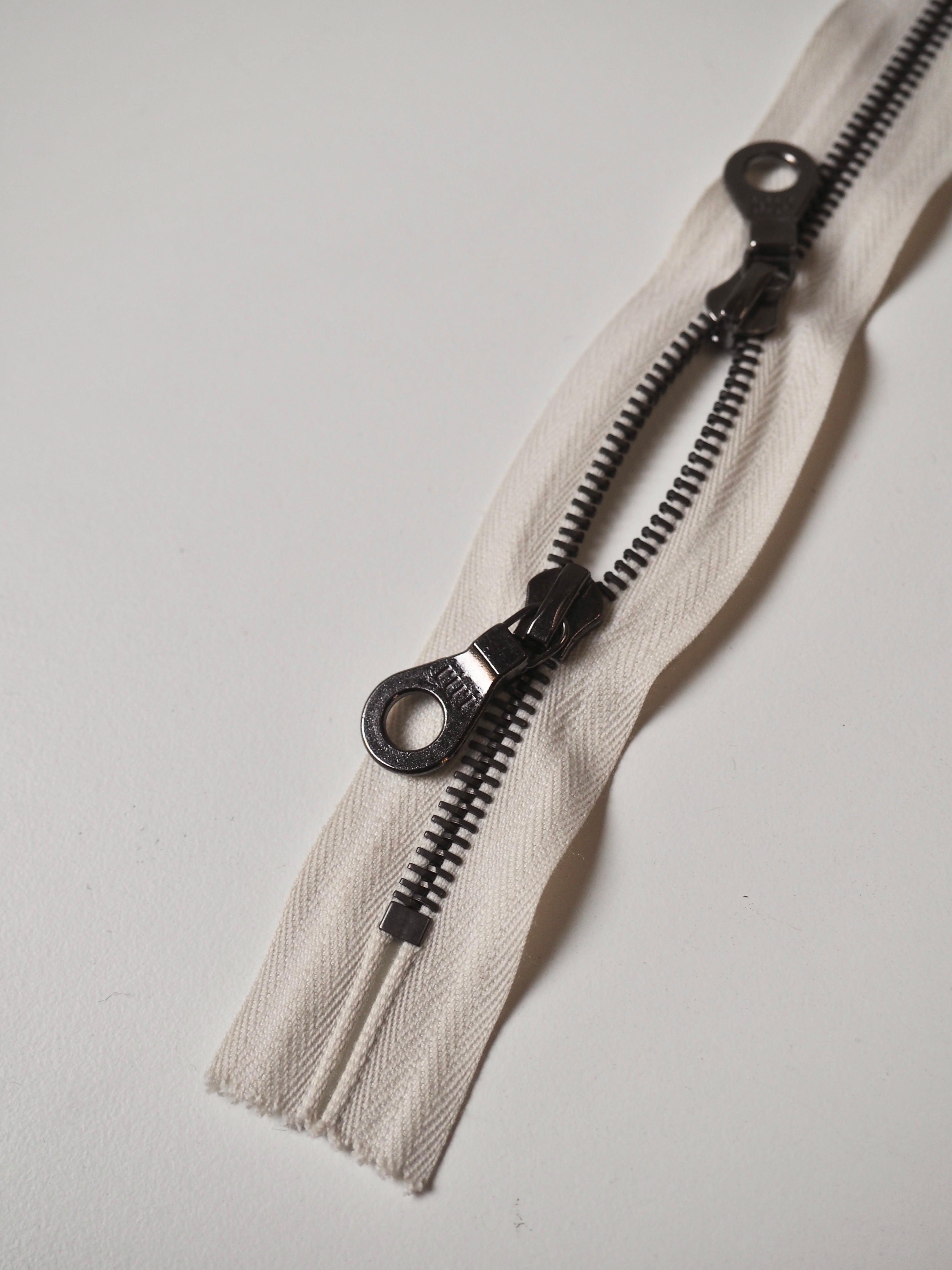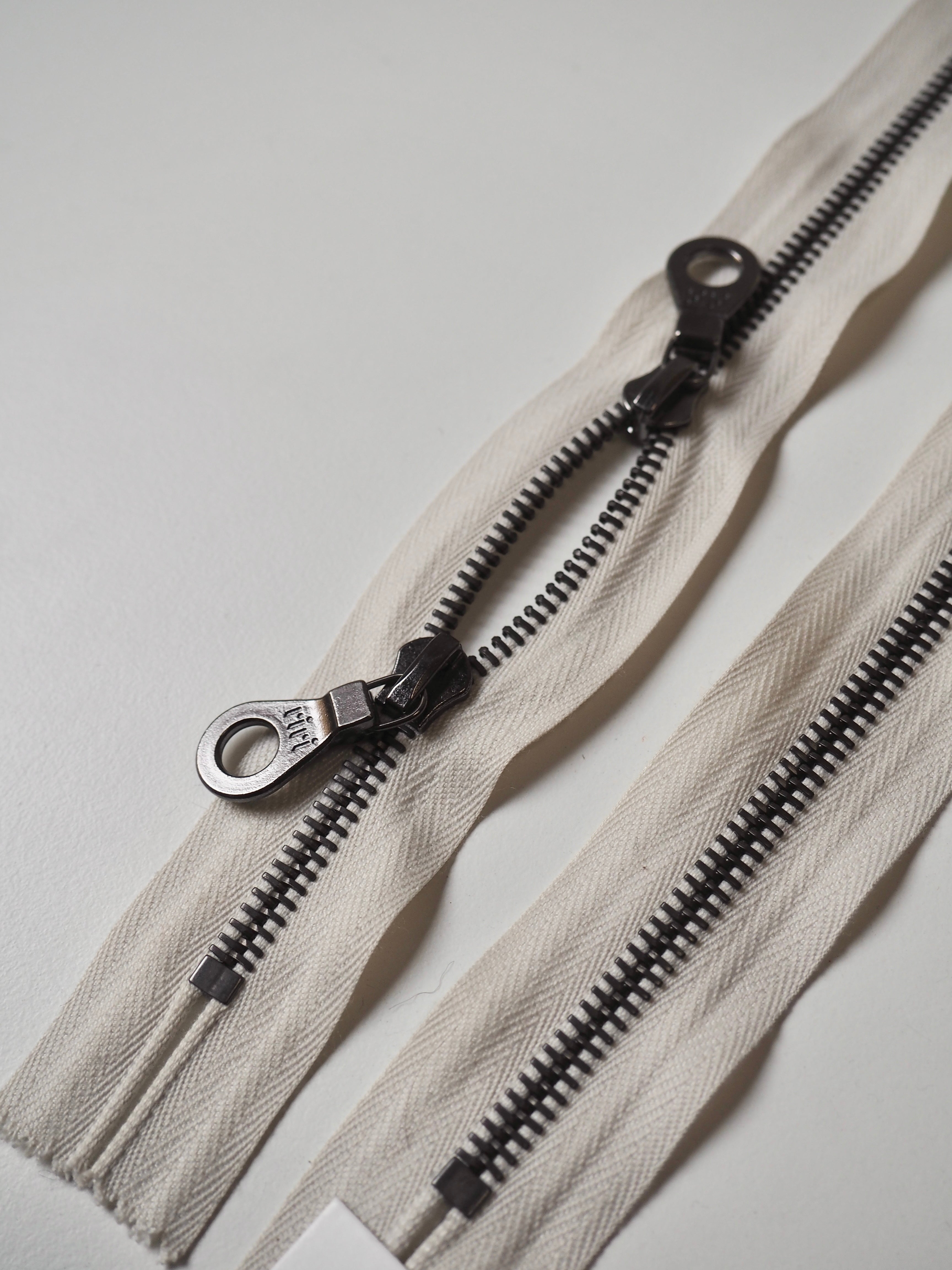 These ex-designer two-way closed-ended zips are an off-white ecru colour with a soft tape and gunmetal metal 6mm teeth. 2 chunky gunmetal metal zipper pulls. Top-quality from Riri in Italy.