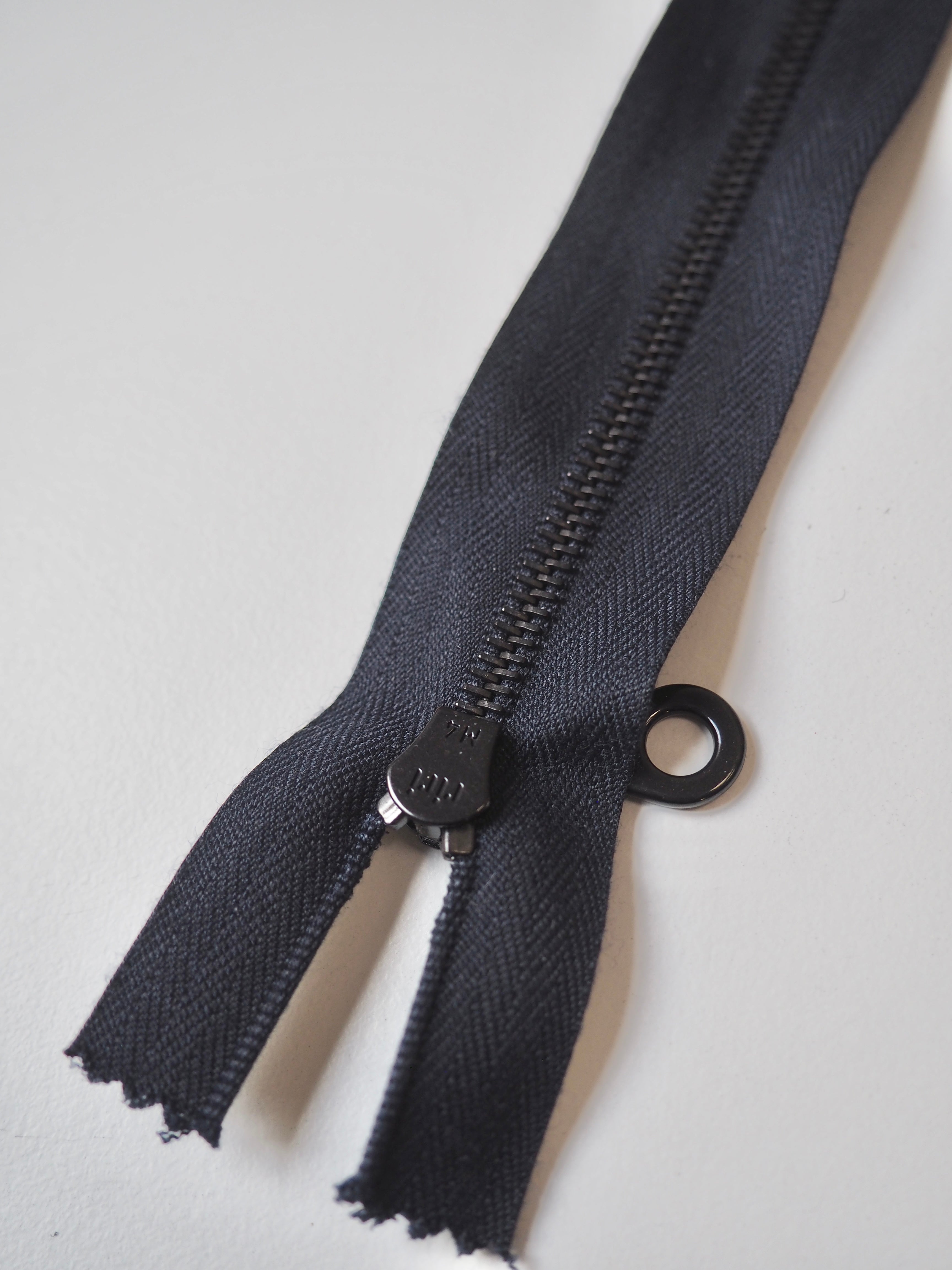 These ex-designer zips from Riri are closed ended with a luxurious cotton tape and 4mm black metal teeth.