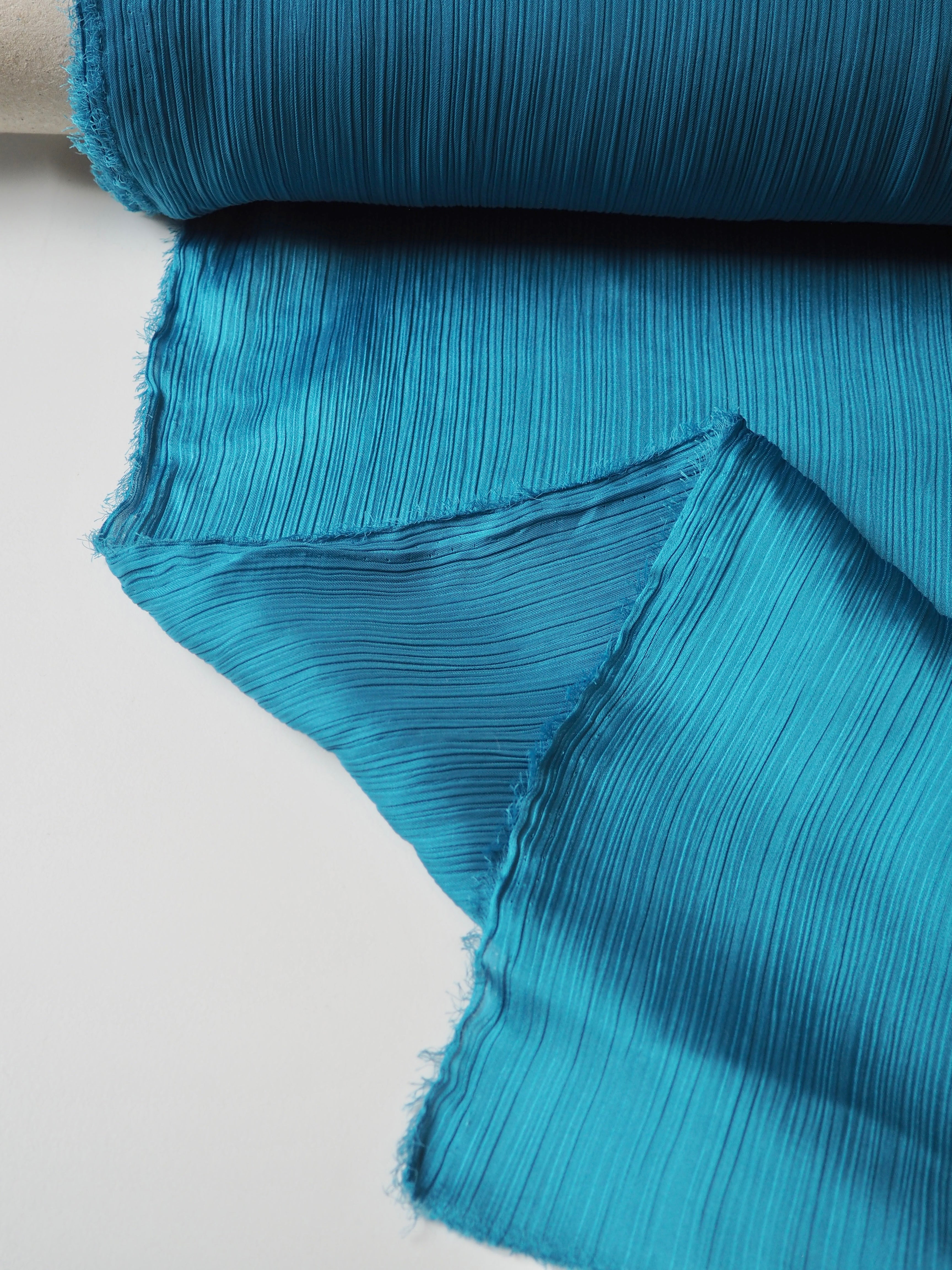 This ex-designer fabric is a satin chiffon. It has such a lovely bright satin sheen, and a crinkled finish down the warp. Has a slinky handle that feels luxurious! Super light and airy, more opaque than a typical chiffon. Very drapey and easy to gather for a voluminous effect. Ideal for a floaty top or dress!