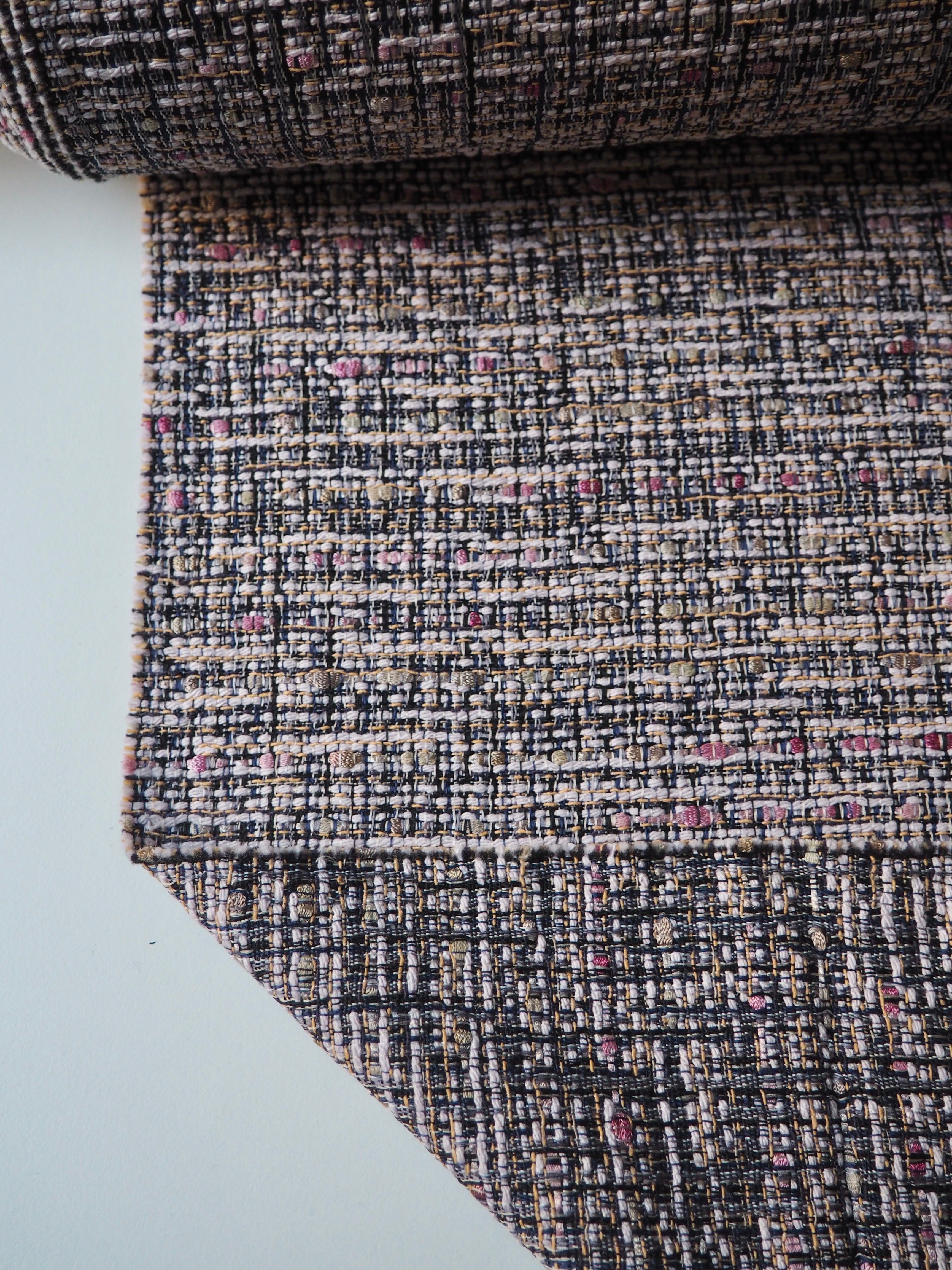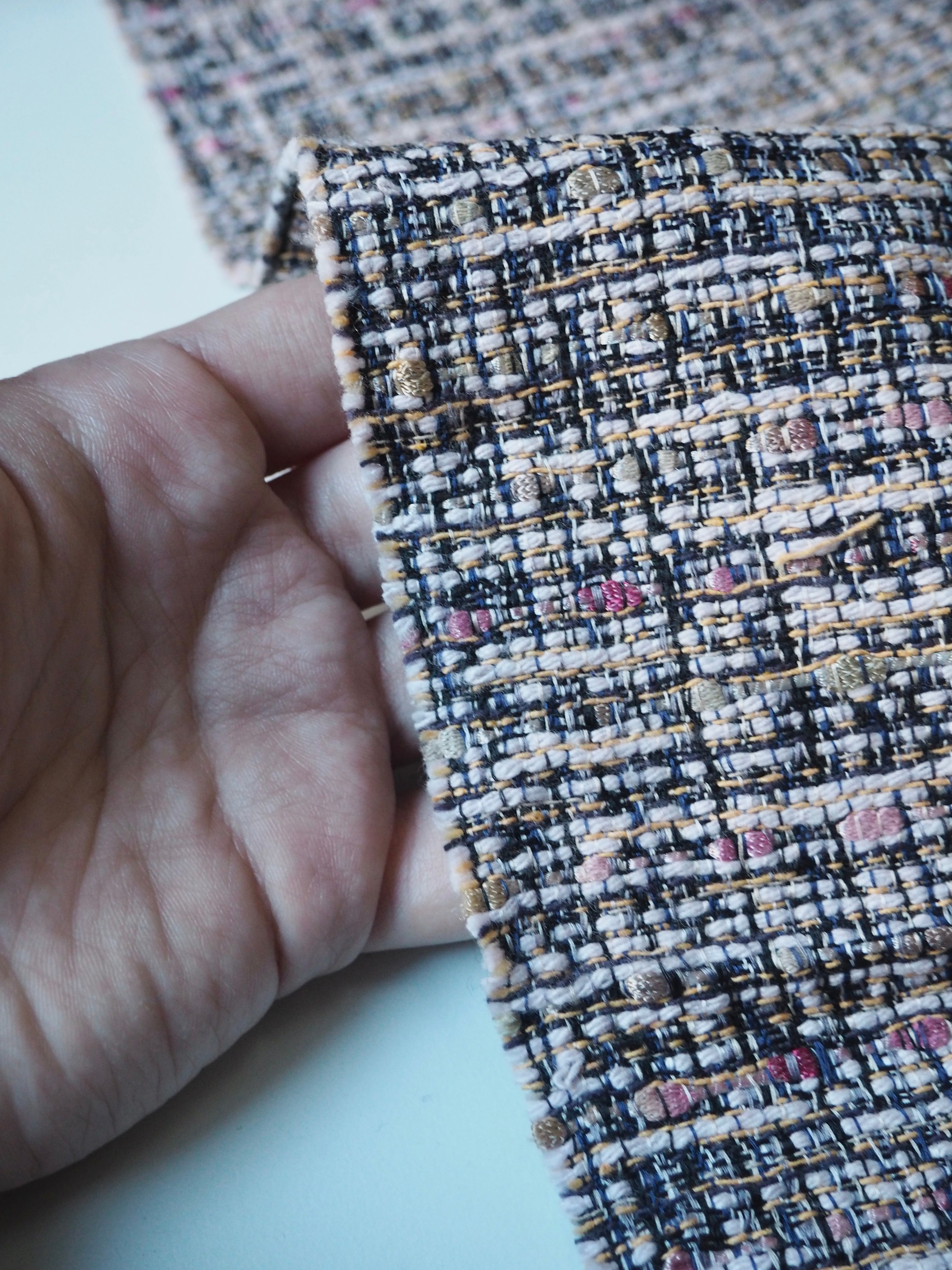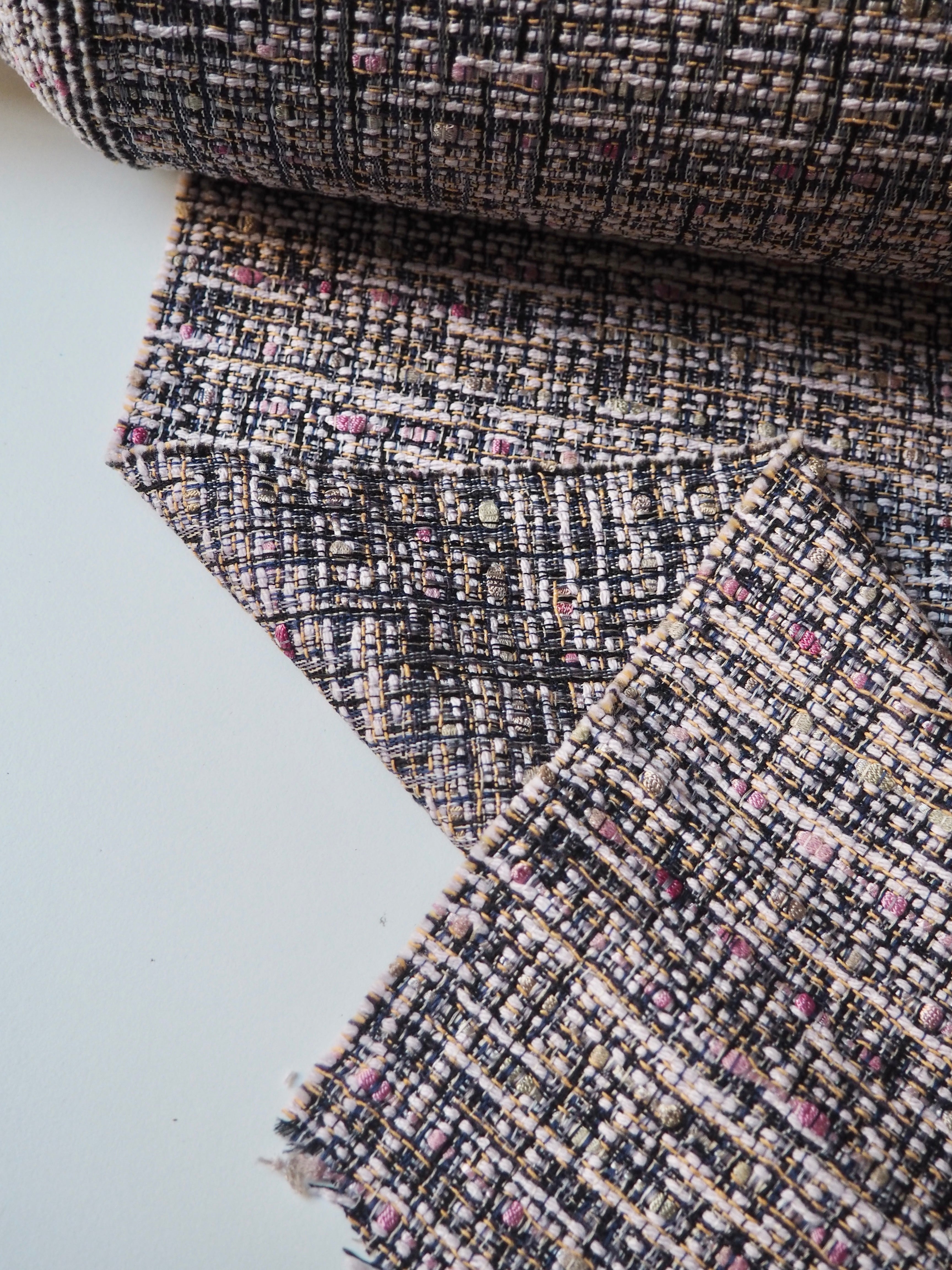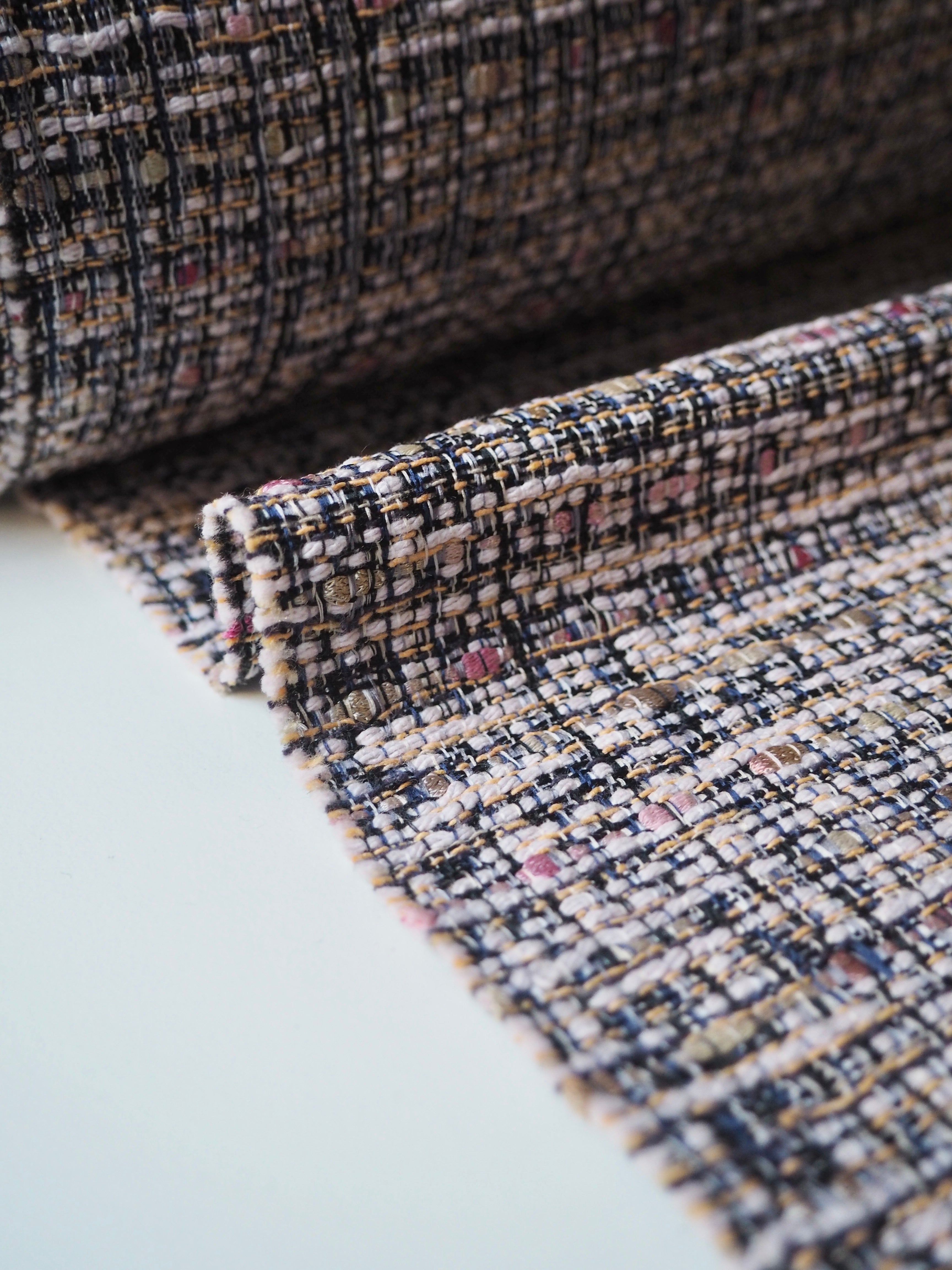 This ex-designer fabric is a cotton tweed. It has a gentle, very soft tweed weave in a mix of pink, yellow, black, white, and navy. It's opaque, with a gentle structure and lovely drape. Has such a lovely handle that's easy to work with. Lightweight and perfect for a light lined jacket or summer dress!