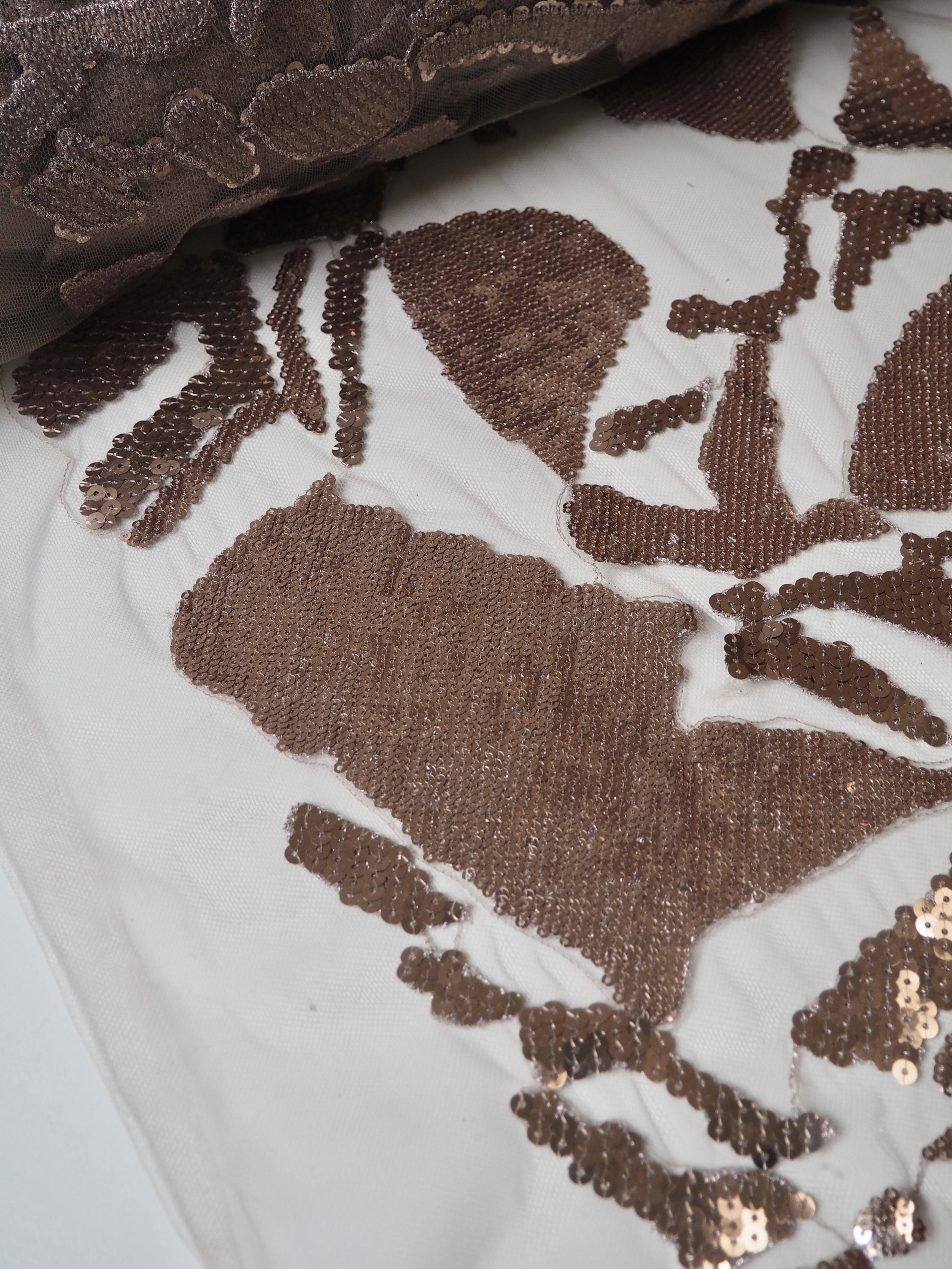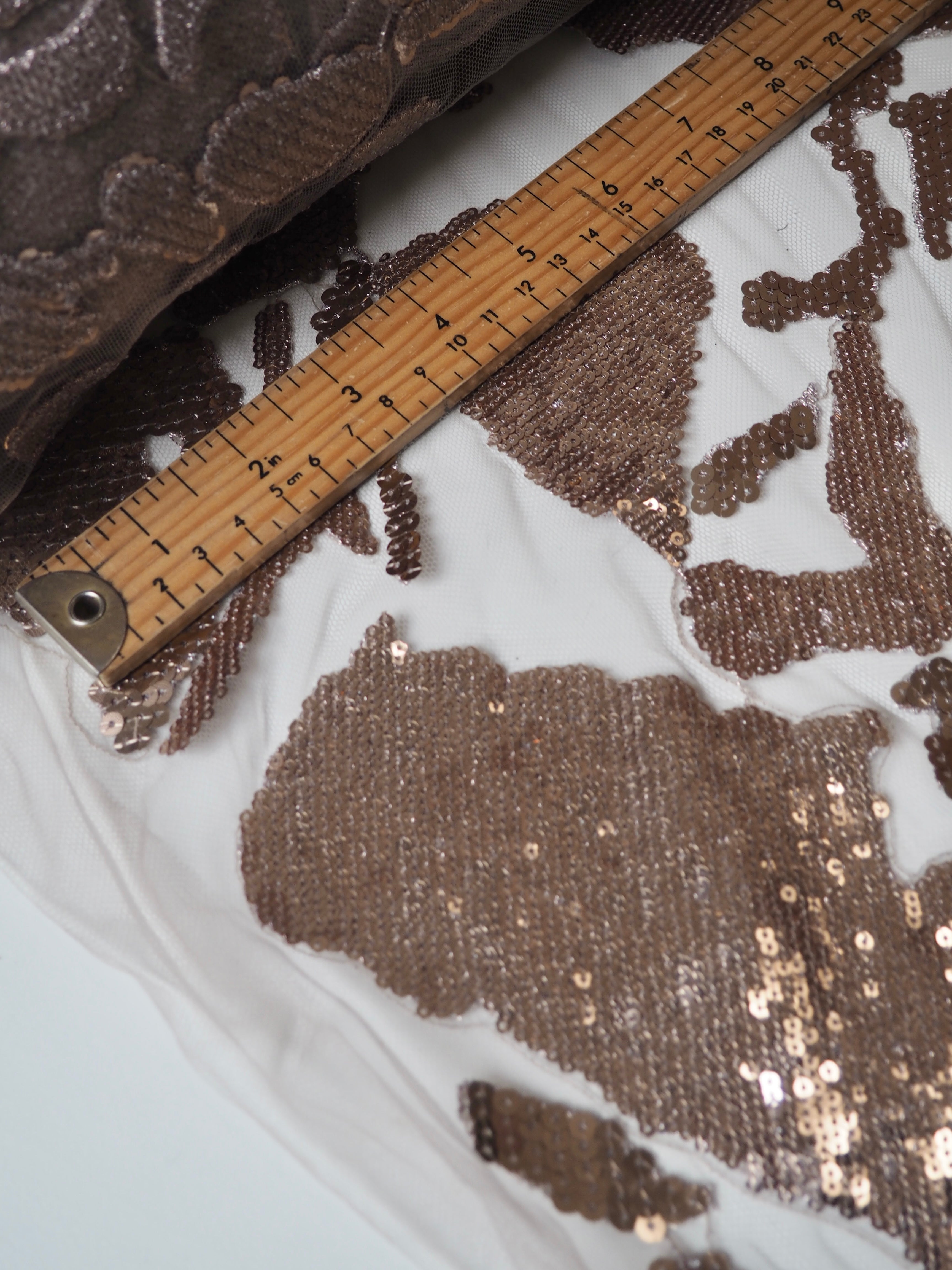 This ex-designer fabric is a gorgeous tulle. Rose gold sequins, of different sizes, are stitched into abstract patch shapes, with embroidered stitching, across this dusky pink coloured illusion tulle. It's such a luxurious cloth, and has lovely movement when swishing in the light! Light to medium weight and so fancy! Sheer, and drapes beautifully, perfect over a fancy dress or long jacket!