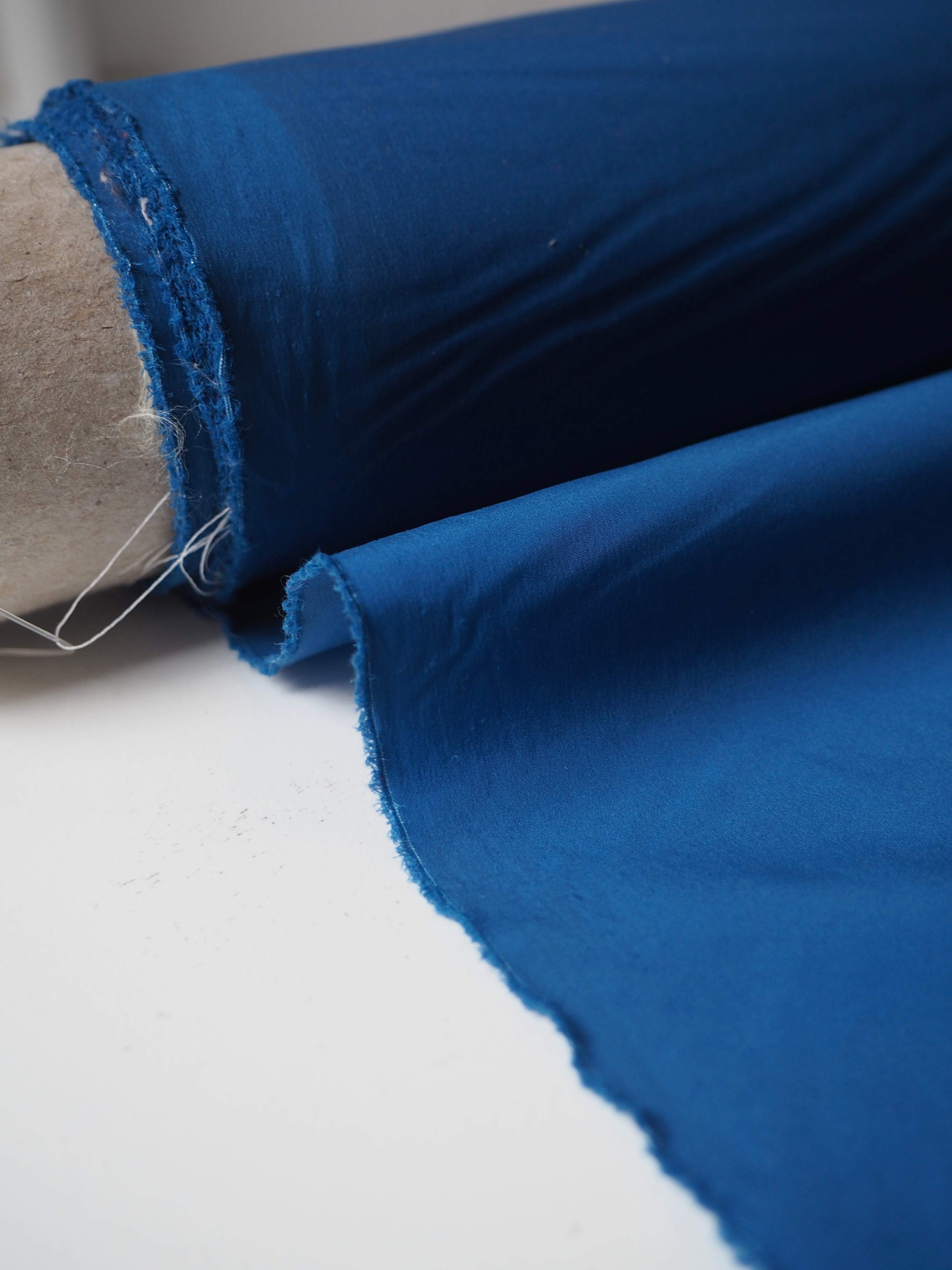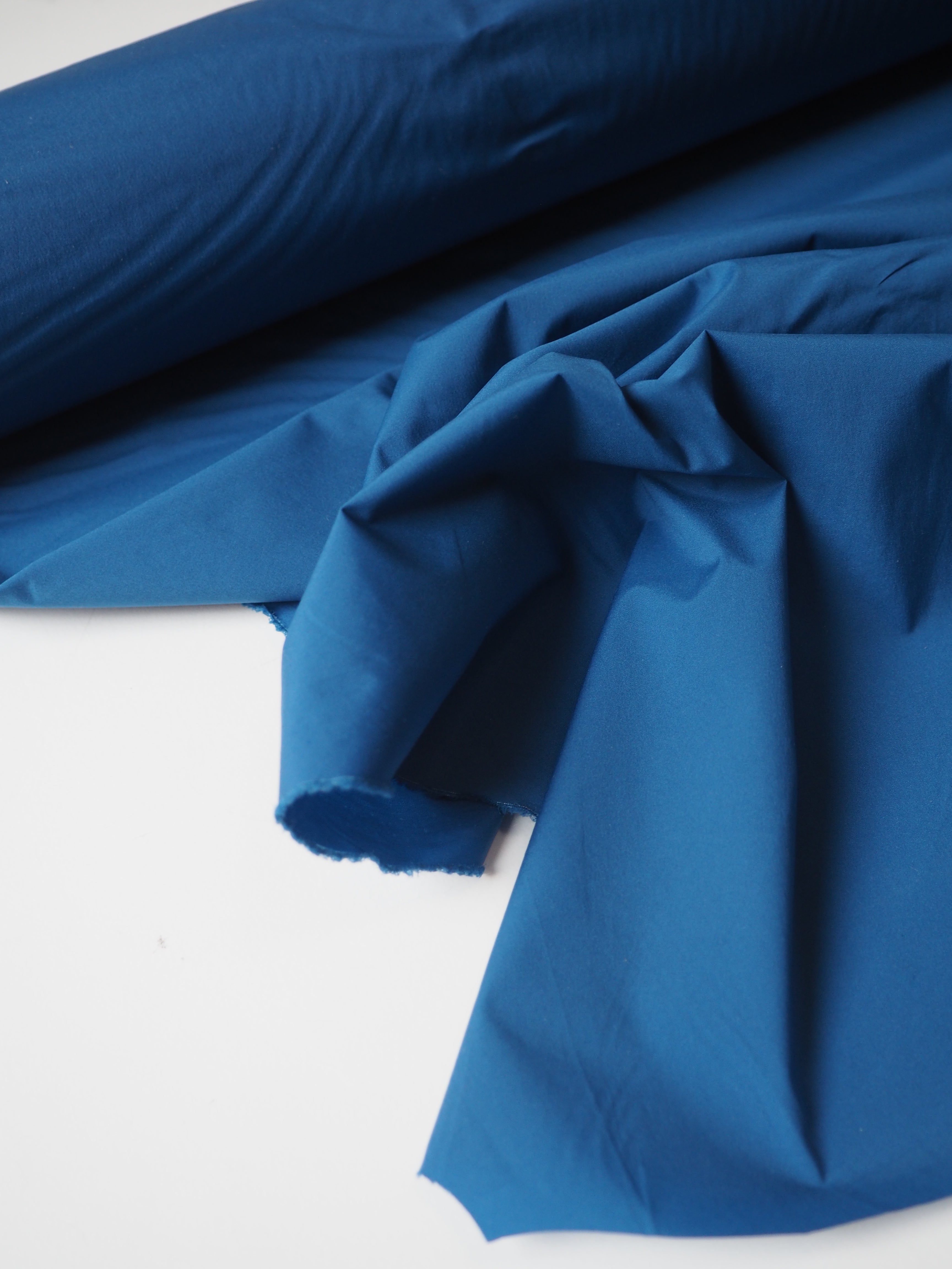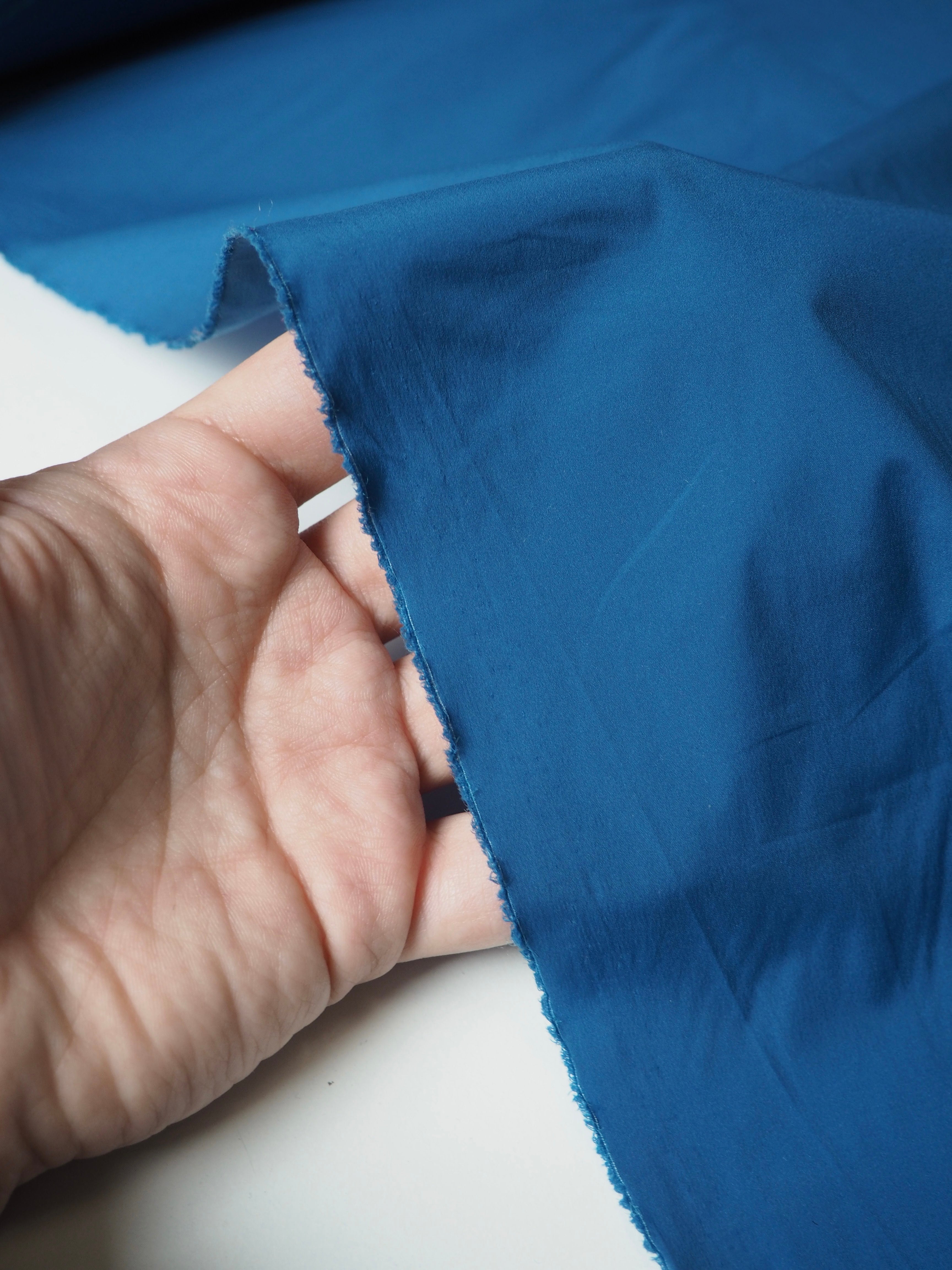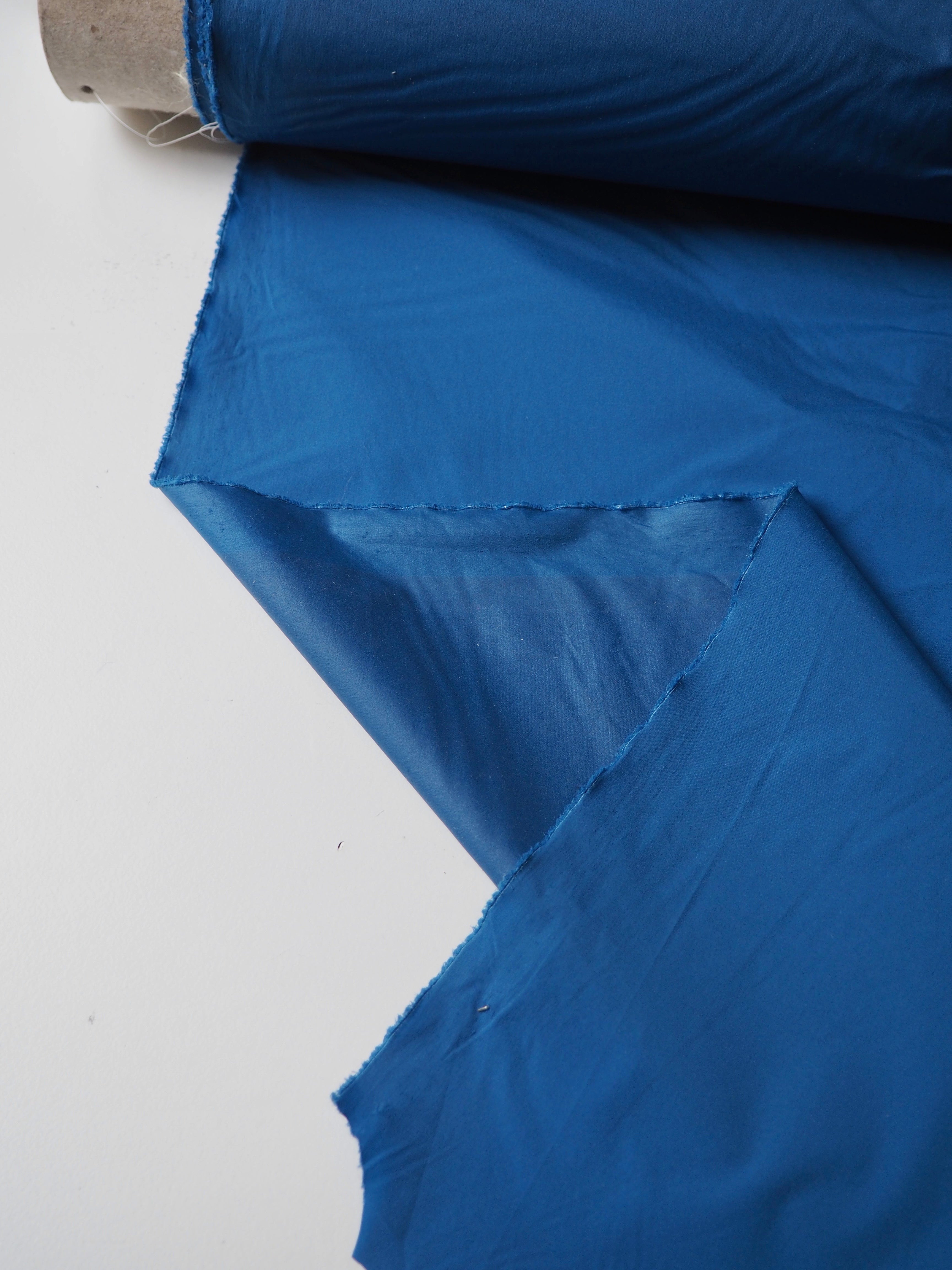 This ex-designer fabric is a nylon. It's a super thin blue nylon, that is paper thin and fully opaque. It has about 20% width-ways stretch, and it's quite crispy. It drapes so well and is quite versatile. Great for a technical projects!