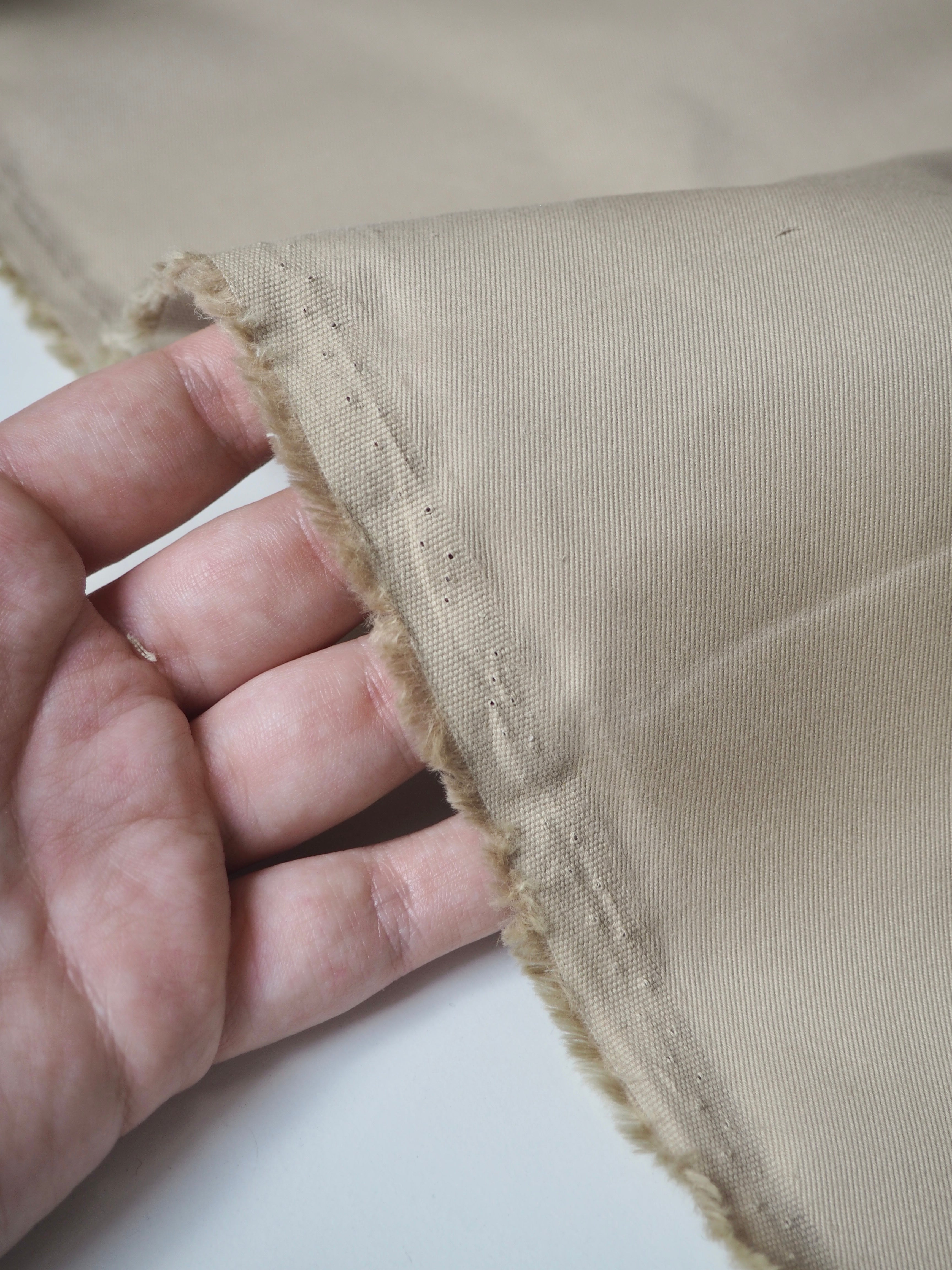 This ex-designer fabric is a cotton twill. It's a sturdy weight twill that's lightweight with a nice crisp feel and very slight sheen finish. This one is from top-quality UK Manufacturer Brisbane Moss. Has a lovely soft structure that makes it perfect for trench jackets, trousers, shorts, or our Lunar Jacket!