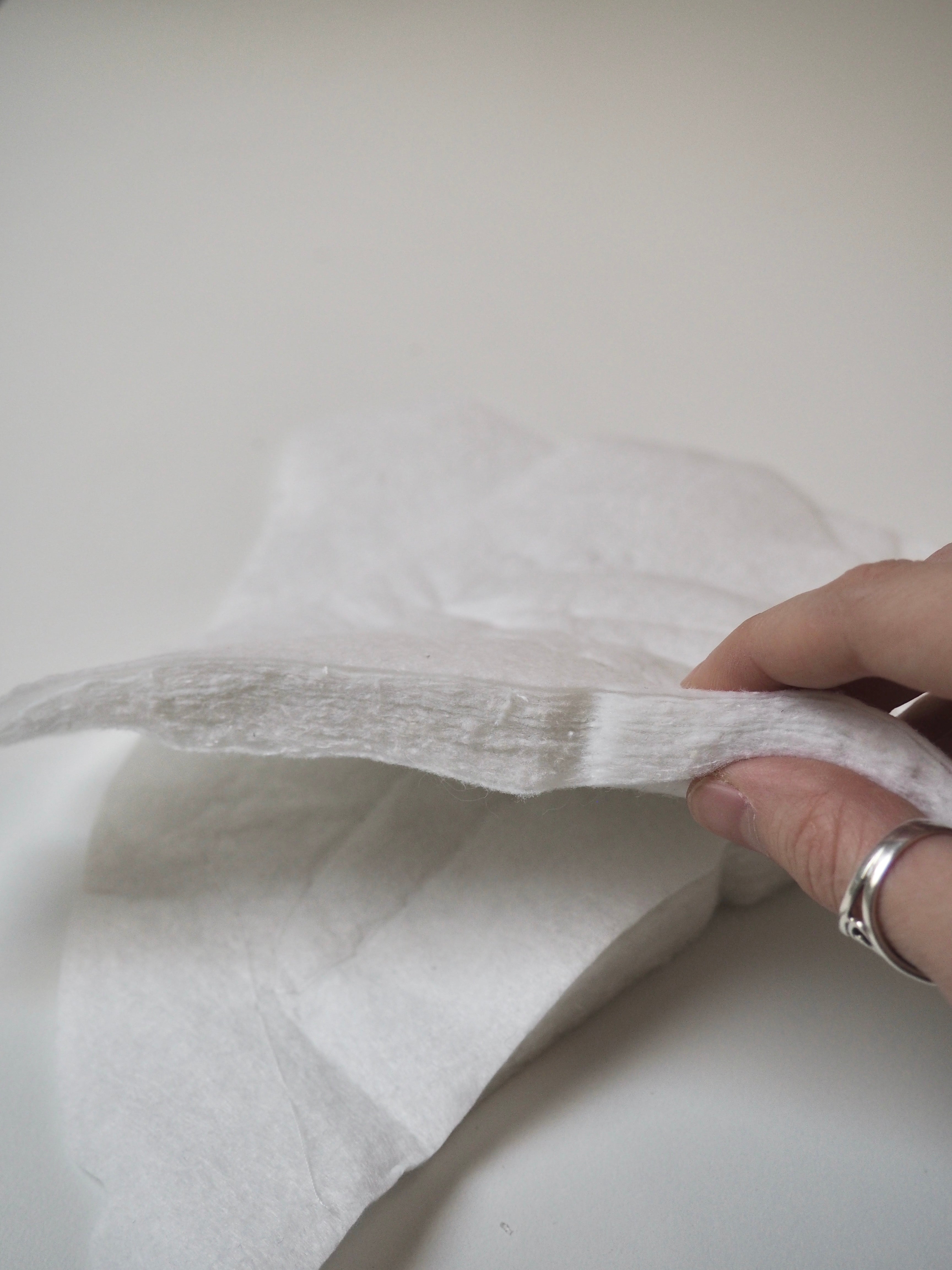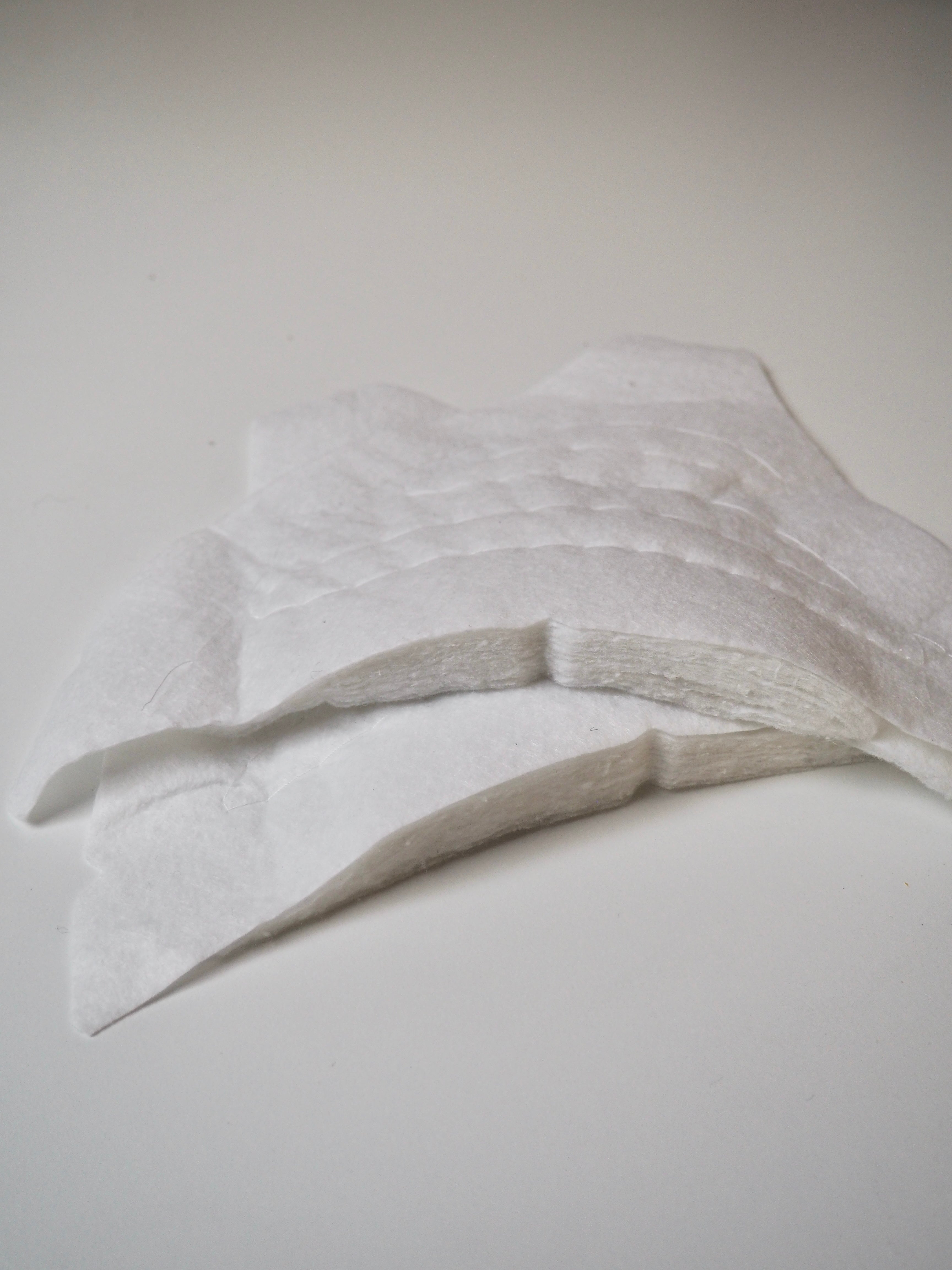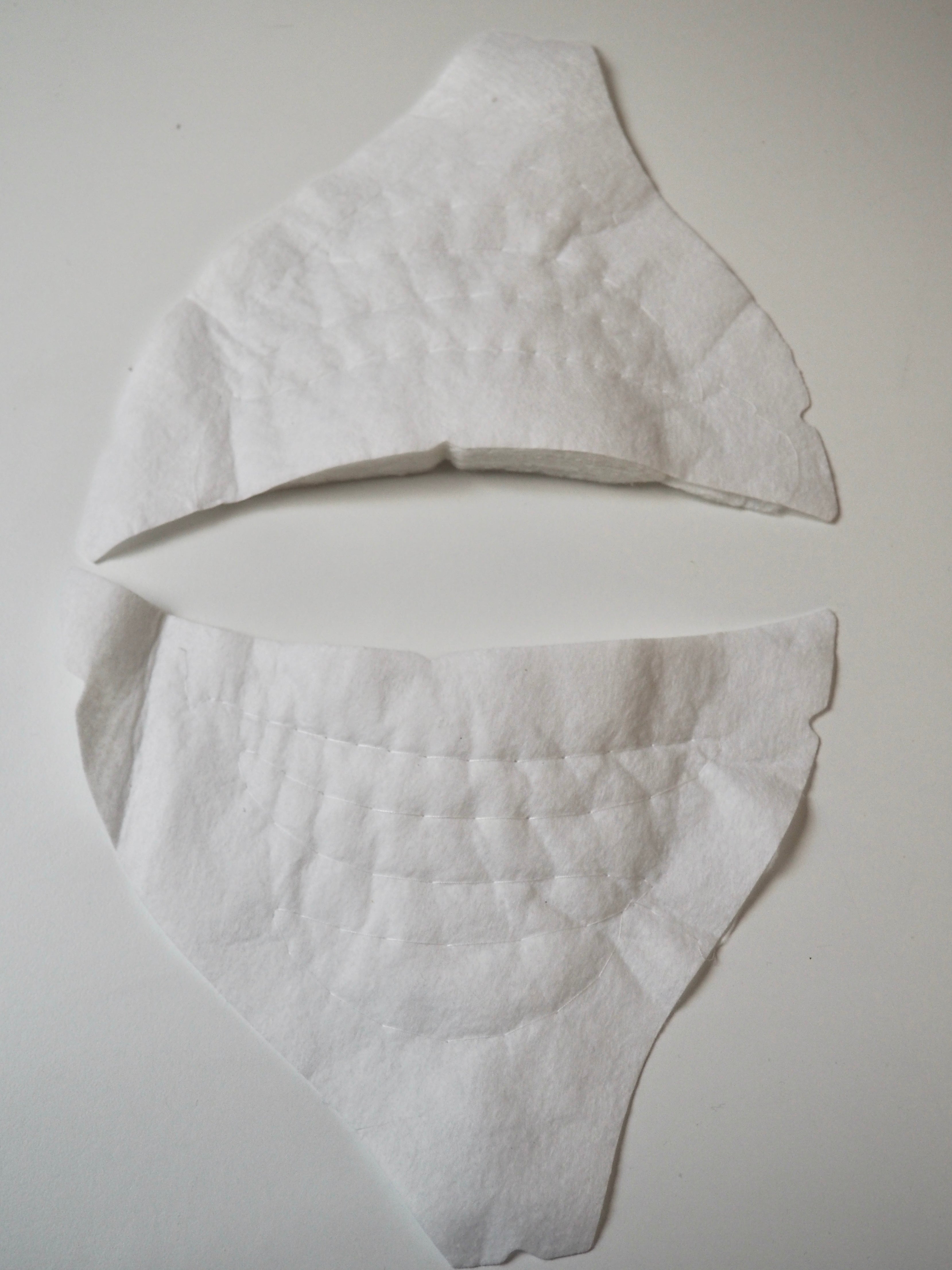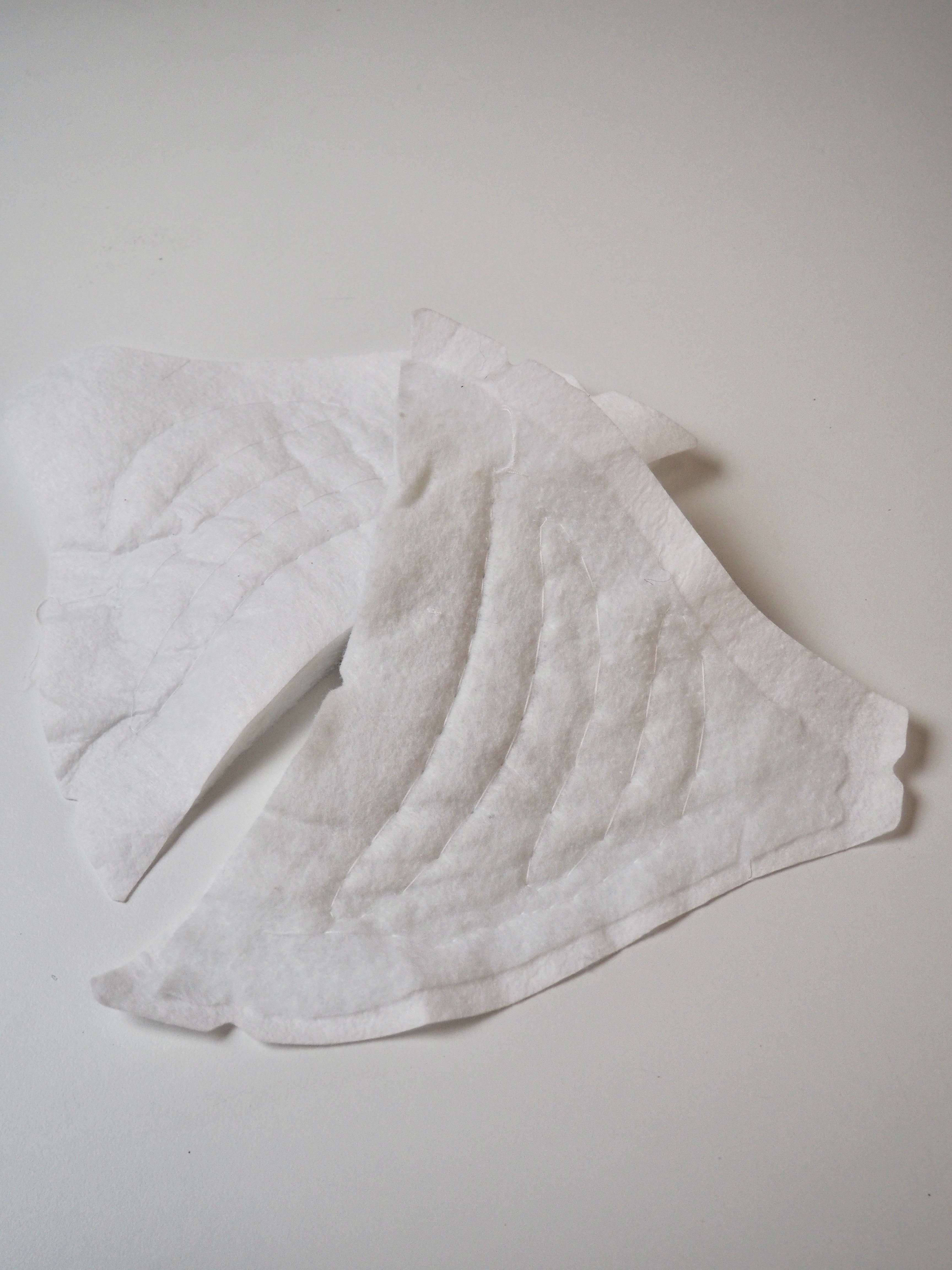 This ex-designer trim is a pair of shoulder pads. They are a great thickness, made up of a two layers of felt around several layers of wadding in the centre. The layers have been basted together to easily take out the padding, to accommodate the thickness you would like. They are a large elongated triangular shape which could also be adjusted for the desired fit and effect.