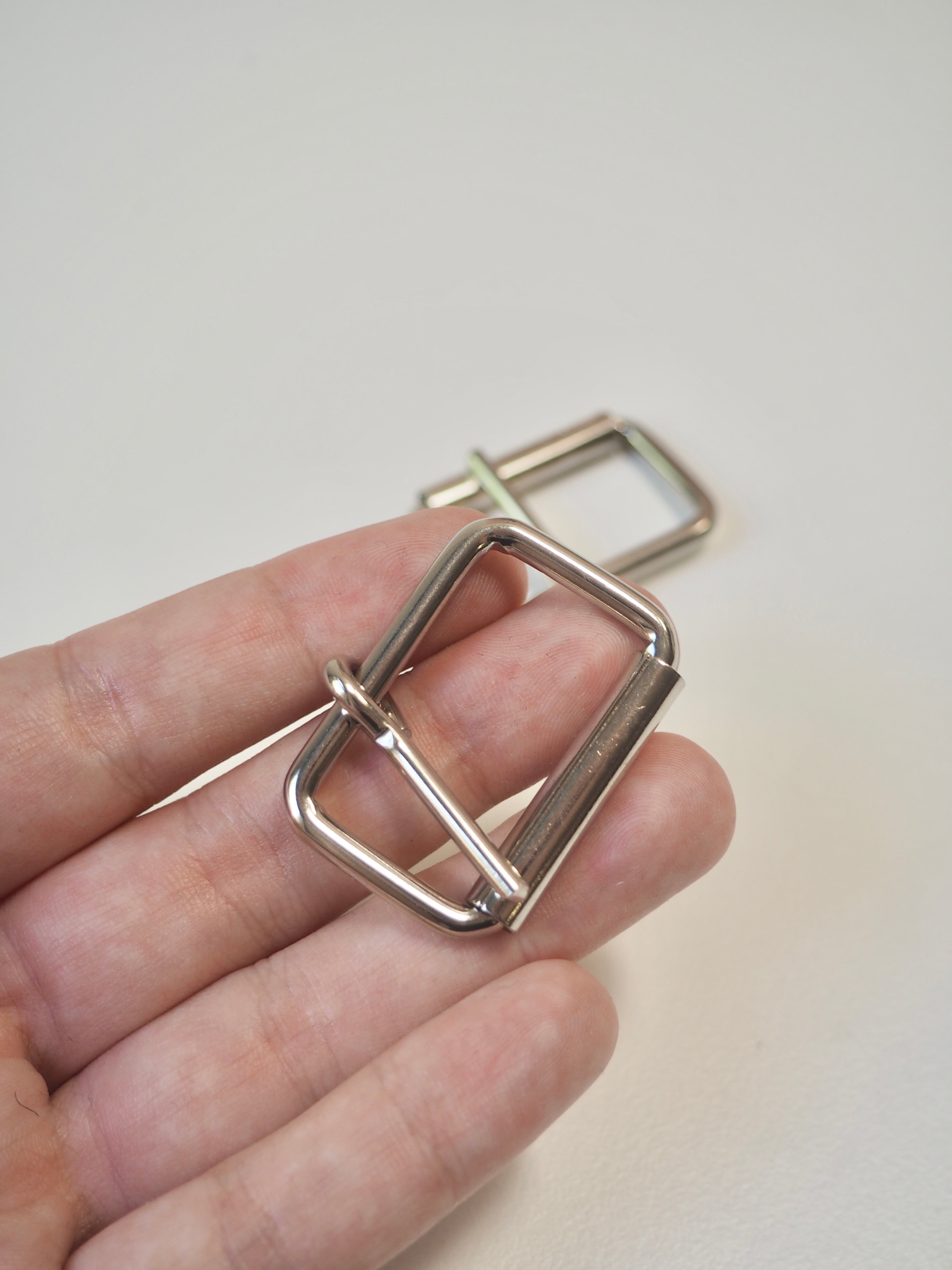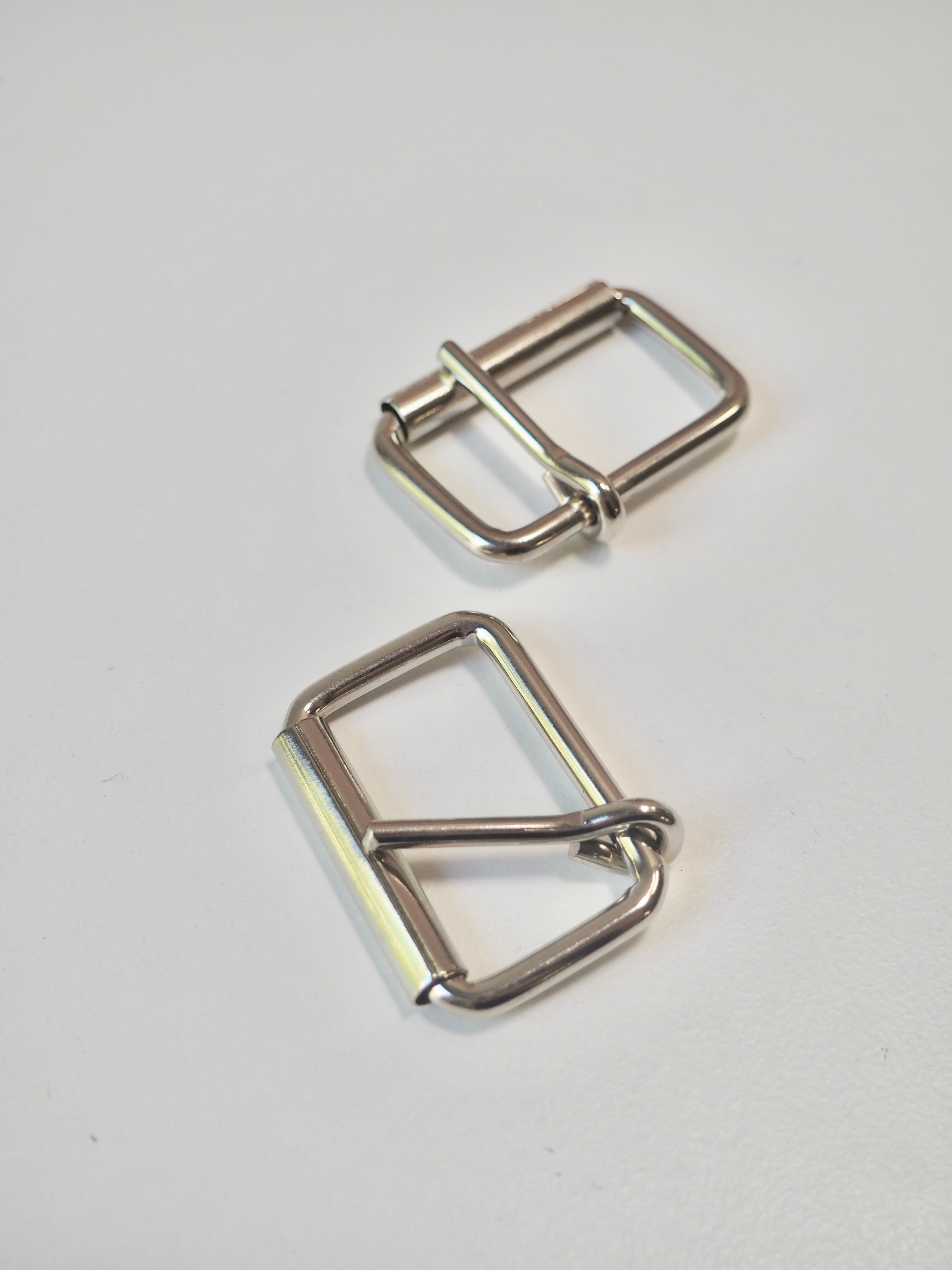 This ex-designer hardware is a buckle. These silver buckles are perfect for adding to garments or accessories. They are medium weight and have a shiny finish, with a roller.