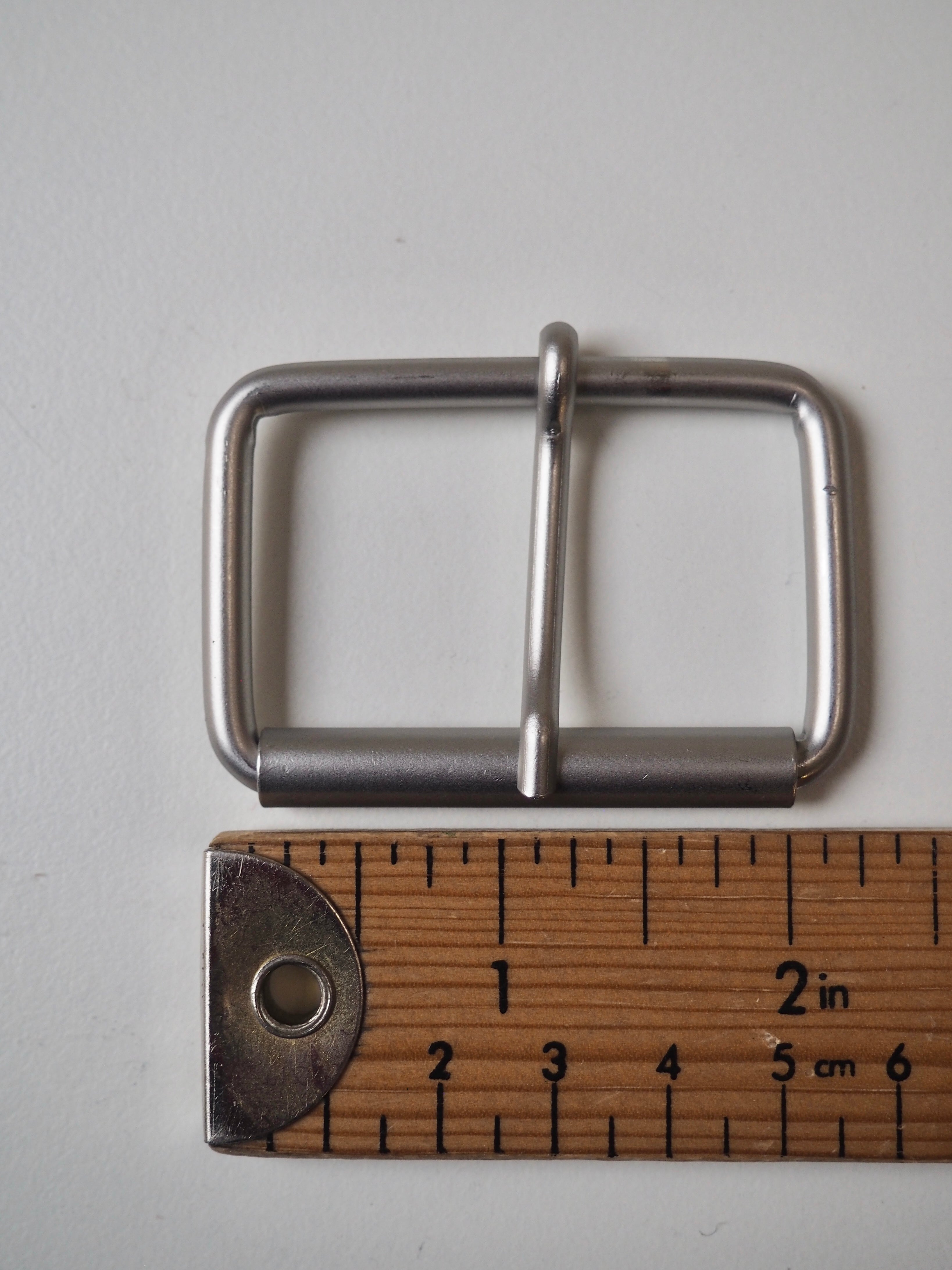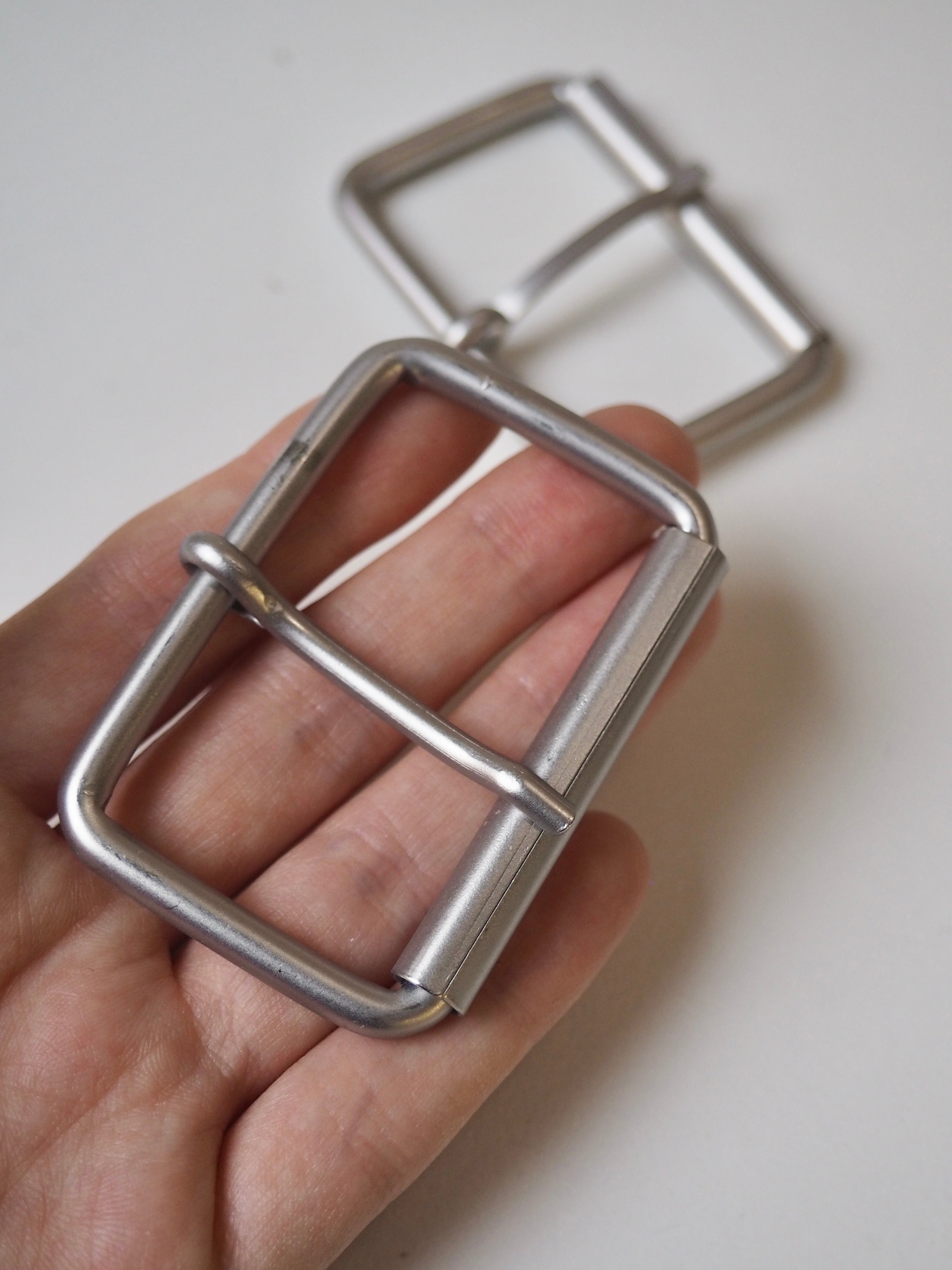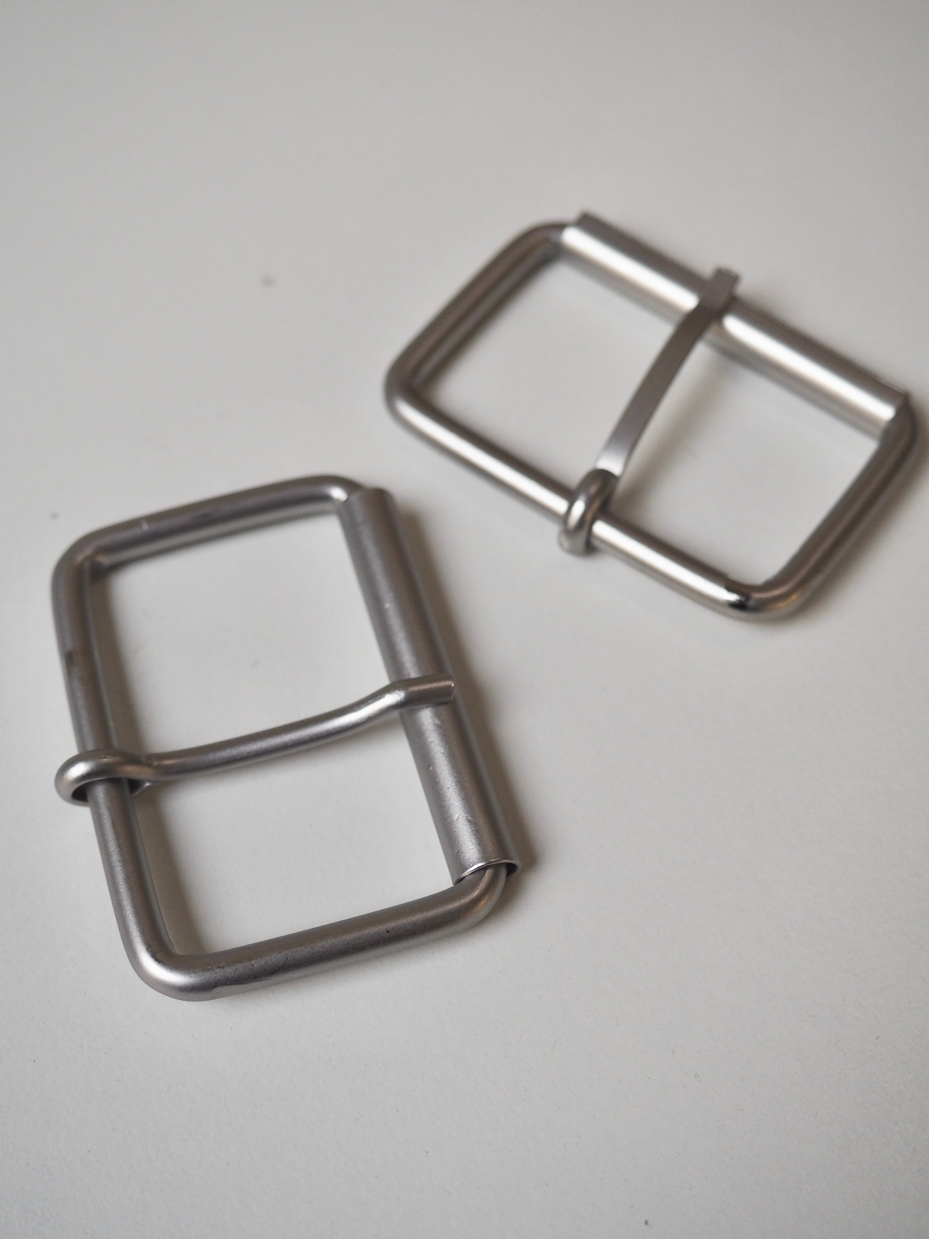 This ex-designer hardware is a buckle. These silver buckles are perfect for adding to garments or accessories. They have a matte finish, with a roller and a sliding arm.