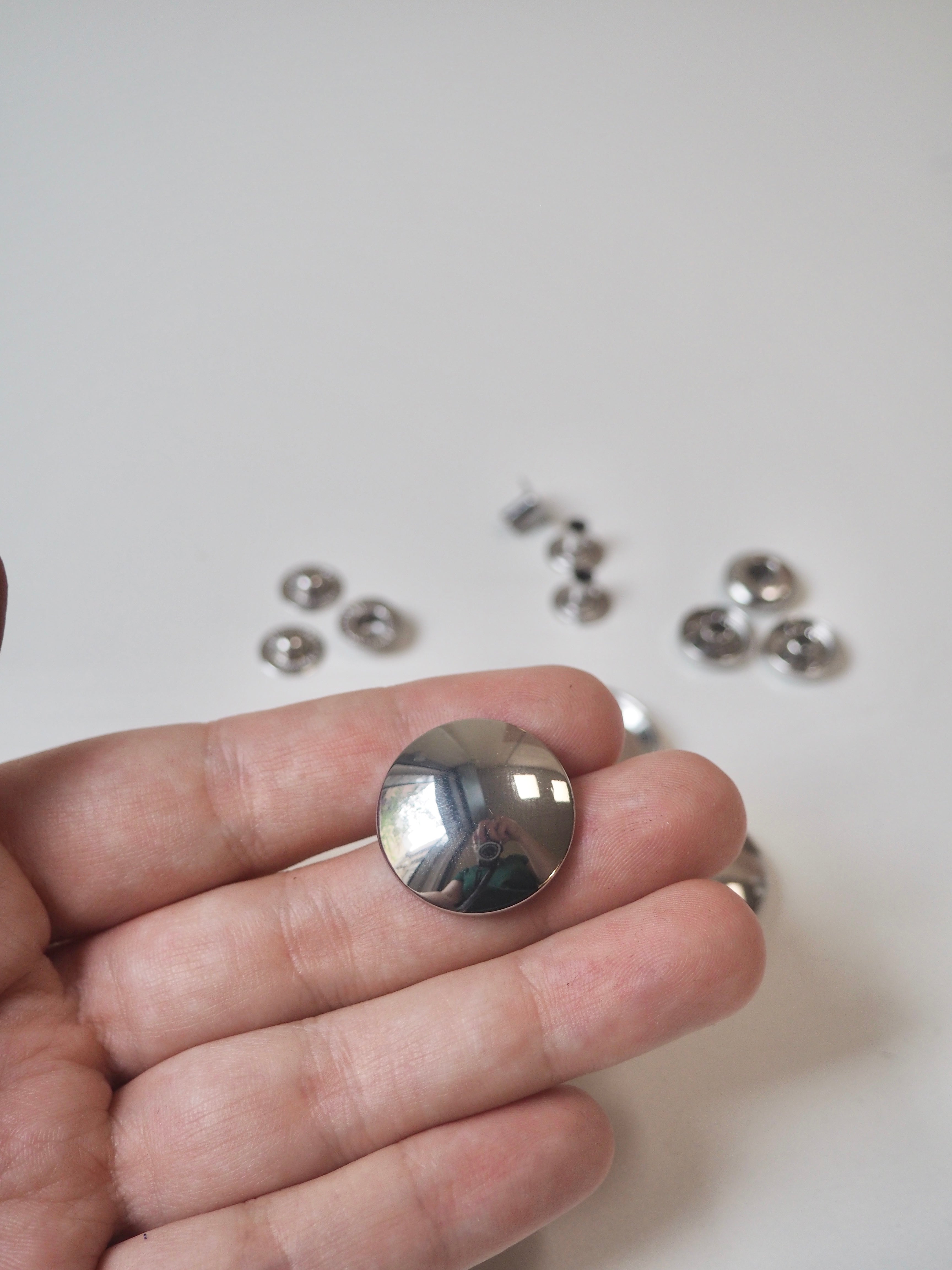 This ex-designer hardware is a press stud set. These press studs, also known as poppers or snaps, are all silver components, with a shiny top piece. They require a die set/machine for the right size. Ideal for coats and jackets but could also be used in bag making!