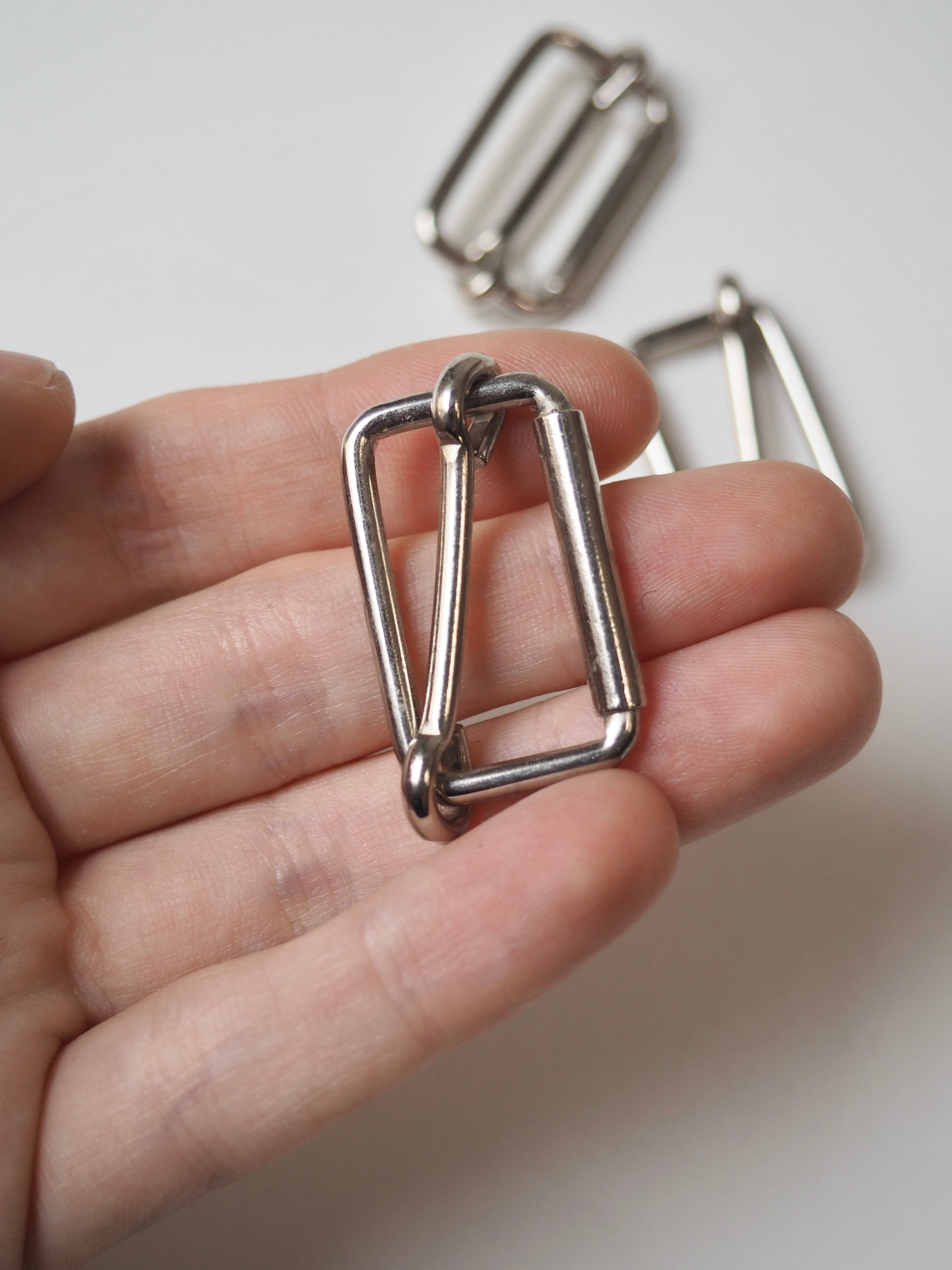 This ex-designer hardware is a slider. It has a sliding central bar for adjustments. They could be used for coats, dresses, jumpsuits, or accessories - they're great for adding an extra detail to your me-mades.