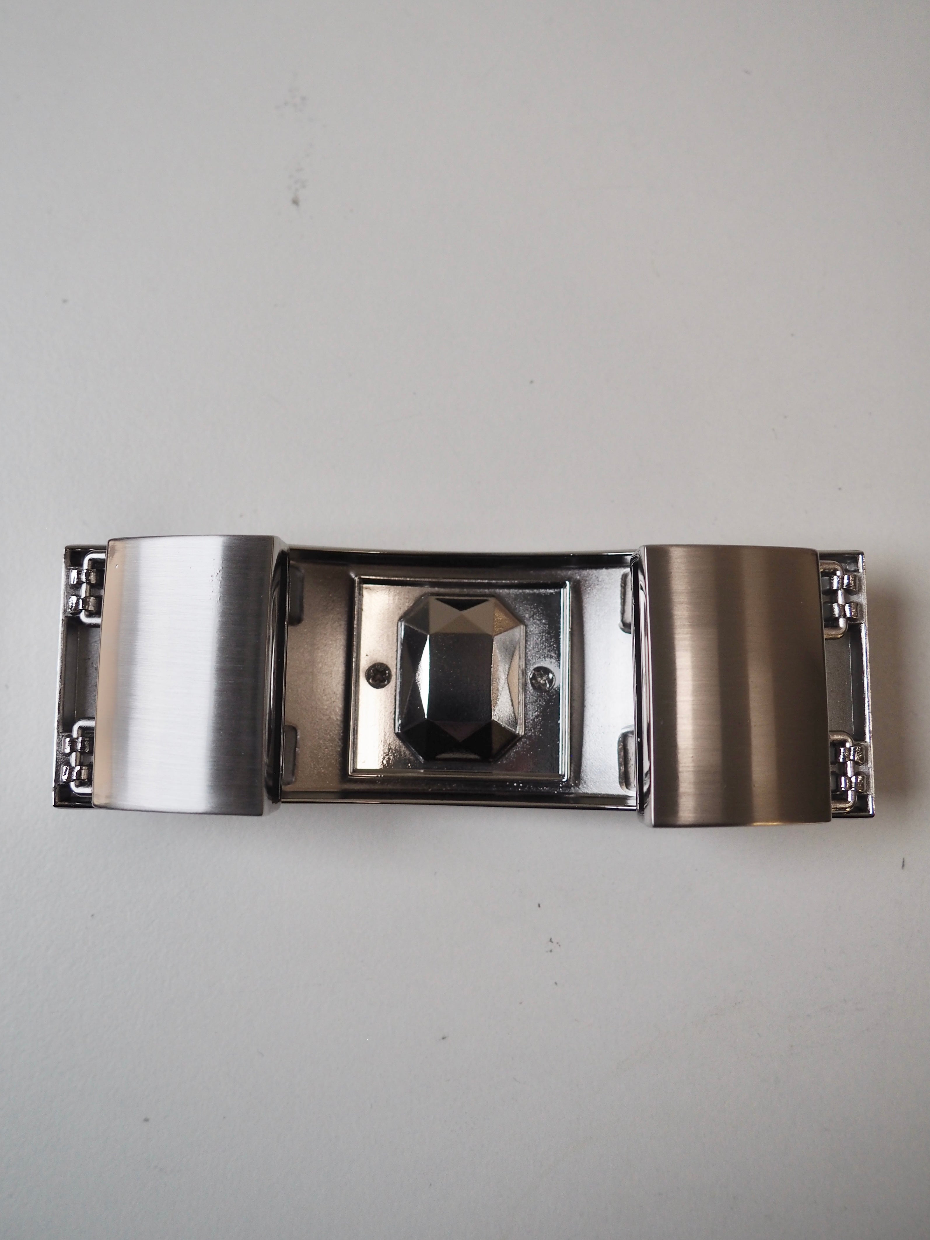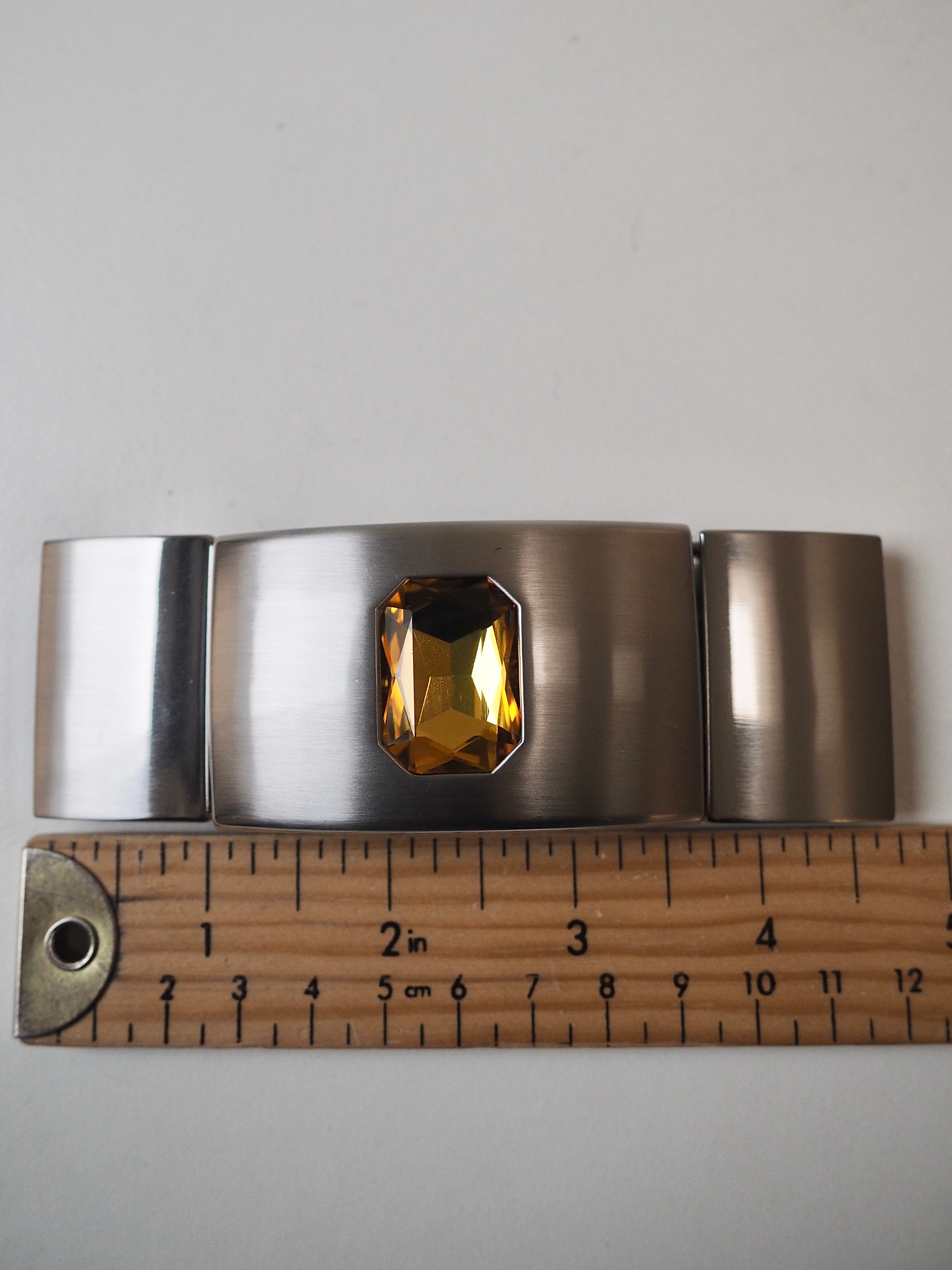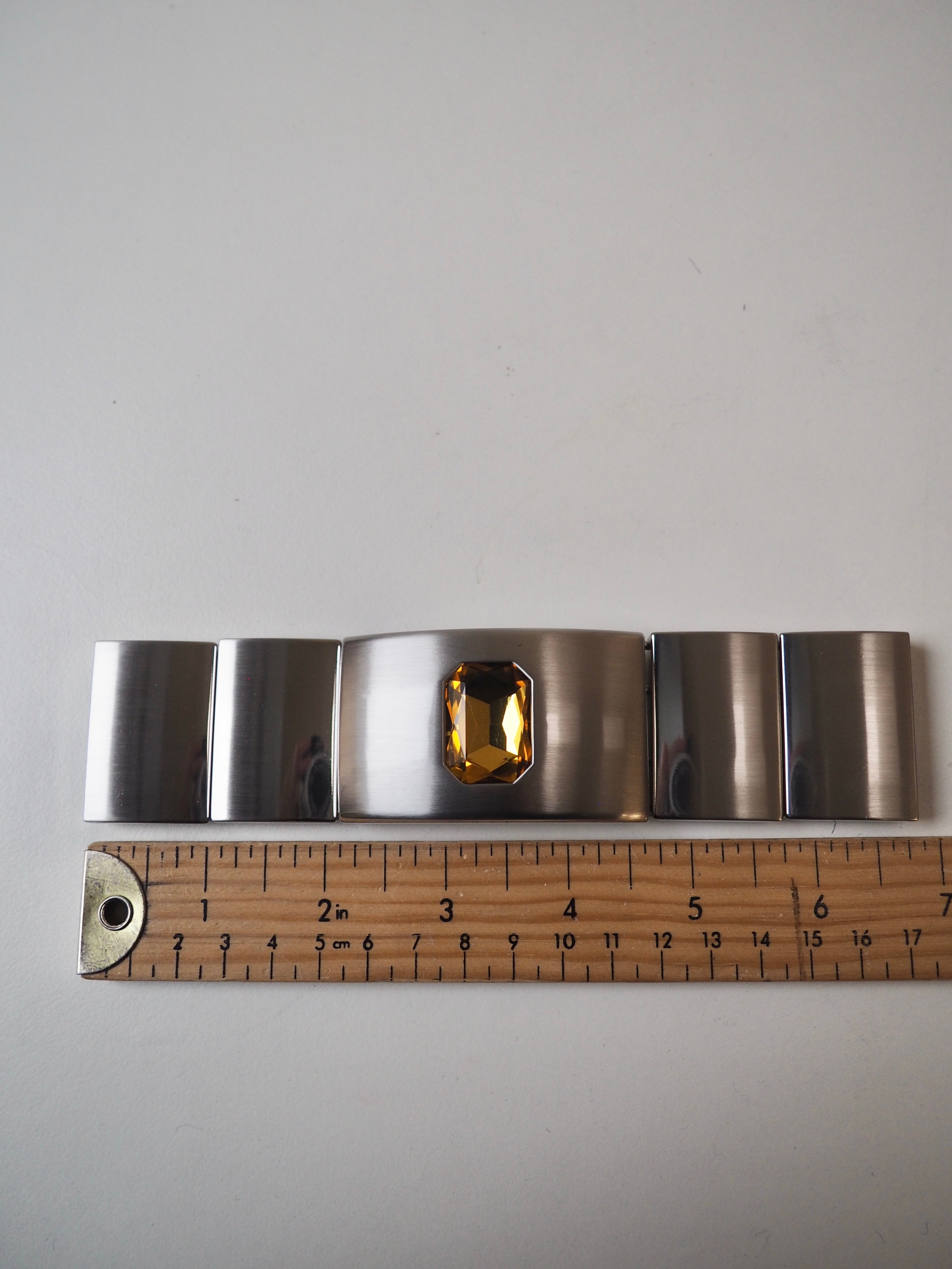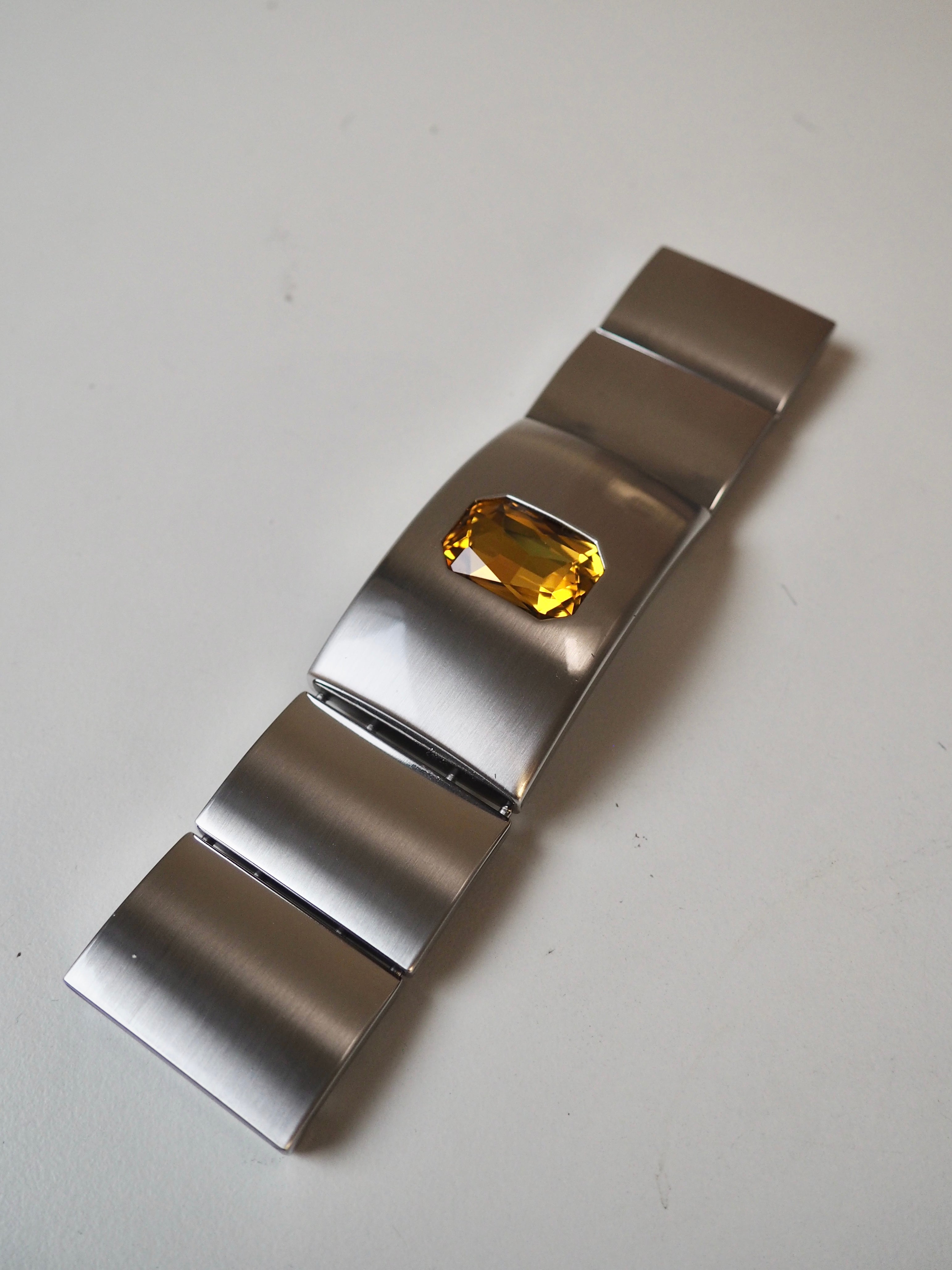 This ex-designer hardware is a decorative buckle made of 5 rectangle pieces. It's metal and silver with a yellow crystal embedded in the central panel. It has two channel openings at either end where a 35mm strap can be threaded through, these two end rectangles snap closed and the other two also are on hinges. It could be used as a decorative slider as an embellishment on accessories like bags and belts!