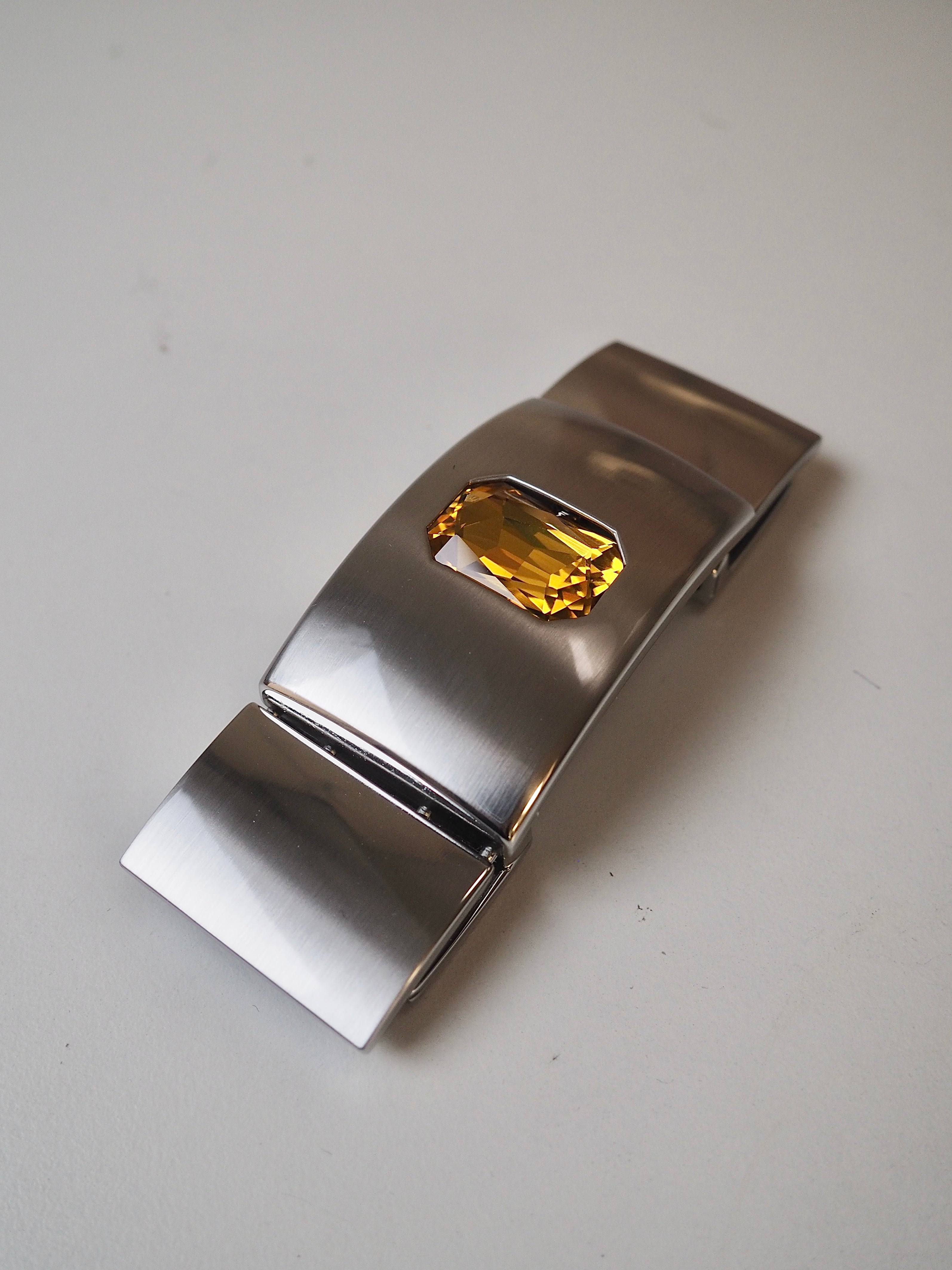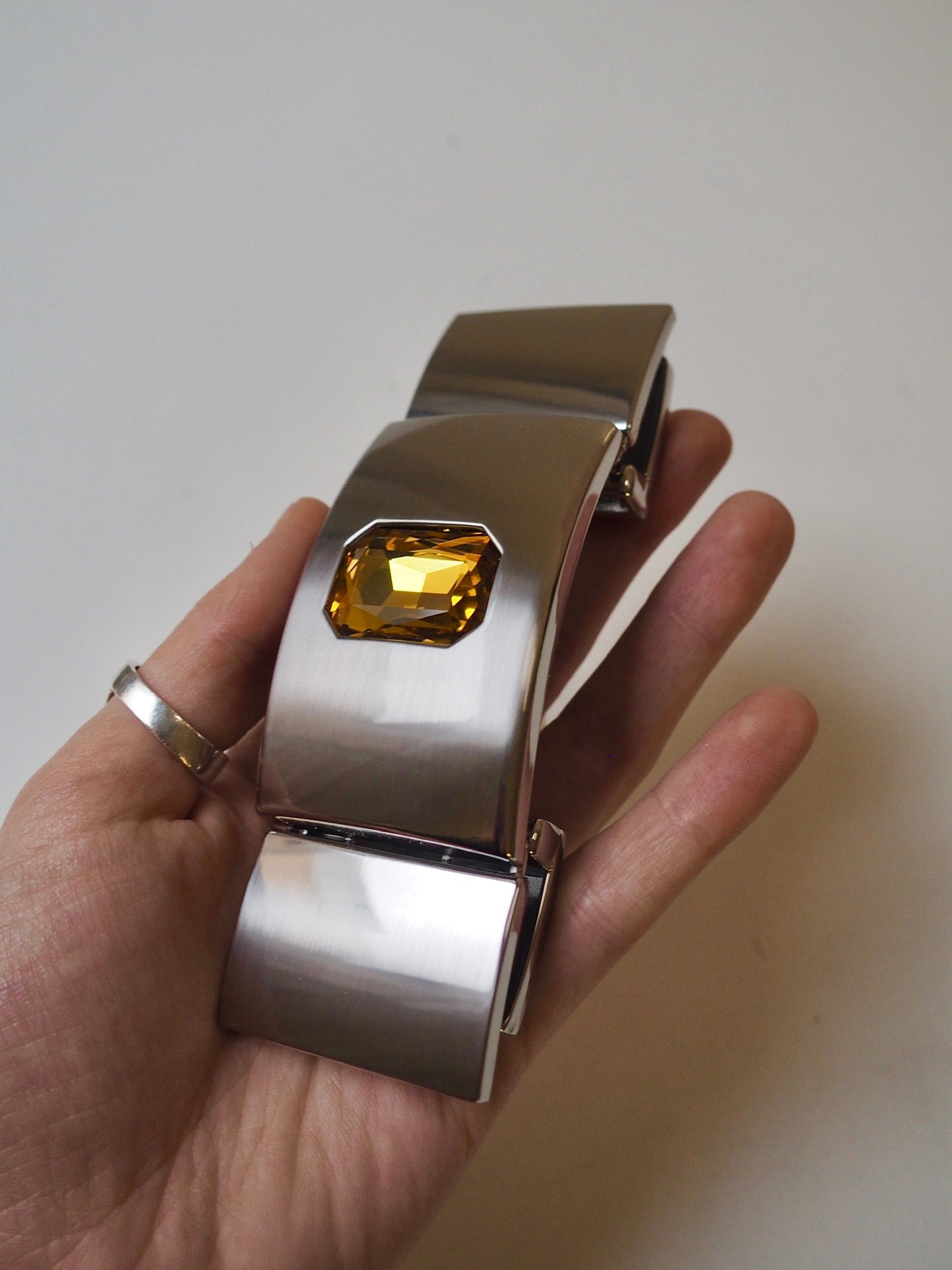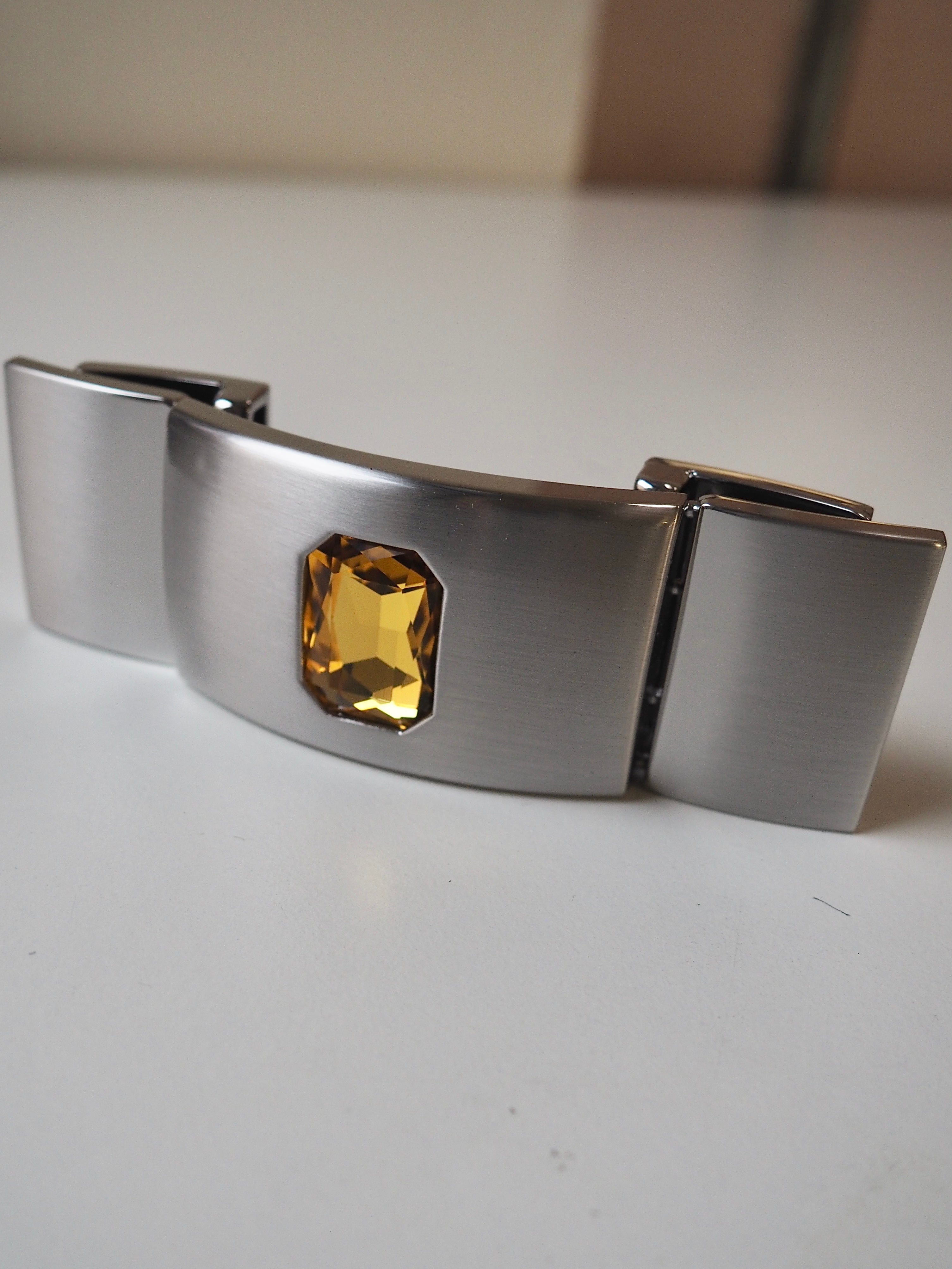 This ex-designer hardware is a decorative buckle made of 5 rectangle pieces. It's metal and silver with a yellow crystal embedded in the central panel. It has two channel openings at either end where a 35mm strap can be threaded through, these two end rectangles snap closed and the other two also are on hinges. It could be used as a decorative slider as an embellishment on accessories like bags and belts!