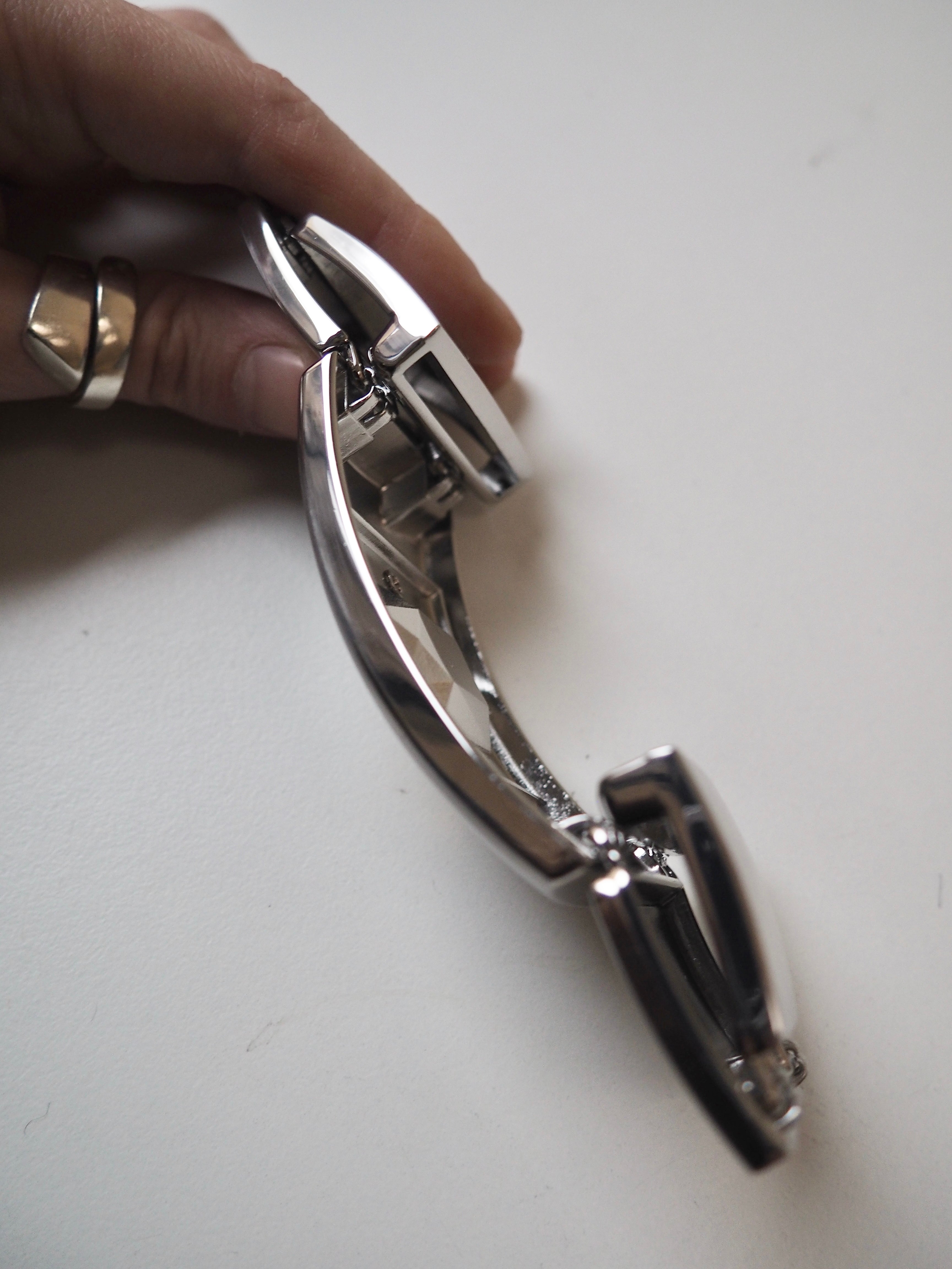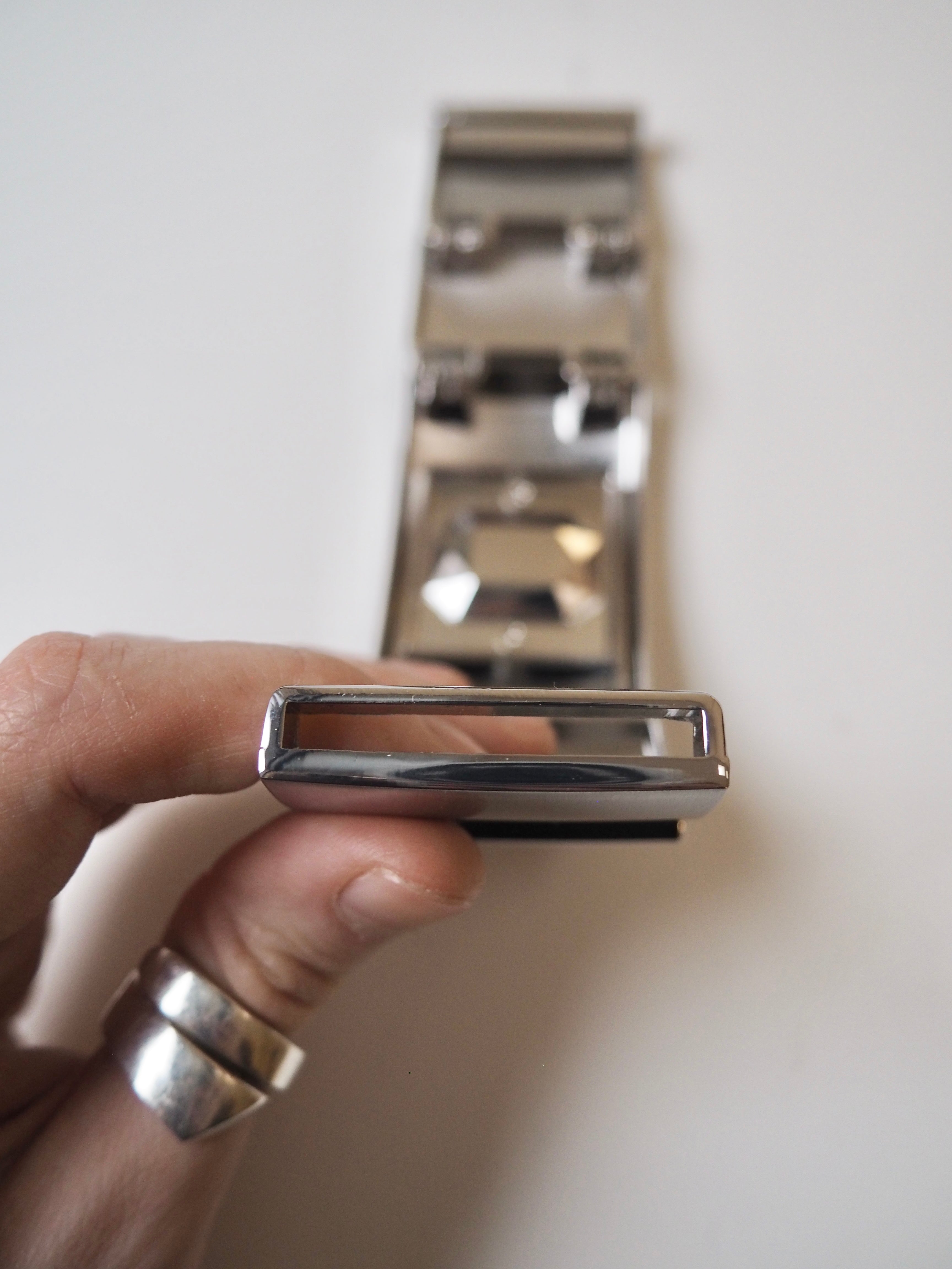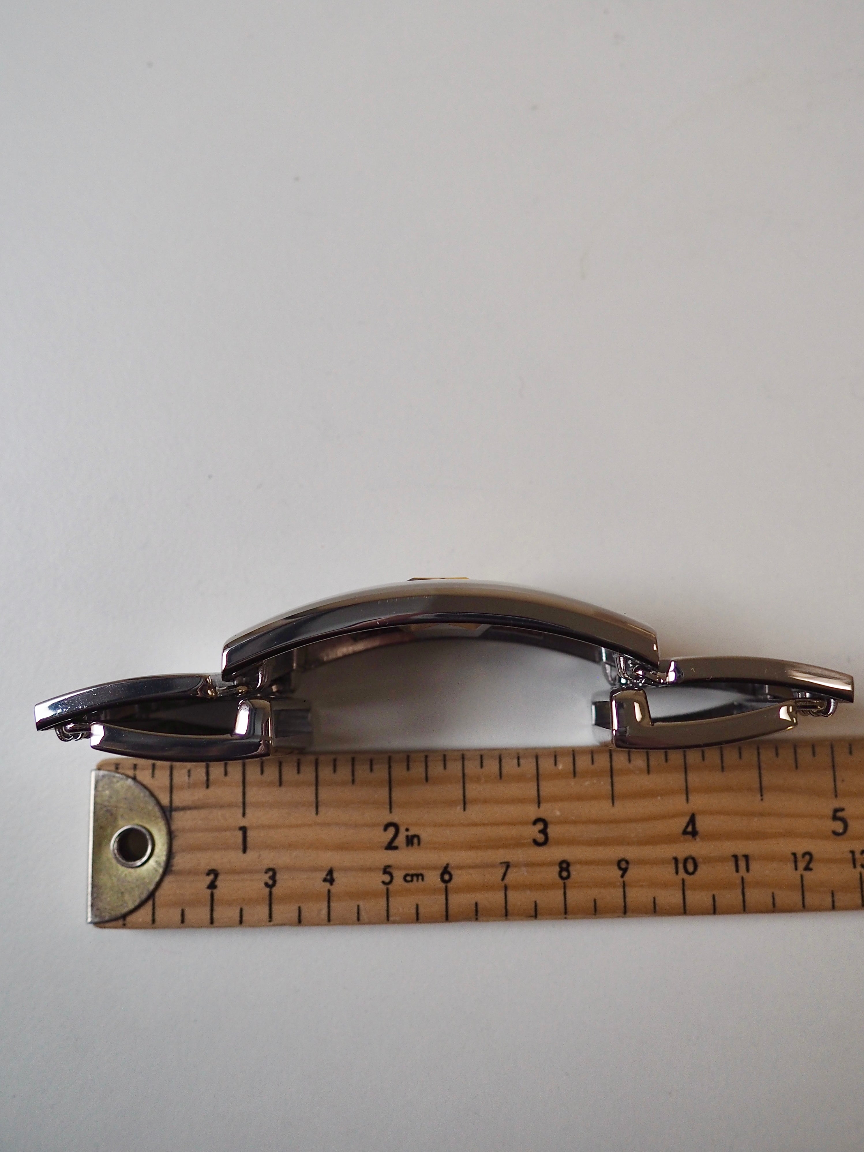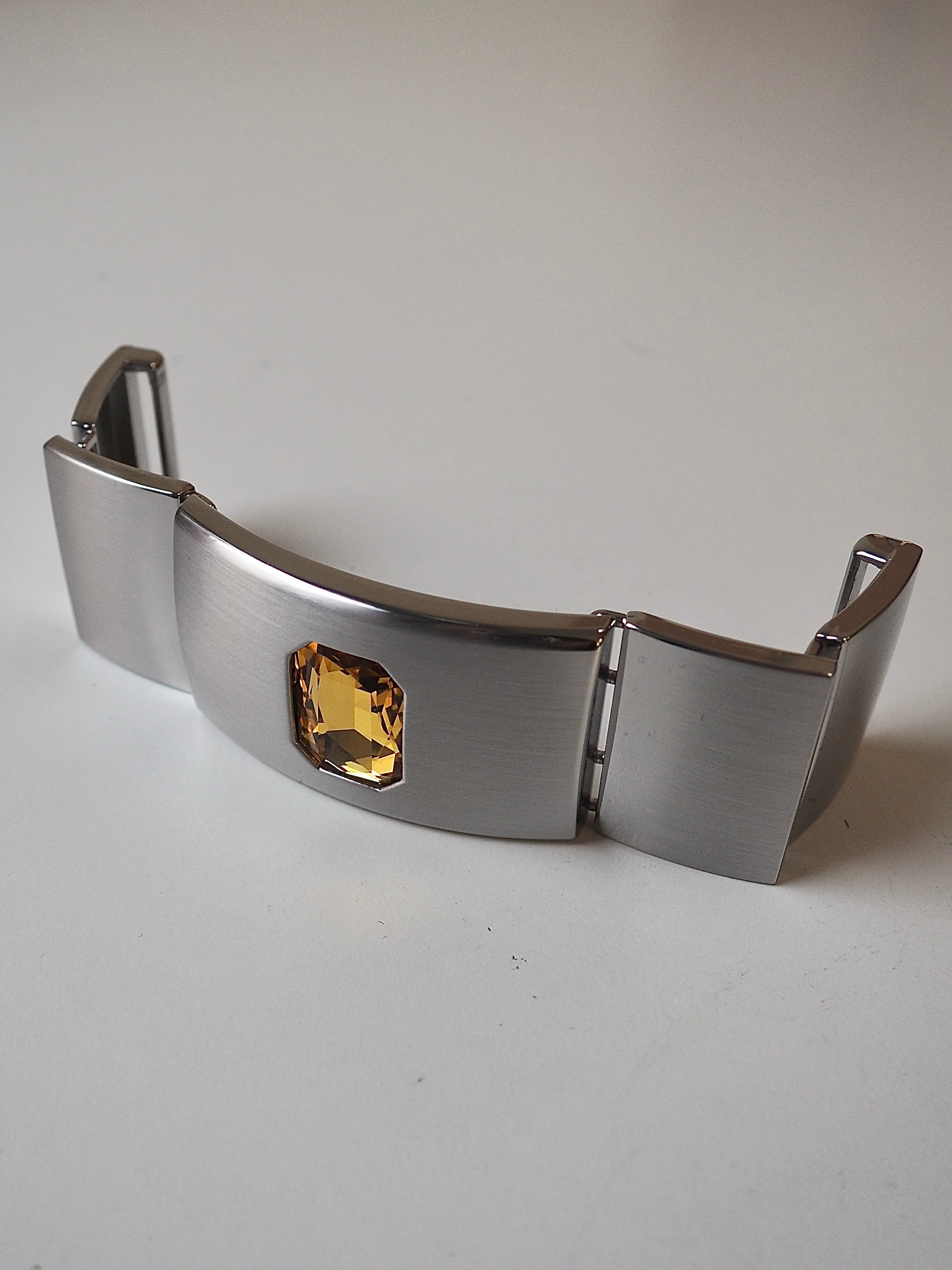 This ex-designer hardware is a decorative buckle made of 5 rectangle pieces. It's metal and silver with a yellow crystal embedded in the central panel. It has two channel openings at either end where a 35mm strap can be threaded through, these two end rectangles snap closed and the other two also are on hinges. It could be used as a decorative slider as an embellishment on accessories like bags and belts!