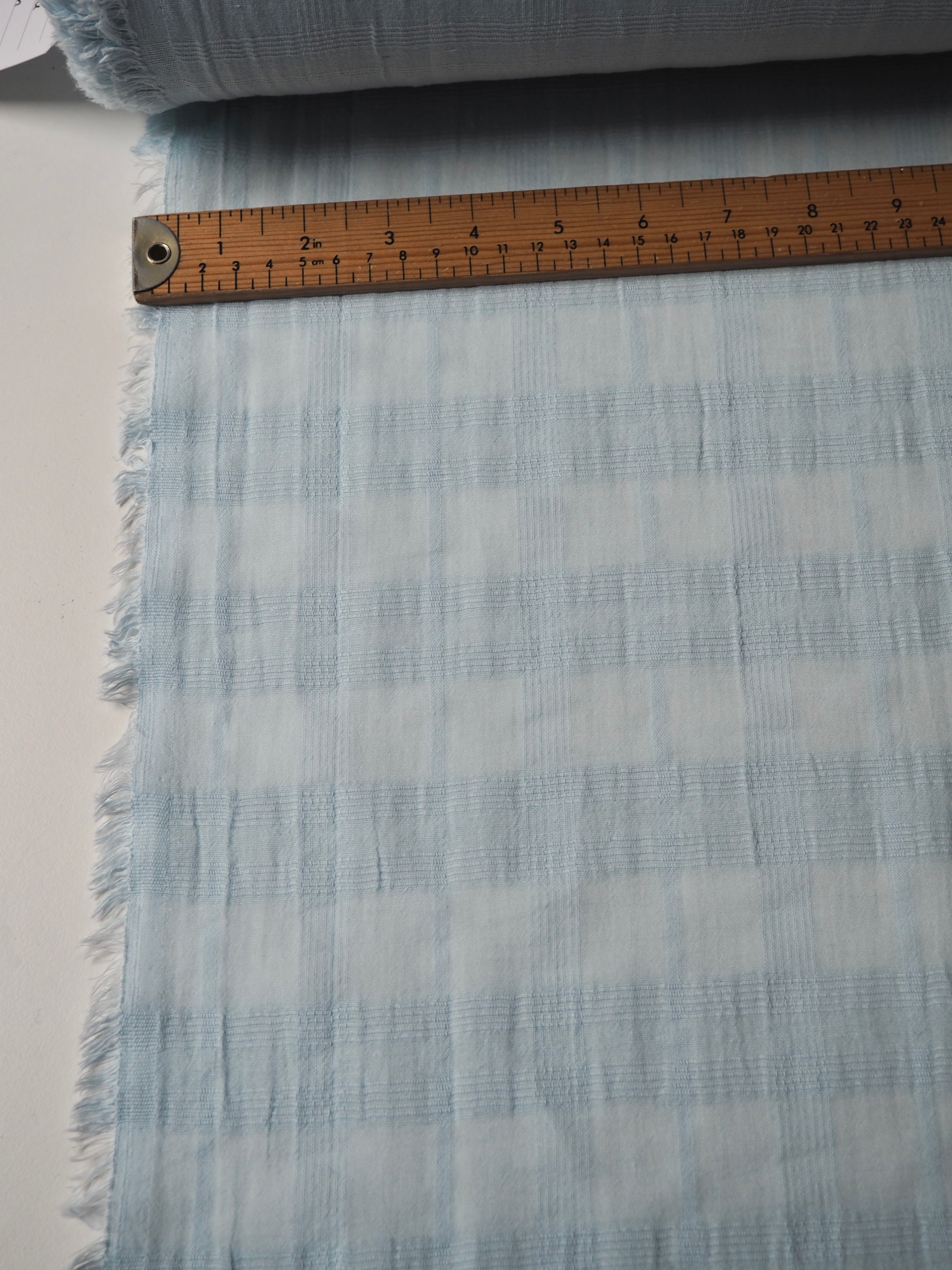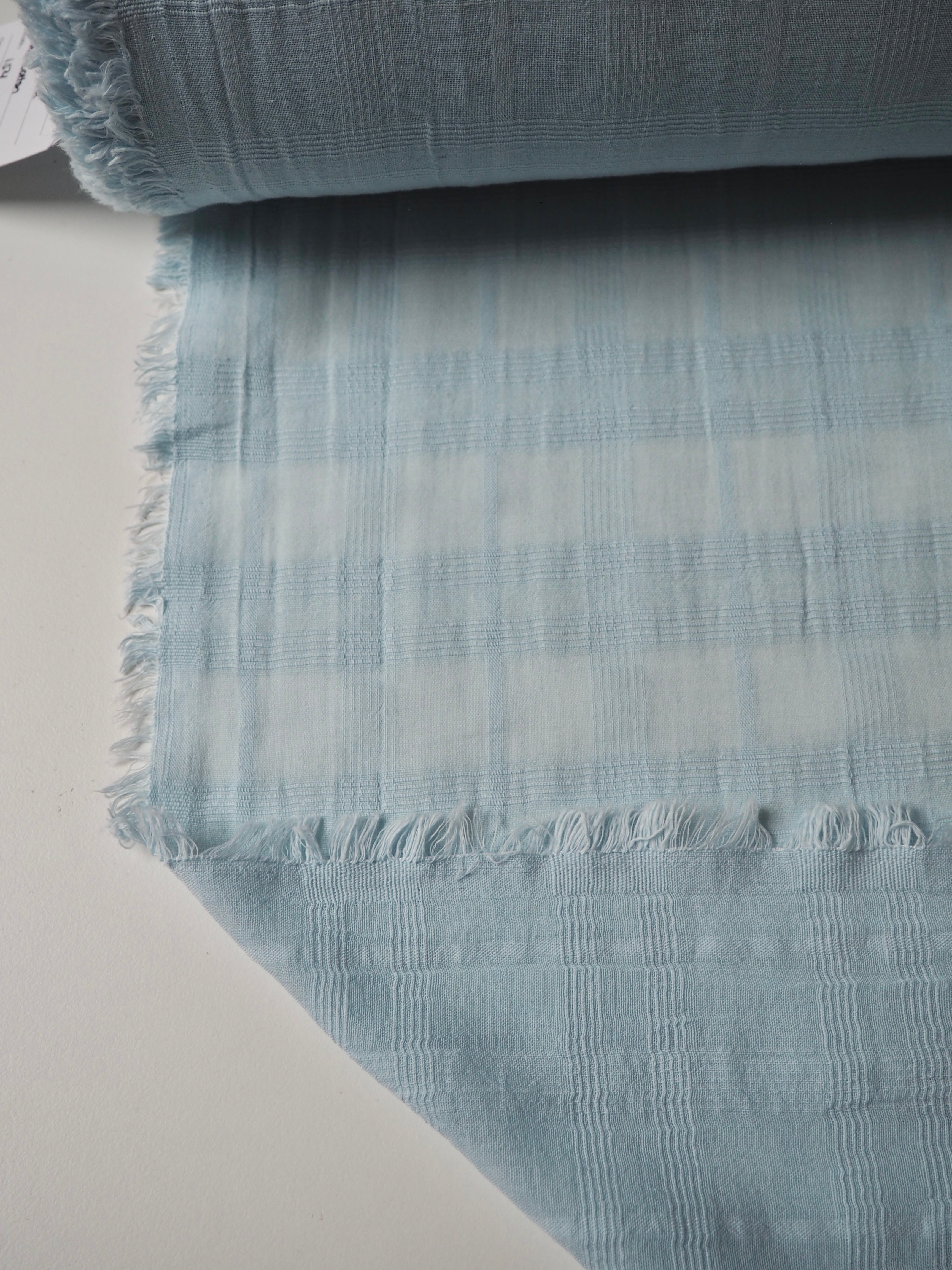 This ex-designer fabric is a cotton voile. It's a sky blue cotton voile, with a check jacquard weave. It's from a London-based brand called Beyond Nine. It has a super soft and gentle handle that's so wearable. It's a little heavier than a typical voile, but still very lightweight. Semi-sheer and drapes so beautifully! Very breathable and so soft! Lovely for our Everyday Dress/Top, or even some pyjamas! We can't wait to see what you make!