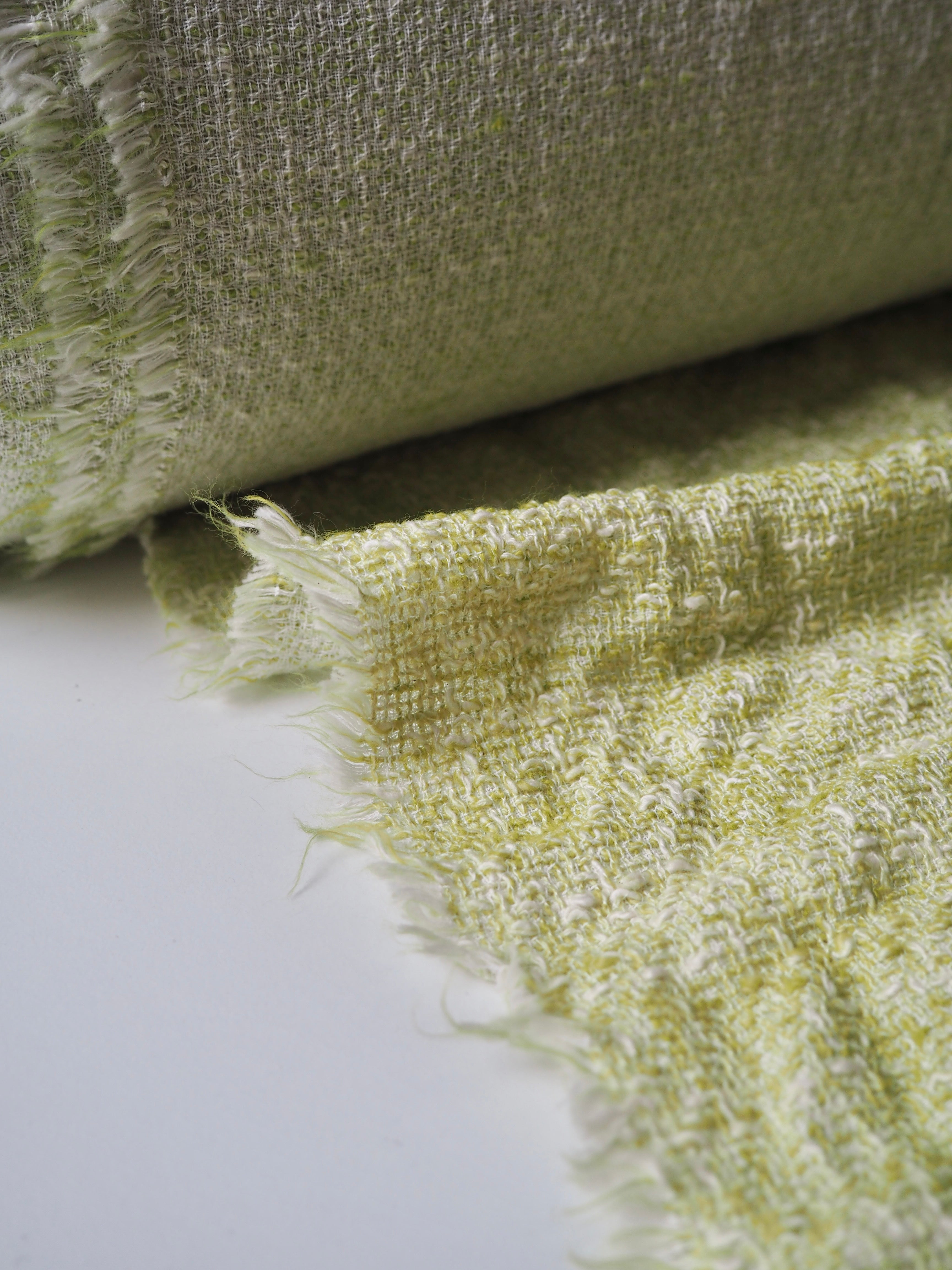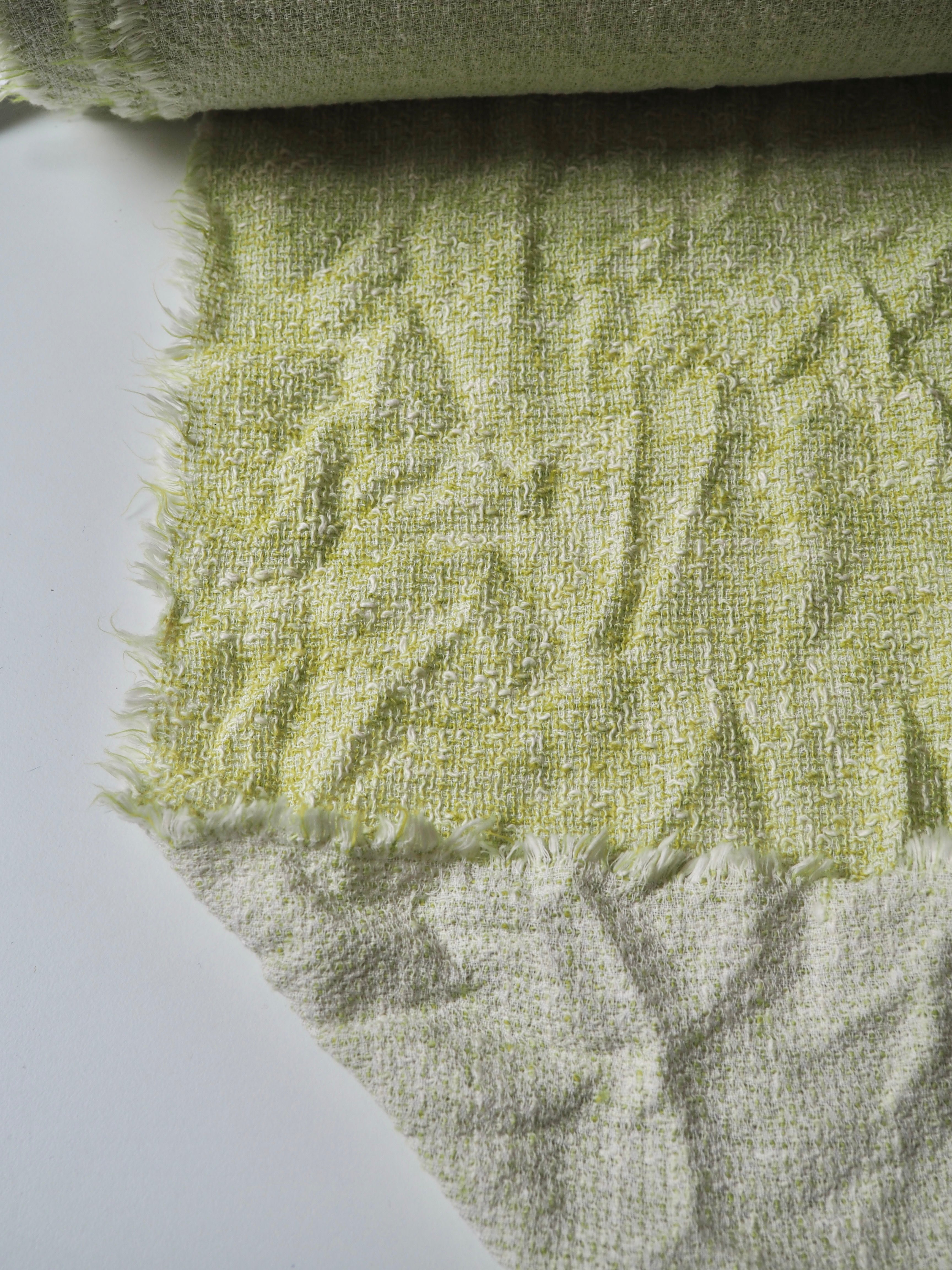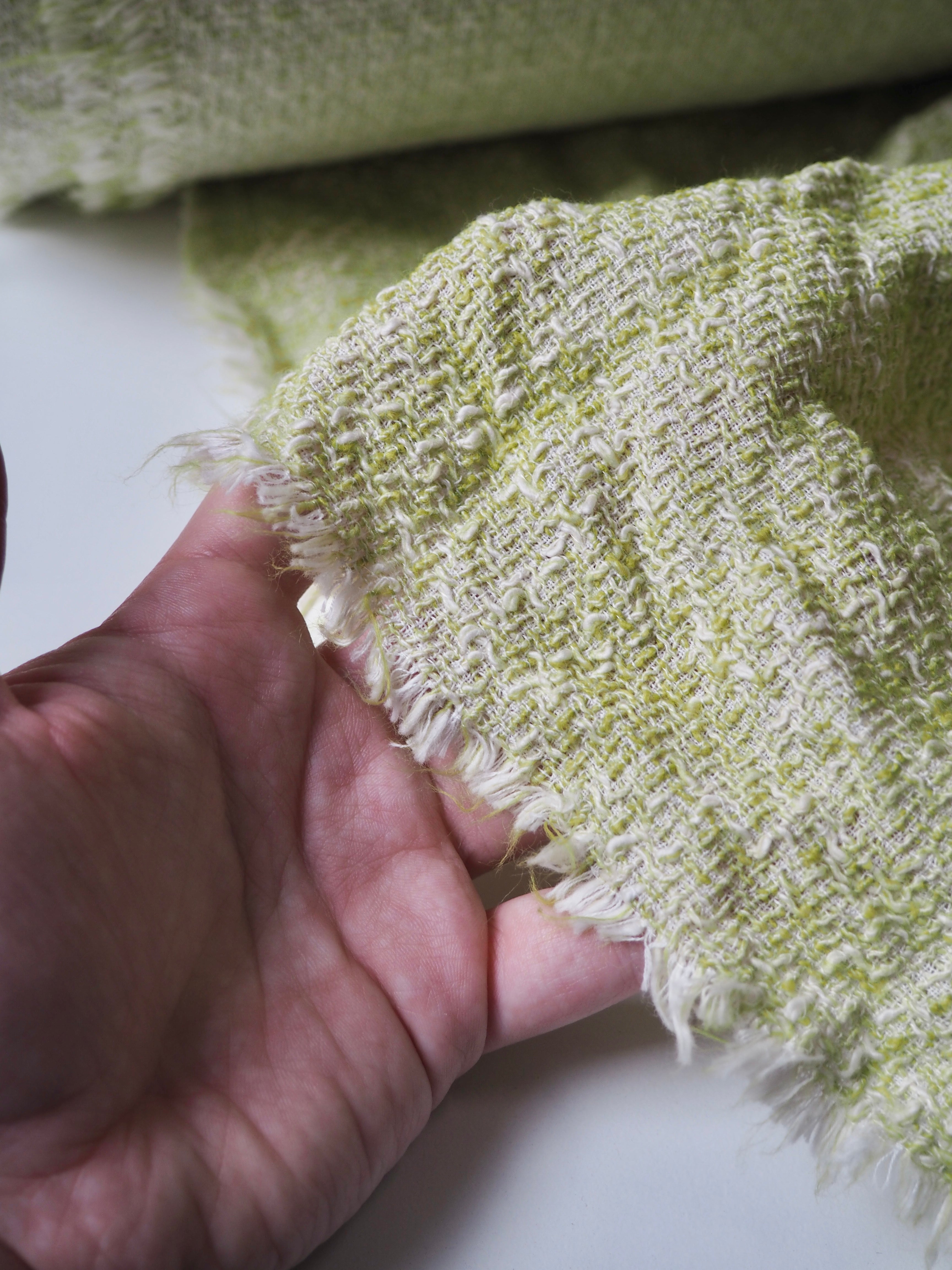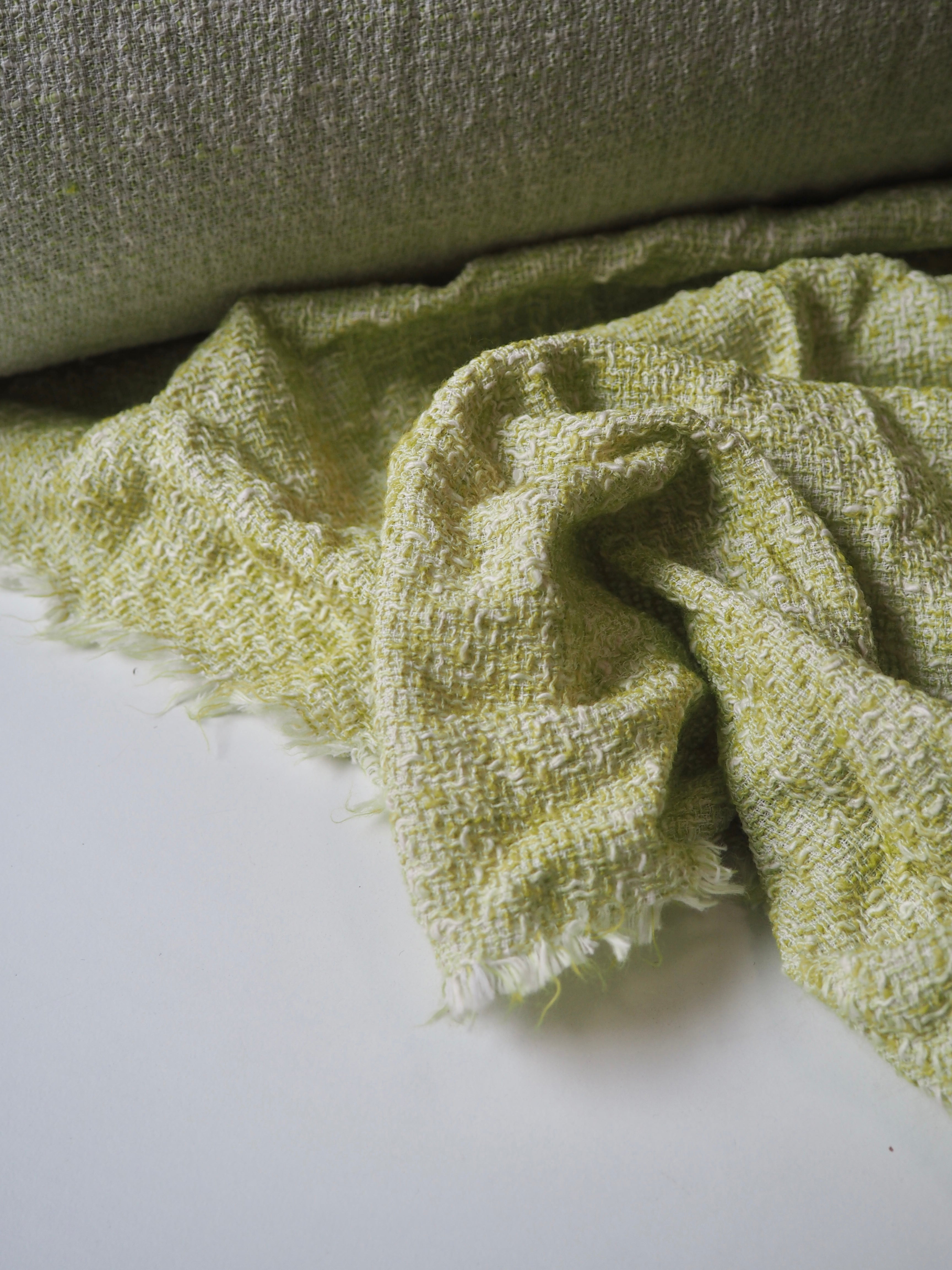 This ex-designer fabric is a tweed. It has a looser weave, with a lovely risen texture that's quite drapey and very soft! Opaque and lightweight, you could easily interface to give it some weight and structure! In a soft lime green and white marl colourway. The perfect cloth for a lightweight jacket, or oversized scarf!