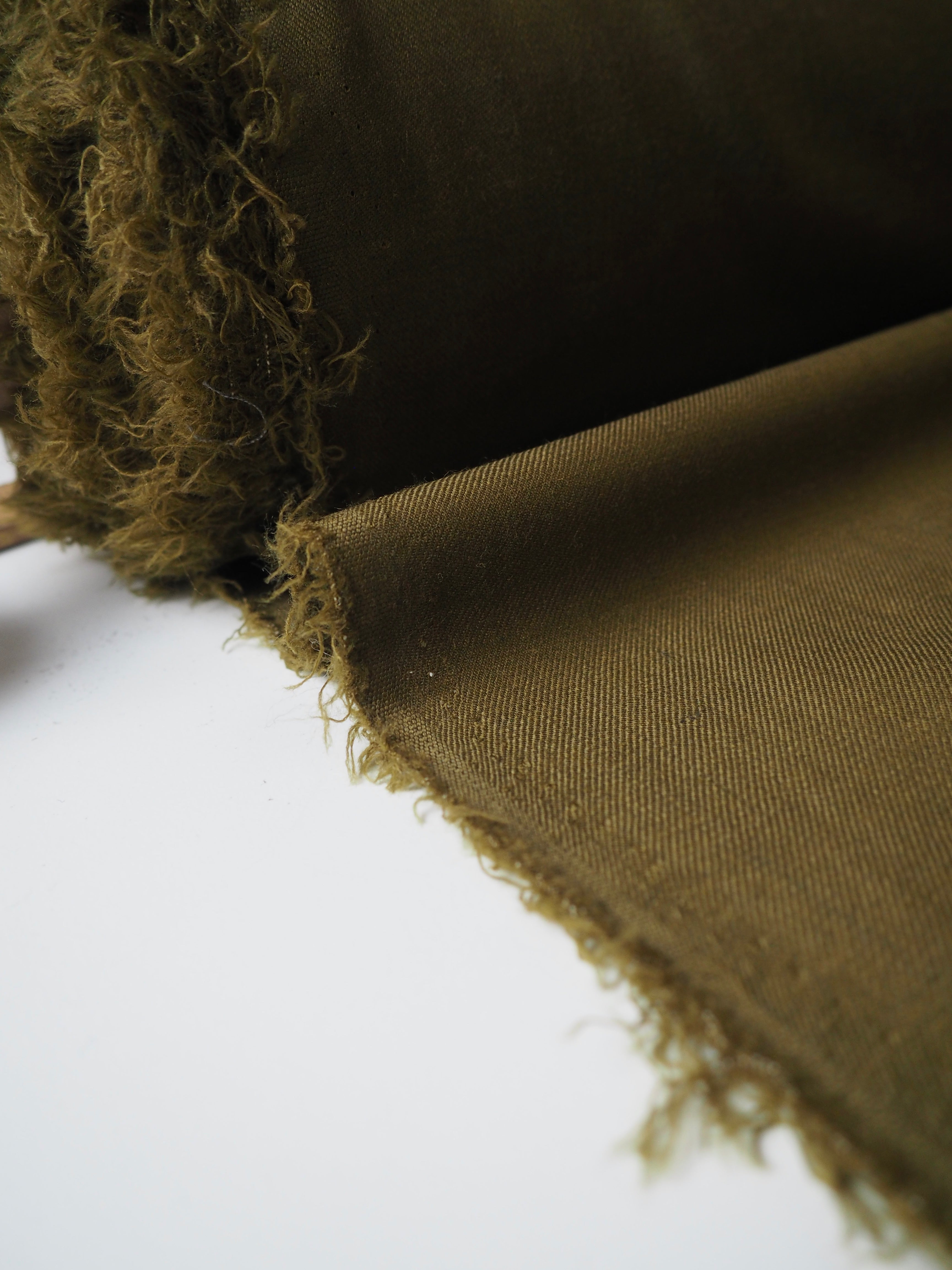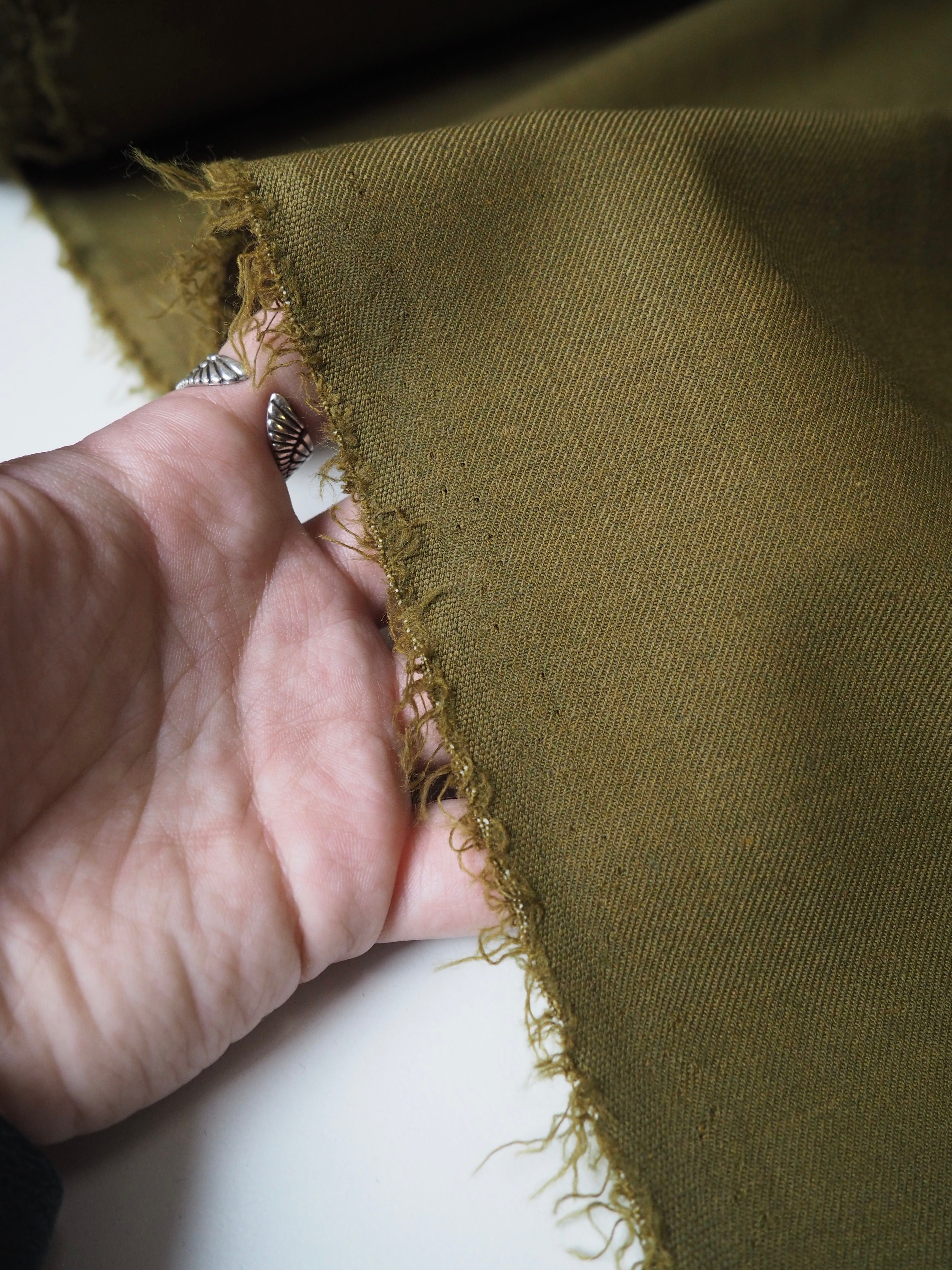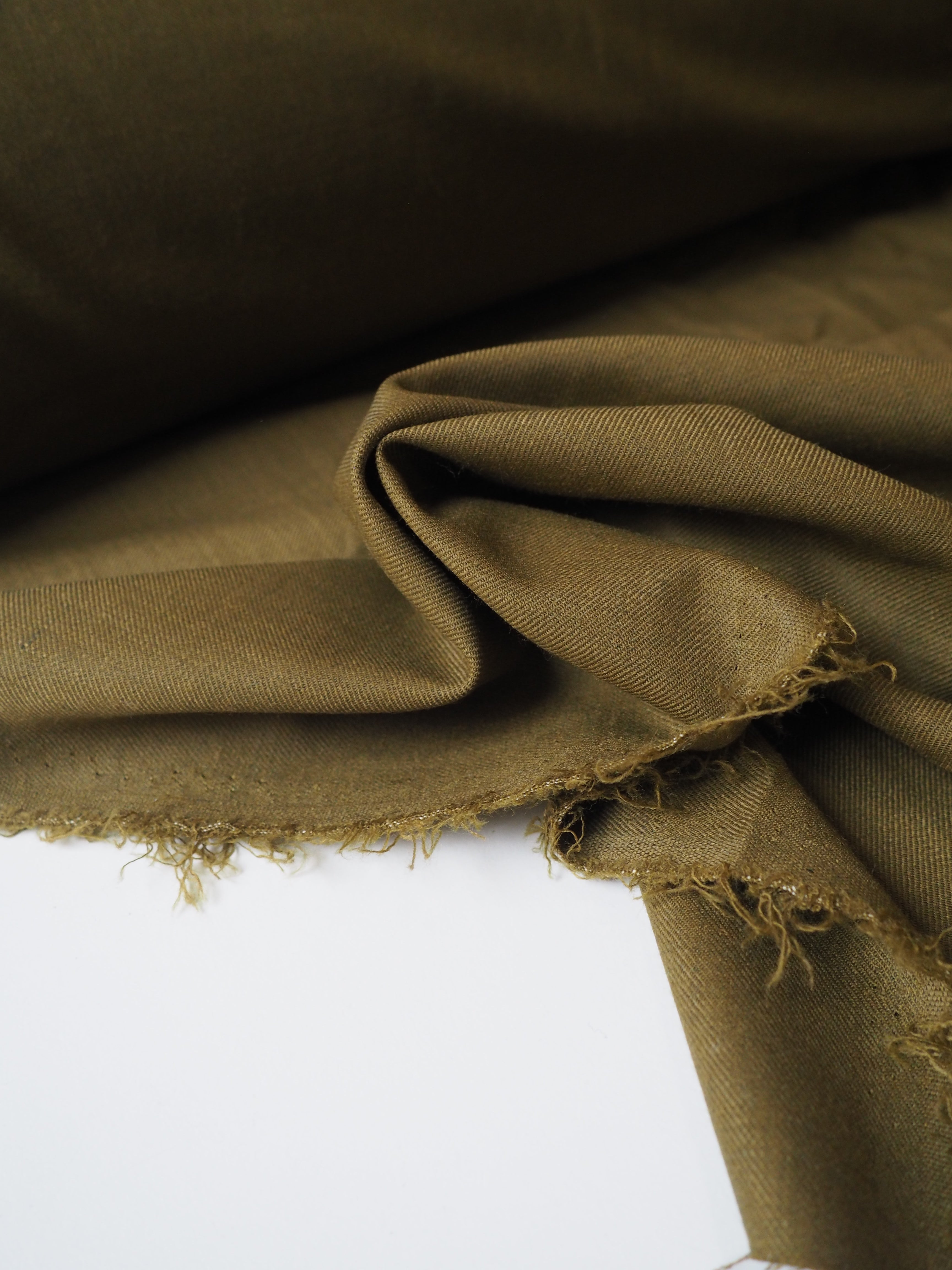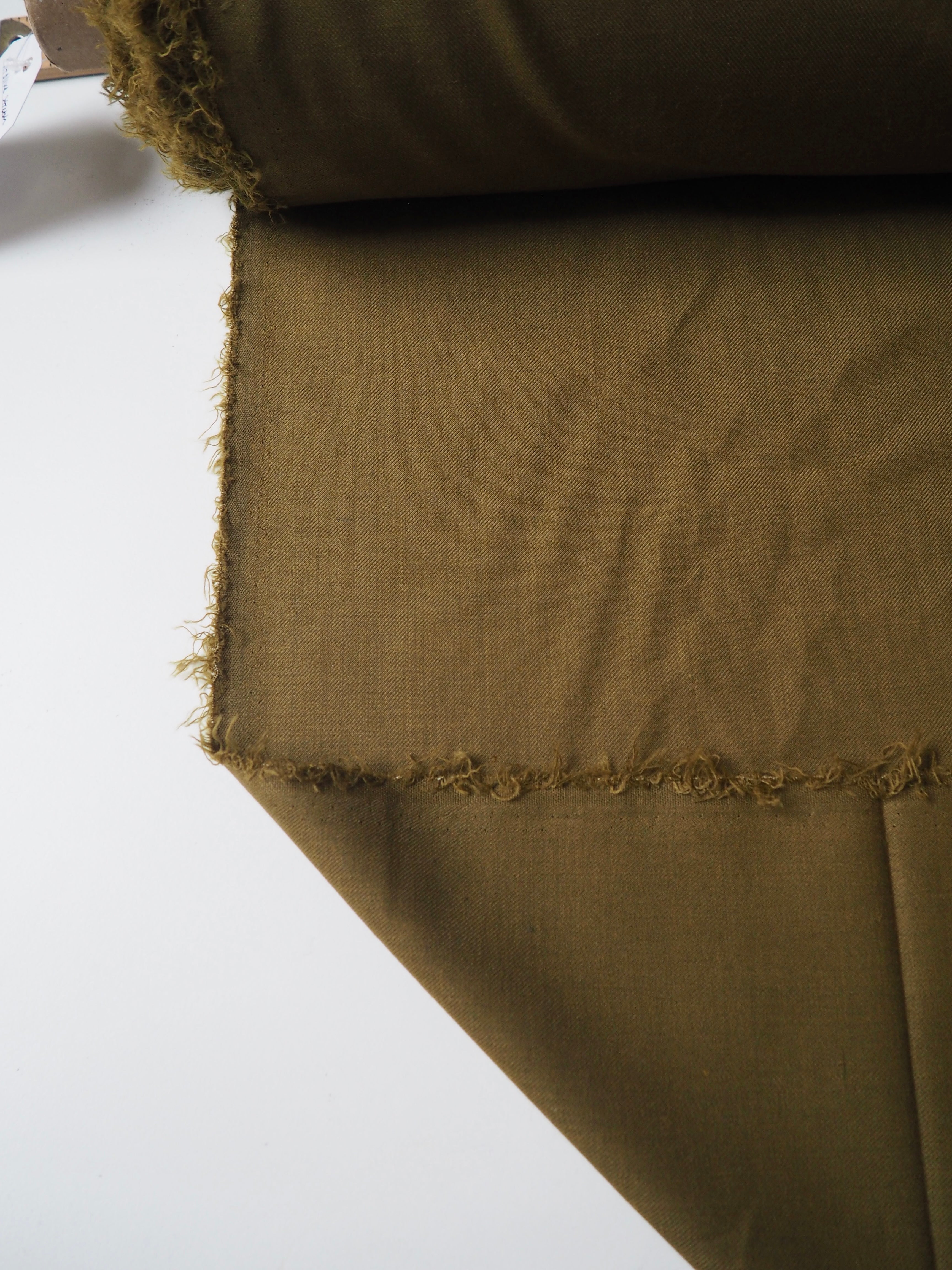 This ex-designer fabric is a wool twill. In a rich softer olive green colour with a lovely twill structure. Has about a 10-15% stretch. Lightweight with a soft woolly handle, beautiful drape, and a gentle sateen finish. Would be lovely in a suit jacket or trousers!
