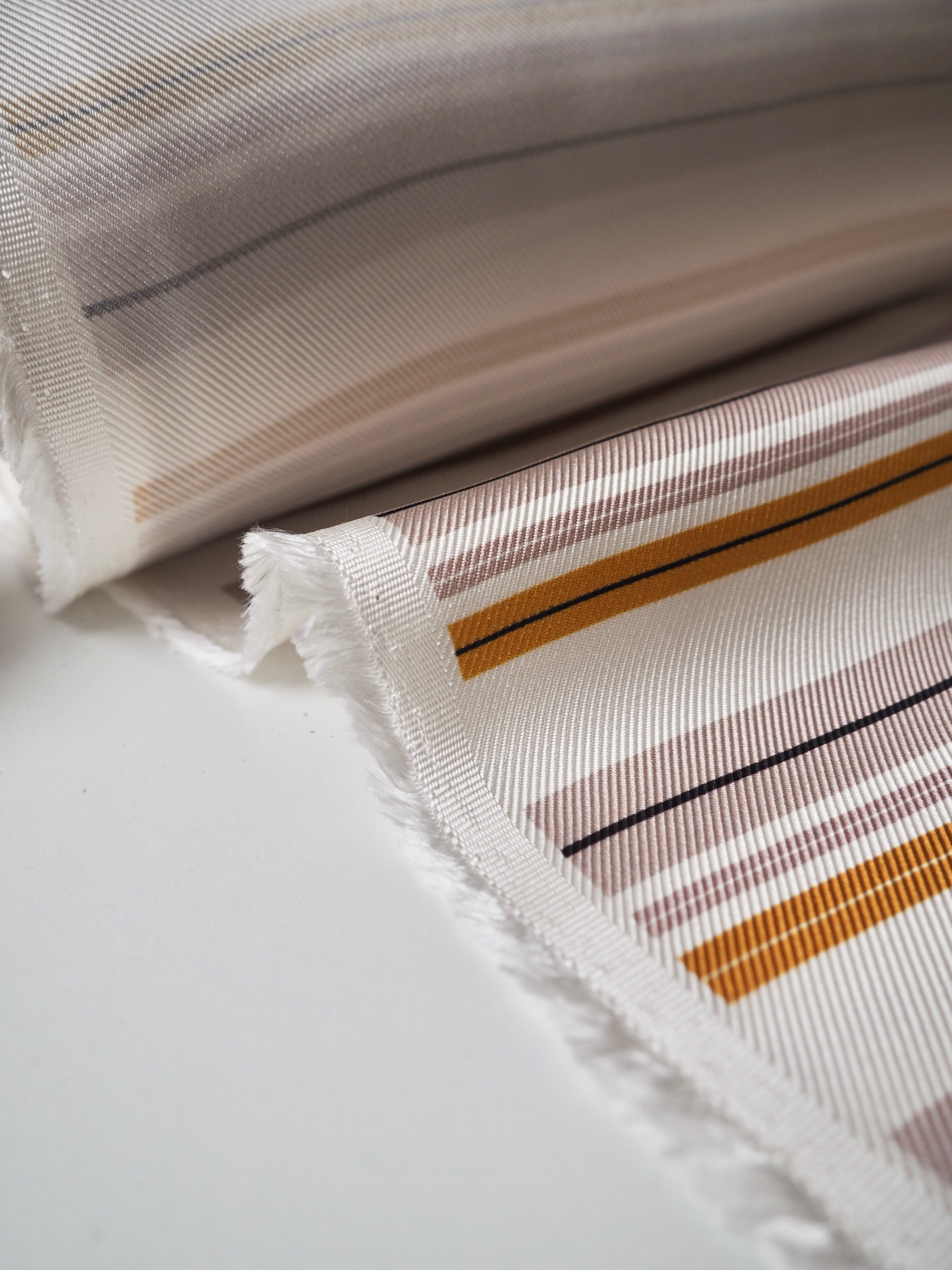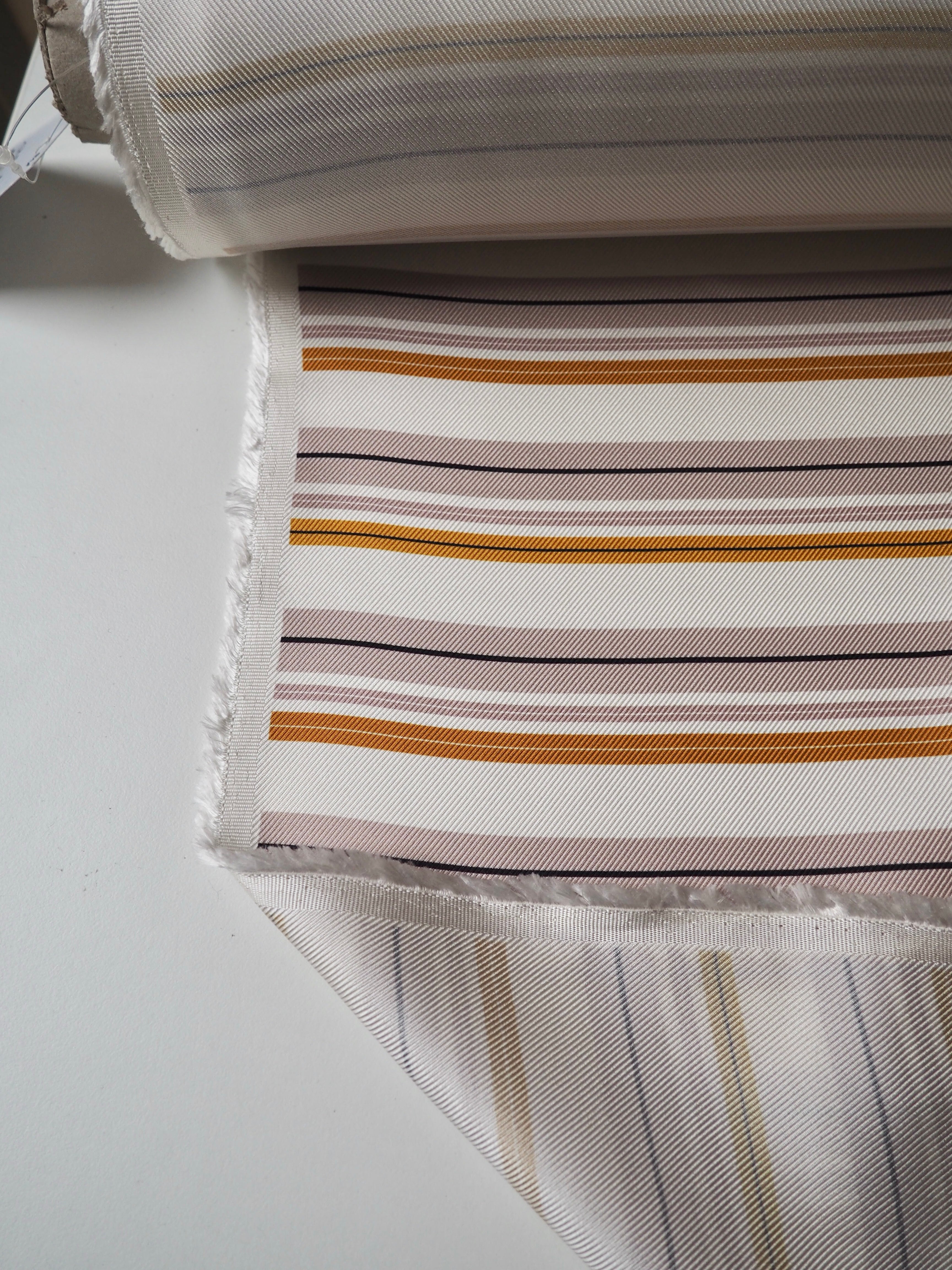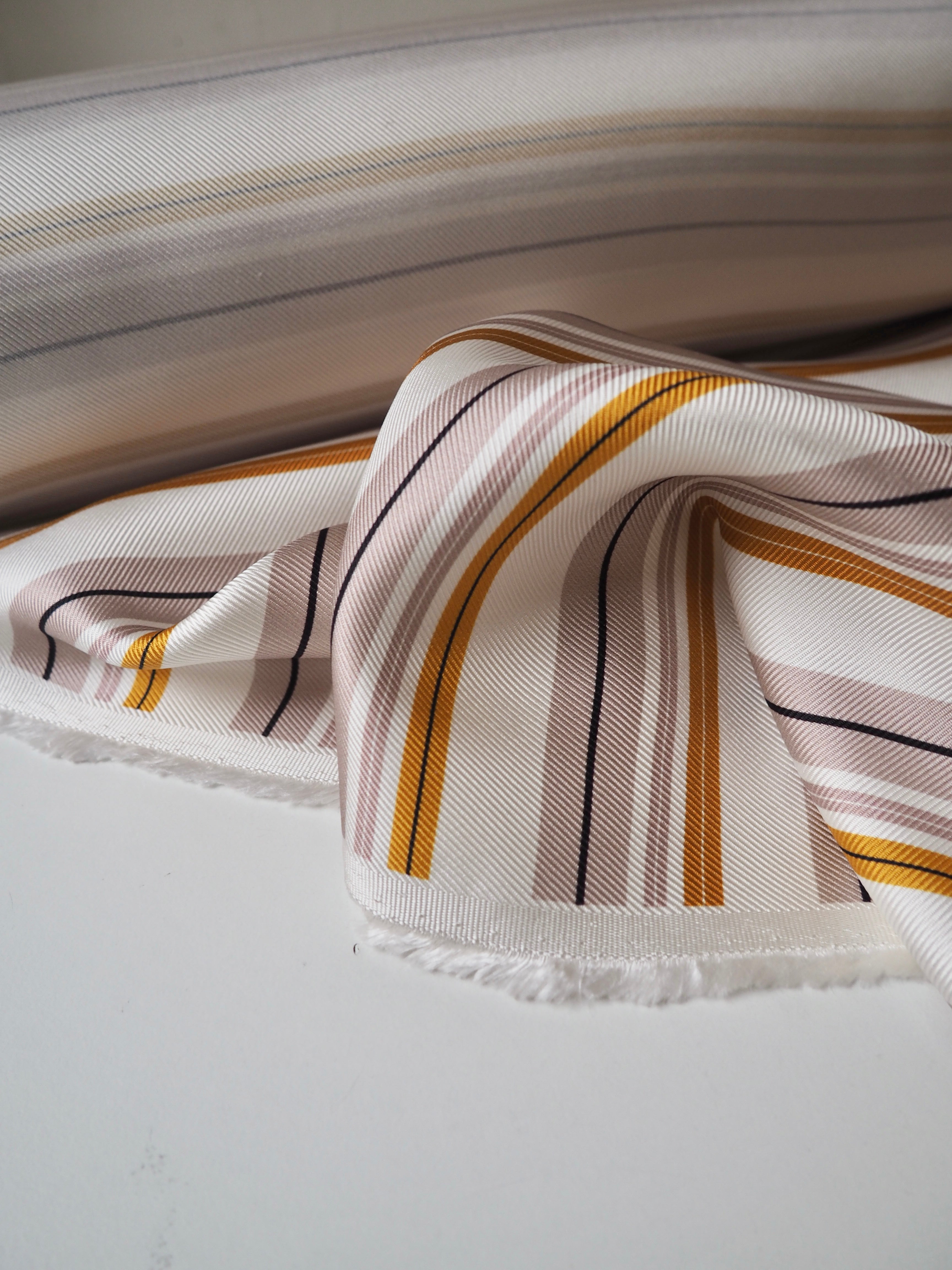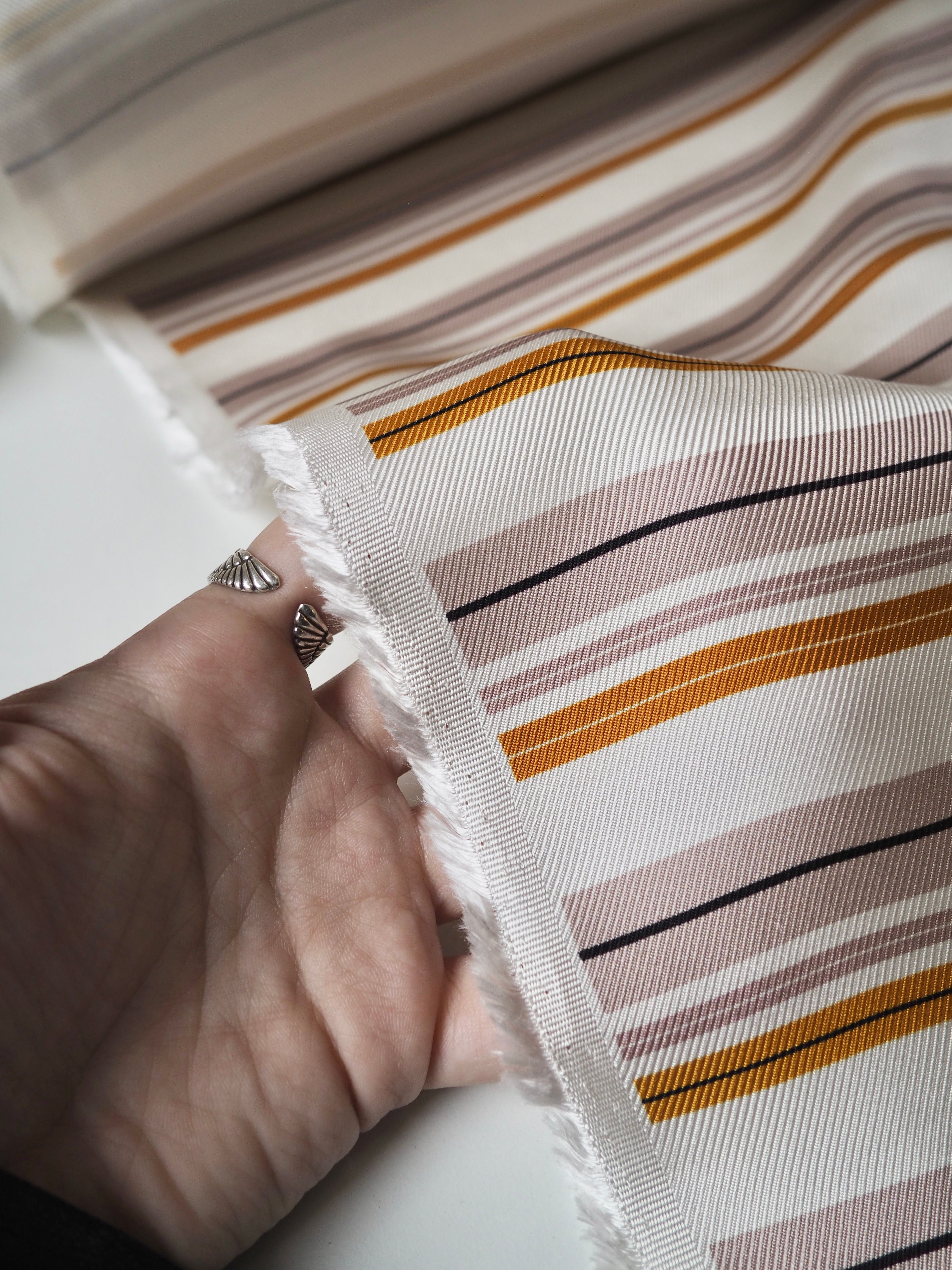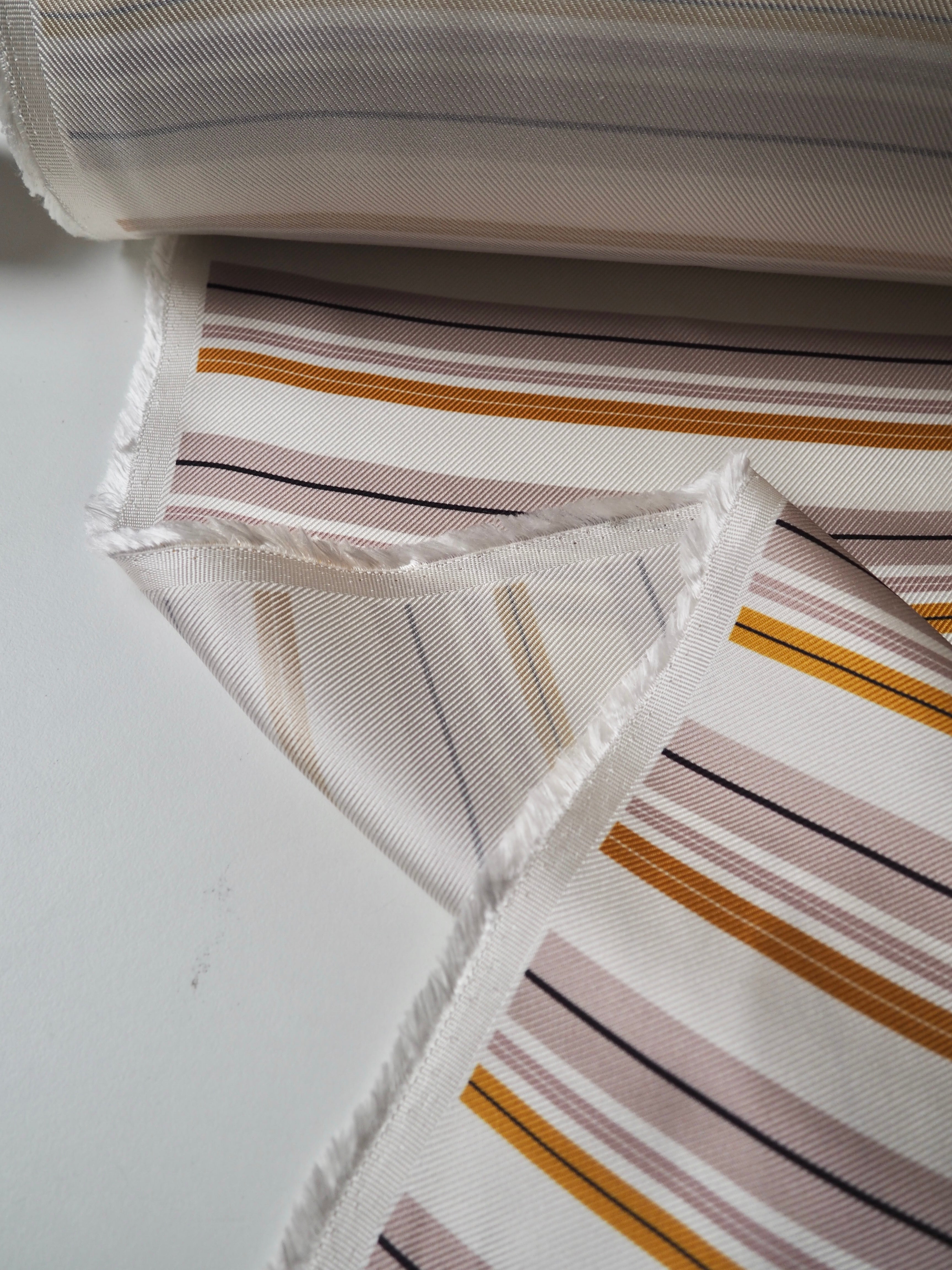 This ex-designer fabric is a silk twill. It's in a lovely pink and yellow stripe across the weft, on a white background. It's bespoke from a London designer. It's slinky, mostly opaque, and very soft. It has an incredible satin sheen and beautiful movement. The twill weave gives it a crisp, strong handle. Lightweight, but a bit heavier than a typical silk twill. The perfect drapey silk for blouses or even a special lining!