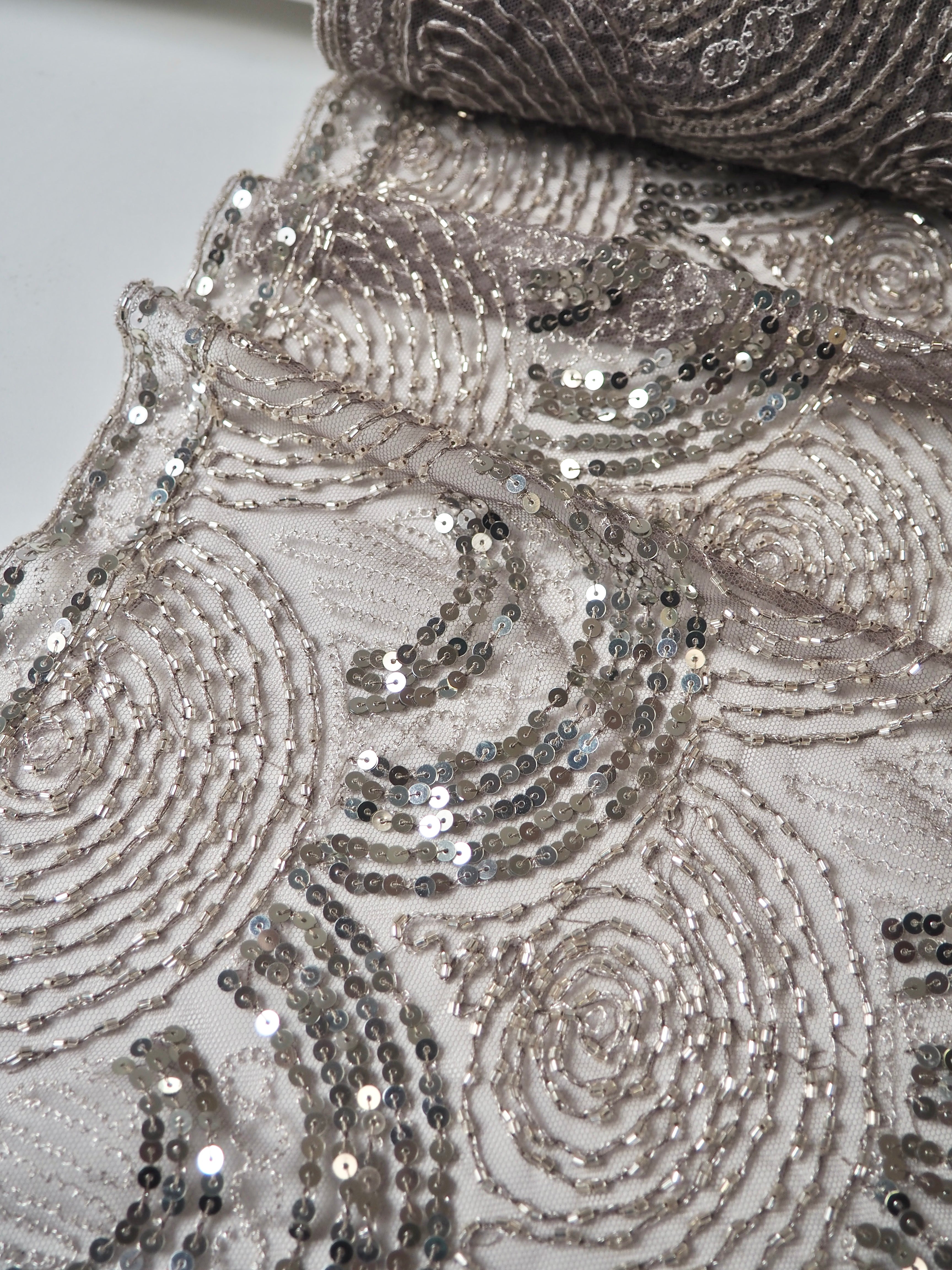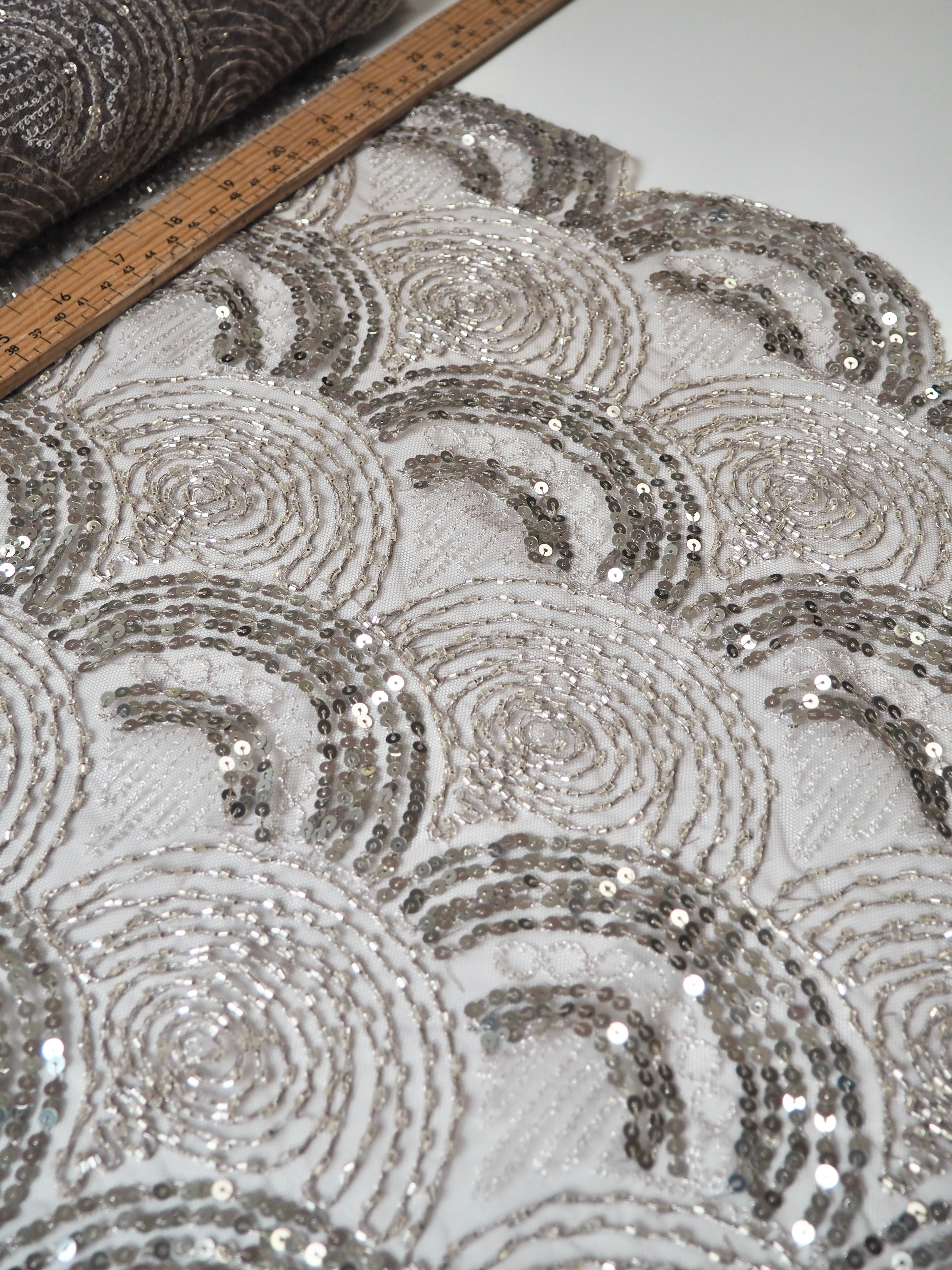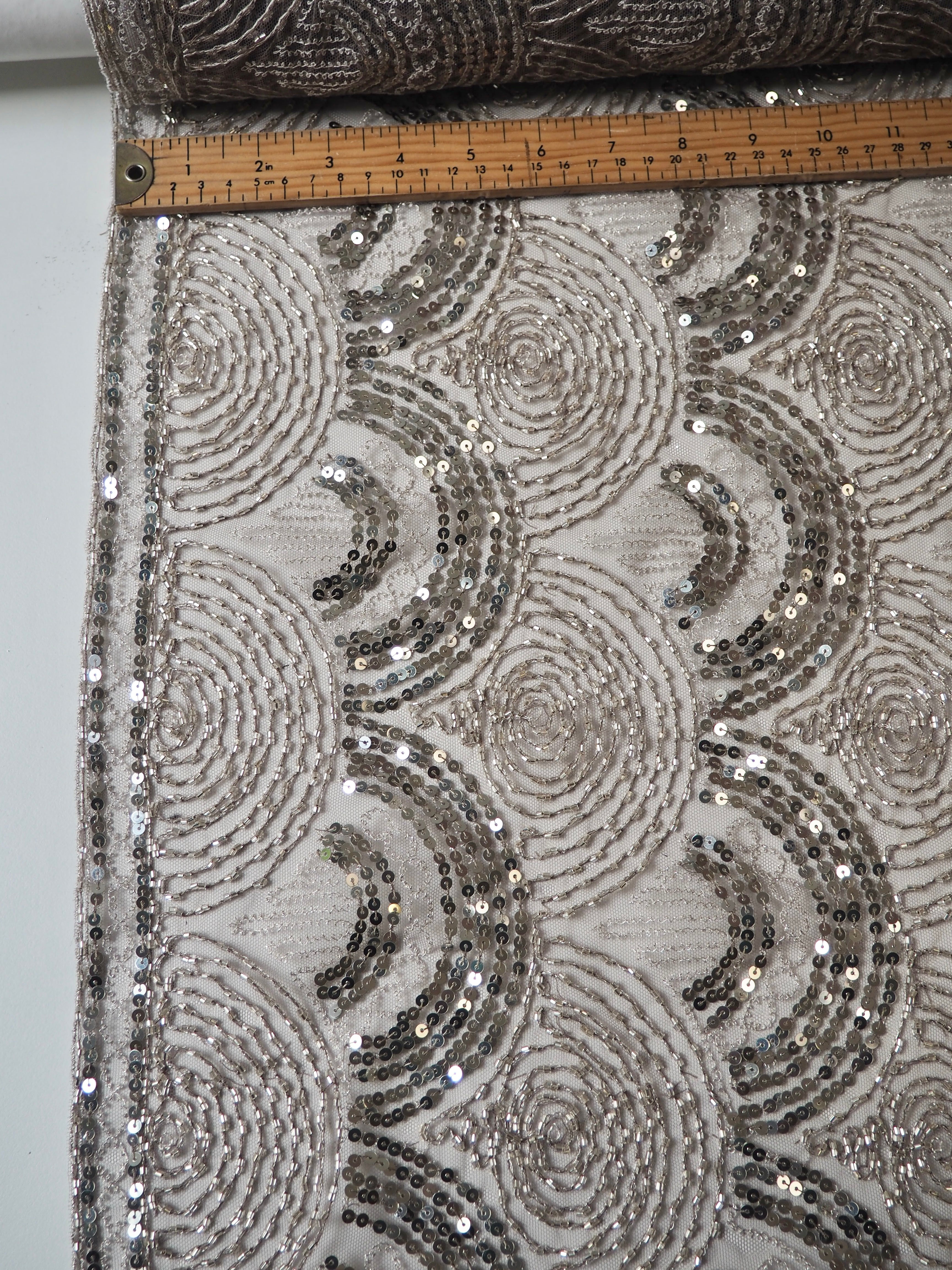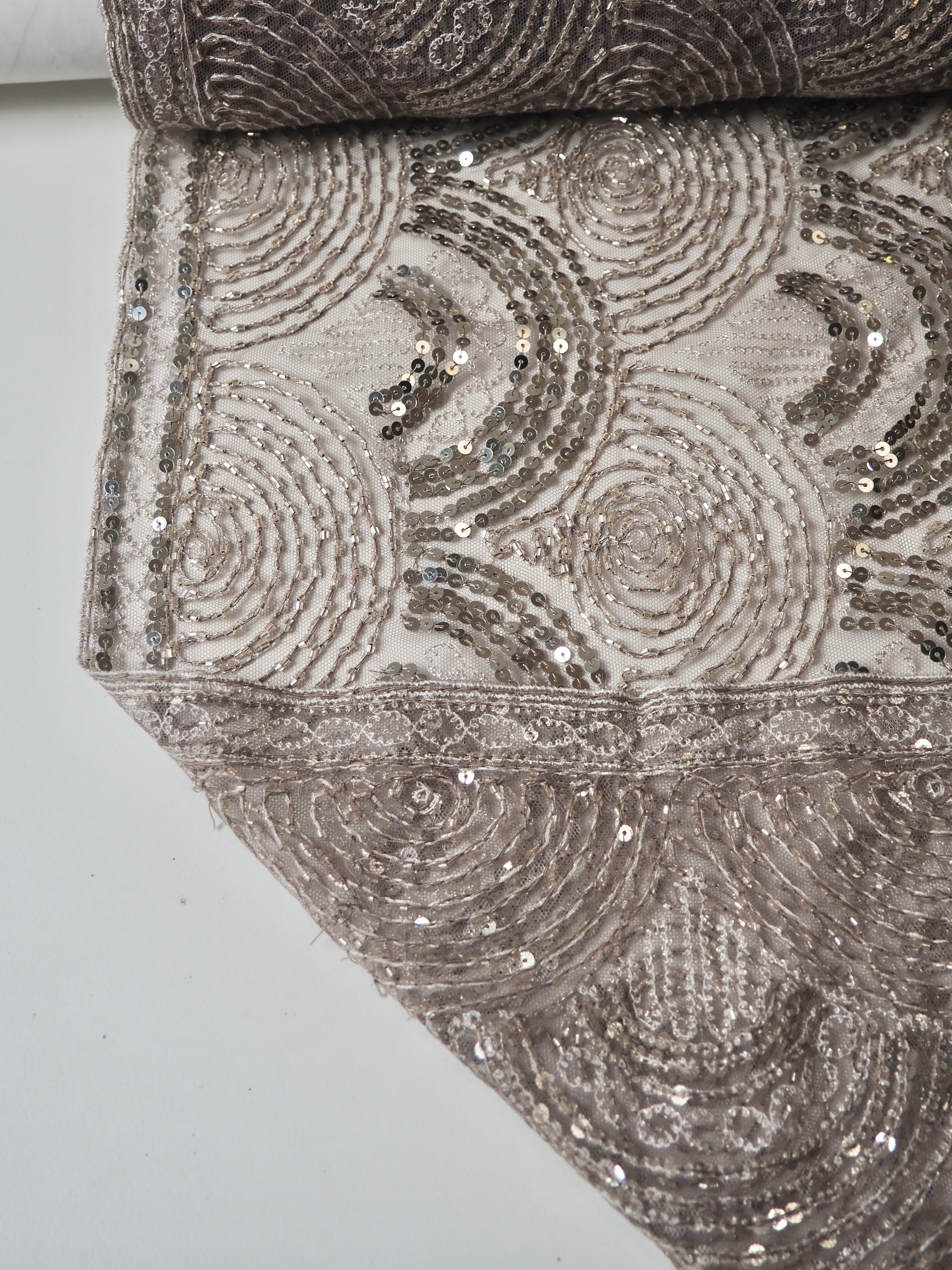 This ex-designer fabric is a beautiful couture cloth. Silver lurex threads are embroidered onto this taupe tulle with silver sequins and beading. It has a scalloping, circular design that is very romantic! It is finished with a scalloped edge on one end. Light to medium coverage design. Has a medium to heavy weight and luxurious handle. So eye-catching and elegant. The cloth could be cut out and reapplied as trim, or be used as an incredible addition to a gown or skirt!
