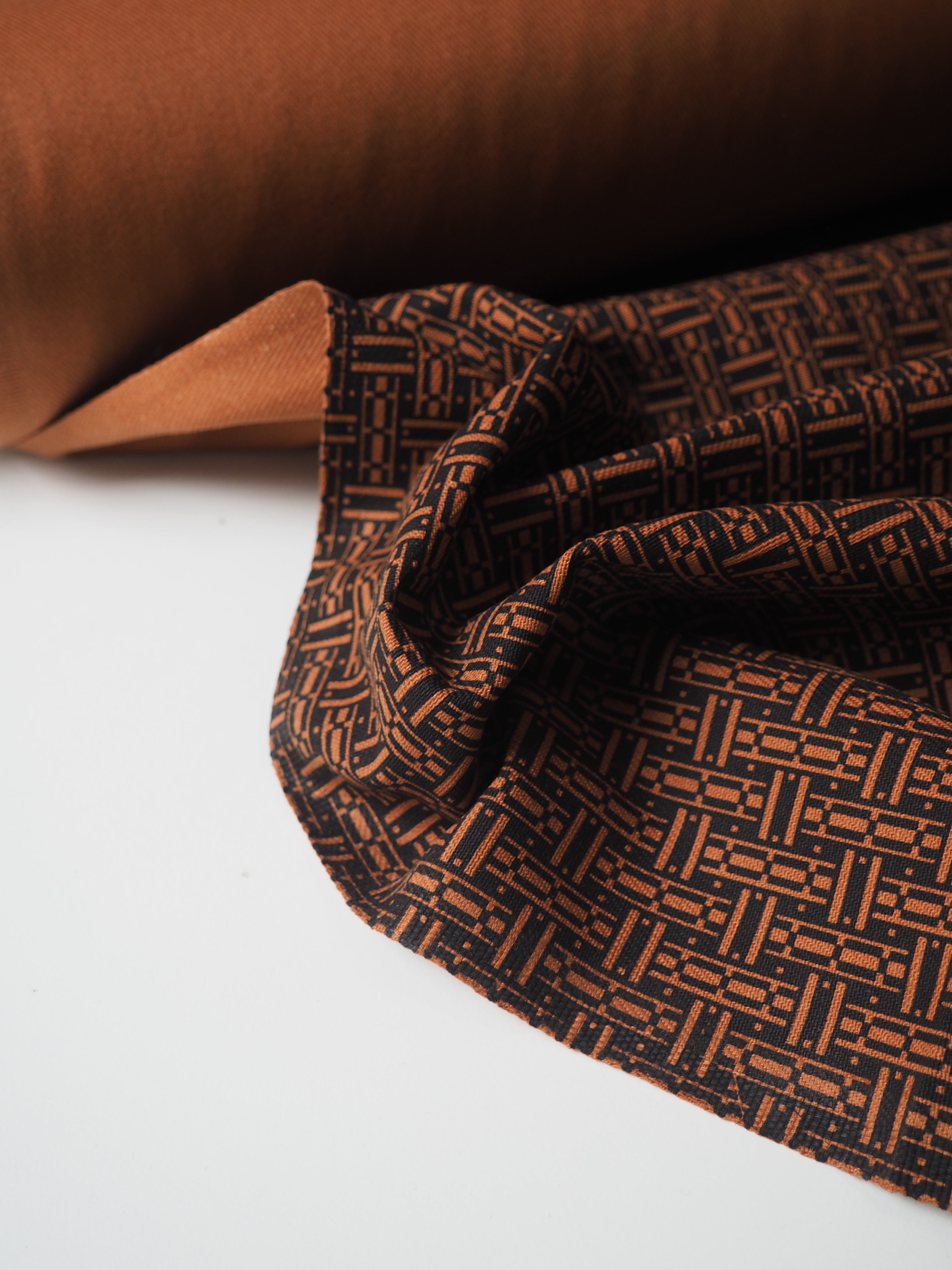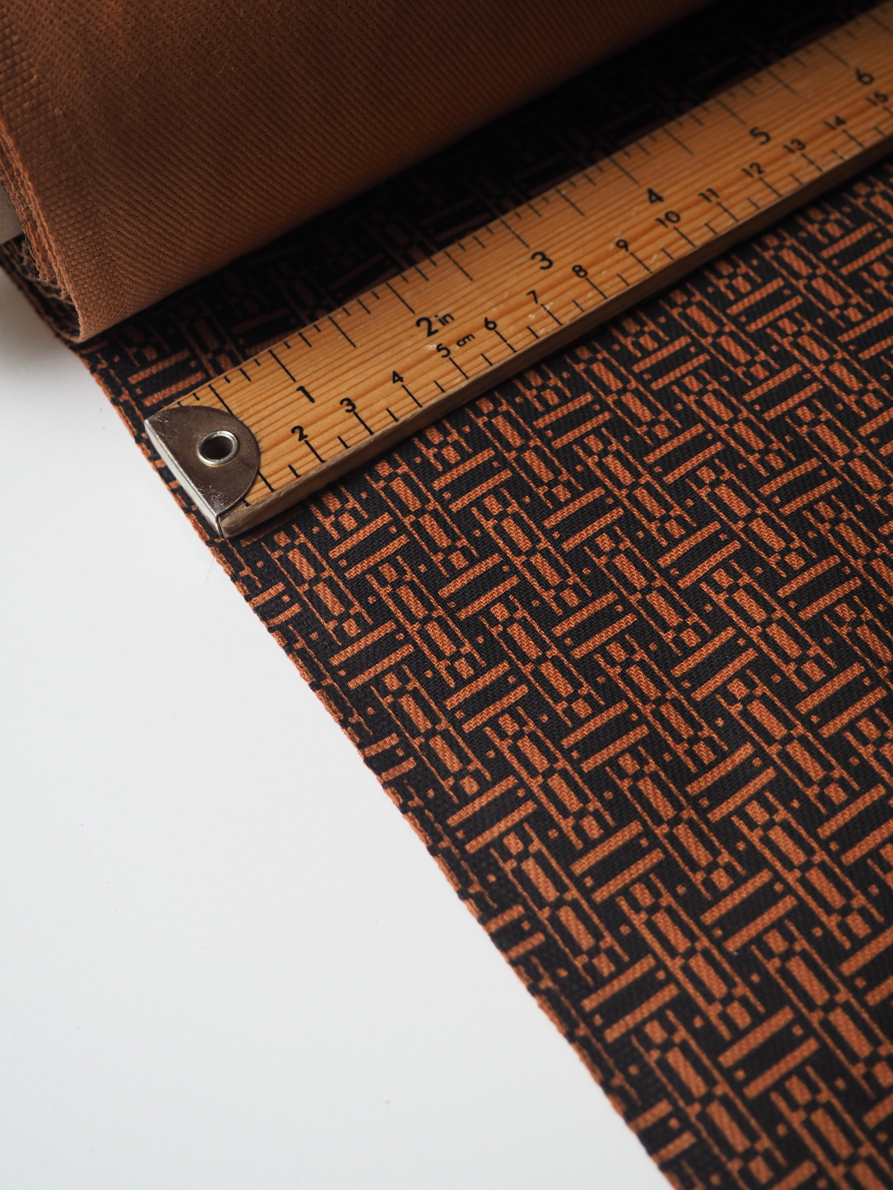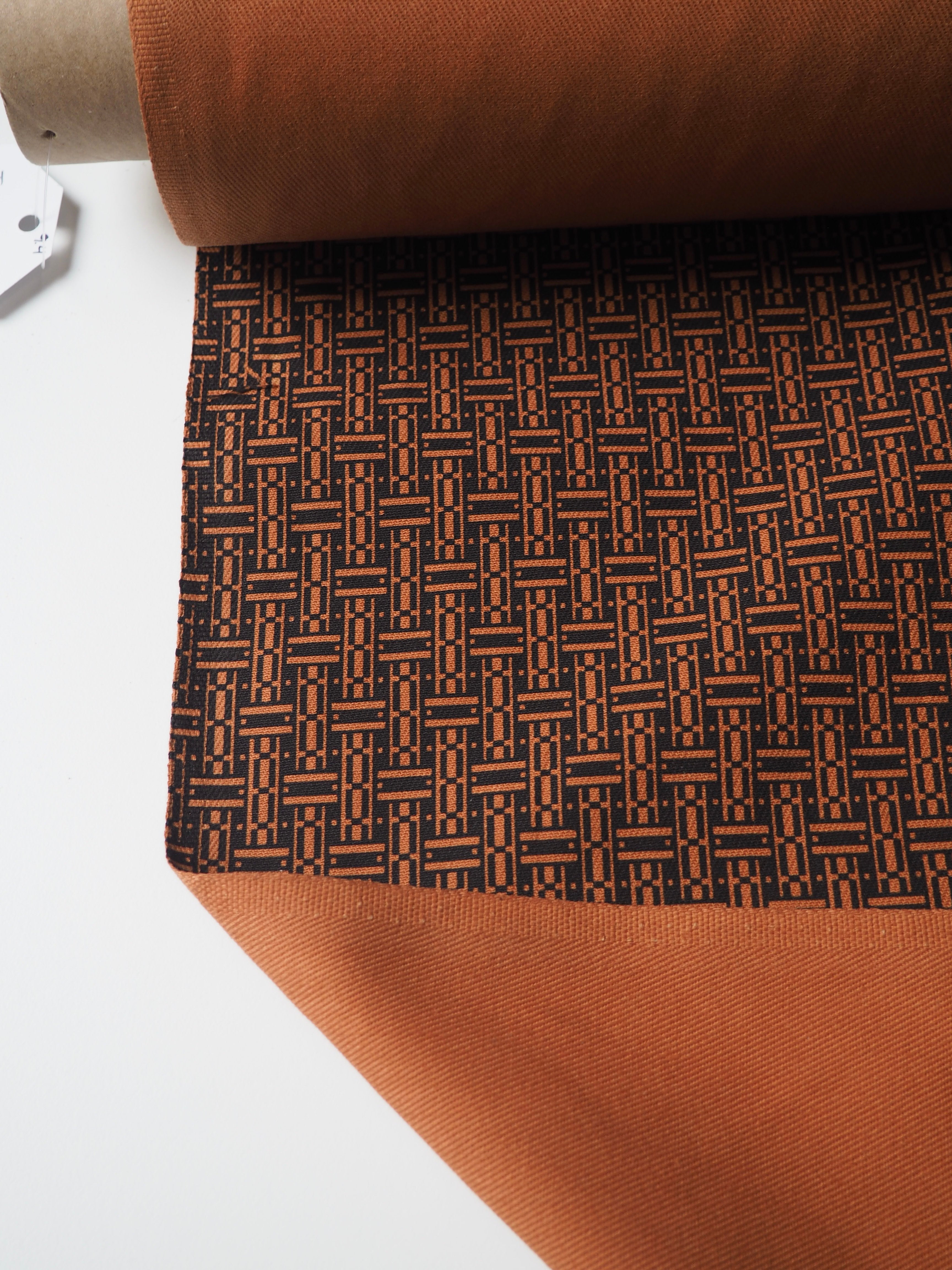 This ex-designer fabric is a cotton twill. It's in a parquet floor-esque print in terracotta and black on this medium weight cotton twill. It's a bespoke print from the designer. Has a great structure and a plain twill weave. Sturdy and lovely quality, in a typical cotton handle. Perfect for jackets, heavier-wearing trousers, totes, and even outdoor cushions!