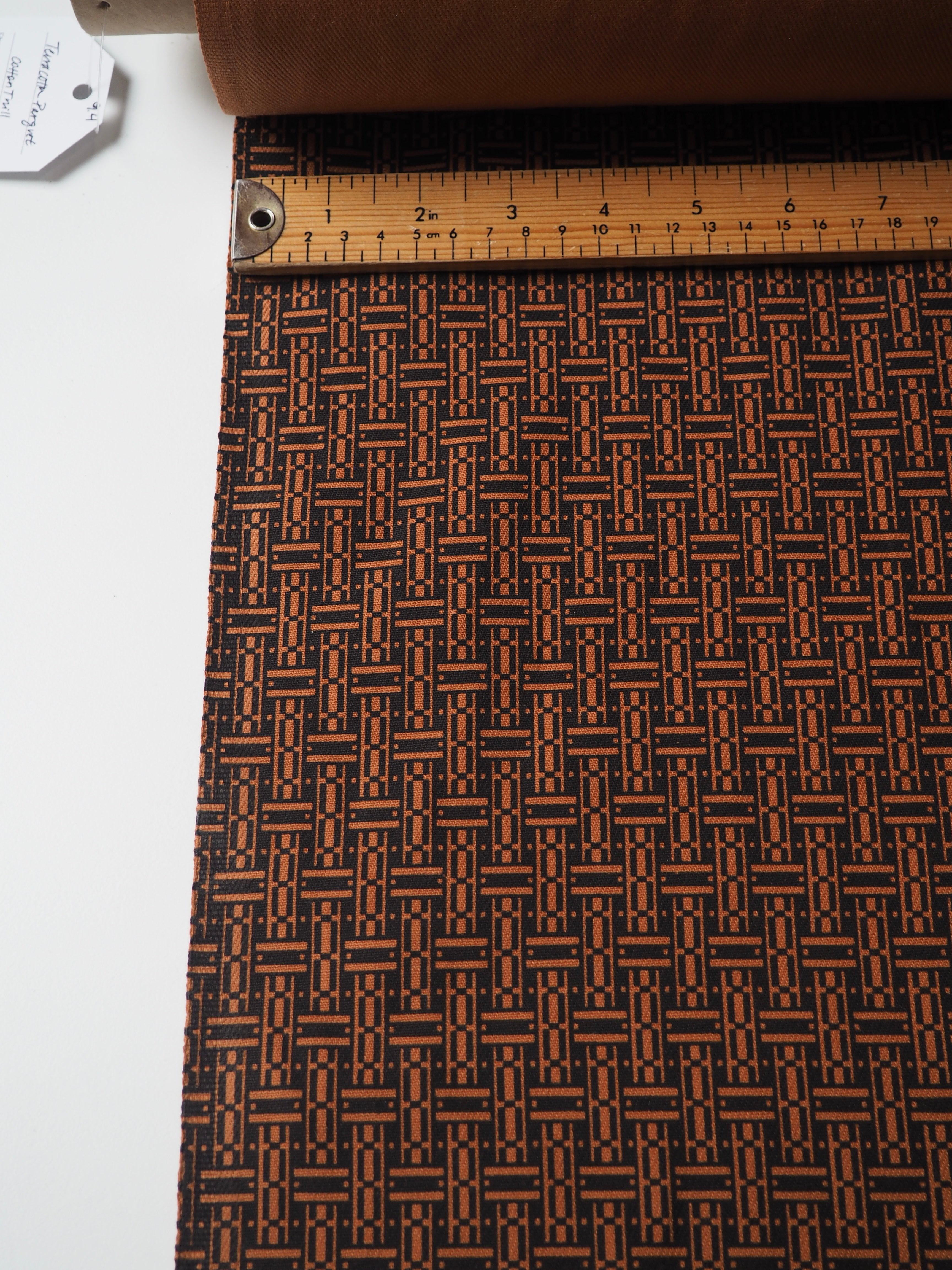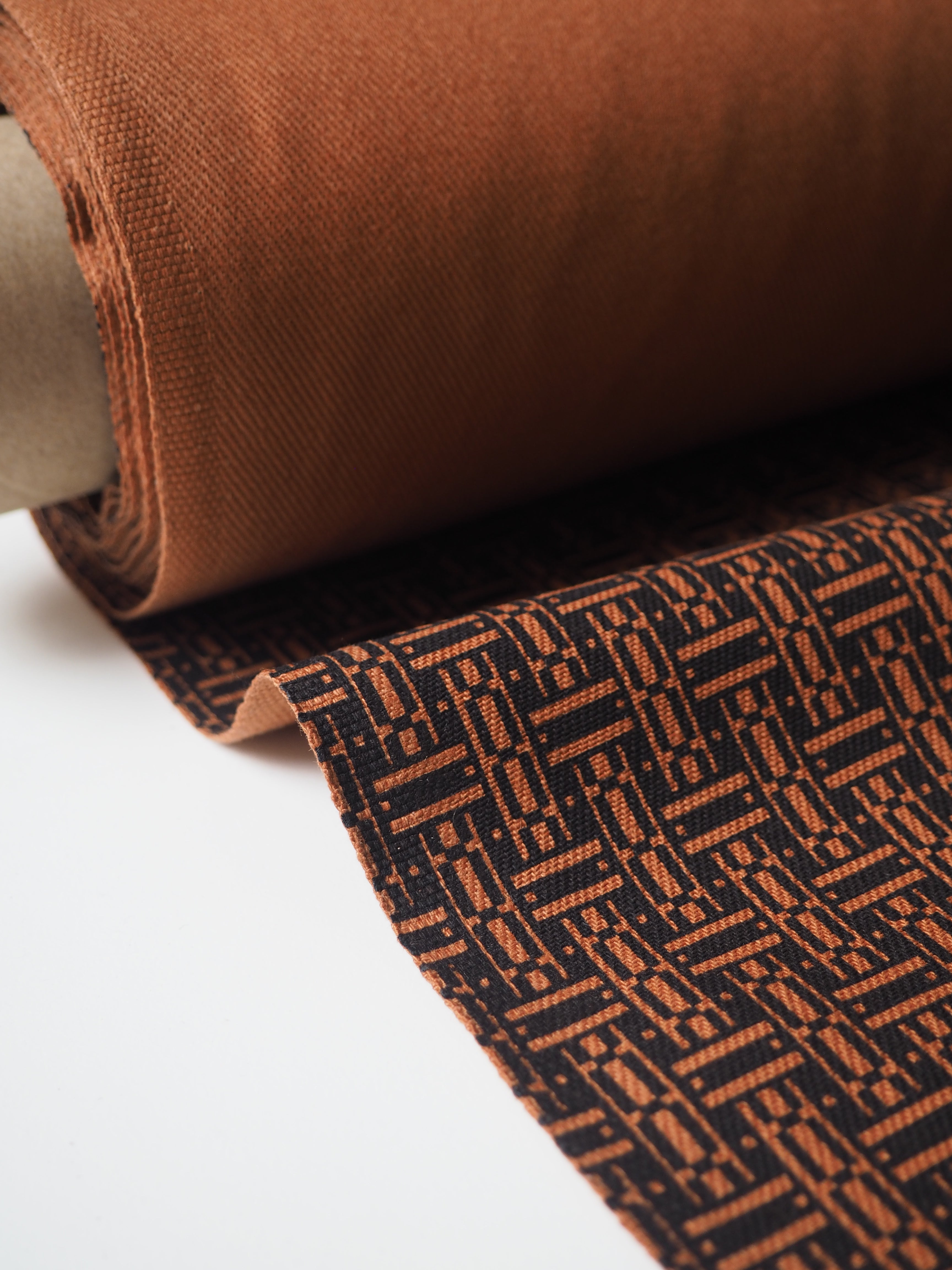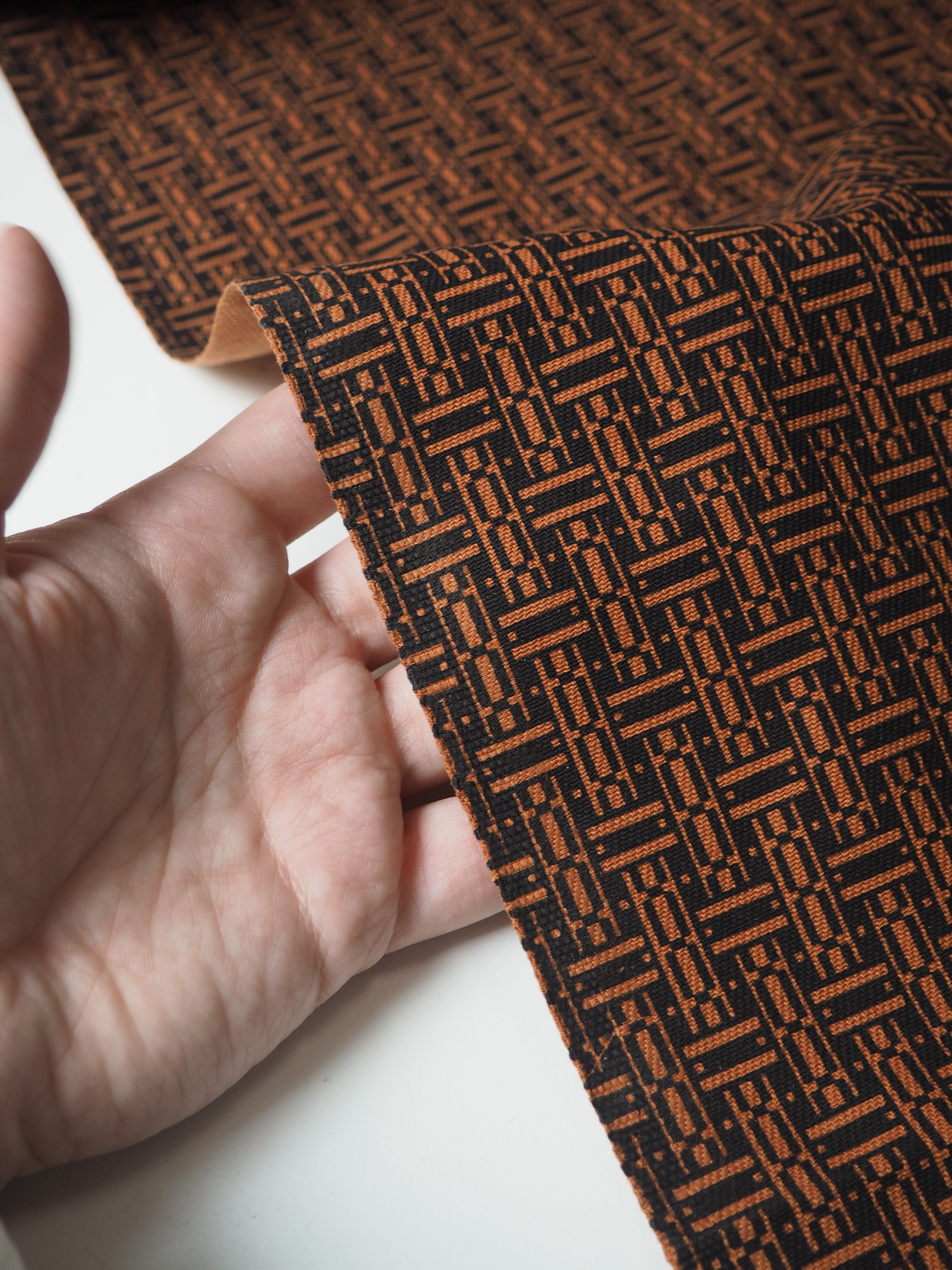 This ex-designer fabric is a cotton twill. It's in a parquet floor-esque print in terracotta and black on this medium weight cotton twill. It's a bespoke print from the designer. Has a great structure and a plain twill weave. Sturdy and lovely quality, in a typical cotton handle. Perfect for jackets, heavier-wearing trousers, totes, and even outdoor cushions!