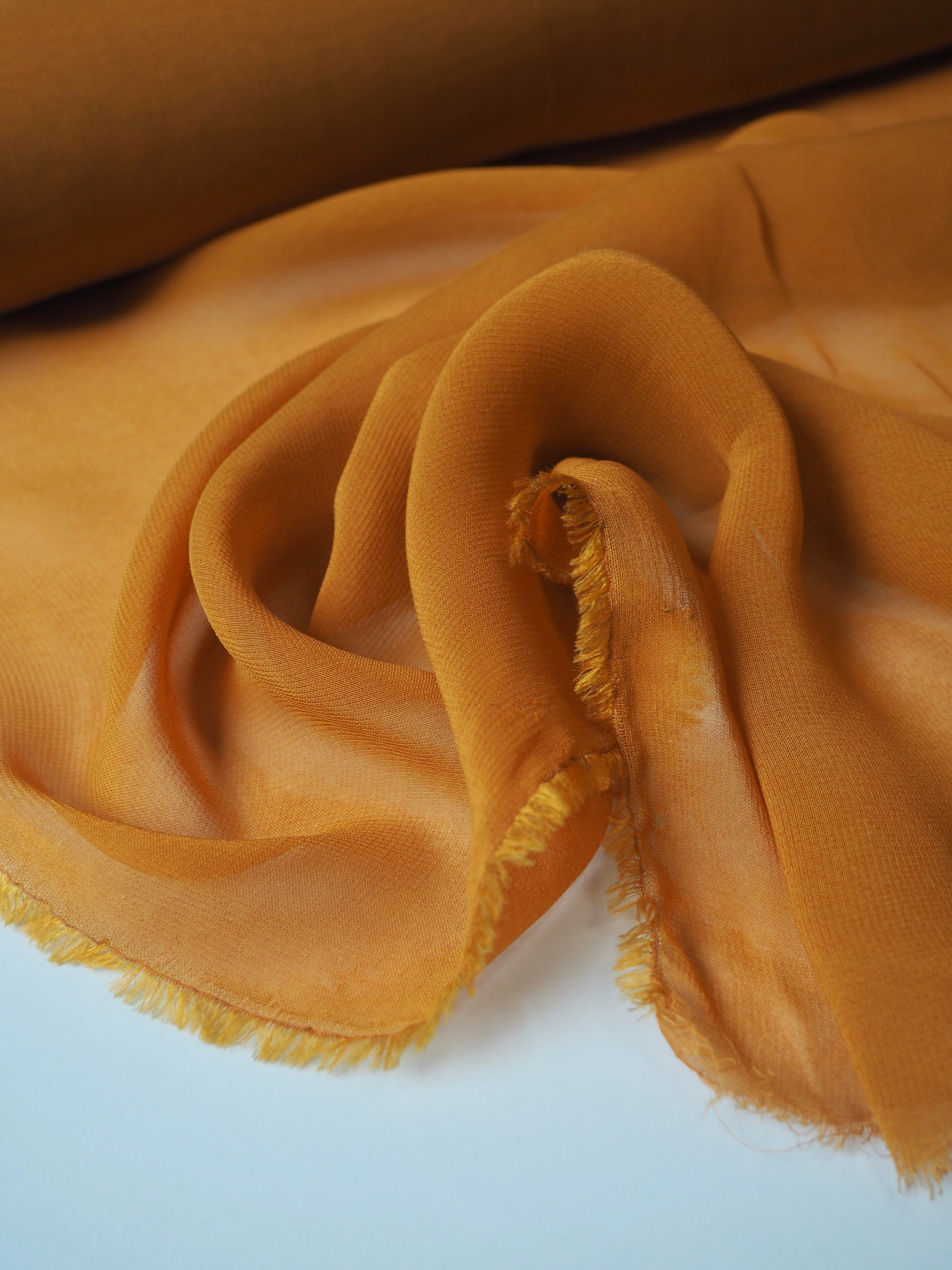 This ex-designer fabric is a lightweight silk chiffon. In a bright turmeric yellow/orange colour, and quite sheer. Has a great silky and viscose handle with a slightly crepe-like texture. Super light and airy, ideal for a floaty top or dress!