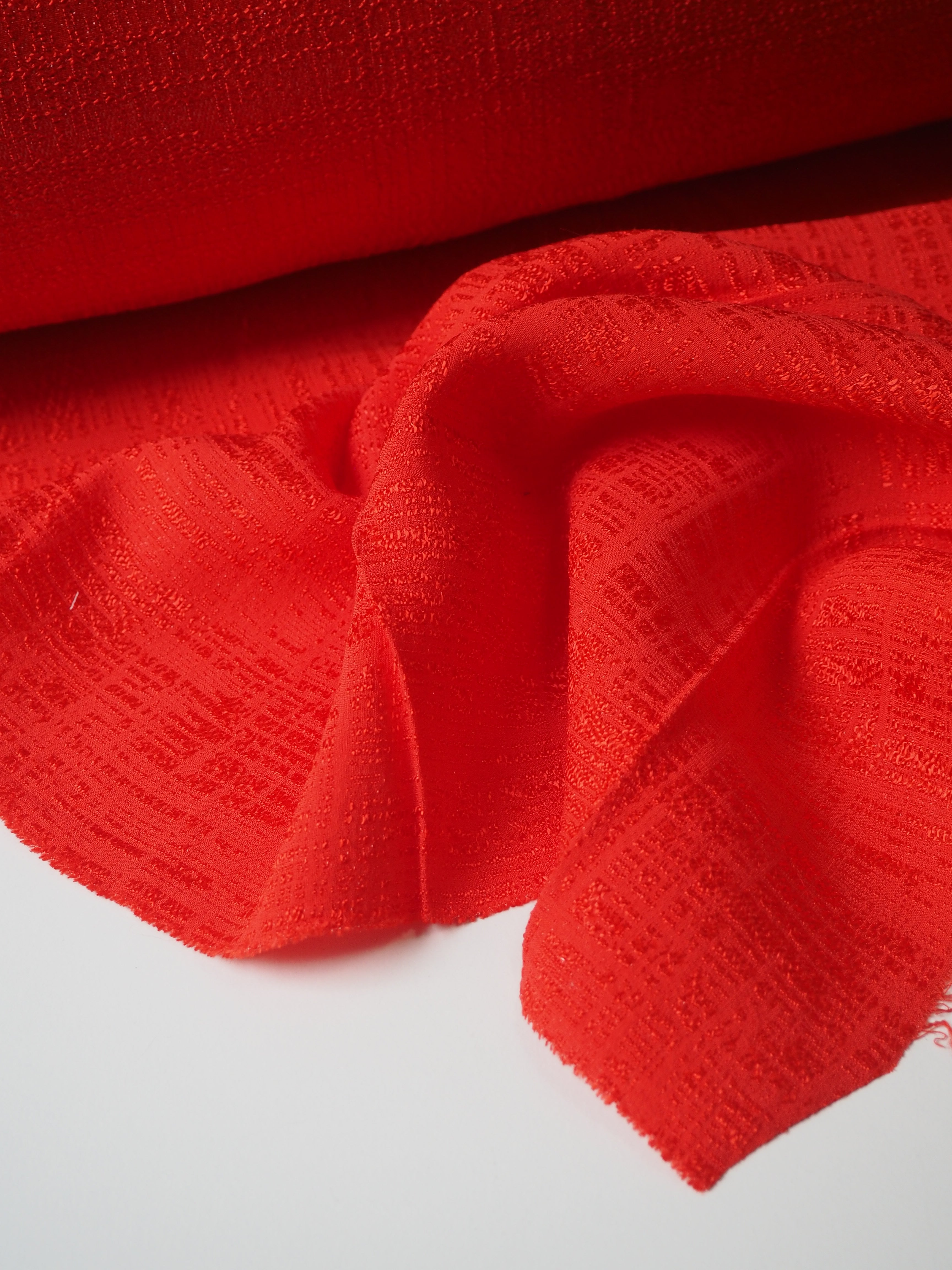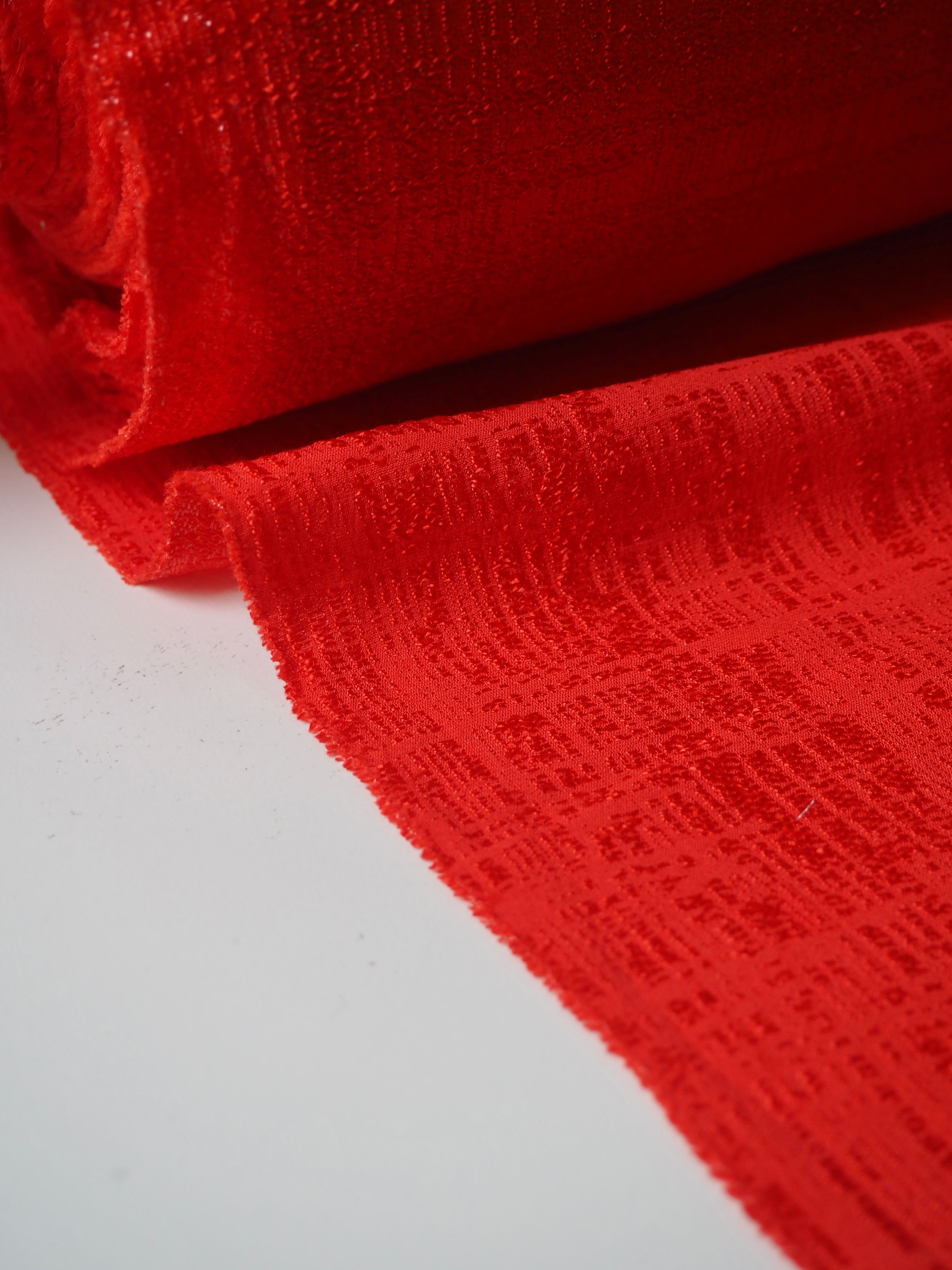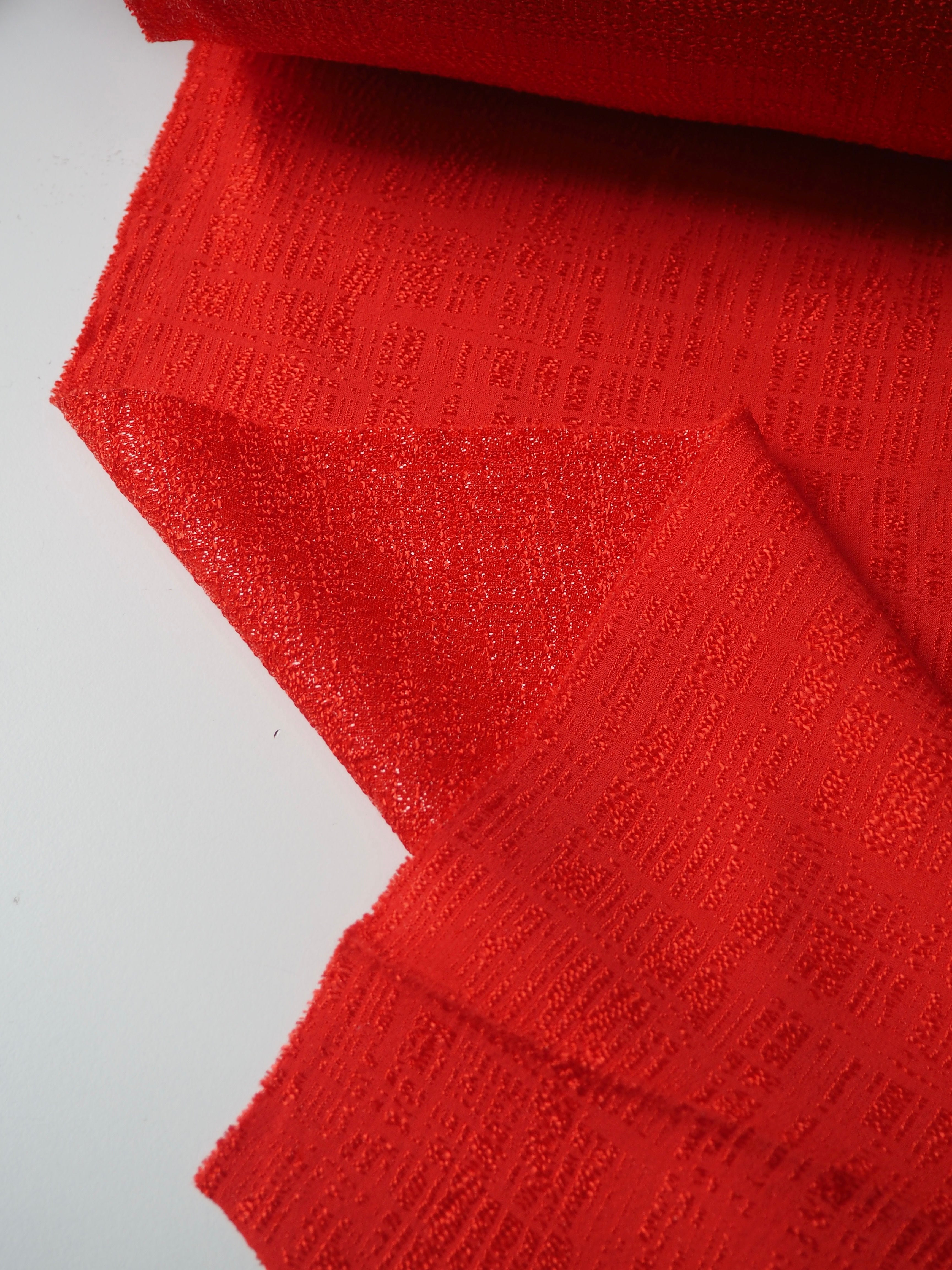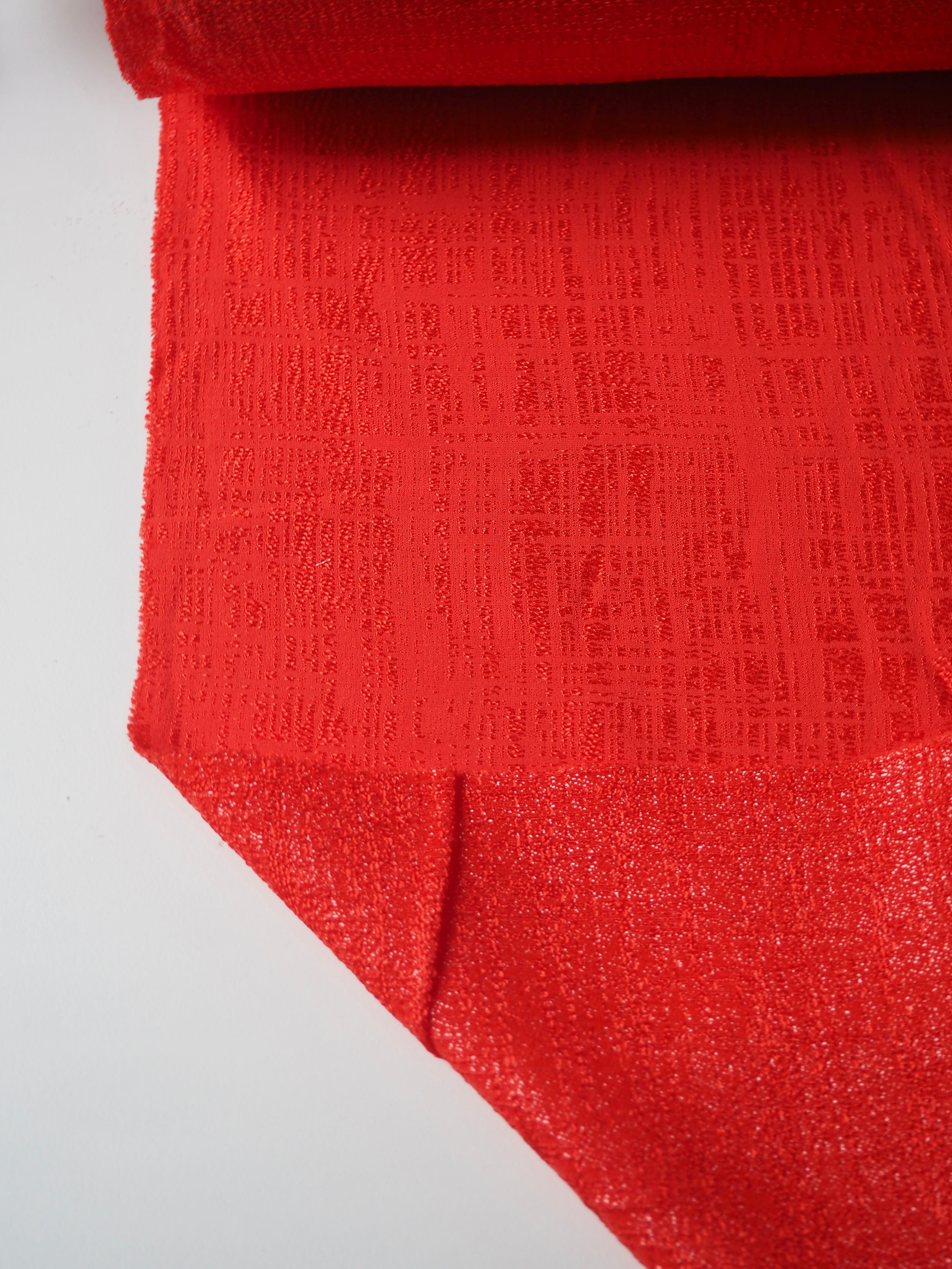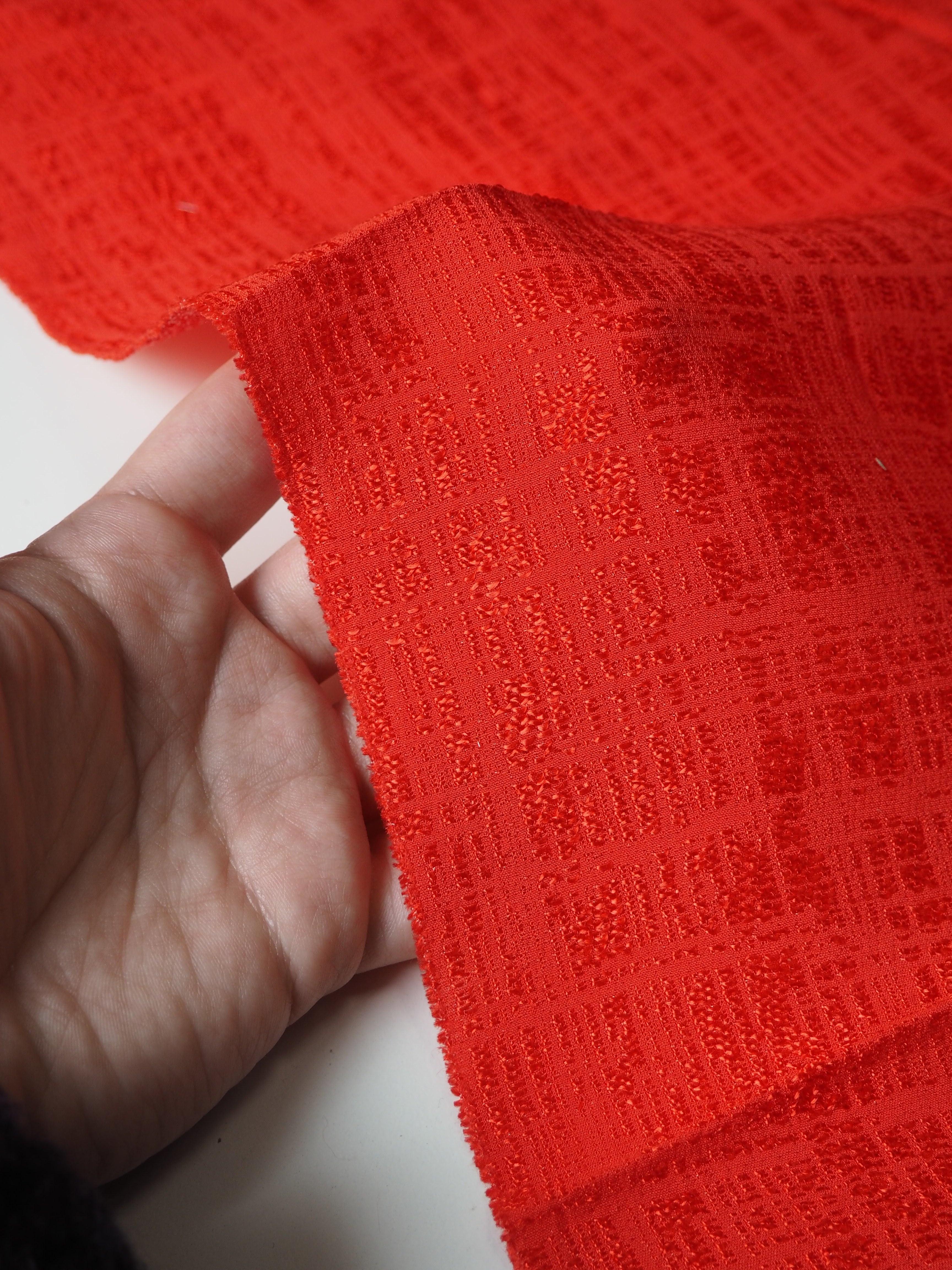 This ex-designer fabric is a jacquard. This vermillion orange/red jacquard has a metallic tweed-like weave. It catches the light so beautifully and drapes so well! It's lightly textured, is lightweight, and opaque. Would love to see a top or dress!