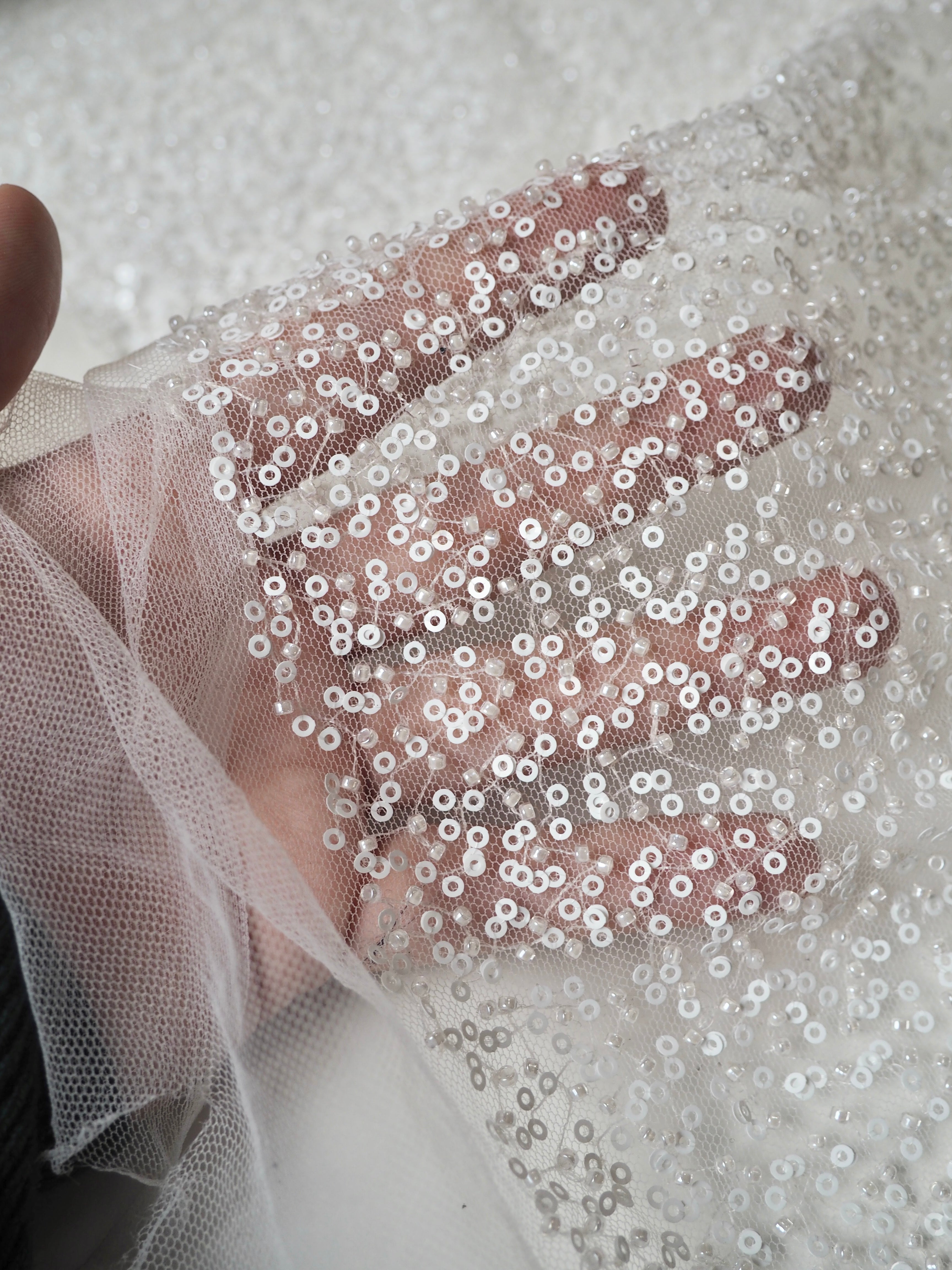 This ex-designer fabric is a gorgeous tulle. White sequins and beads are stitched across this white tulle. It's such a beautiful cloth, and has lovely movement when moving in the light! Medium weight and so fancy! Sheer, and has a nice structure. Perfect over a fancy dress or long jacket, or would be perfect for an evening bag or on a bridal look!