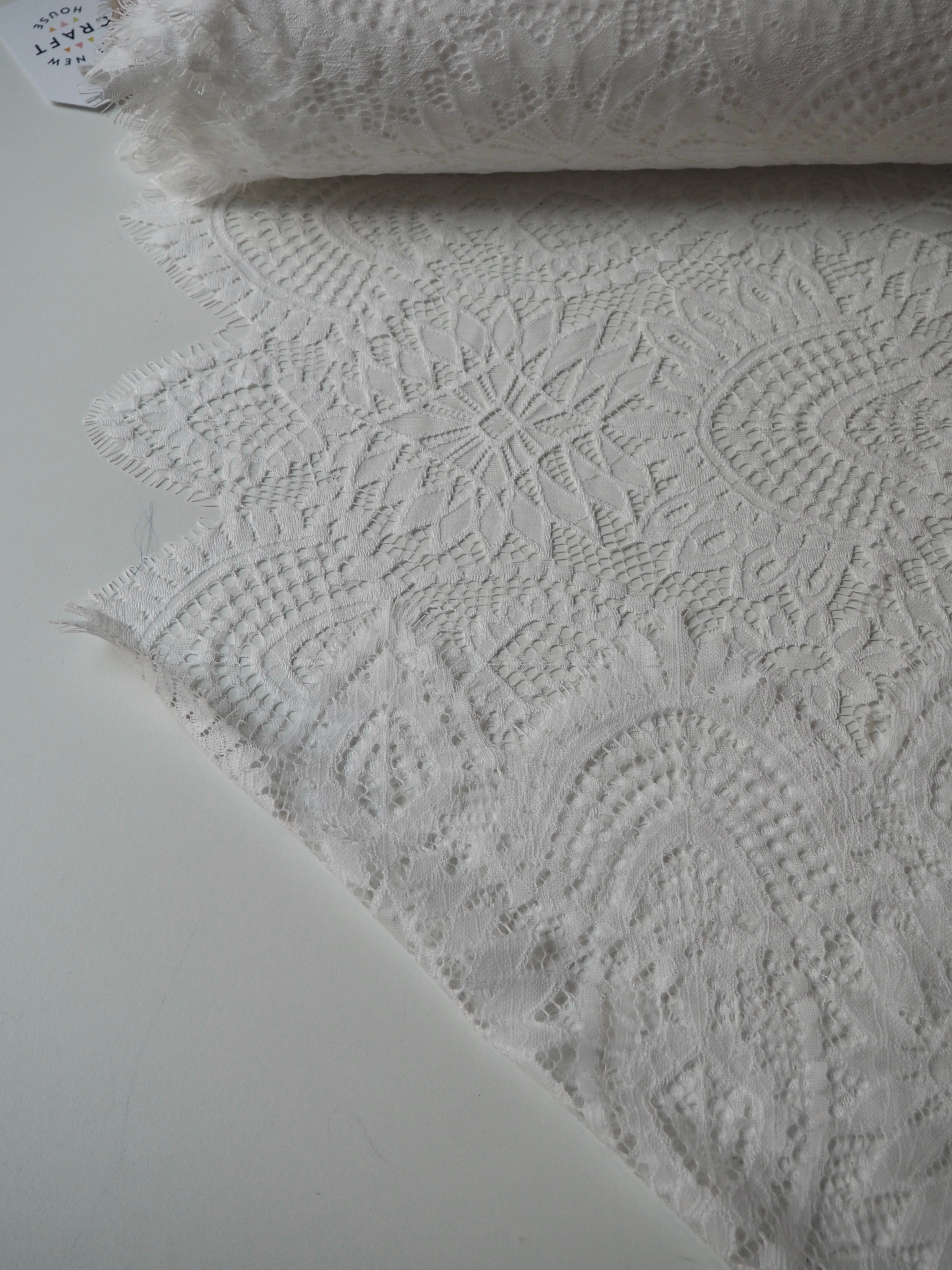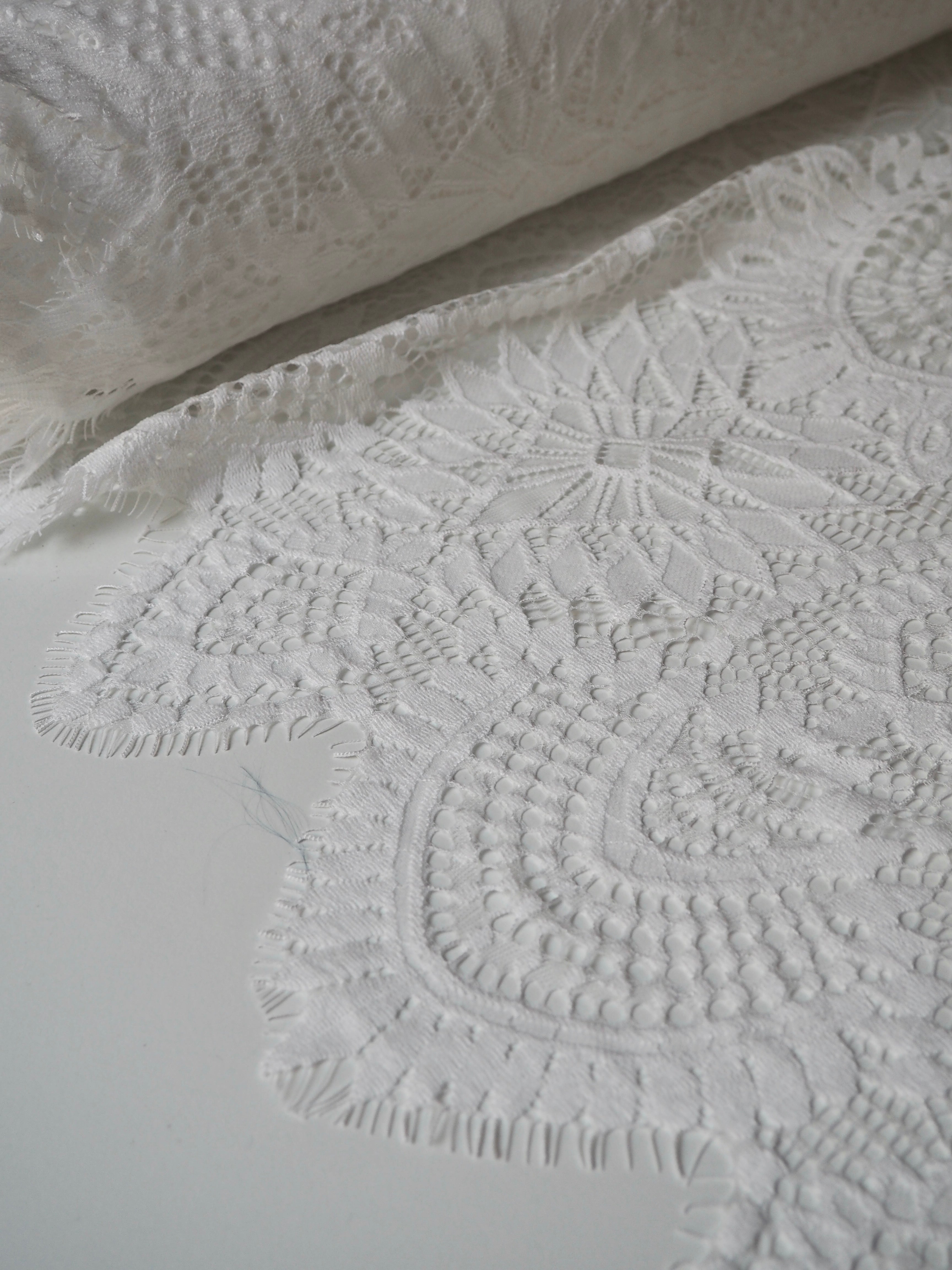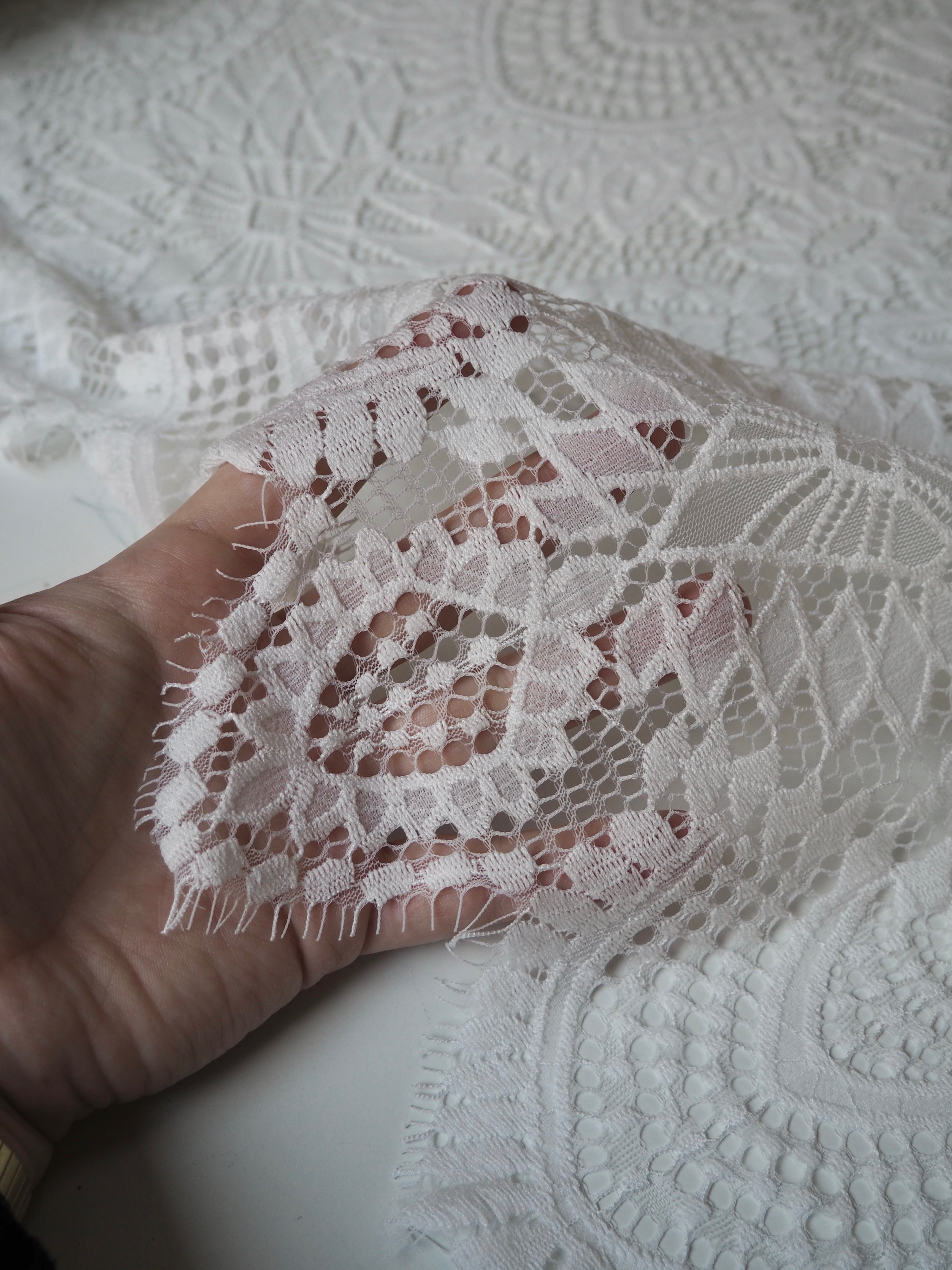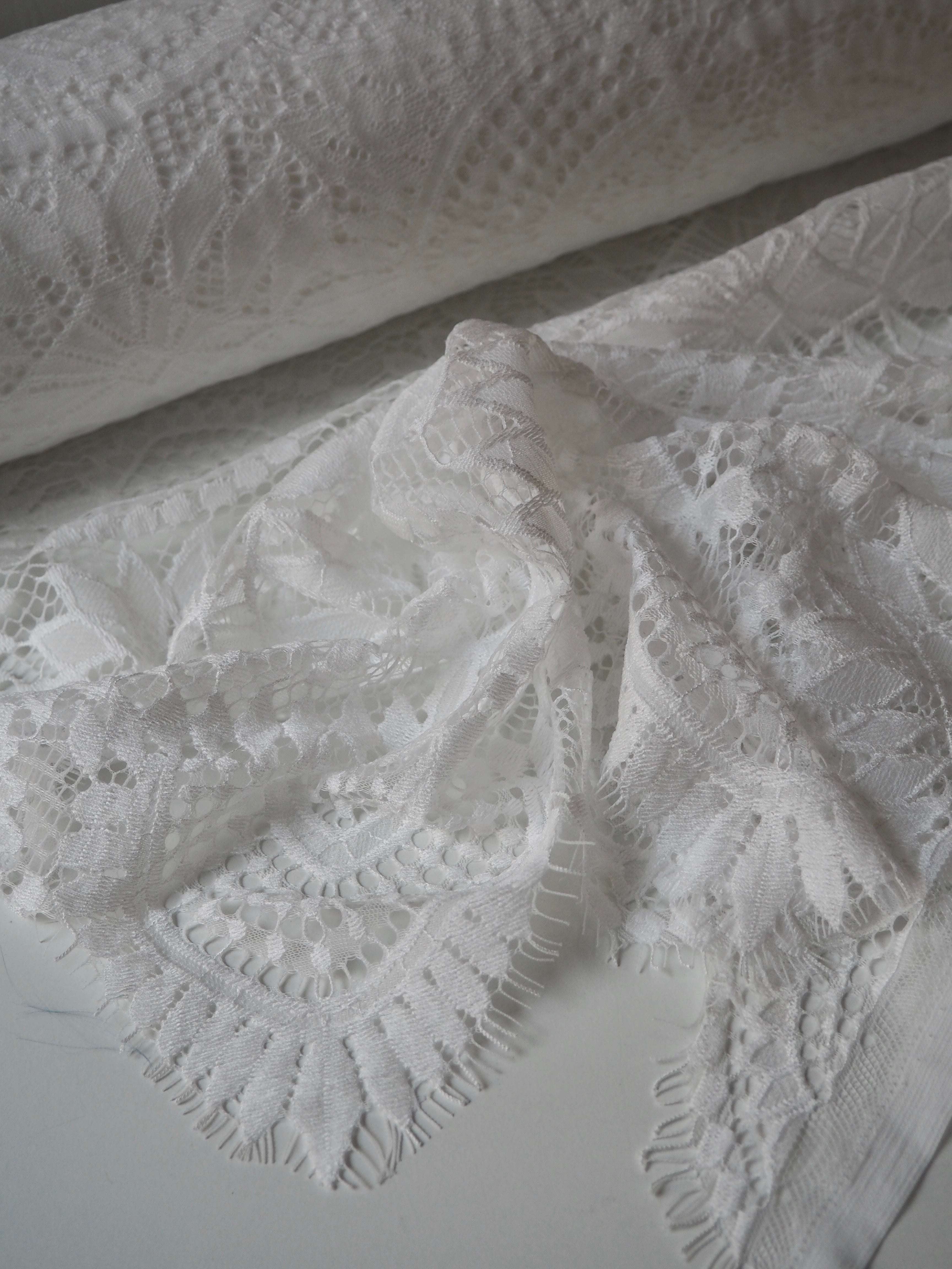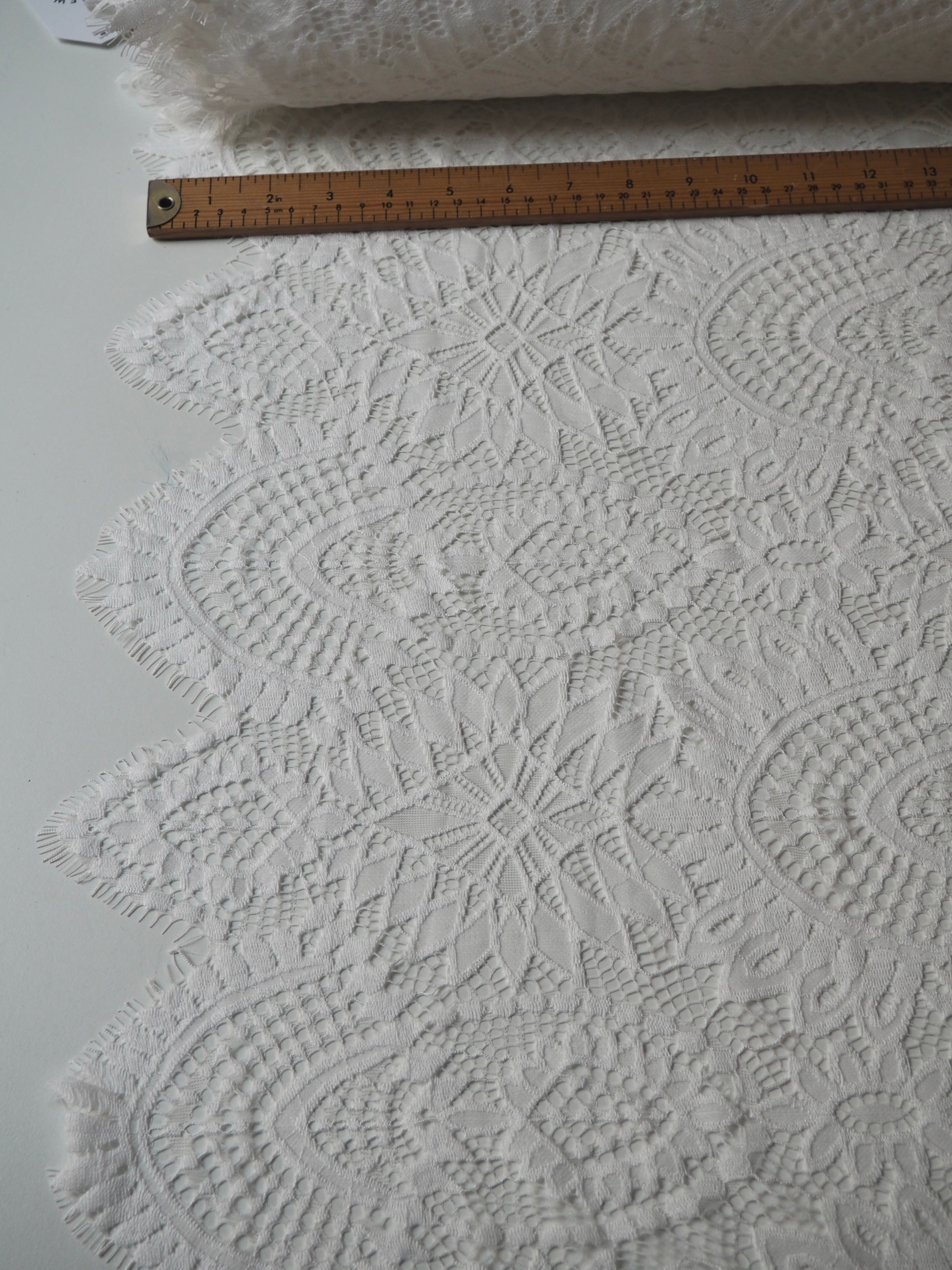 This ex-designer fabric is a lovely lace. It's in a soft white colour. It's soft and has a light sheen finish, with a medium scale geometric motif pattern. Finishes with a medium depth eyelash scallop on both ends. It has such a lovely drape and handle. Beautiful quality and perfect for bridal or summer tops and dresses! This lace is made in 2-3m pieces so if you order higher volume, your order might be in pieces.