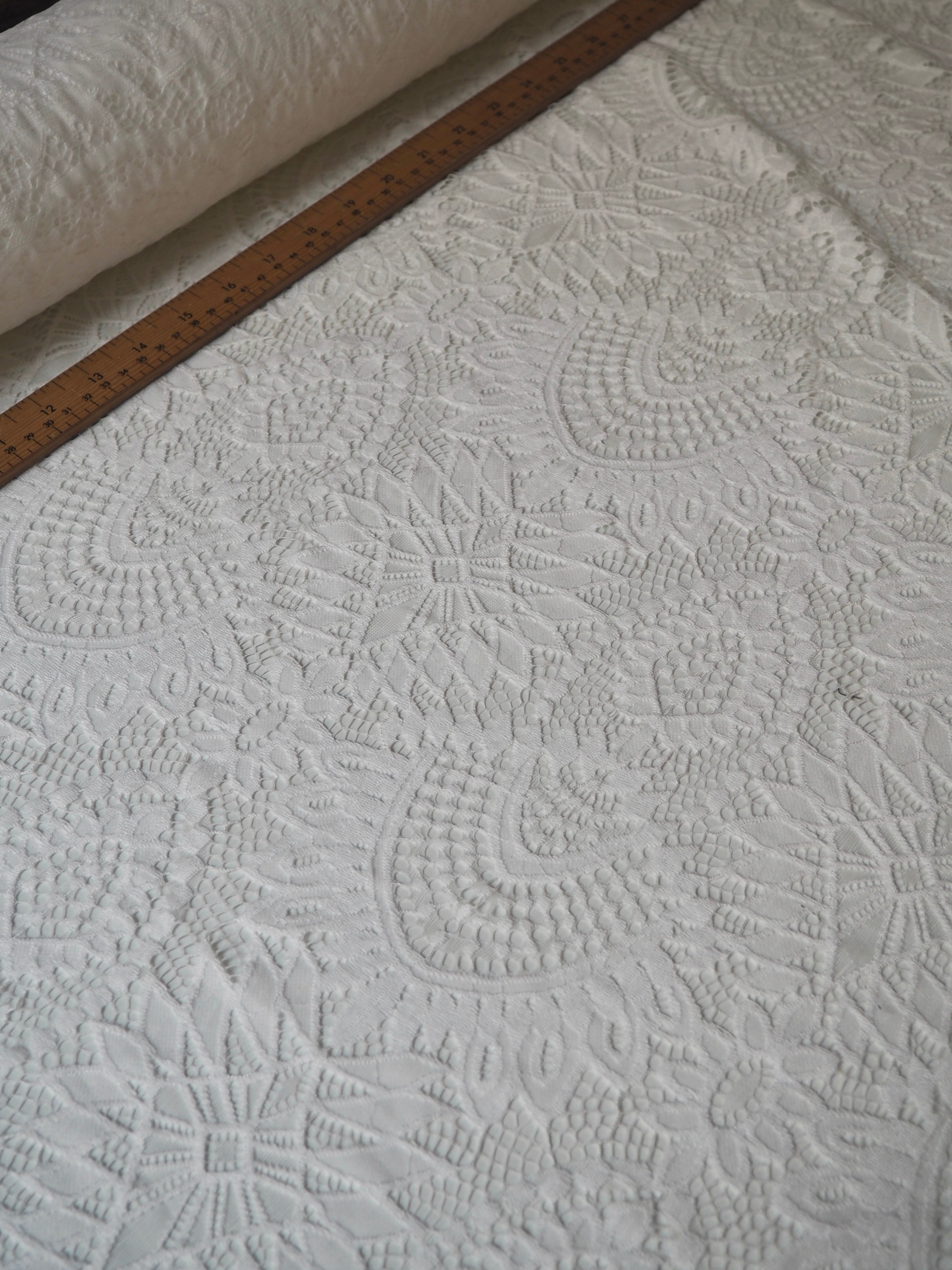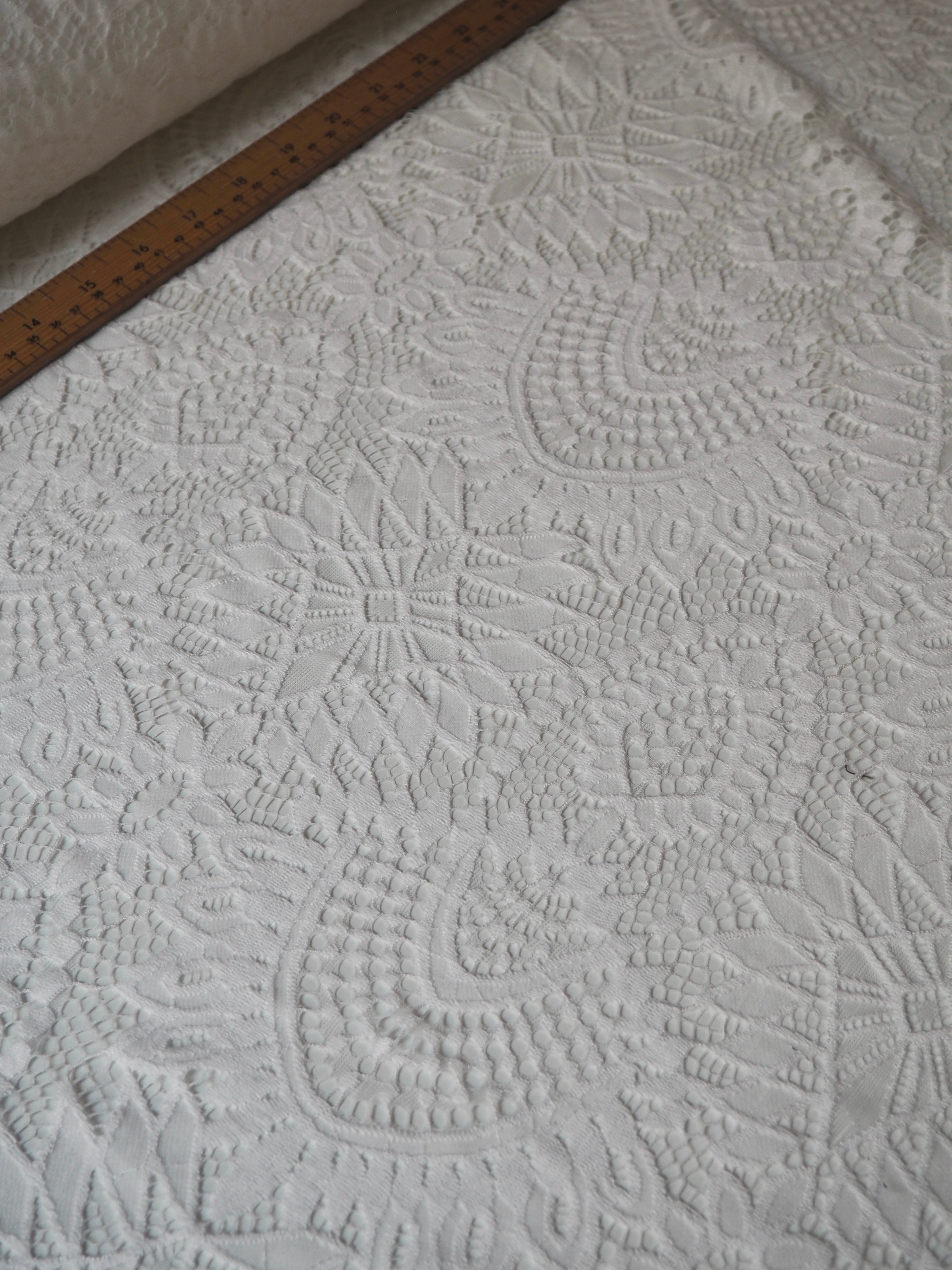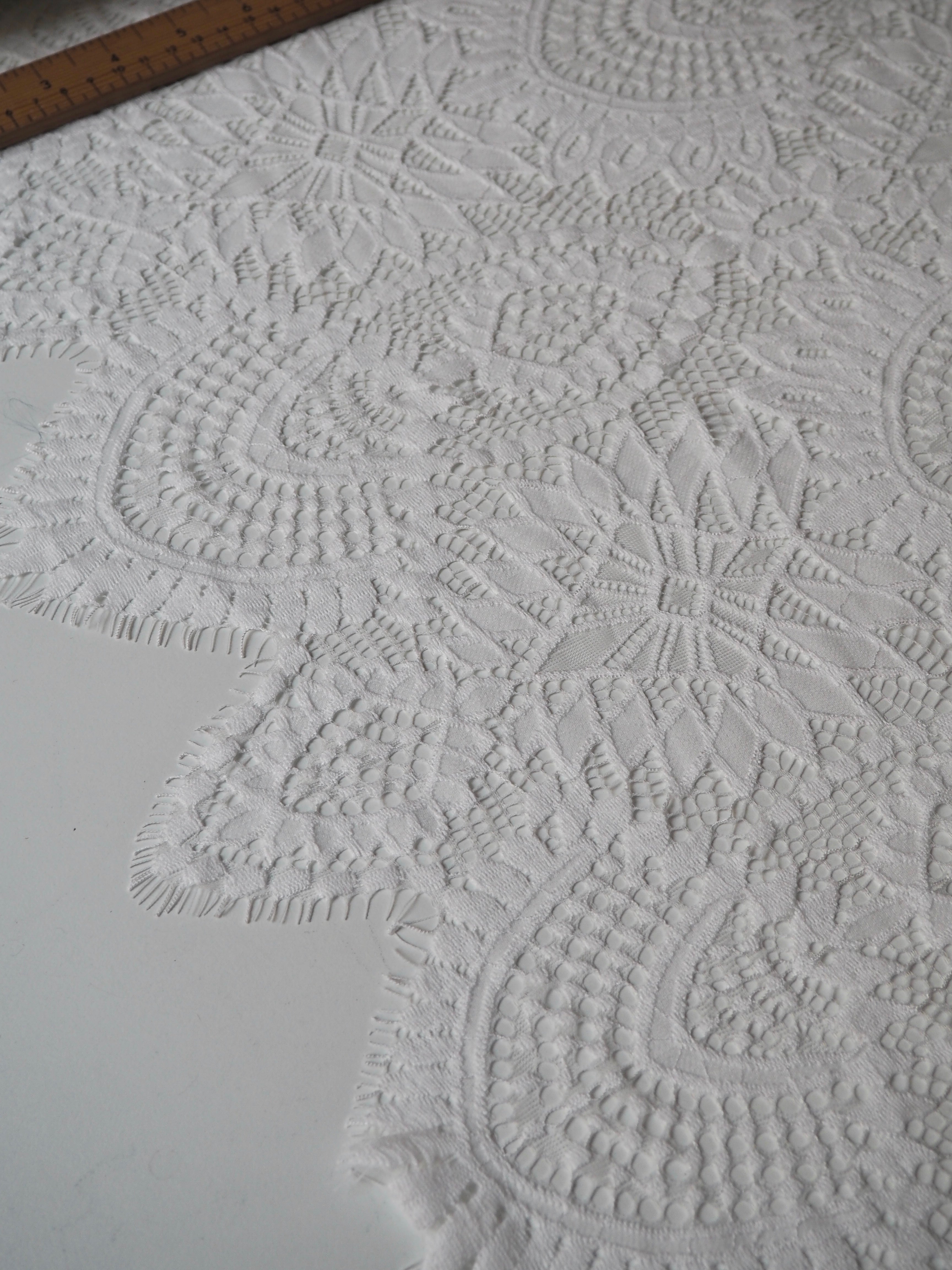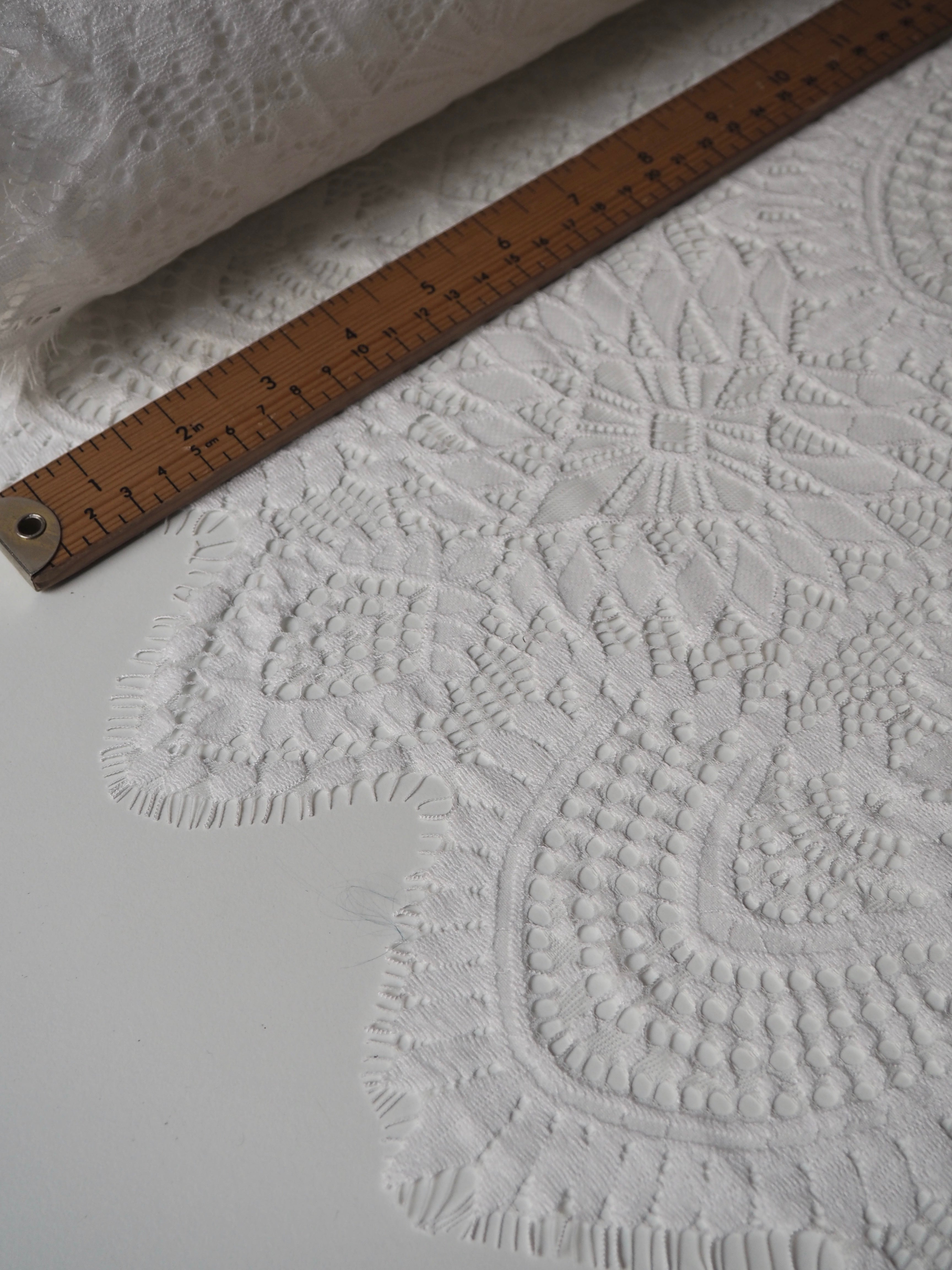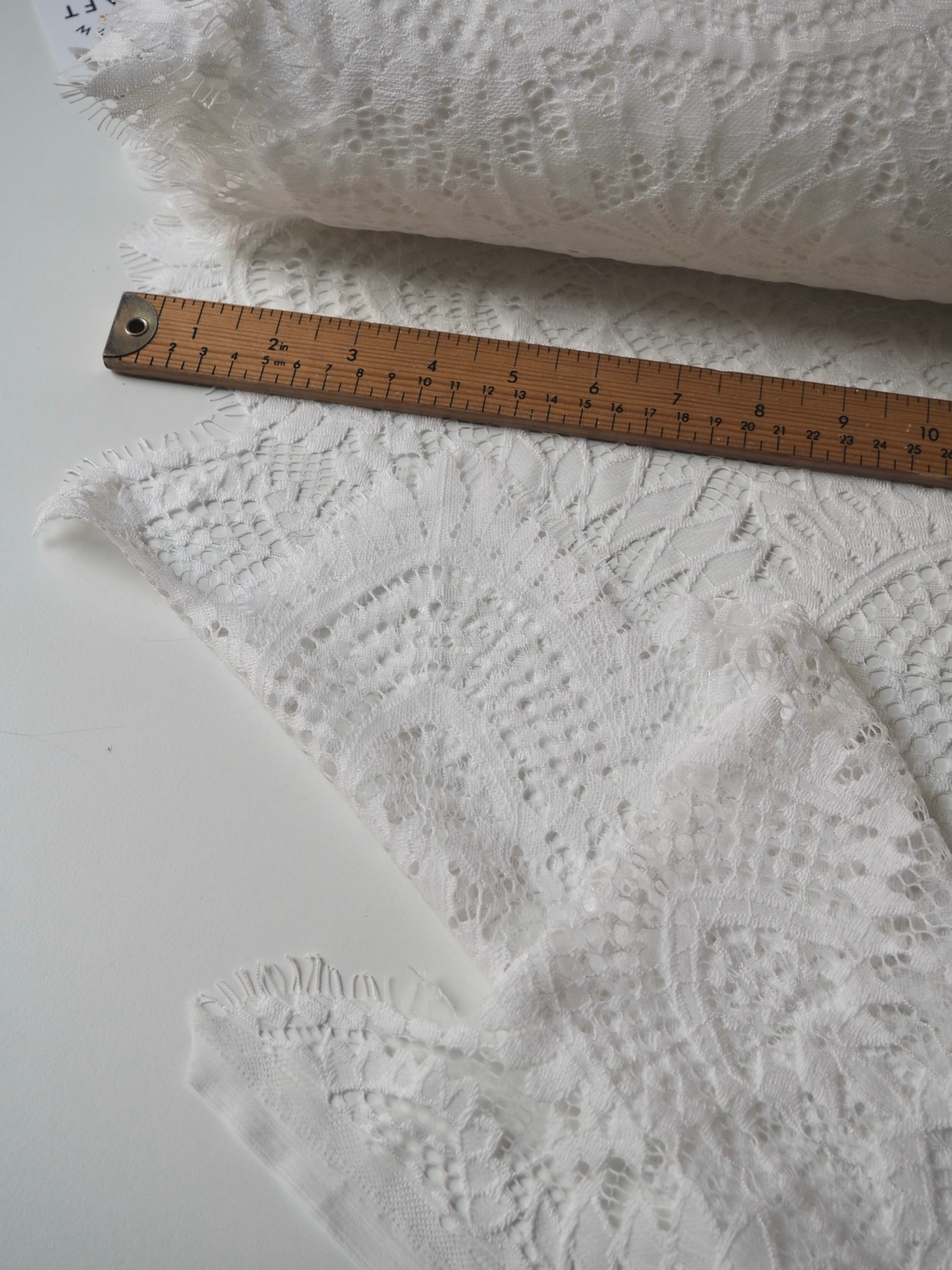 This ex-designer fabric is a lovely lace. It's in a soft white colour. It's soft and has a light sheen finish, with a medium scale geometric motif pattern. Finishes with a medium depth eyelash scallop on both ends. It has such a lovely drape and handle. Beautiful quality and perfect for bridal or summer tops and dresses! This lace is made in 2-3m pieces so if you order higher volume, your order might be in pieces.